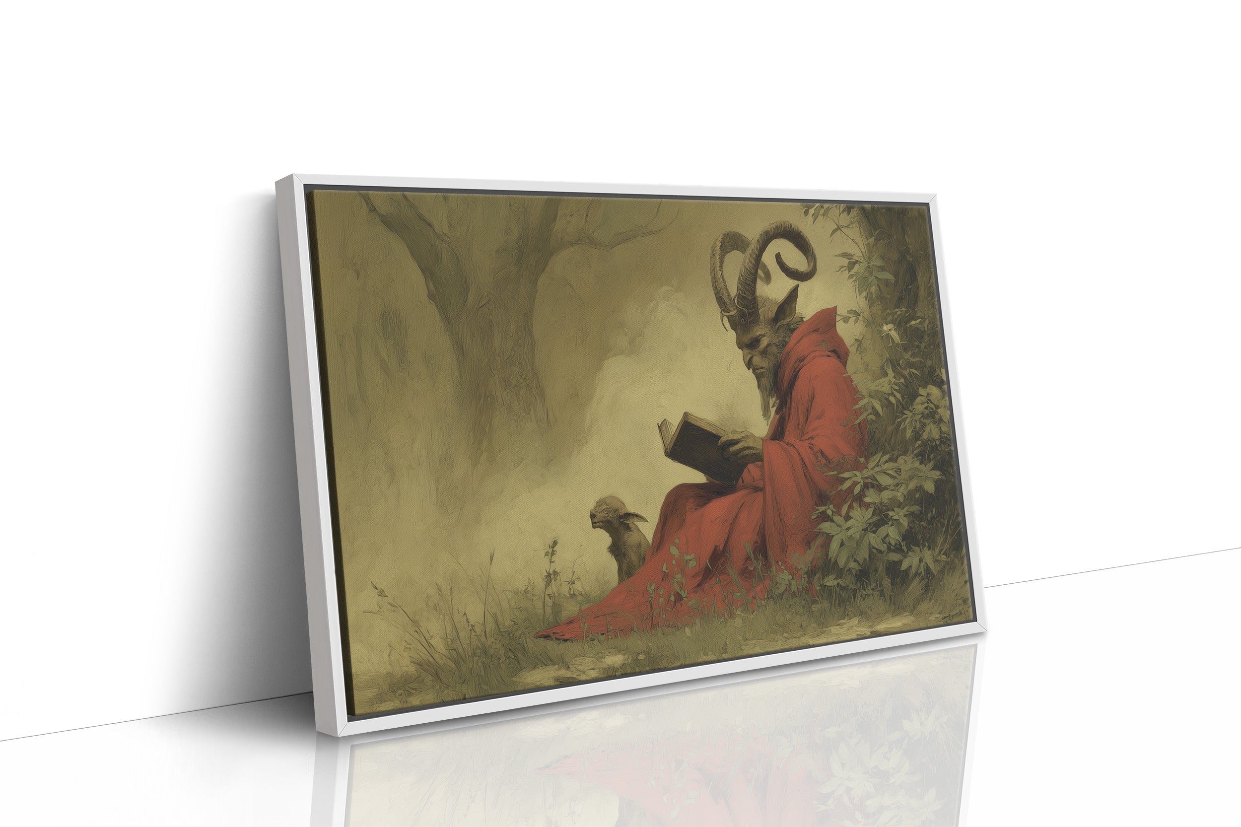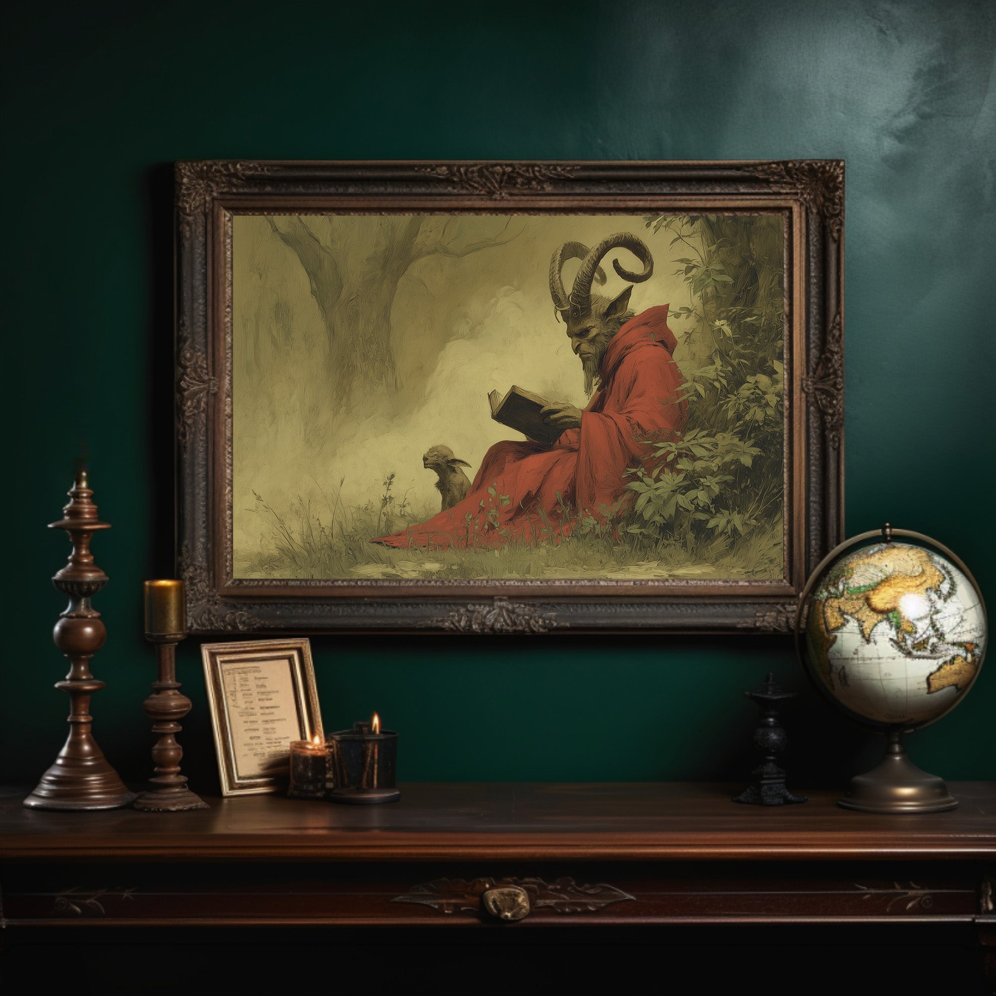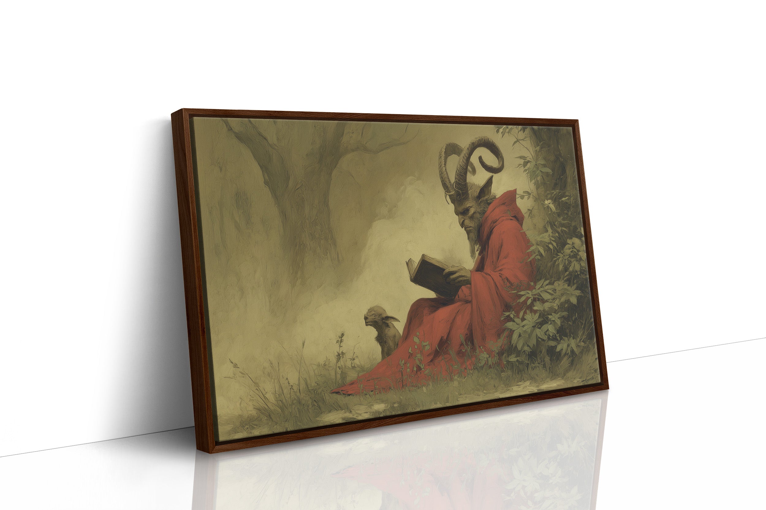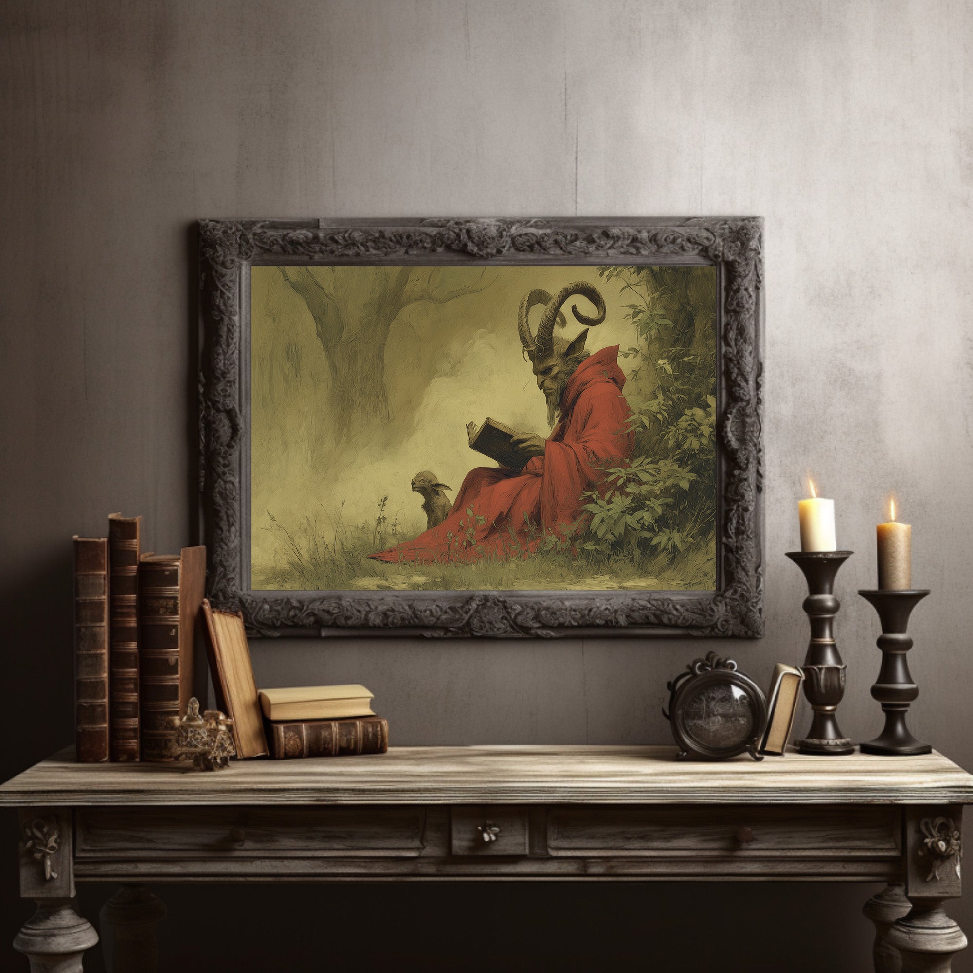 A mysterious painting of a horned figure in crimson robes sits peacefully against rich wooden bookshelves. The ethereal artwork captures a moment of quiet contemplation, with its subject reading among lush foliage, creating an intriguing contrast between the scholarly and the supernatural. The warm wood tones of the frame and surrounding library shelves complement the painting's earthy palette, while potted plants add living texture to this literary sanctuary. This piece would transform a home office or reading nook into a conversation-starting retreat for the intellectually curious.