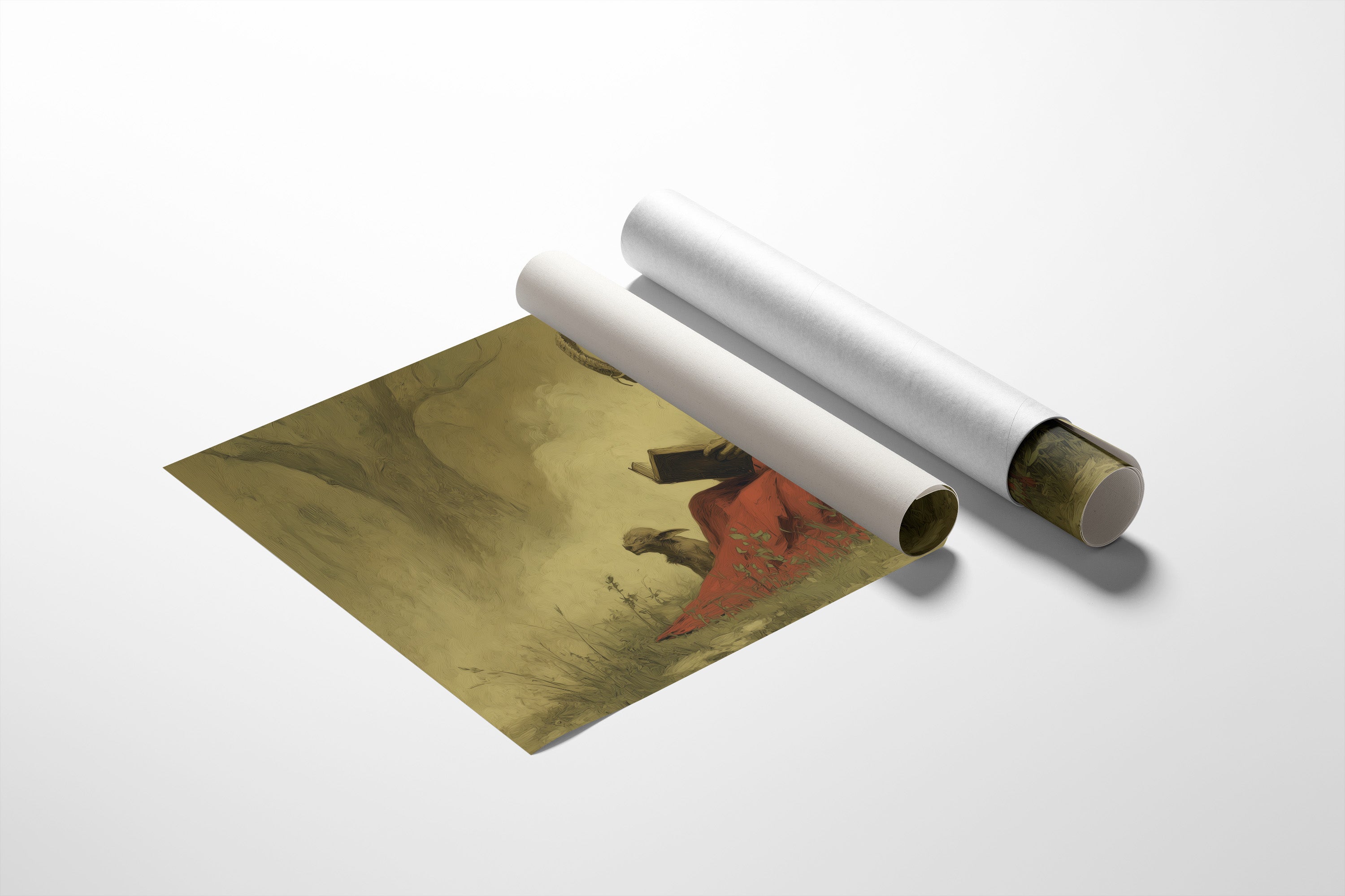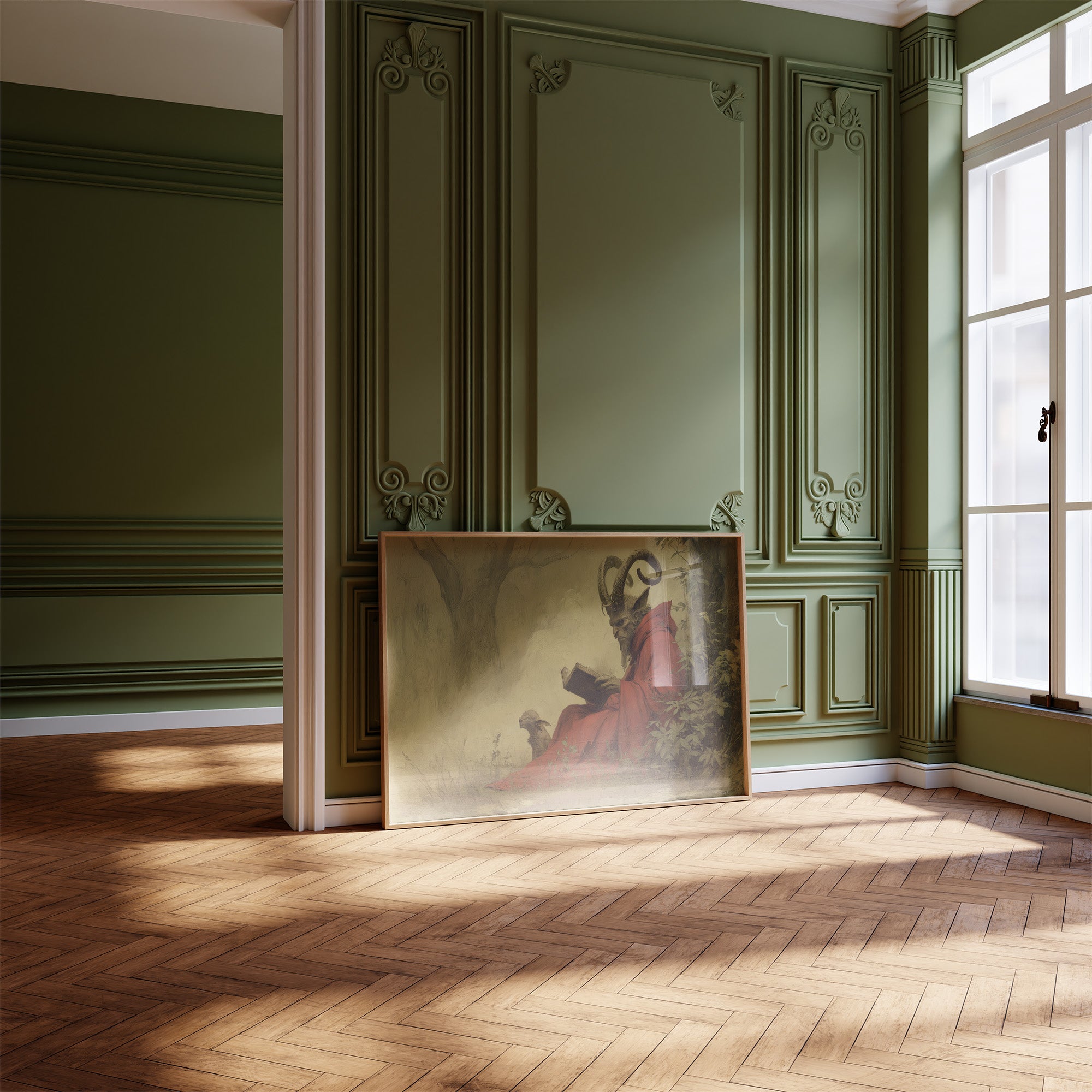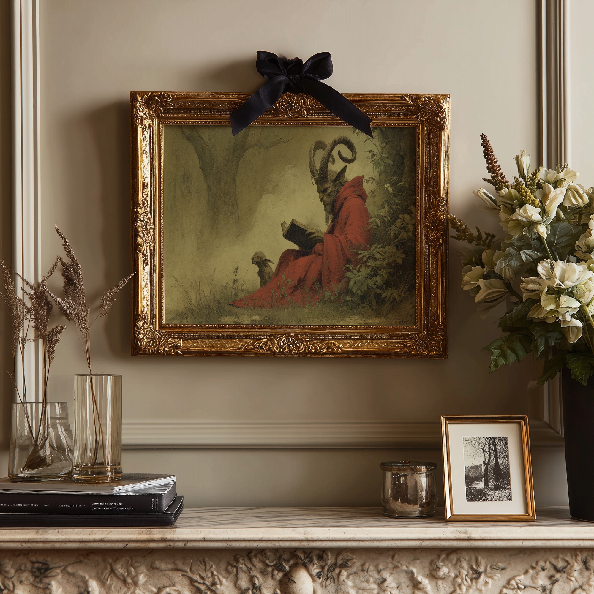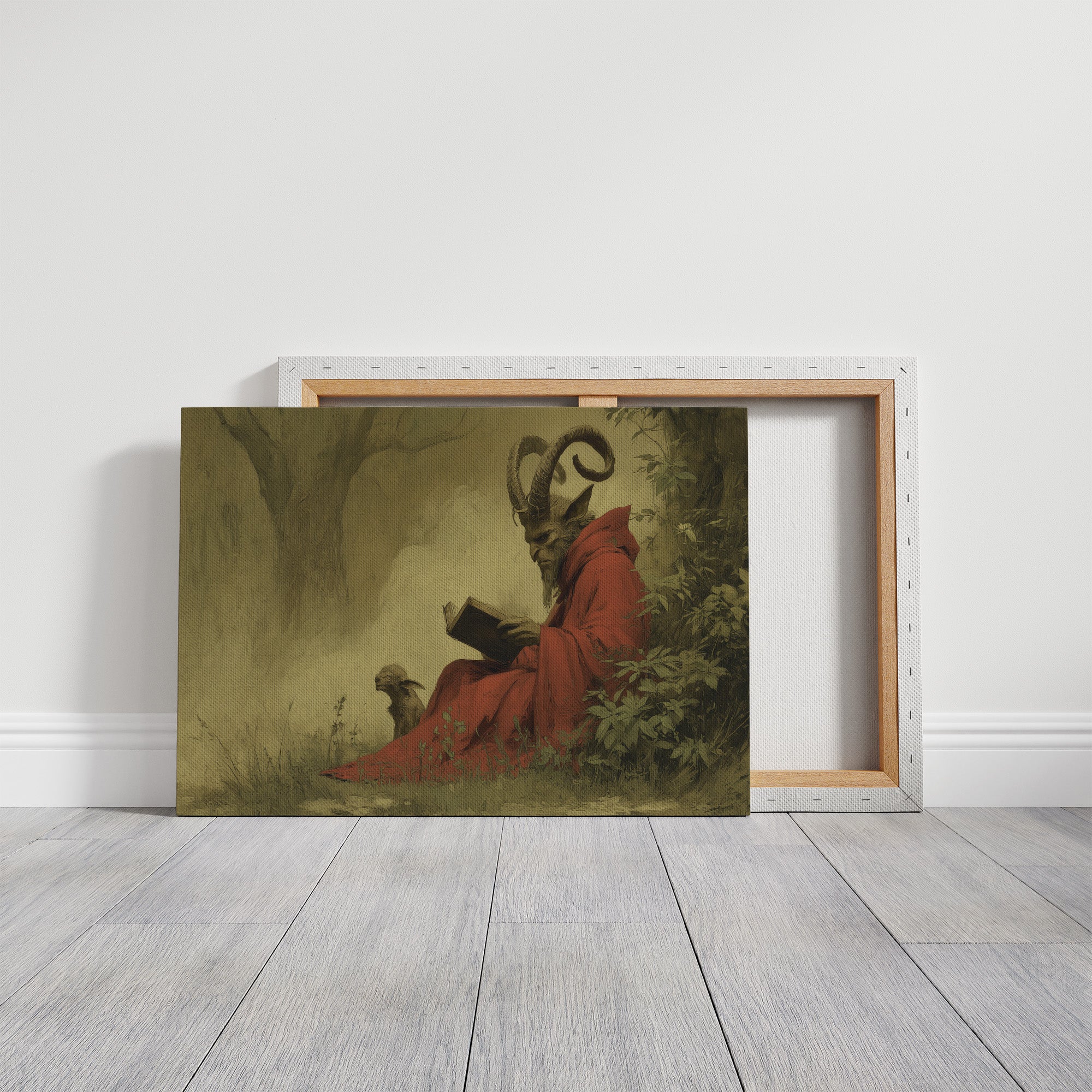 A mysterious painting of a horned figure in crimson robes sits peacefully against rich wooden bookshelves. The ethereal artwork captures a moment of quiet contemplation, with its subject reading among lush foliage, creating an intriguing contrast between the scholarly and the supernatural. The warm wood tones of the frame and surrounding library shelves complement the painting's earthy palette, while potted plants add living texture to this literary sanctuary. This piece would transform a home office or reading nook into a conversation-starting retreat for the intellectually curious.