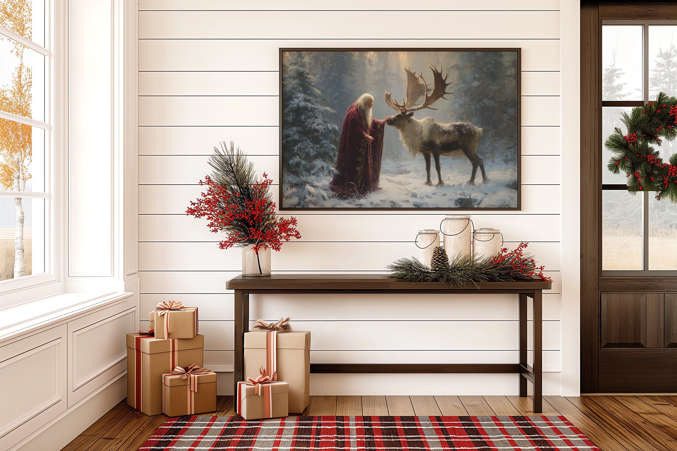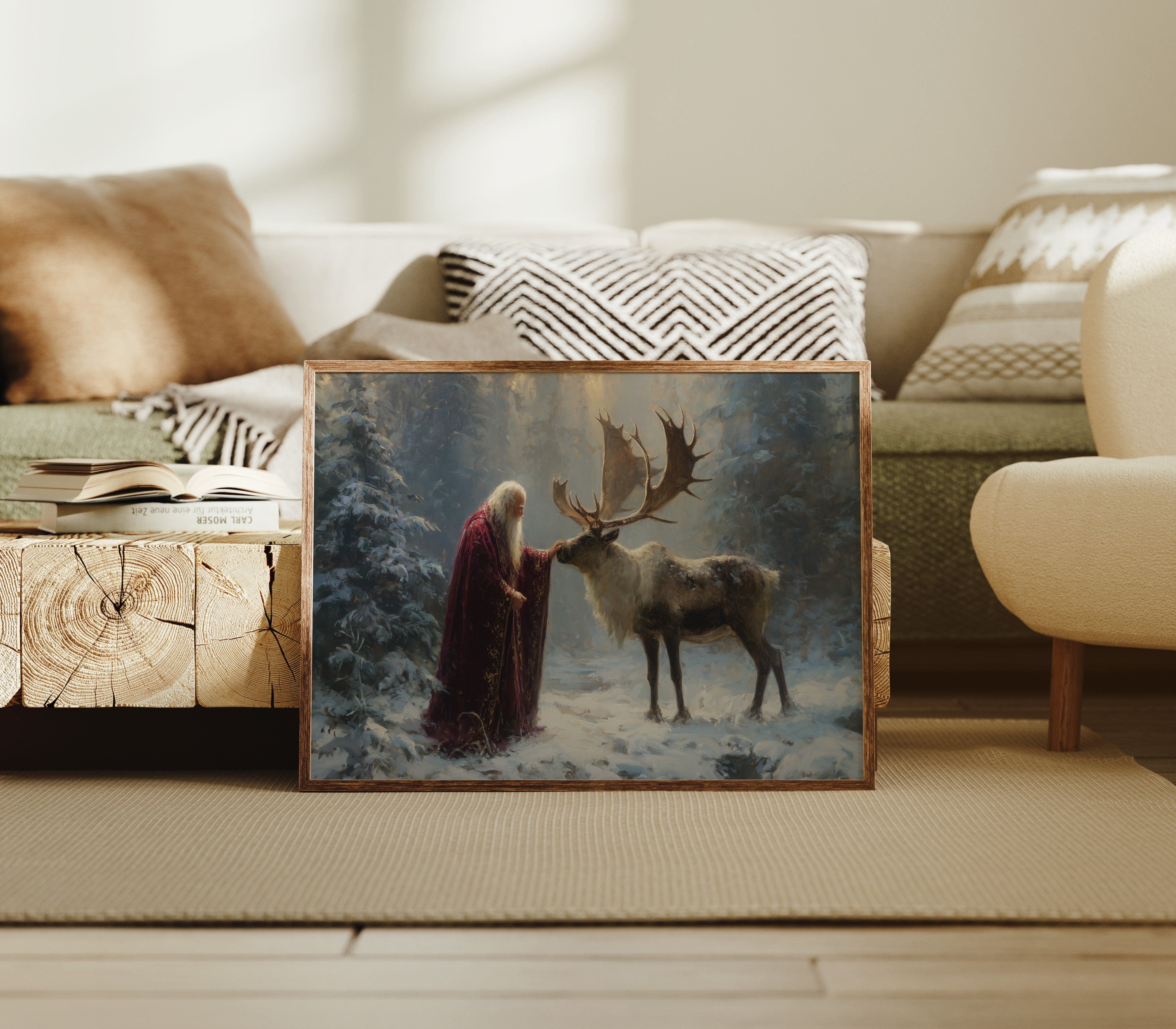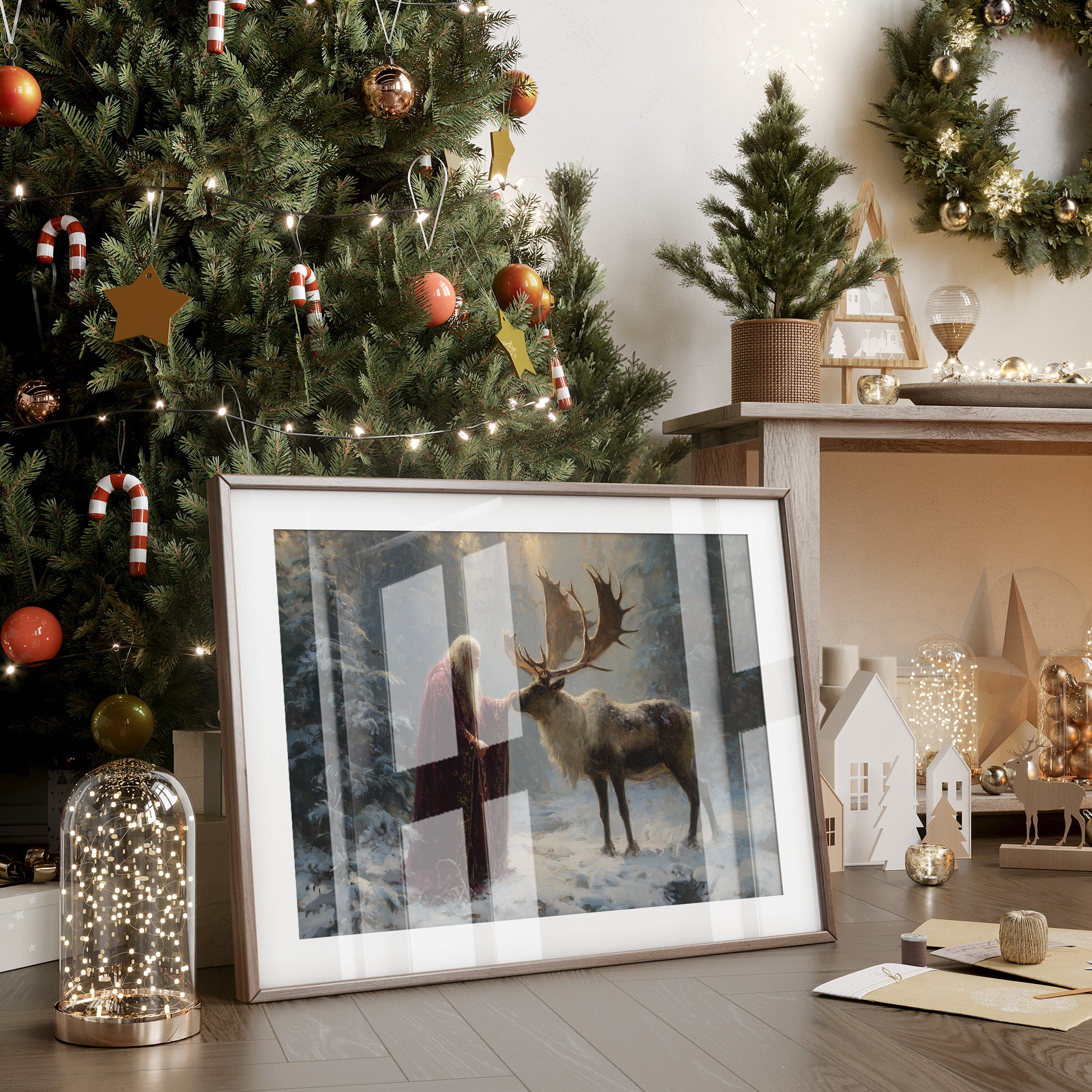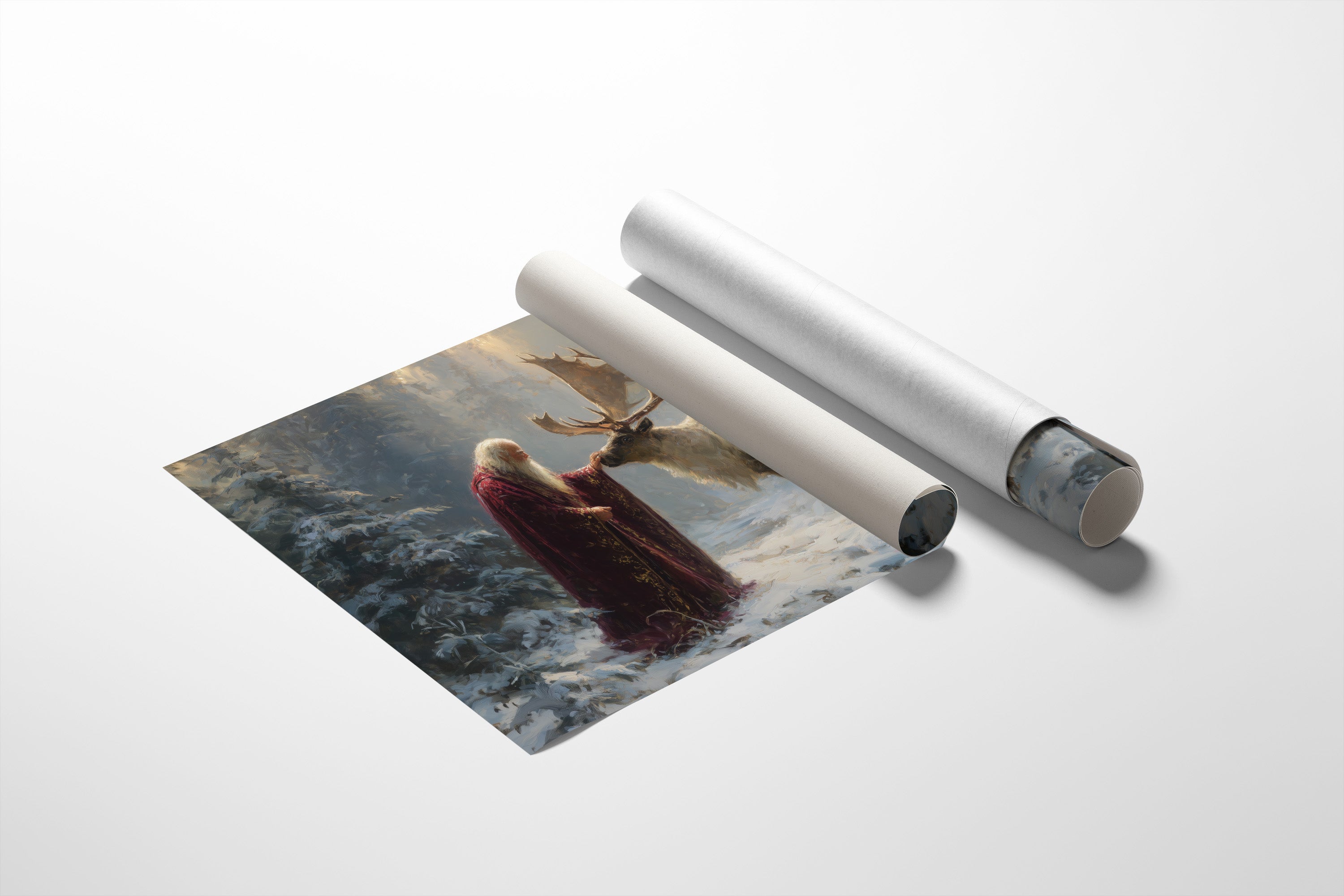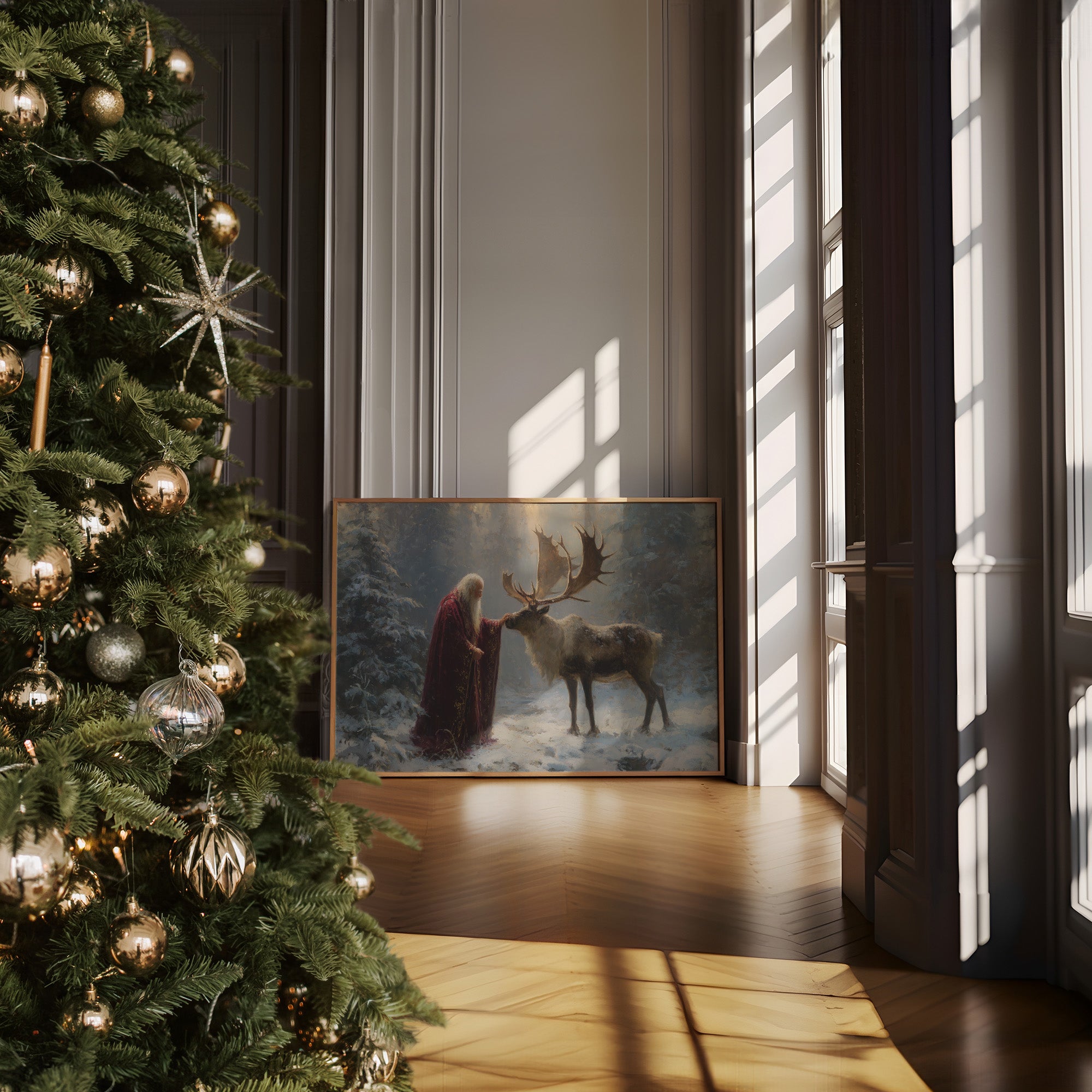 Moonlight pierces through snow-laden branches, illuminating a mystical encounter between wisdom and wilderness. A figure in flowing crimson robes reaches out to touch a majestic moose, their connection bridging the gap between humanity and nature's raw power. The scene unfolds in deep blues and ethereal whites, while golden light breaks through the forest canopy, creating an almost sacred atmosphere. This piece captures the essence of winter's quiet magic and the enduring connection between mortals and the natural world. Perfect for creating a focal point in a study, library, or any space where you wish to invoke a sense of wonder and contemplation.