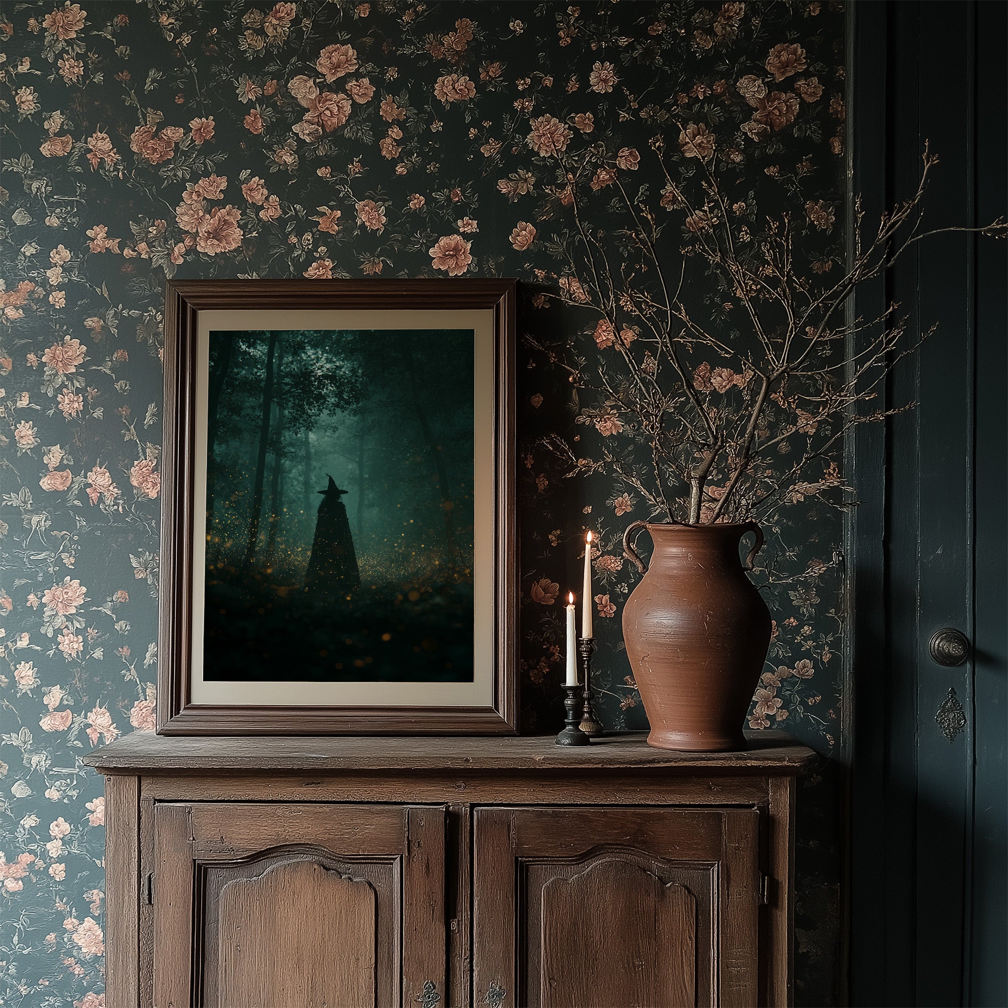Mist hangs heavy between emerald trees as a solitary figure stands amid dancing golden particles of light. The silhouette of a witch, defined by her distinctive pointed hat and flowing cloak, creates a striking contrast against the mysterious verdant backdrop. Ethereal firefly-like specks illuminate the foggy woodland floor, suggesting a spell being cast or ancient magic awakening in this liminal space between worlds.