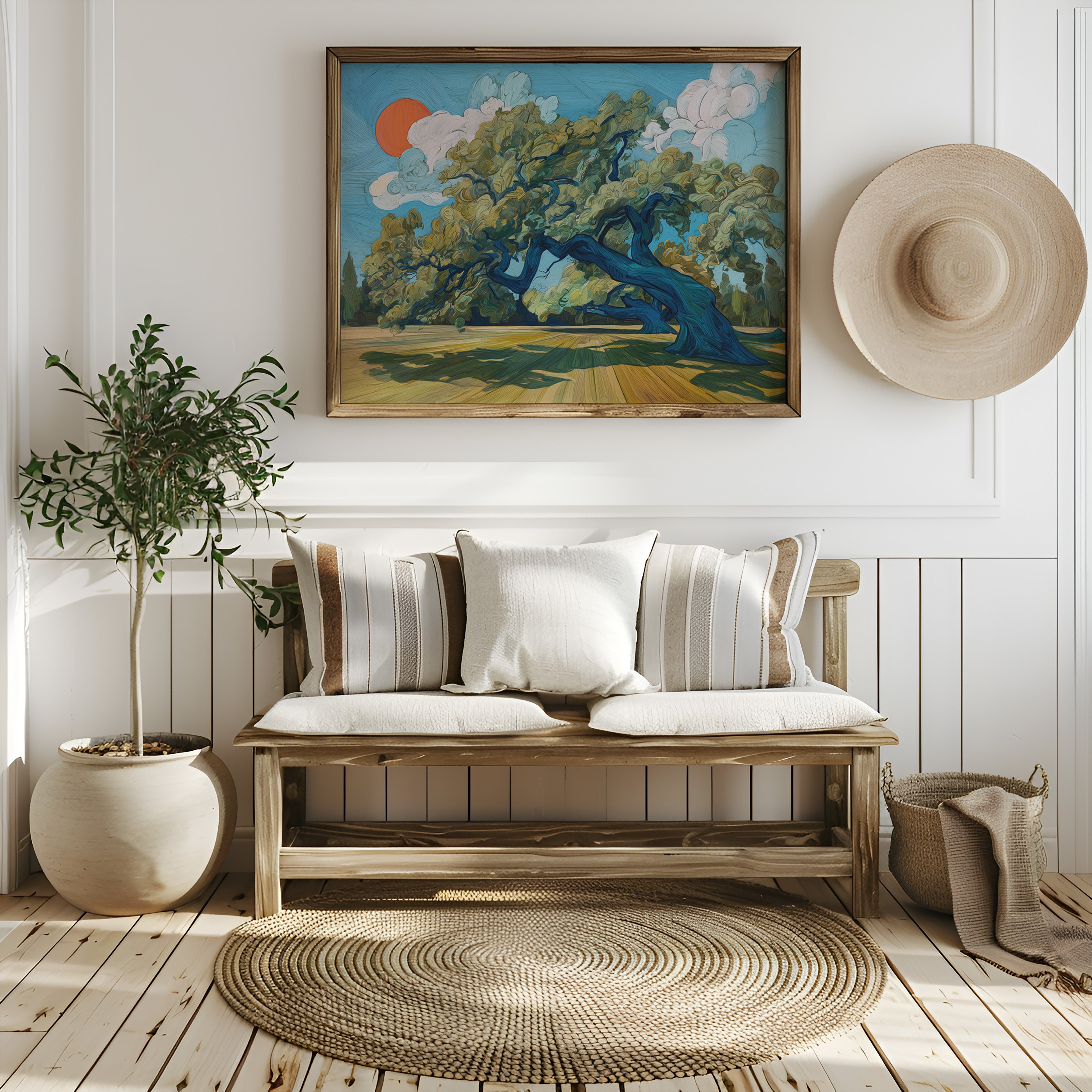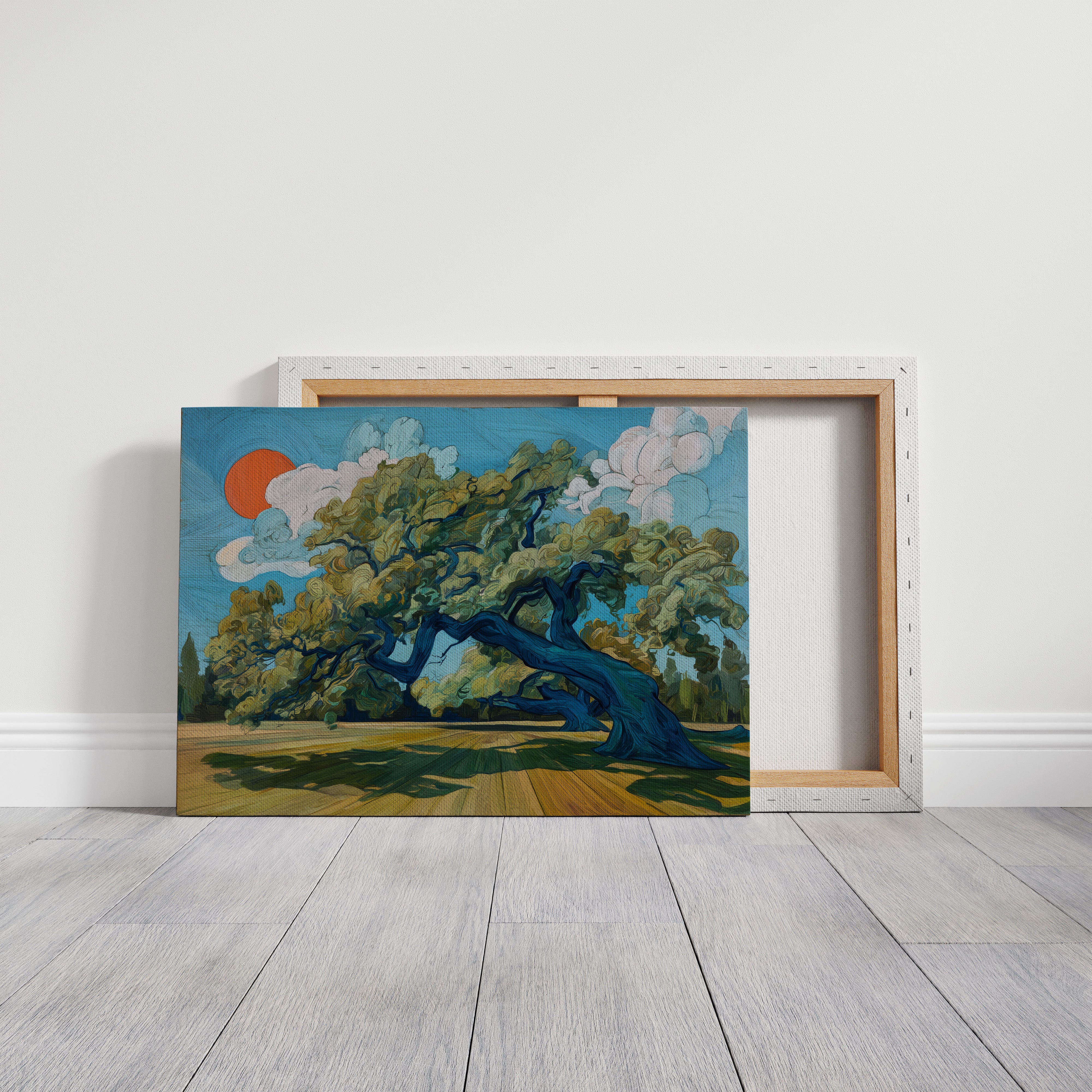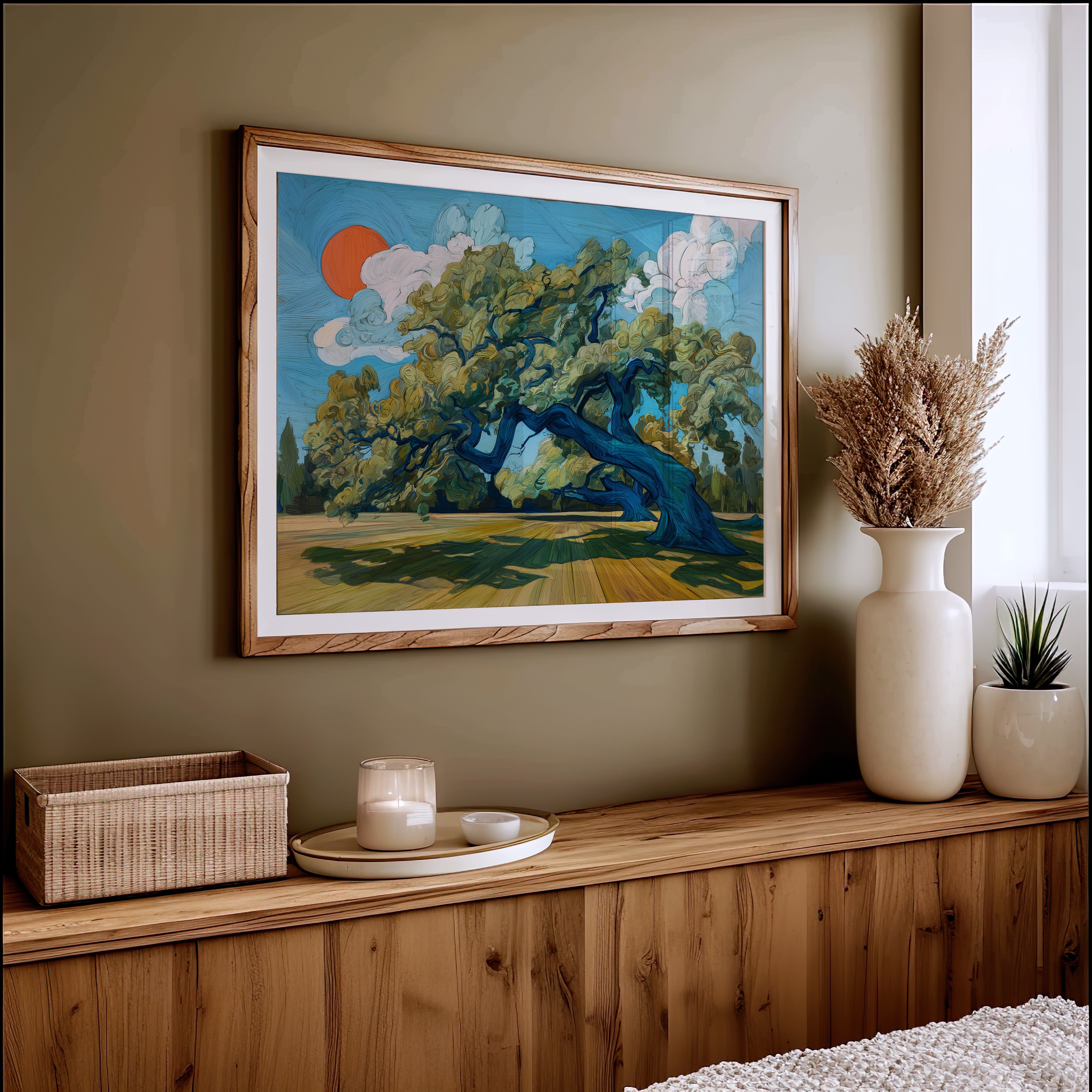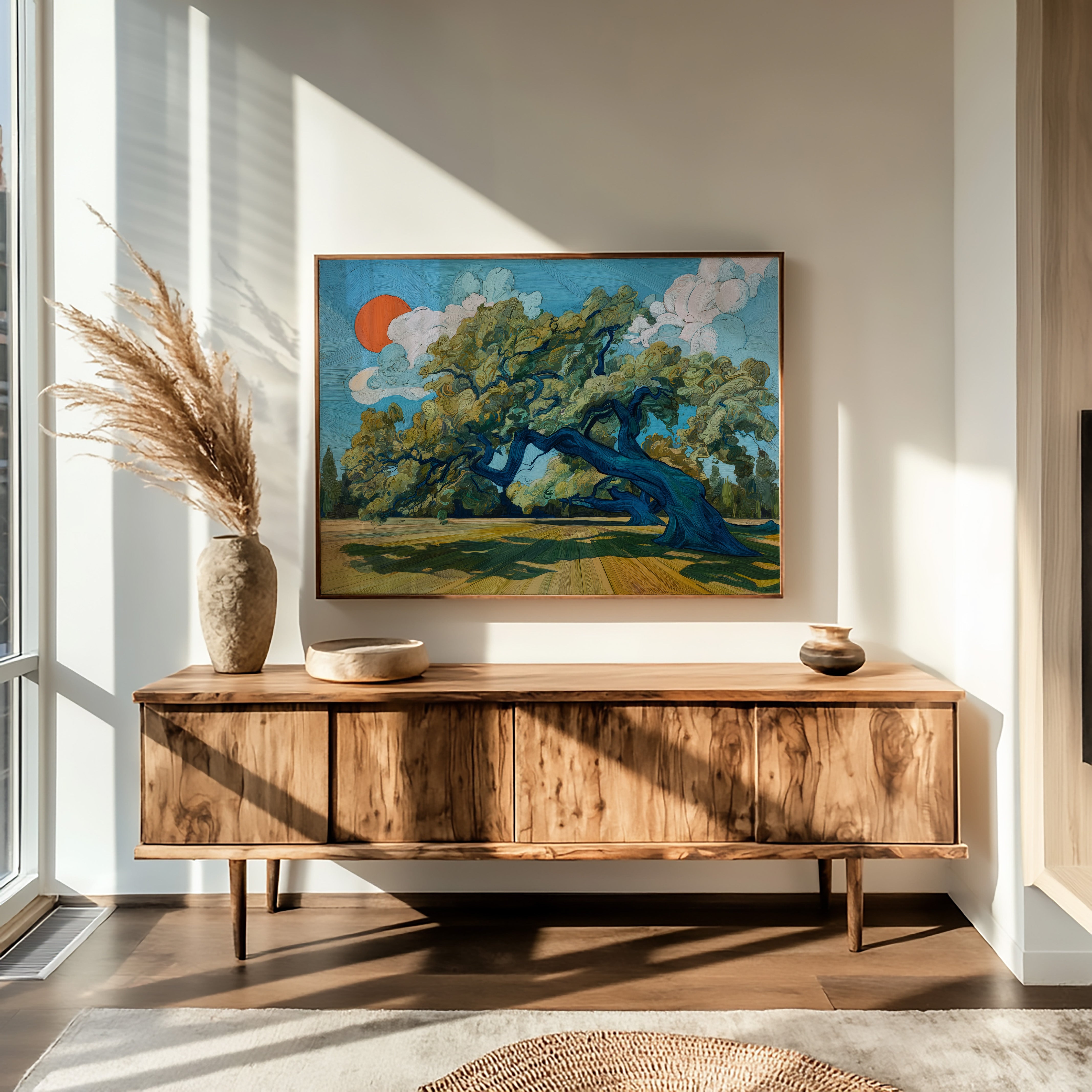 A weathered oak tree stretches across golden fields, its twisted form dancing with the warm glow of a setting sun. Deep navy branches reach through verdant foliage, creating an artistic interplay of shadow and light across the pastoral landscape. The composition captures both strength and grace - the tree's massive trunk anchoring the scene while its wind-shaped canopy seems to float against billowing clouds and turquoise skies. This contemporary landscape would bring natural drama and serenity to a modern living room, dining space, or any area seeking to celebrate the timeless beauty of nature.