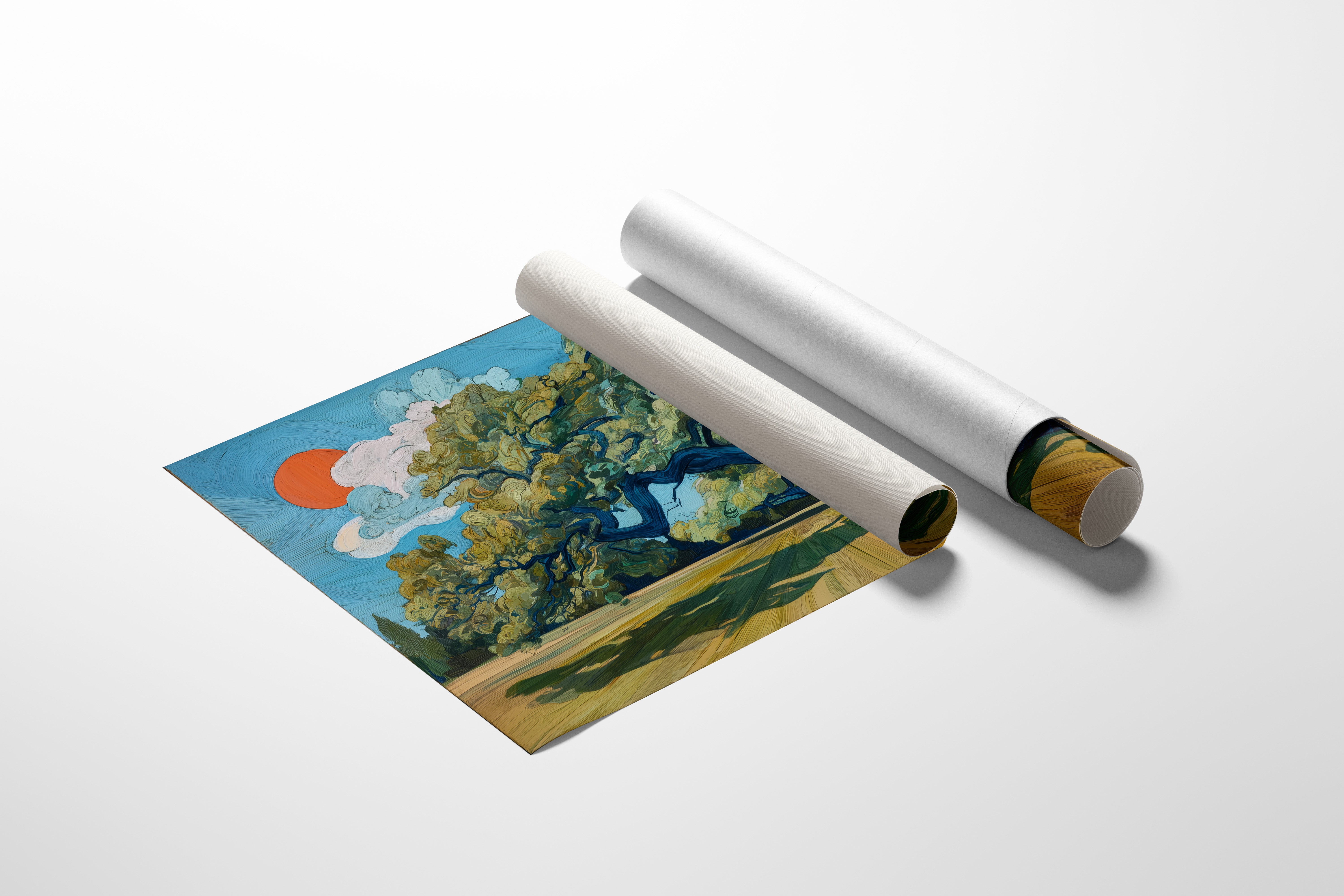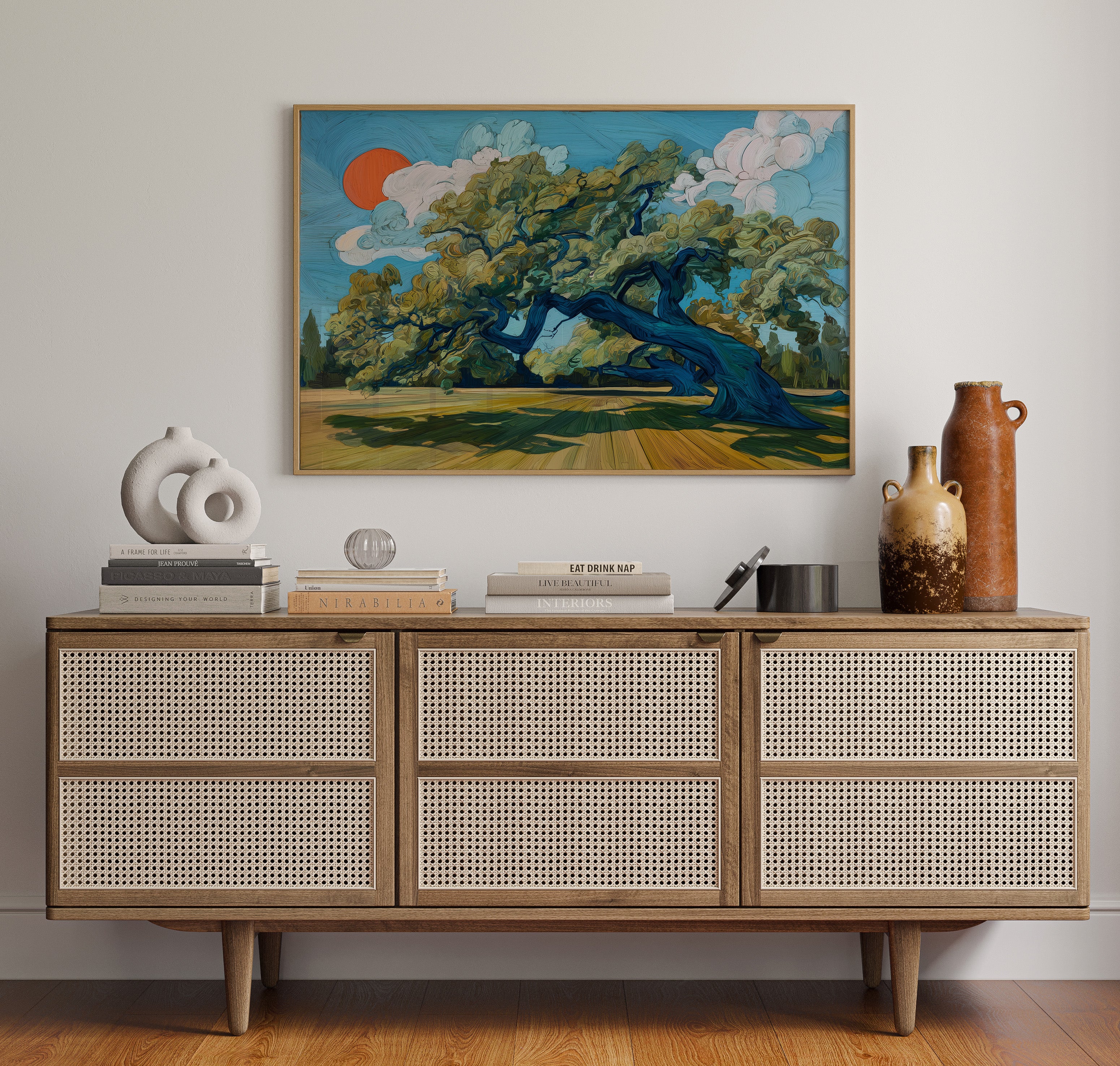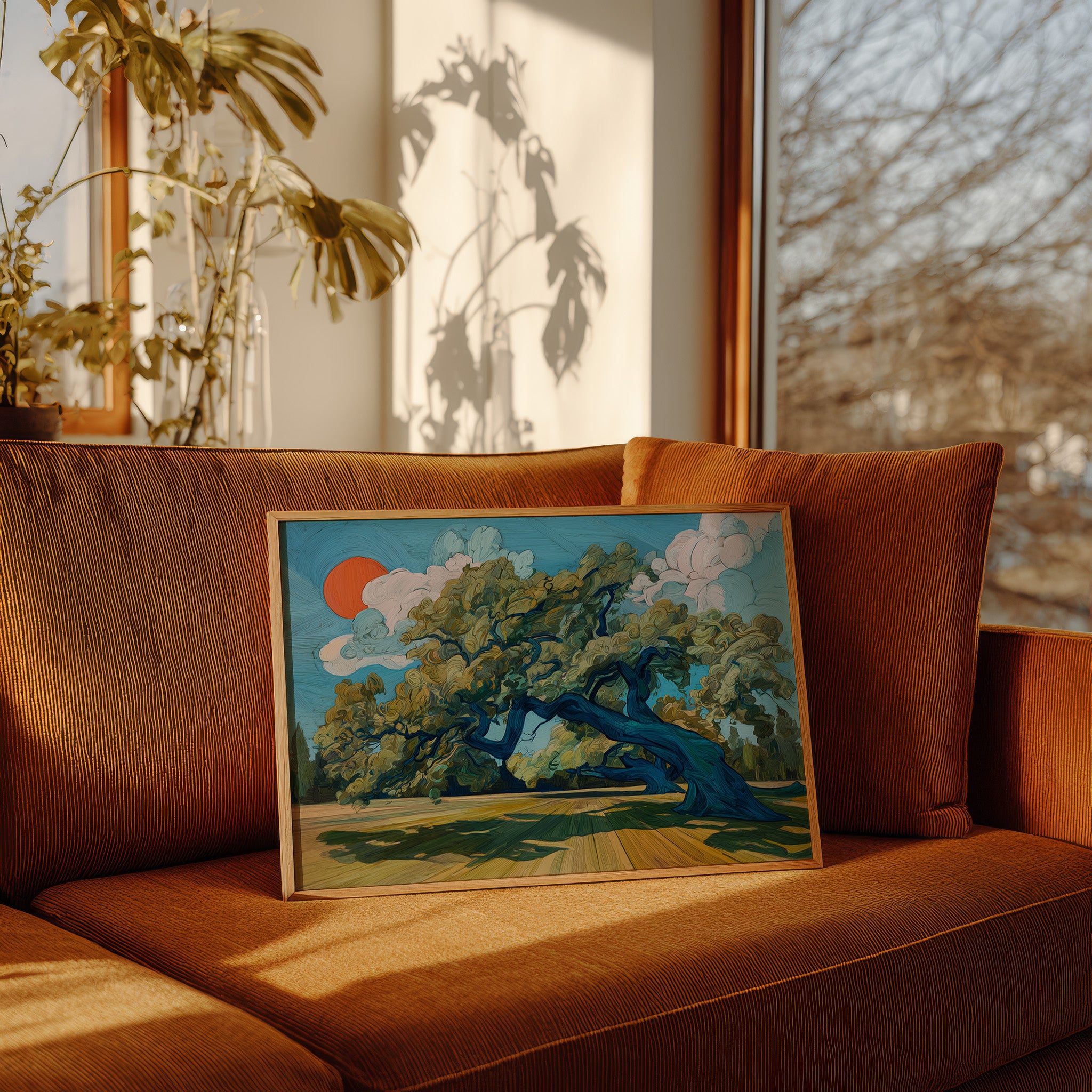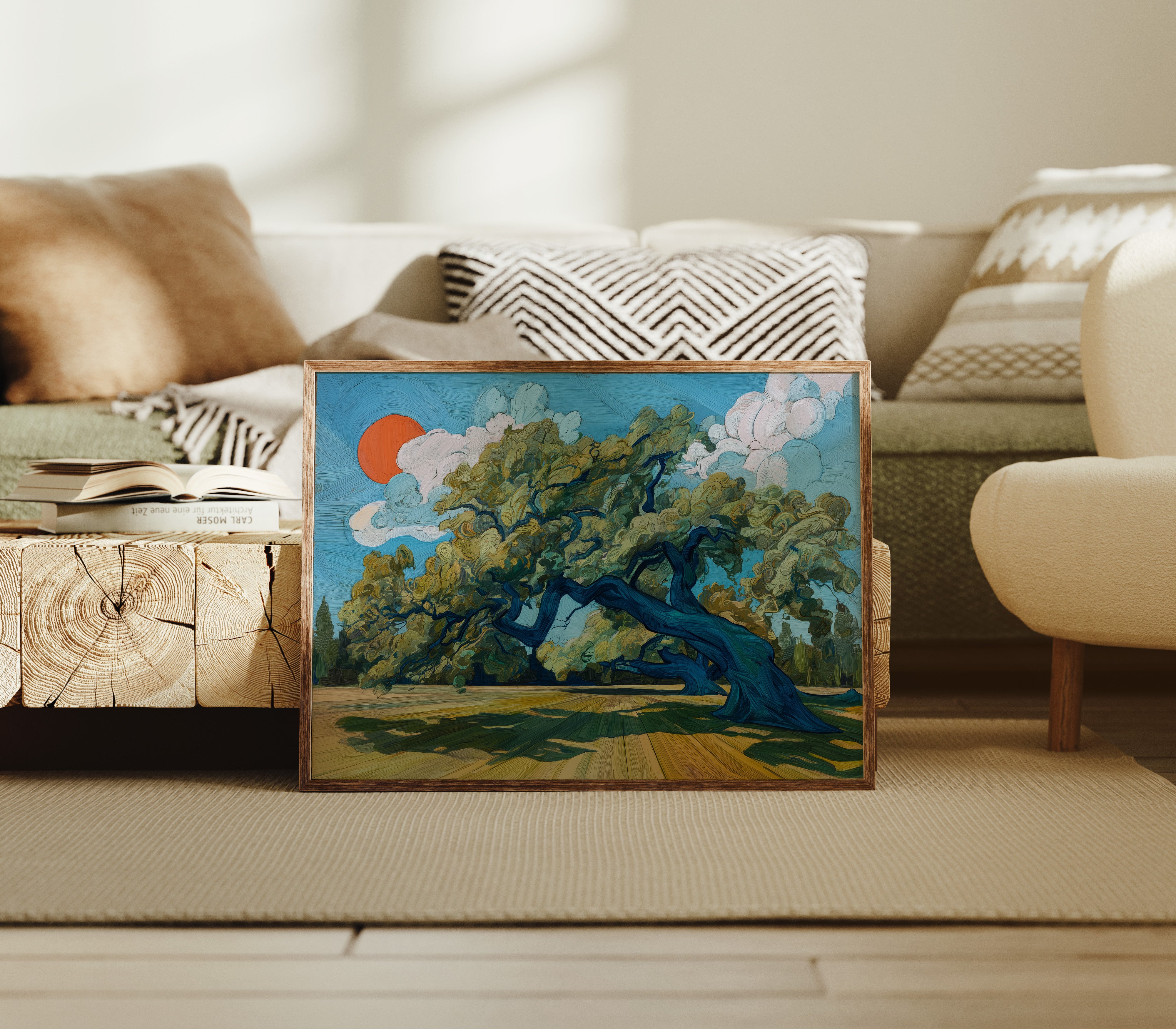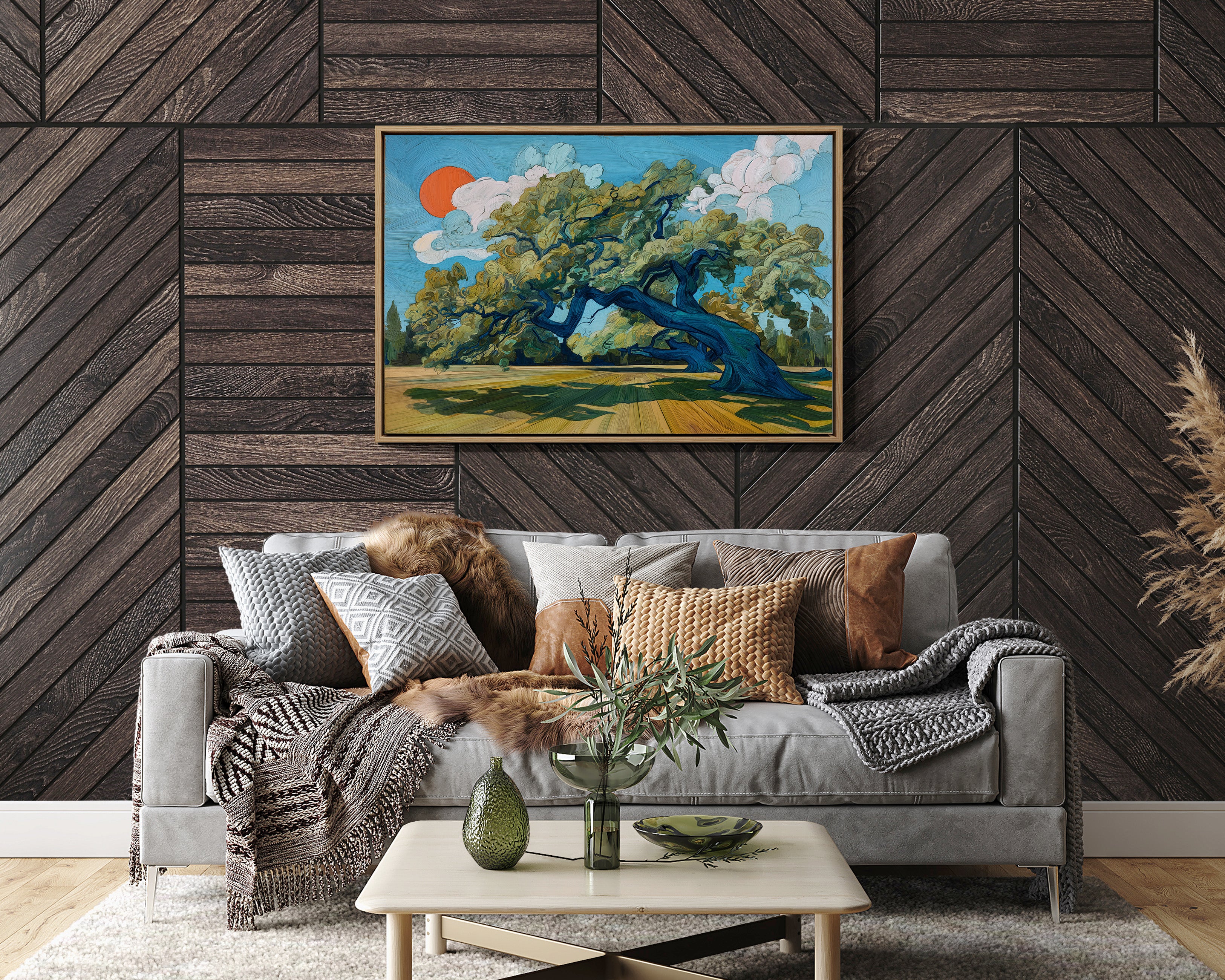 A weathered oak tree stretches across golden fields, its twisted form dancing with the warm glow of a setting sun. Deep navy branches reach through verdant foliage, creating an artistic interplay of shadow and light across the pastoral landscape. The composition captures both strength and grace - the tree's massive trunk anchoring the scene while its wind-shaped canopy seems to float against billowing clouds and turquoise skies. This contemporary landscape would bring natural drama and serenity to a modern living room, dining space, or any area seeking to celebrate the timeless beauty of nature.