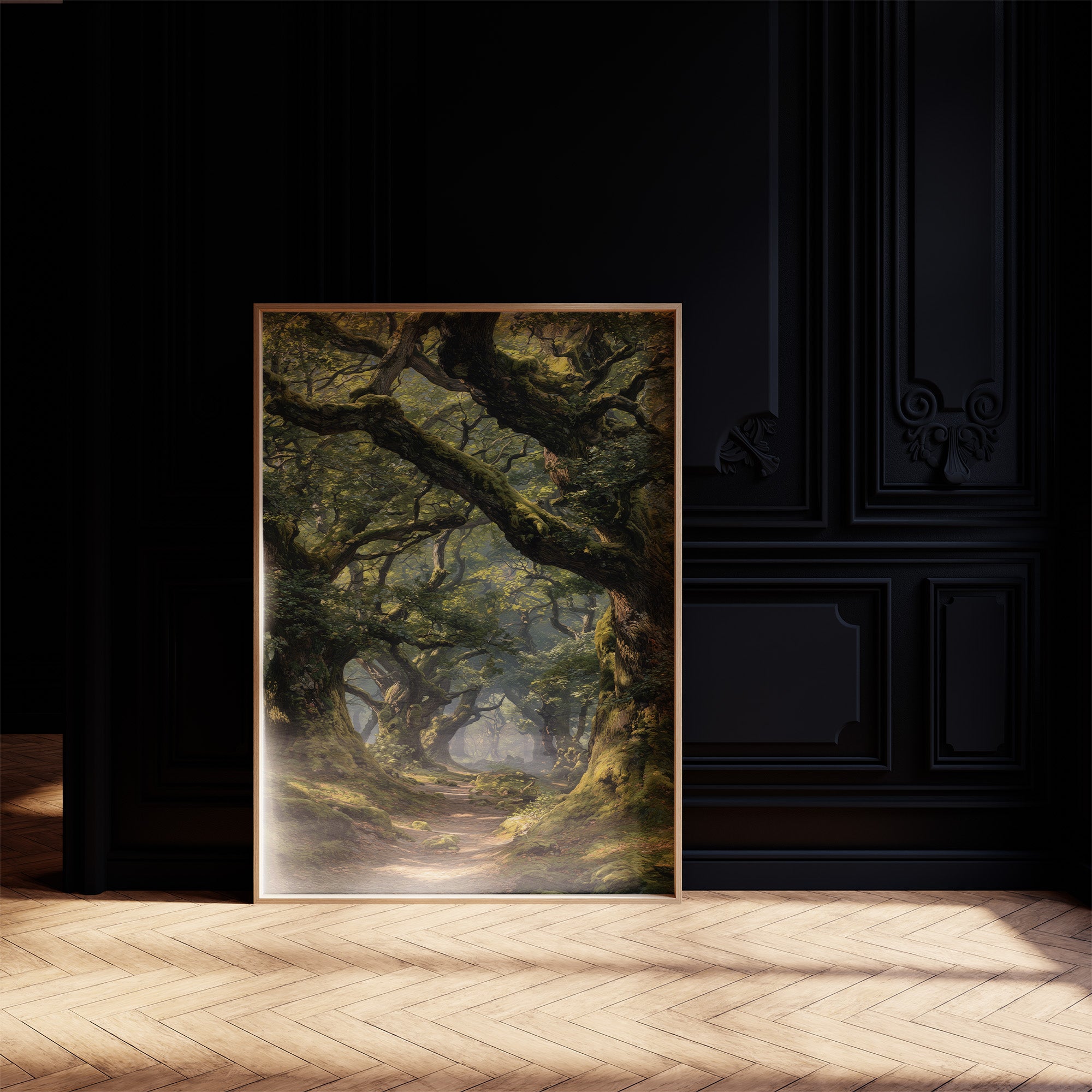 Light filters through a cathedral of twisted branches, painting the forest floor with dappled gold. The winding path beckons inward, disappearing into a misty realm where time seems to slow among moss-covered trunks and verdant canopy. Ancient oaks stand as sentinels, their gnarled limbs reaching across the trail in an eternal, protective embrace of this mystical corridor. This atmospheric piece brings woodland enchantment to sophisticated spaces, creating a portal to nature's quiet wisdom within contemporary interiors.