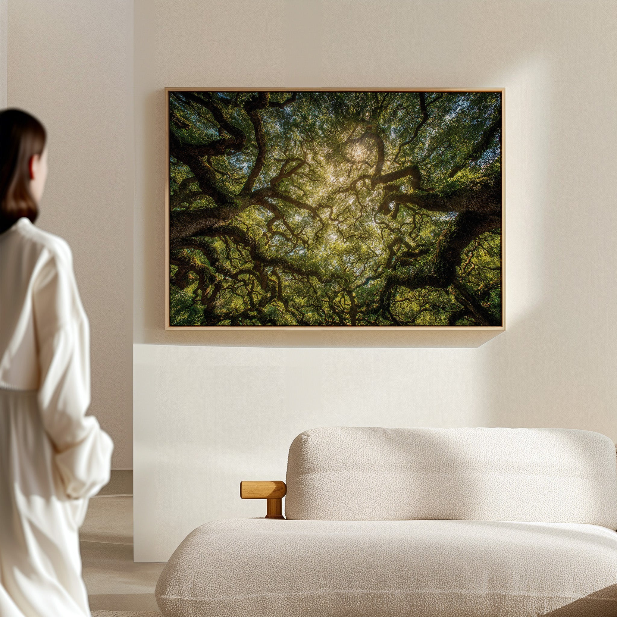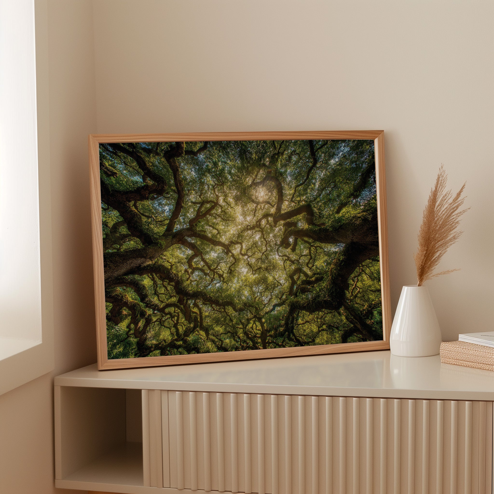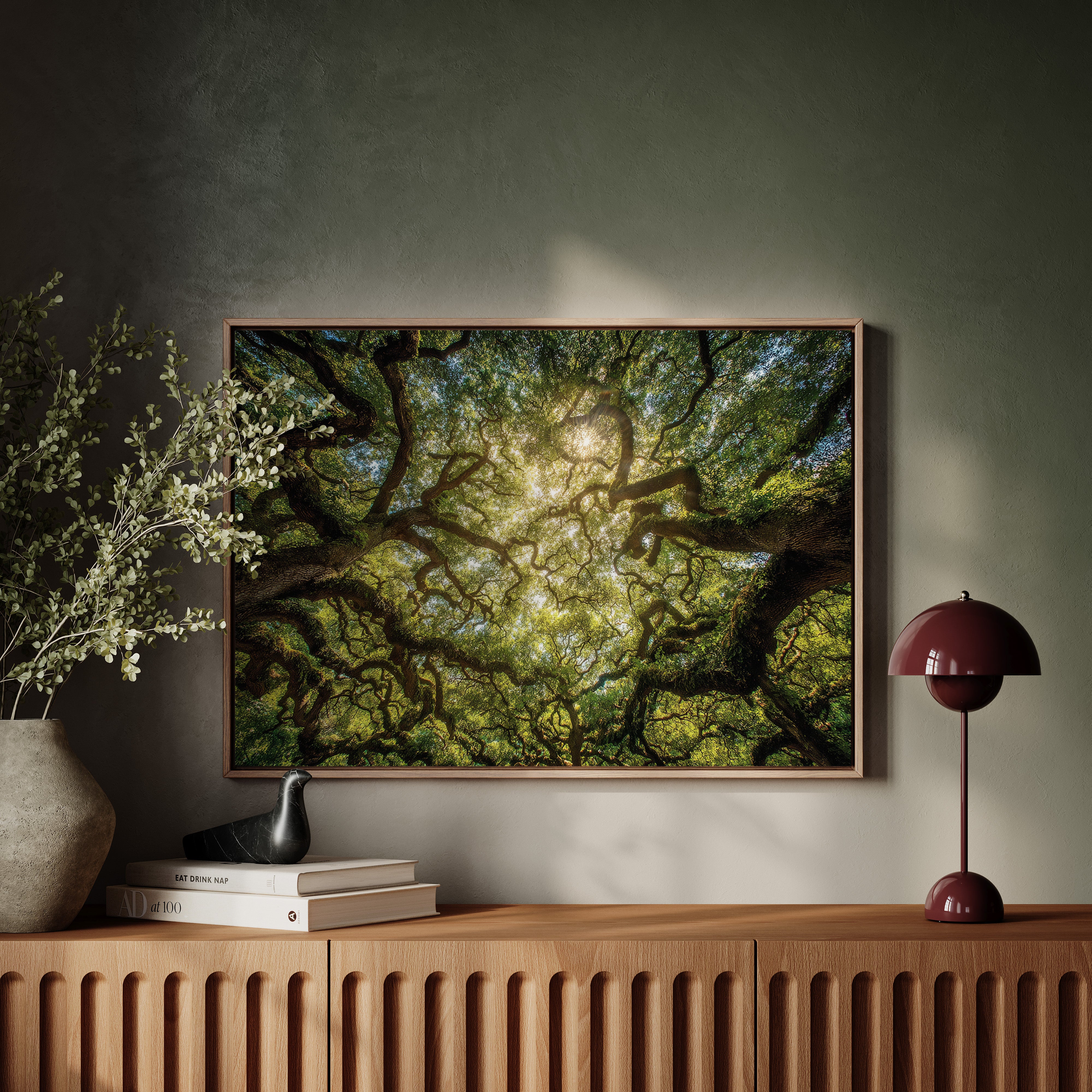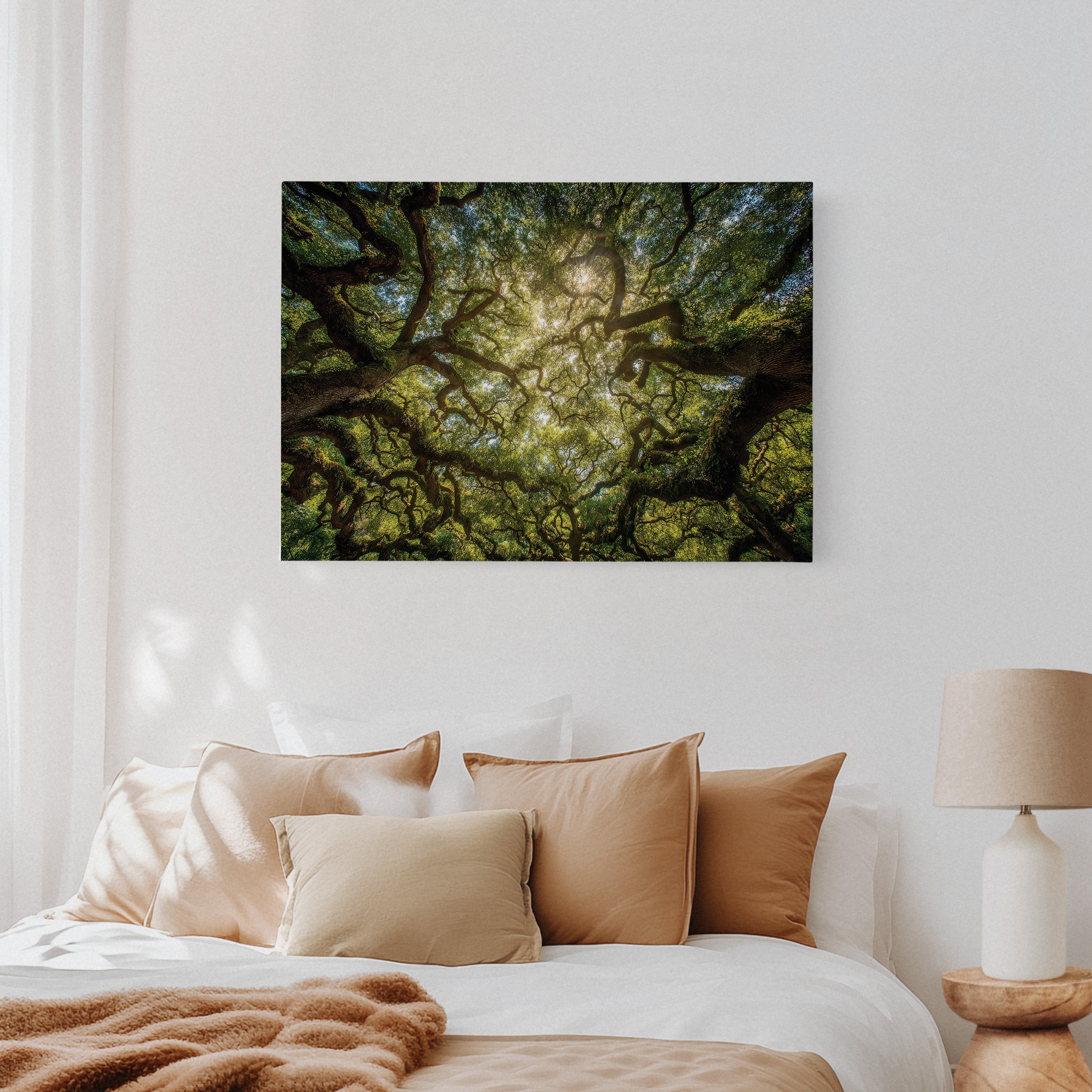 Sunlight filters through a cathedral of twisted branches, creating a mesmerizing dance of light and shadow. The gnarled limbs of ancient oak trees reach toward the sky like nature's own stained glass, their leaves filtering golden rays into a thousand shifting patterns. Moss-covered bark tells stories of centuries passed, while the intricate network of branches creates a natural mandala against the summer sky. This piece brings the majesty of old-growth forests into interior spaces, perfect for meditation rooms or spaces where you seek to create a connection with nature's timeless rhythms.