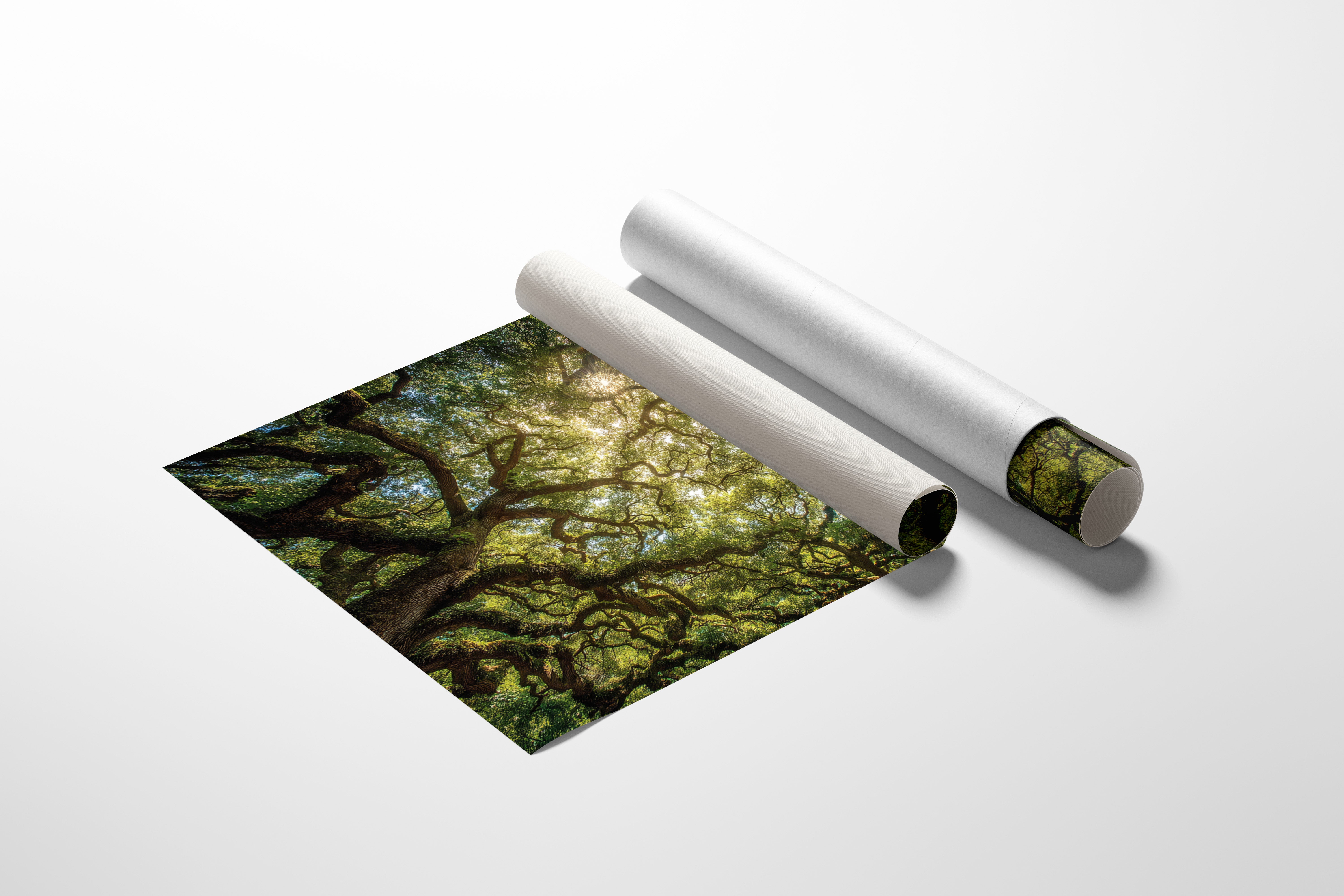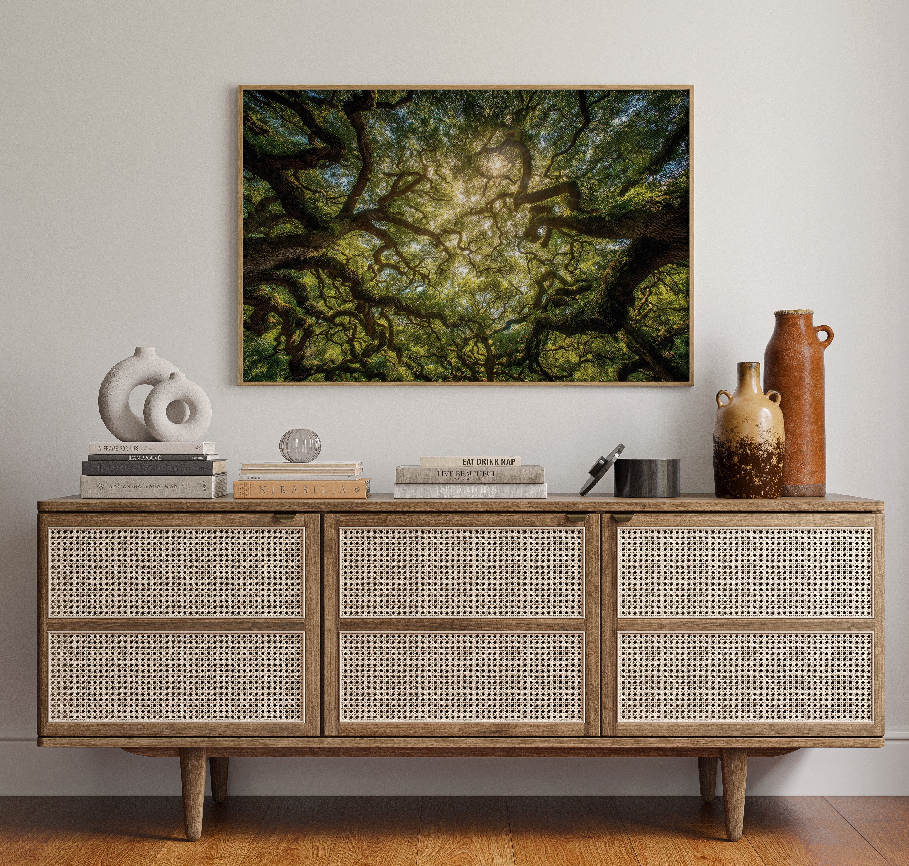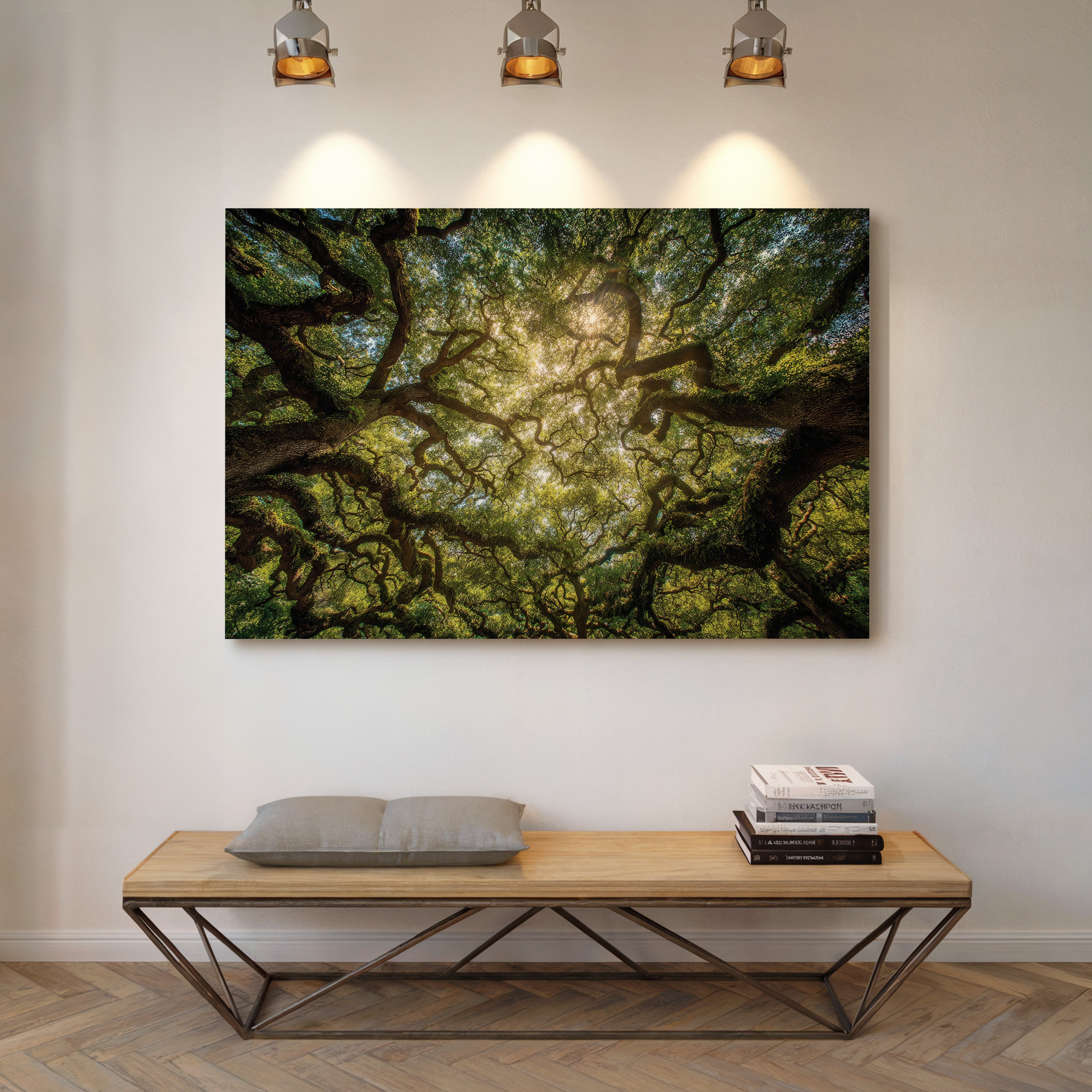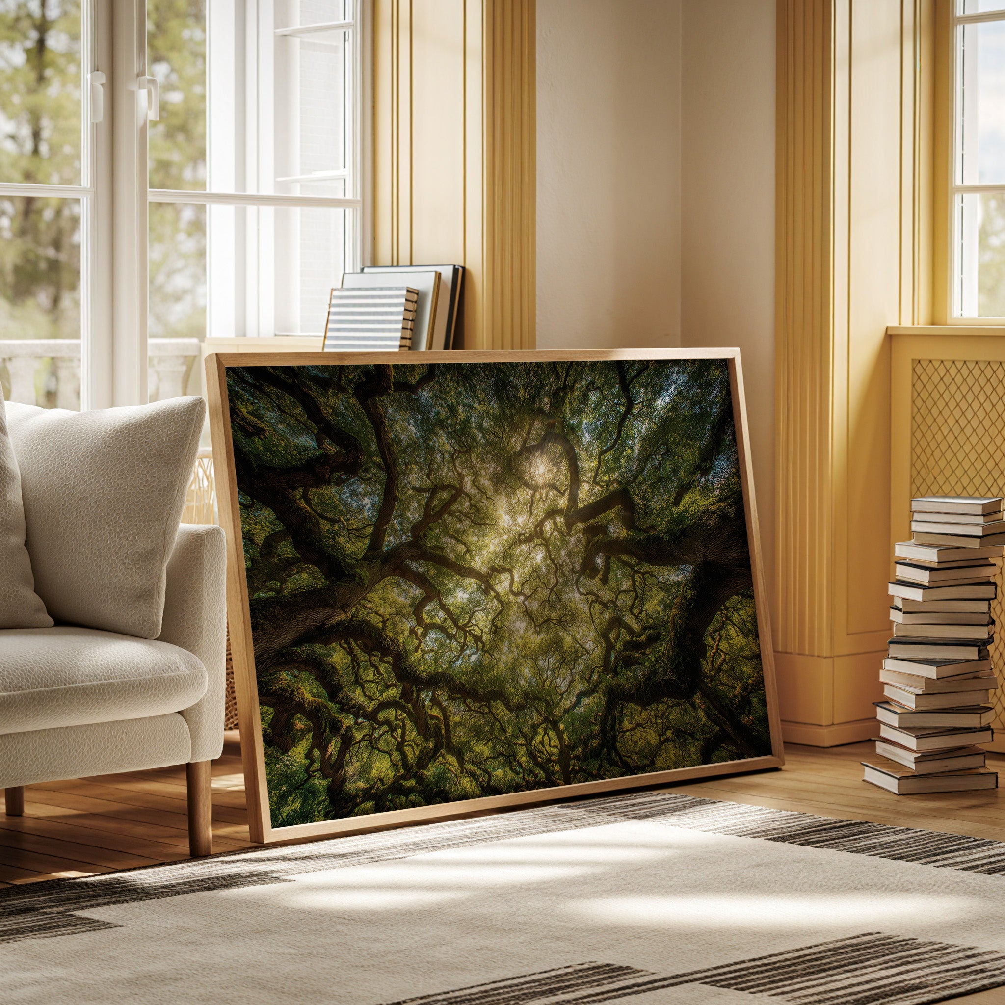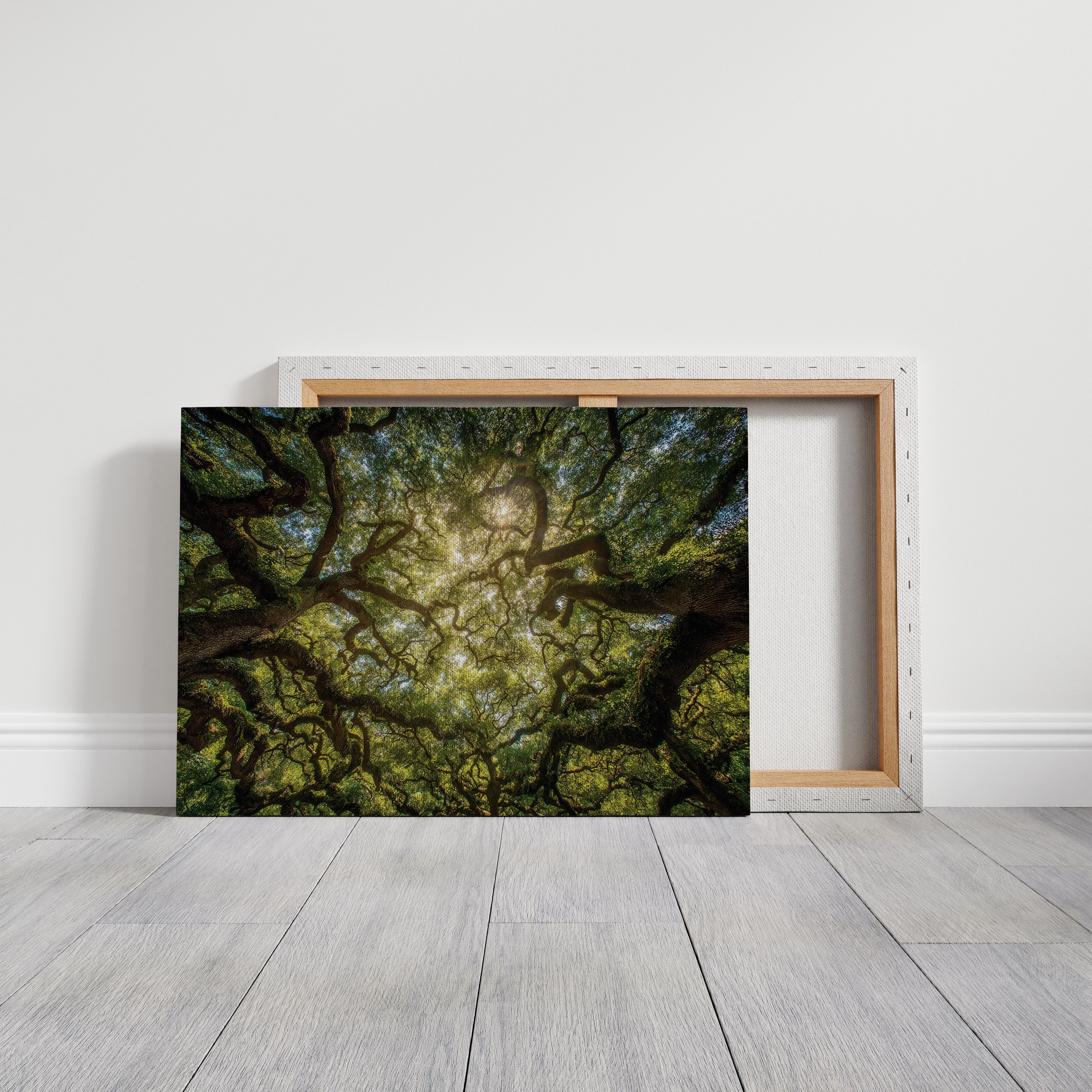 Sunlight filters through a cathedral of twisted branches, creating a mesmerizing dance of light and shadow. The gnarled limbs of ancient oak trees reach toward the sky like nature's own stained glass, their leaves filtering golden rays into a thousand shifting patterns. Moss-covered bark tells stories of centuries passed, while the intricate network of branches creates a natural mandala against the summer sky. This piece brings the majesty of old-growth forests into interior spaces, perfect for meditation rooms or spaces where you seek to create a connection with nature's timeless rhythms.