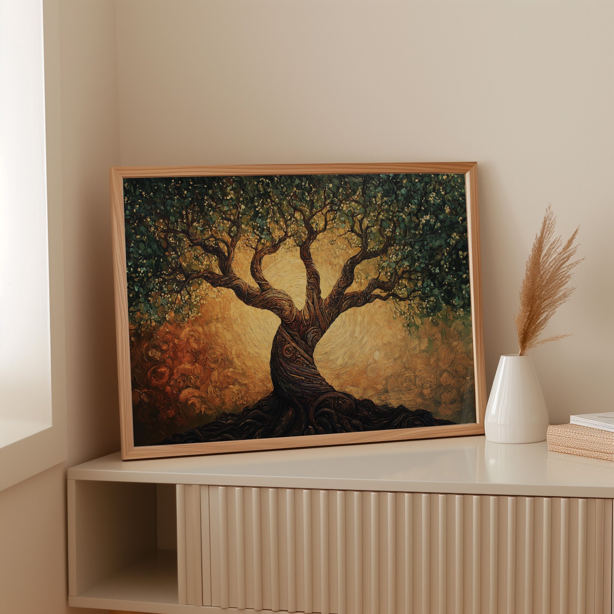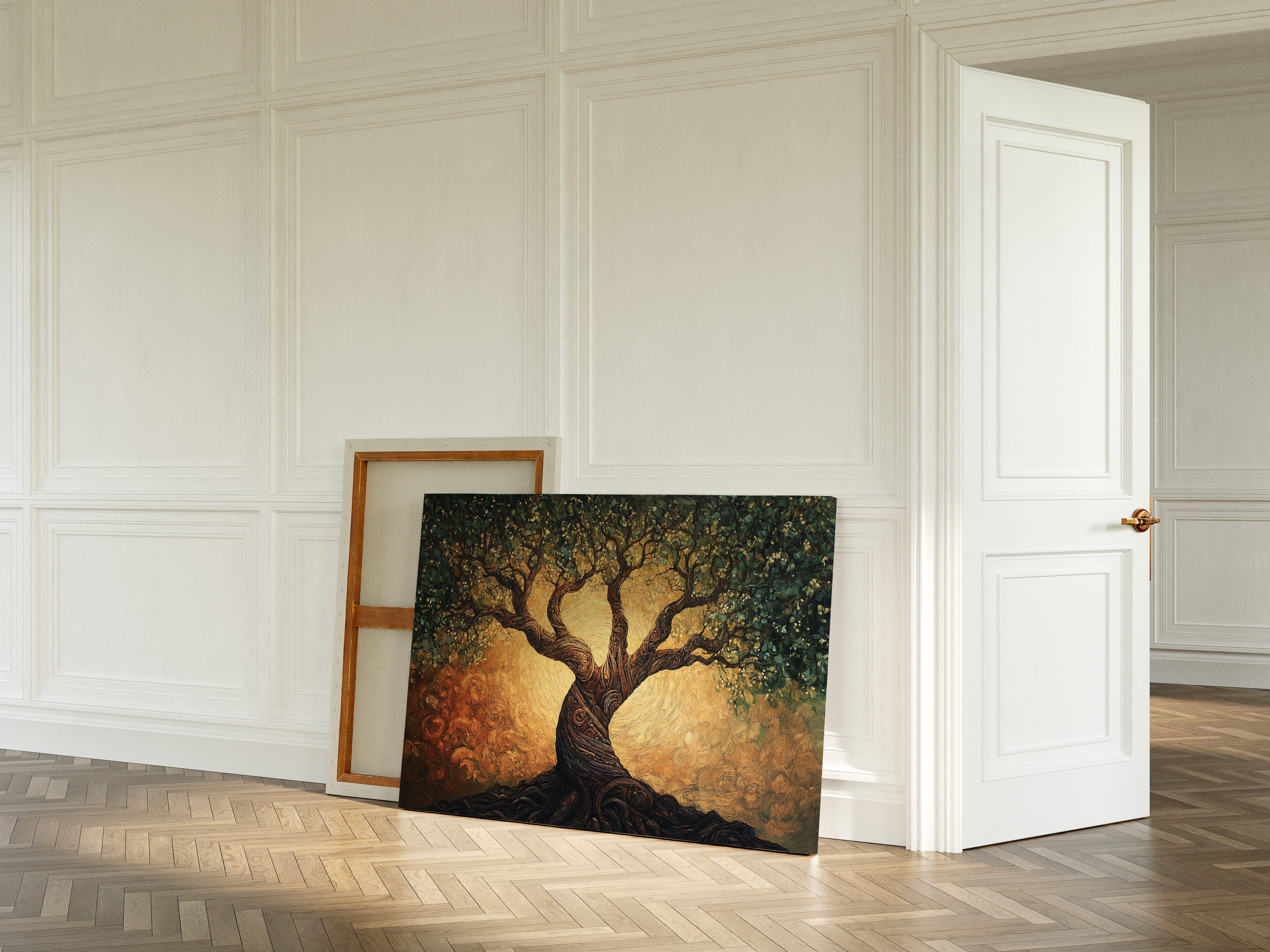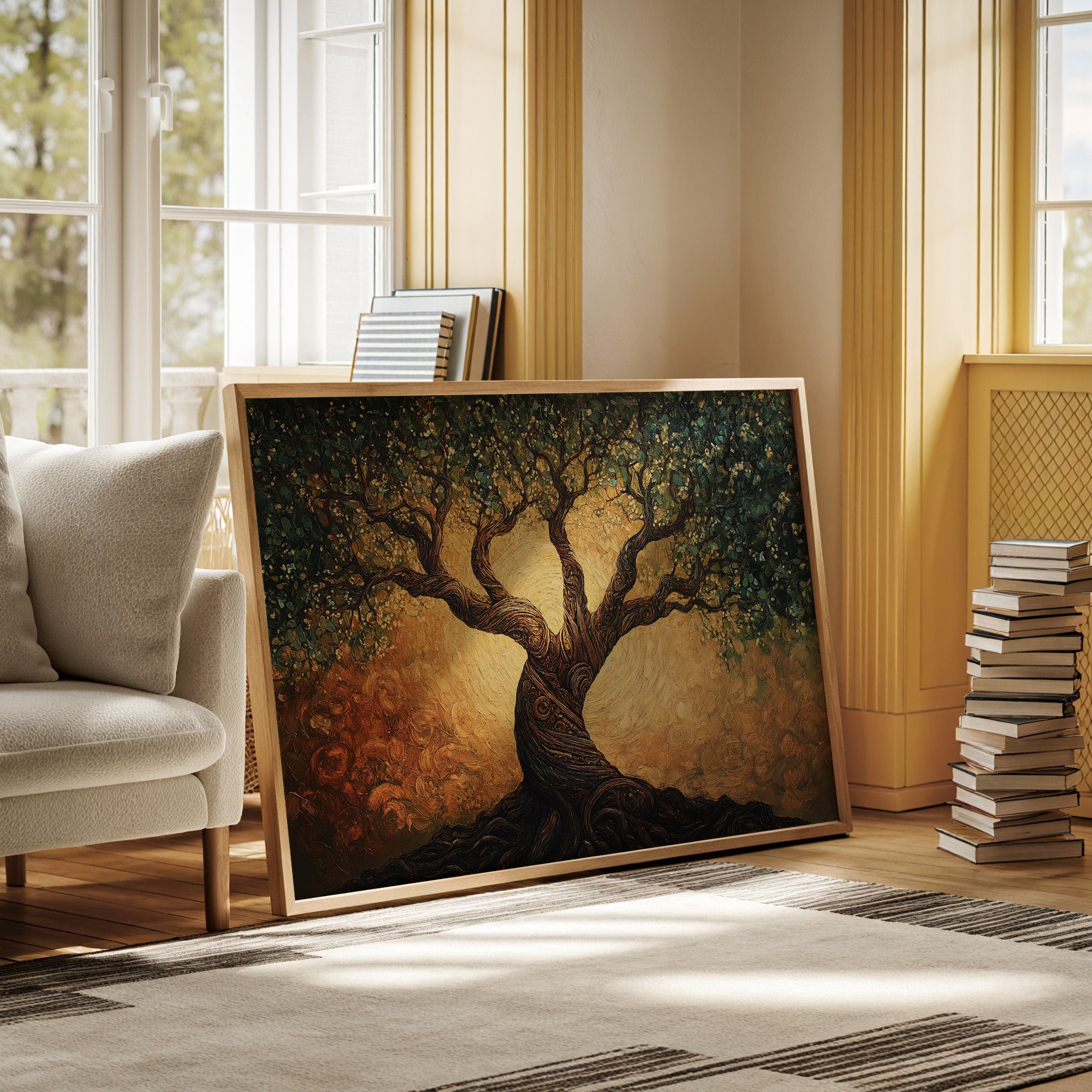 Golden light spills through twisted branches, casting a warm glow across a mystical morning landscape. The gnarled trunk of an ancient tree spirals upward like a dancer frozen mid-twirl, its weathered bark telling stories of centuries past. Deep emerald leaves catch the morning light like scattered jewels, while the textured brushstrokes create a sense of movement and vitality in every branch and root. This piece captures the magical moment when daybreak transforms an ancient guardian into living gold. Perfect for spaces seeking to create a sense of timeless wonder, from meditation rooms to grand entryways where its presence can inspire daily contemplation.
