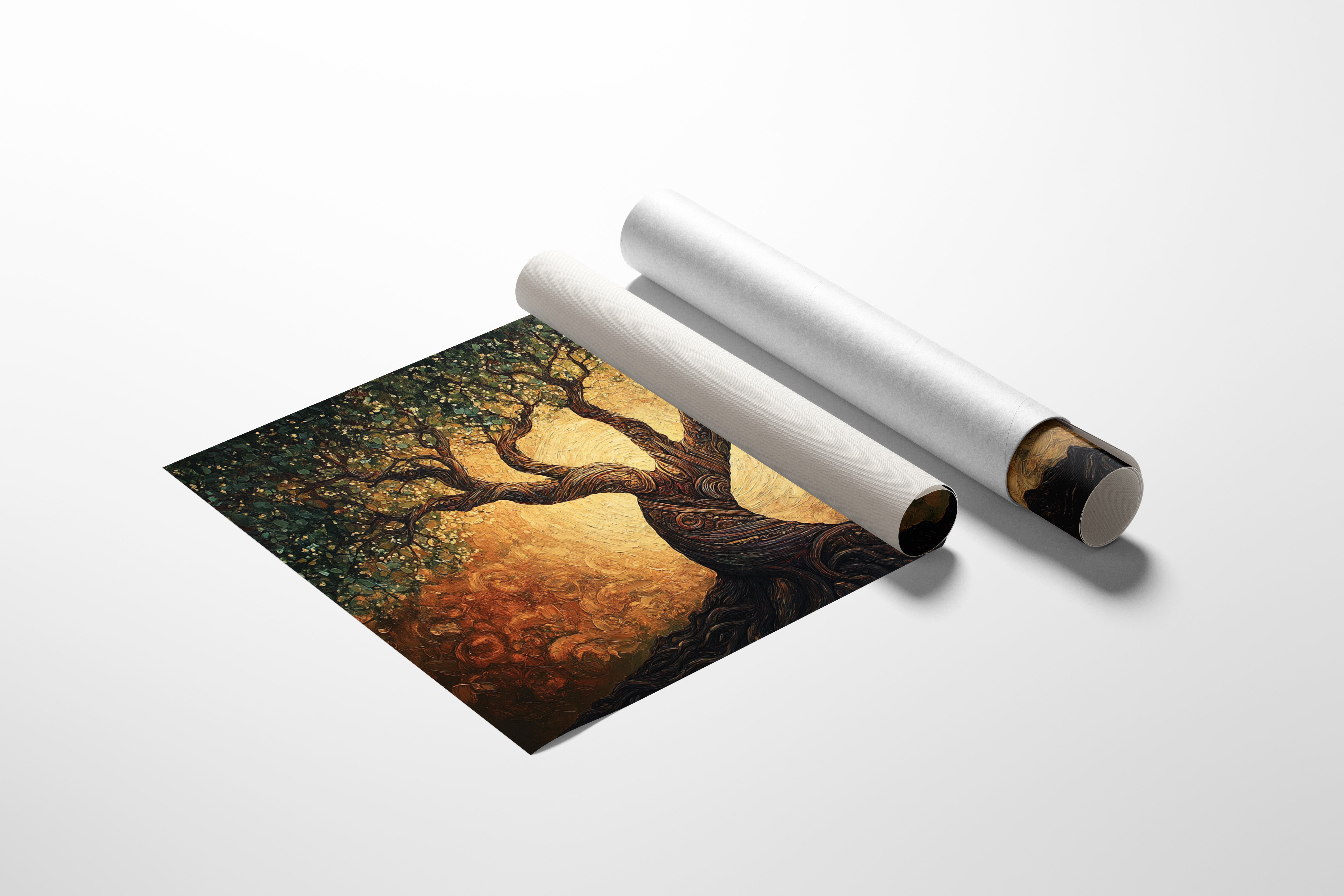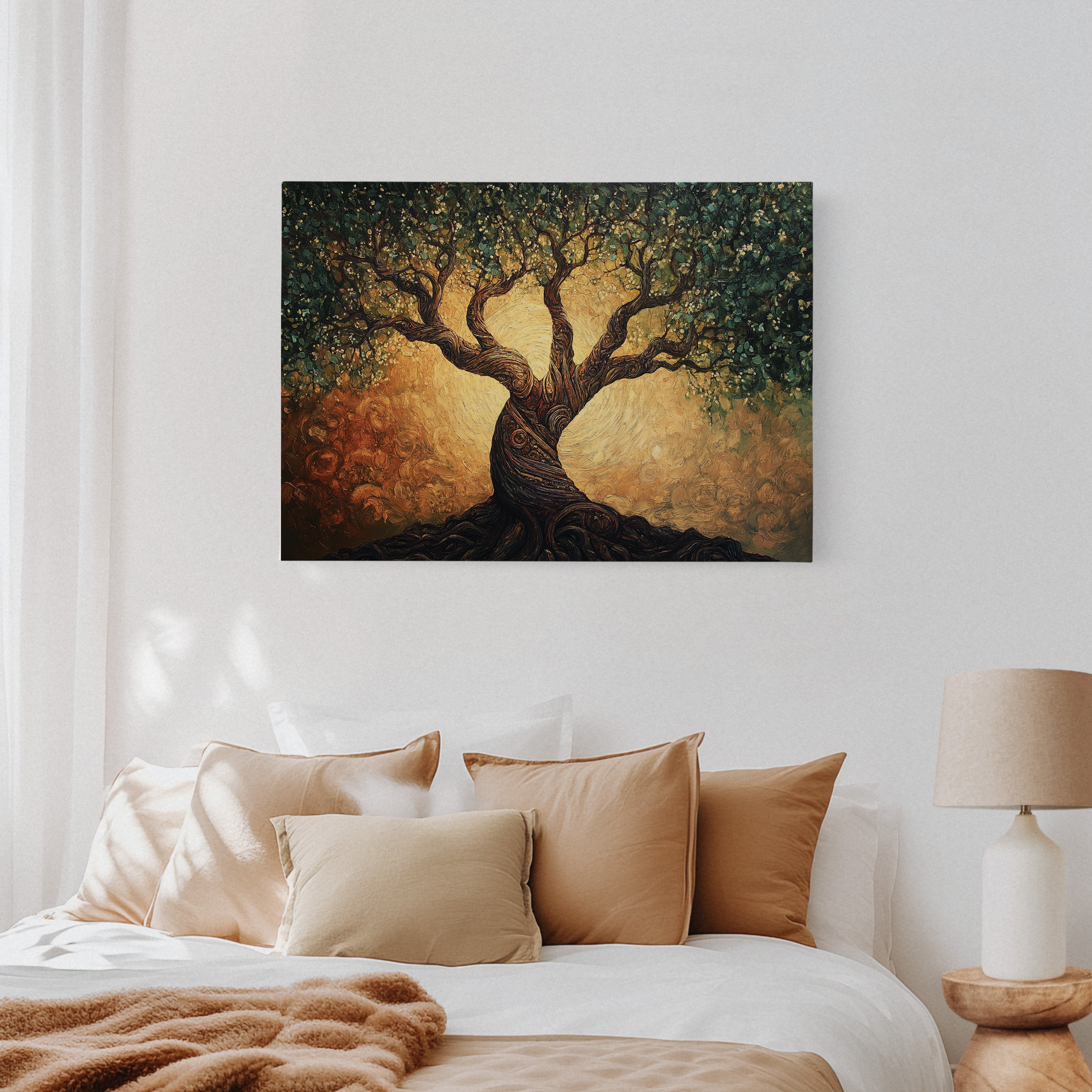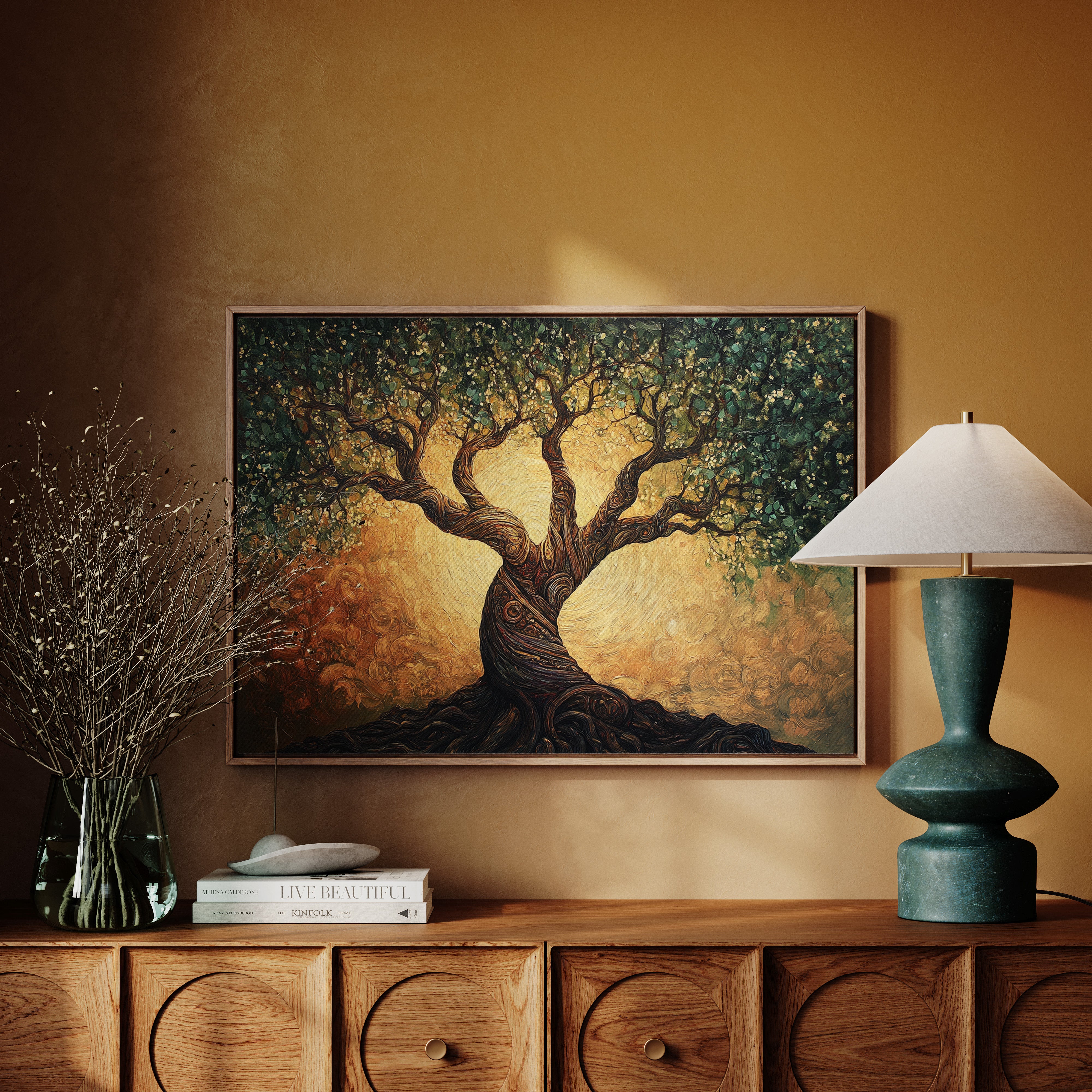 Golden light spills through twisted branches, casting a warm glow across a mystical morning landscape. The gnarled trunk of an ancient tree spirals upward like a dancer frozen mid-twirl, its weathered bark telling stories of centuries past. Deep emerald leaves catch the morning light like scattered jewels, while the textured brushstrokes create a sense of movement and vitality in every branch and root. This piece captures the magical moment when daybreak transforms an ancient guardian into living gold. Perfect for spaces seeking to create a sense of timeless wonder, from meditation rooms to grand entryways where its presence can inspire daily contemplation.