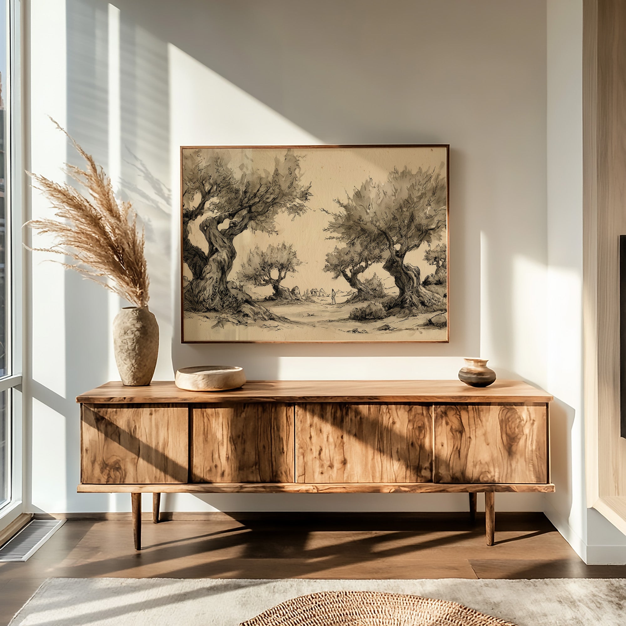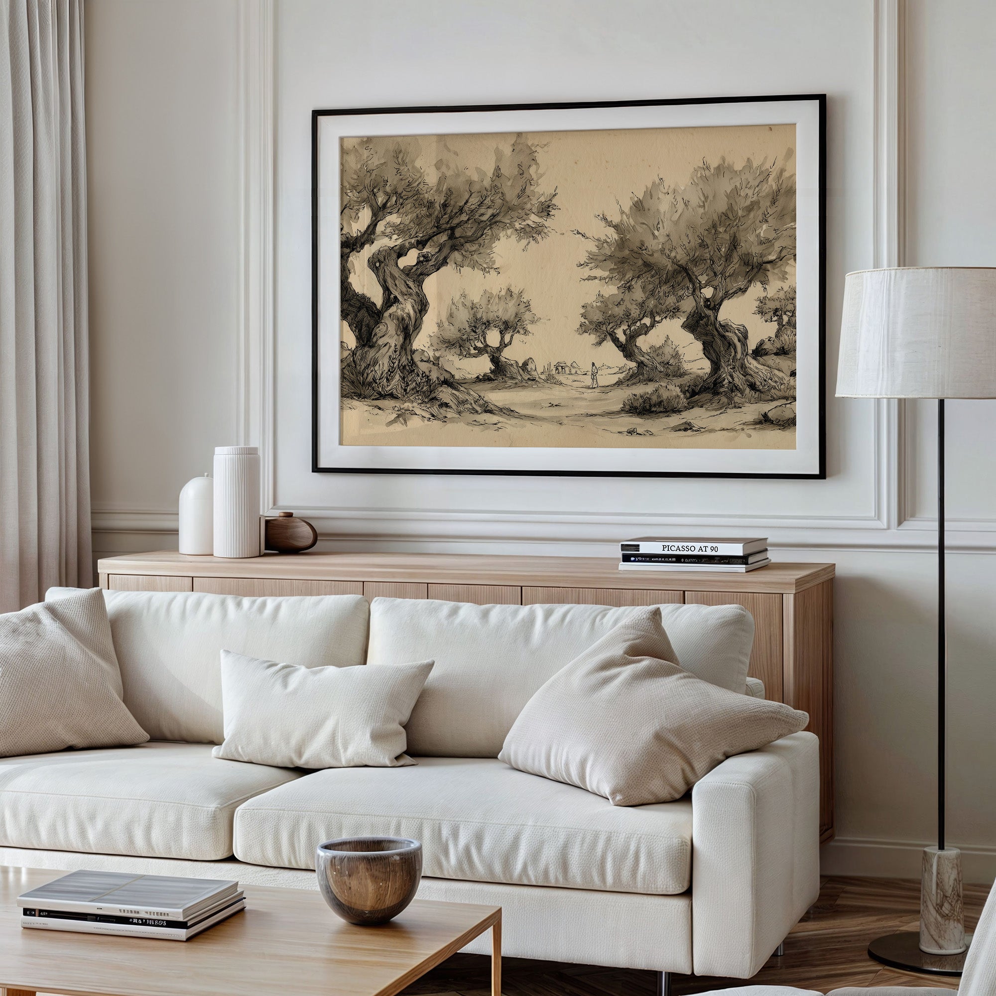 Soft morning light warms this ink drawing of gnarled olive trees standing sentinel along a winding path. The delicate brushwork captures the twisted trunks and feathery foliage, creating a scene of Mediterranean tranquility where a solitary figure journeys toward distant buildings. Displayed on a wooden bookshelf alongside dried pampas grass and cherished volumes, this artwork brings a contemplative pause to a reading nook or study where stories both written and visual intertwine.