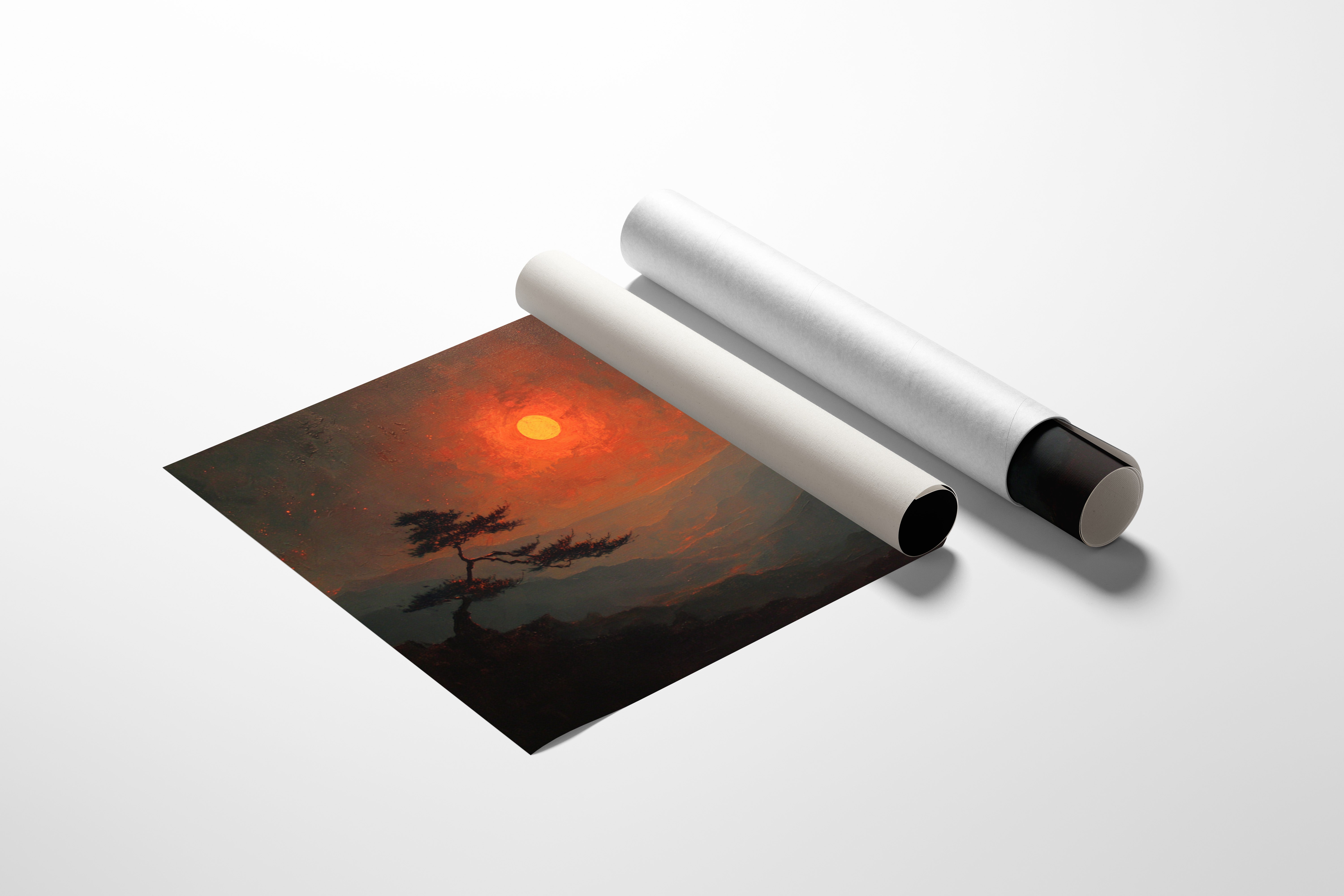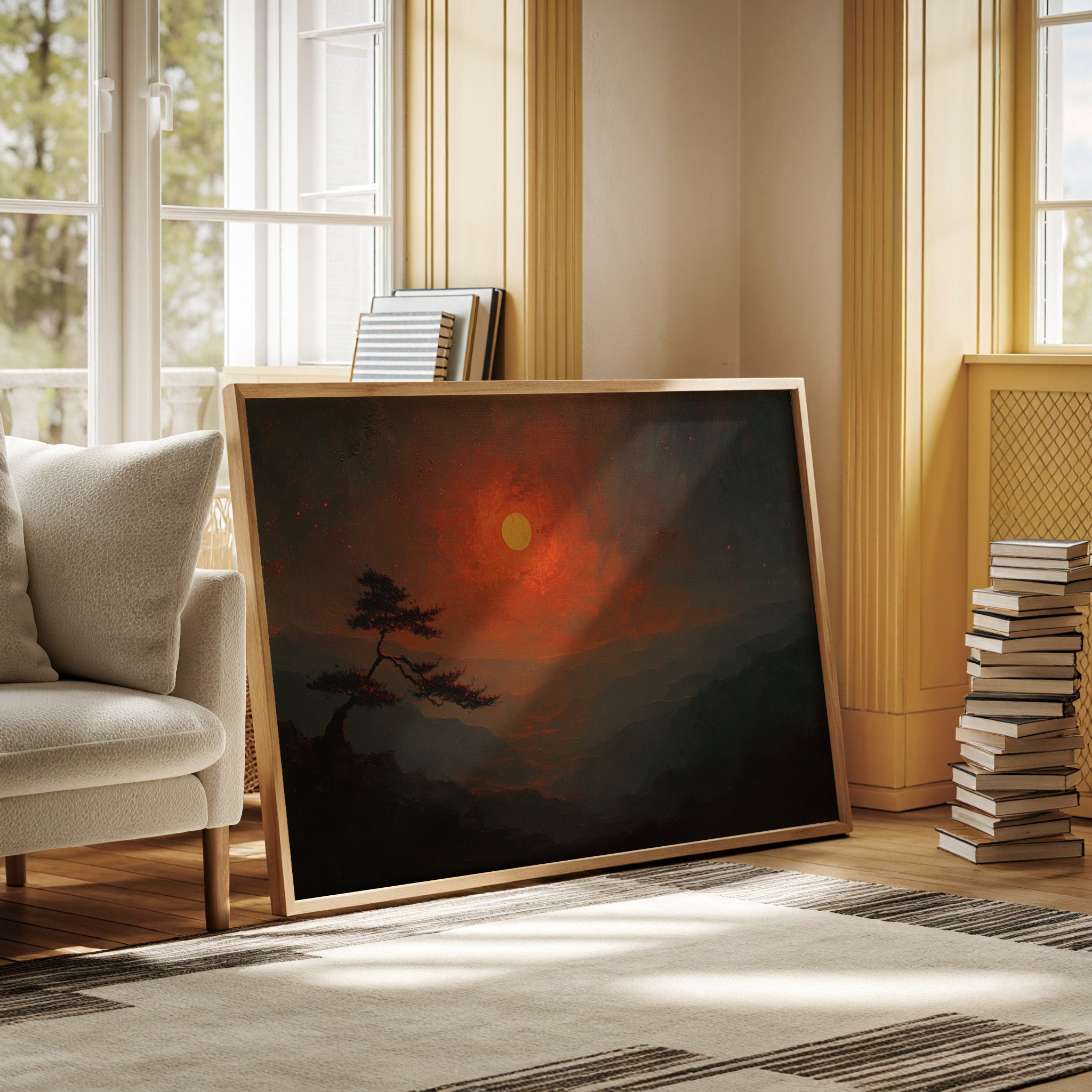 A solitary pine tree stands sentinel on a rocky precipice, its windswept form silhouetted against a mesmerizing crimson sky. The blood-red sun hangs like a luminous orb, casting its ethereal glow across layered mountain valleys shrouded in mysterious shadows. Deep emerald darkness mingles with fiery copper tones, creating a dramatic interplay of light and shadow that speaks to nature's raw beauty and endurance. This piece captures a moment of profound solitude and natural majesty, where earth meets sky in a dramatic display of color and form. Perfect for creating a bold focal point in a modern living room or adding dramatic atmosphere to a meditation space.
