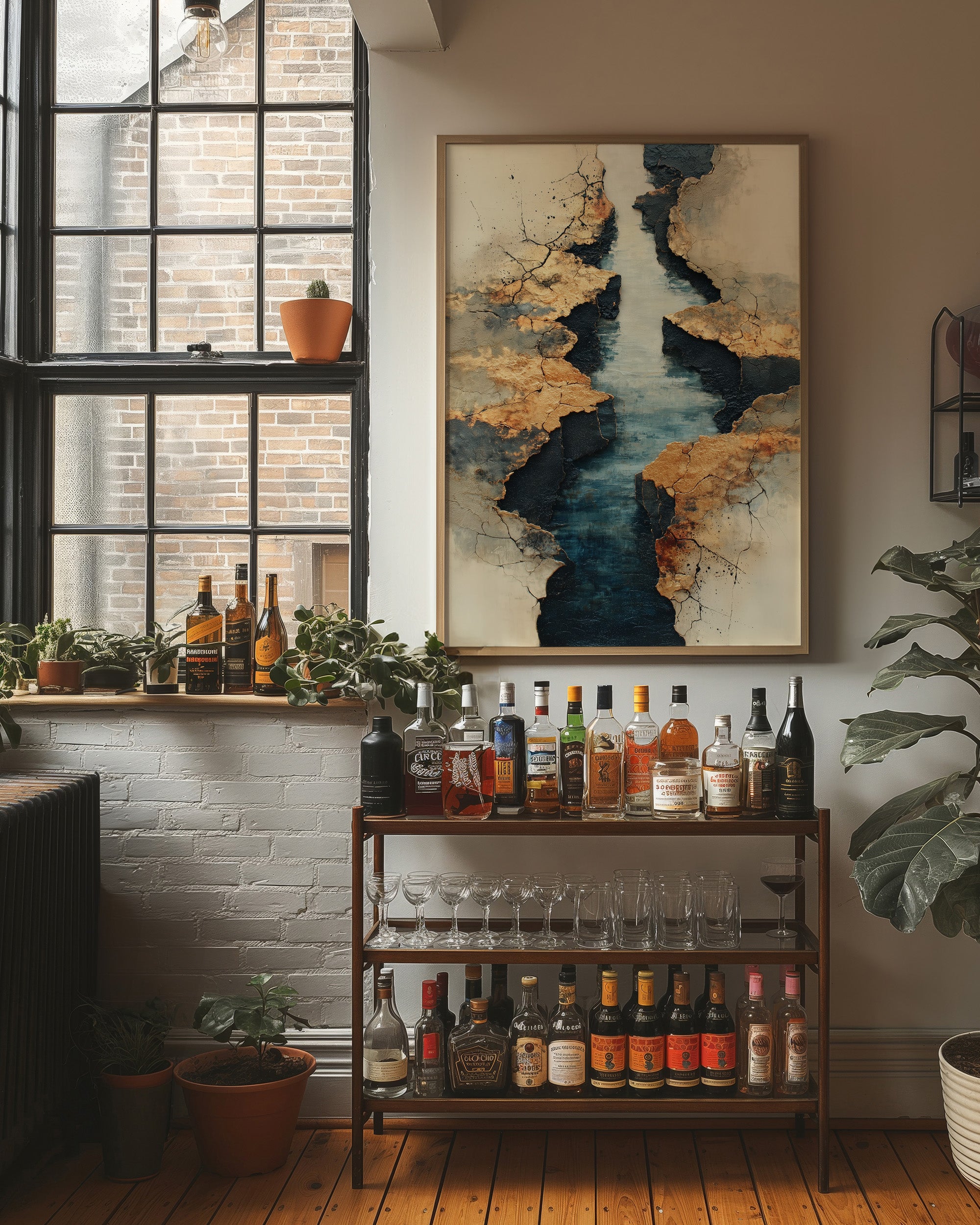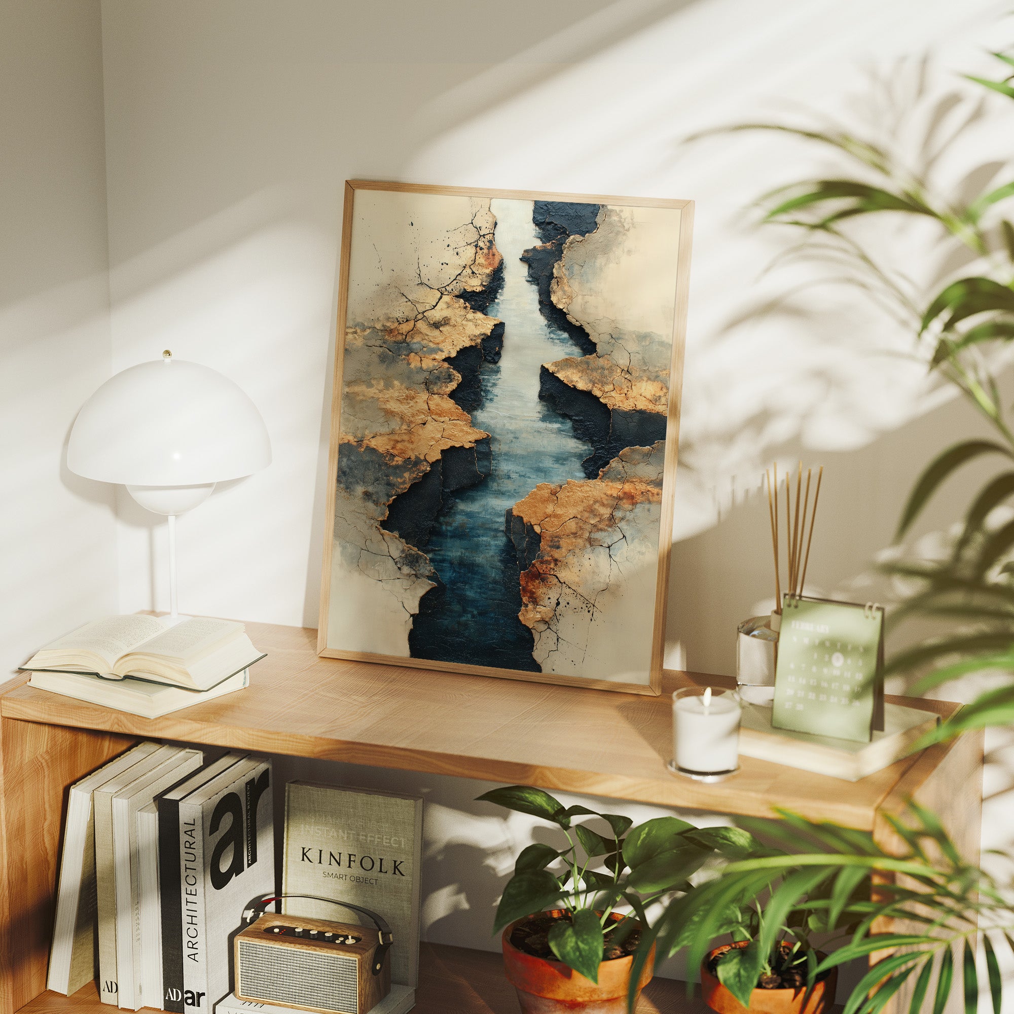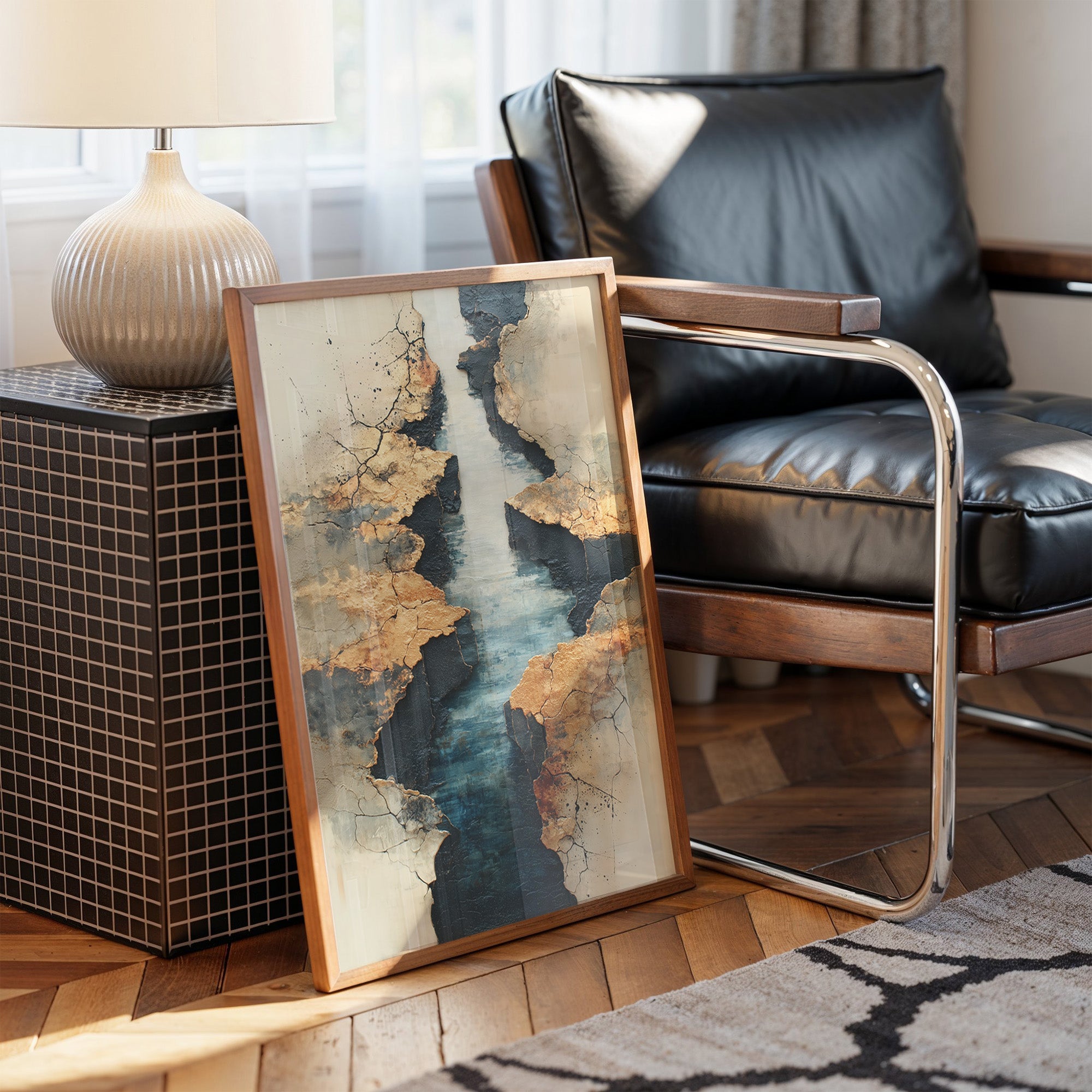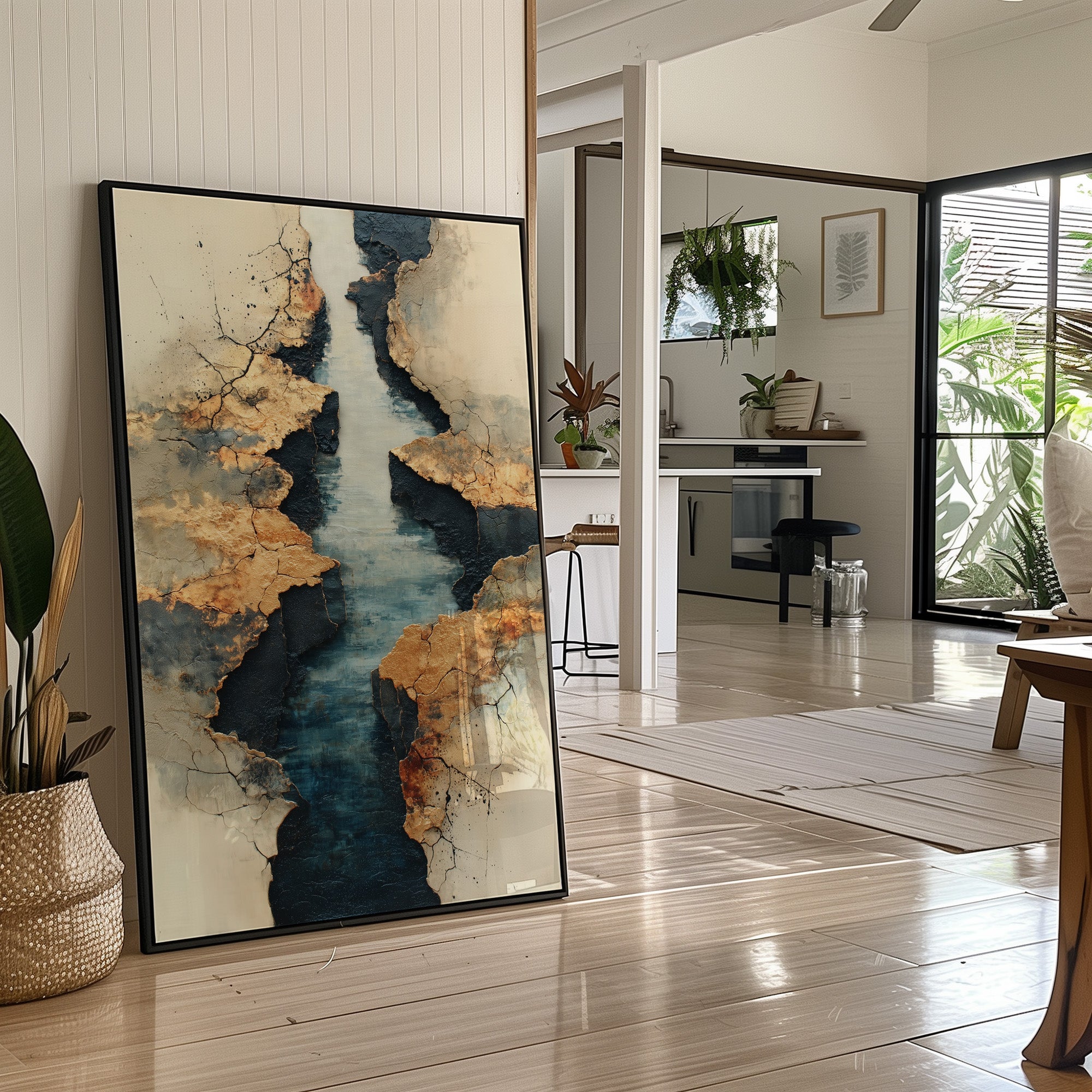 Like a map drawn by time itself, deep turquoise waters wind through weathered golden cliffs. The textured landscape reveals layers of history, where metallic earth tones meet cool depths in a dance of natural elements. The composition speaks of geological stories, with cracked surfaces and smooth waters creating a compelling narrative of erosion and endurance. This statement piece brings sophisticated drama to modern interiors, perfect for anchoring a minimalist space with its bold organic presence.
