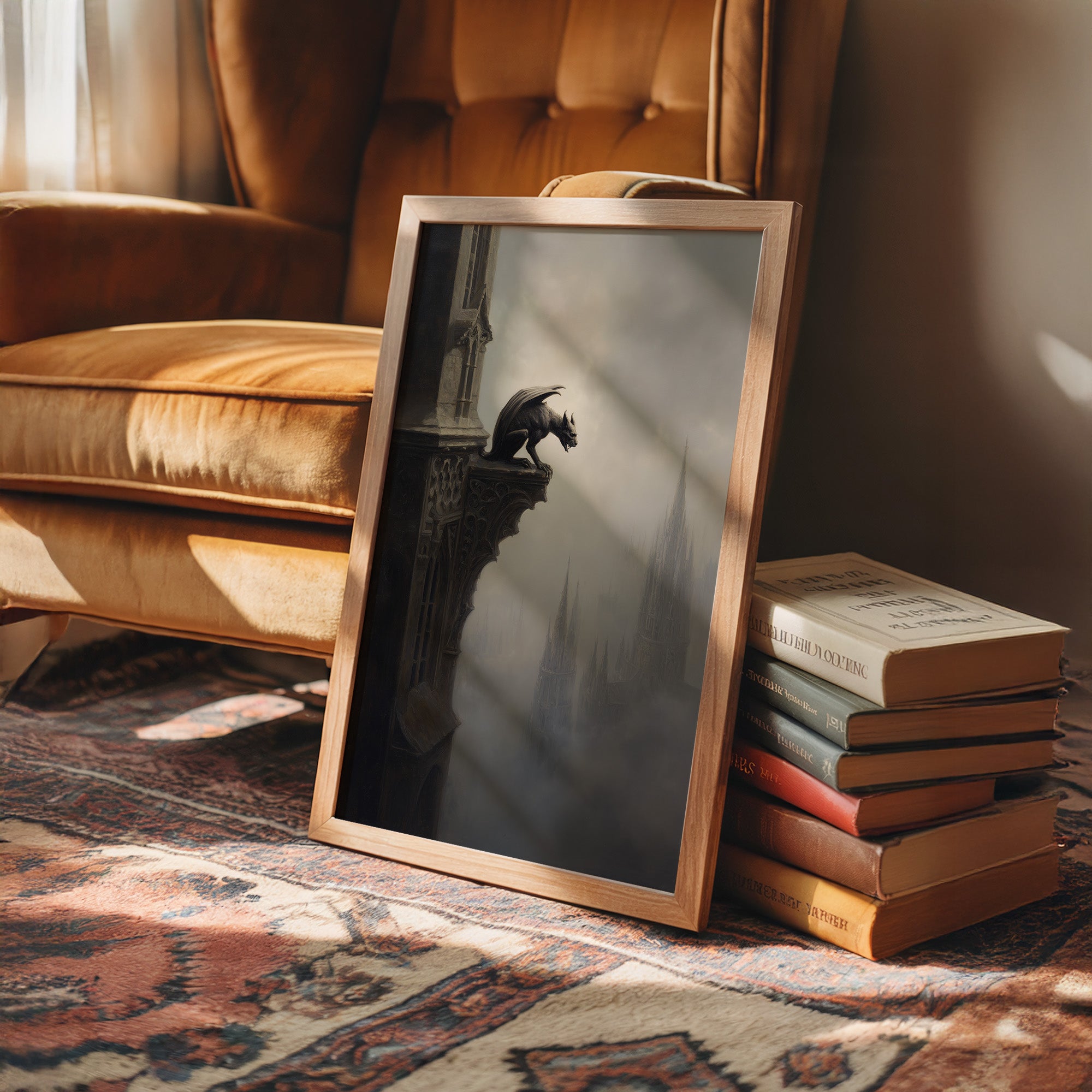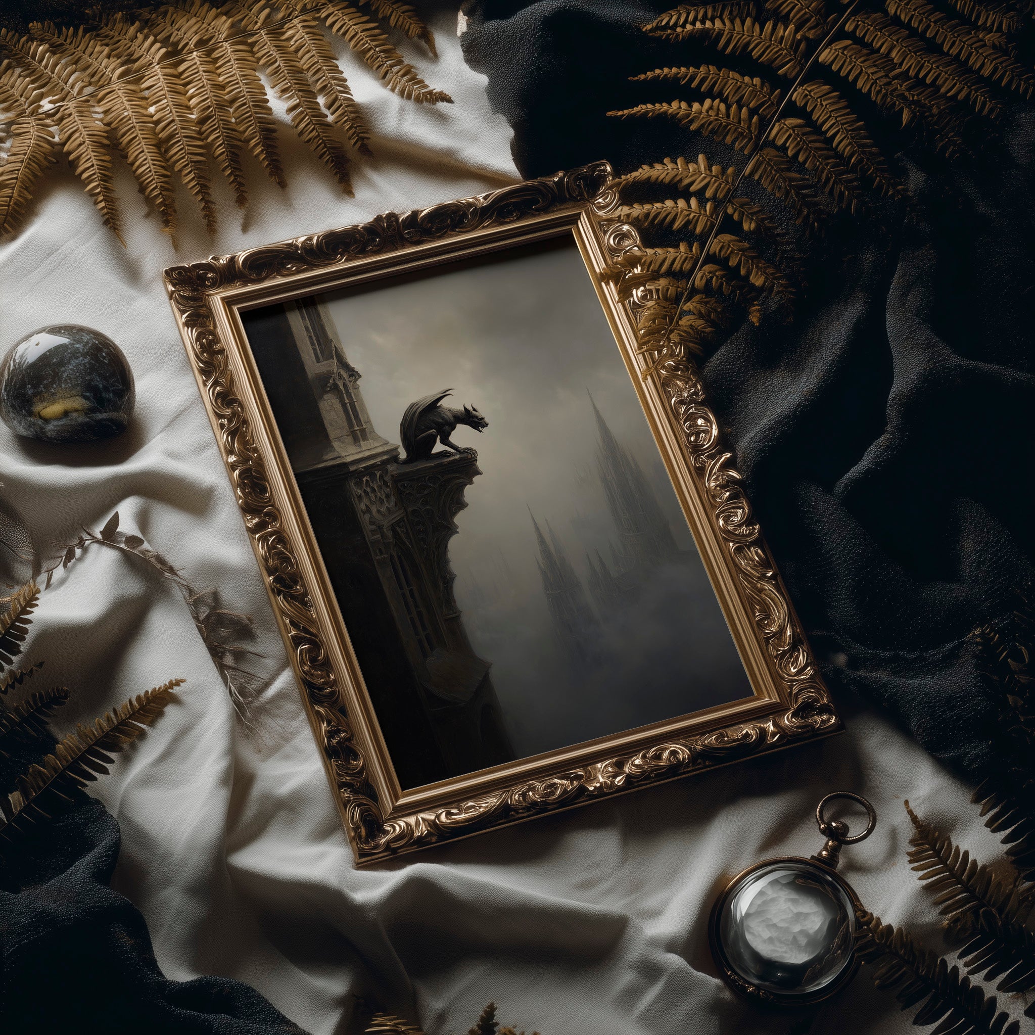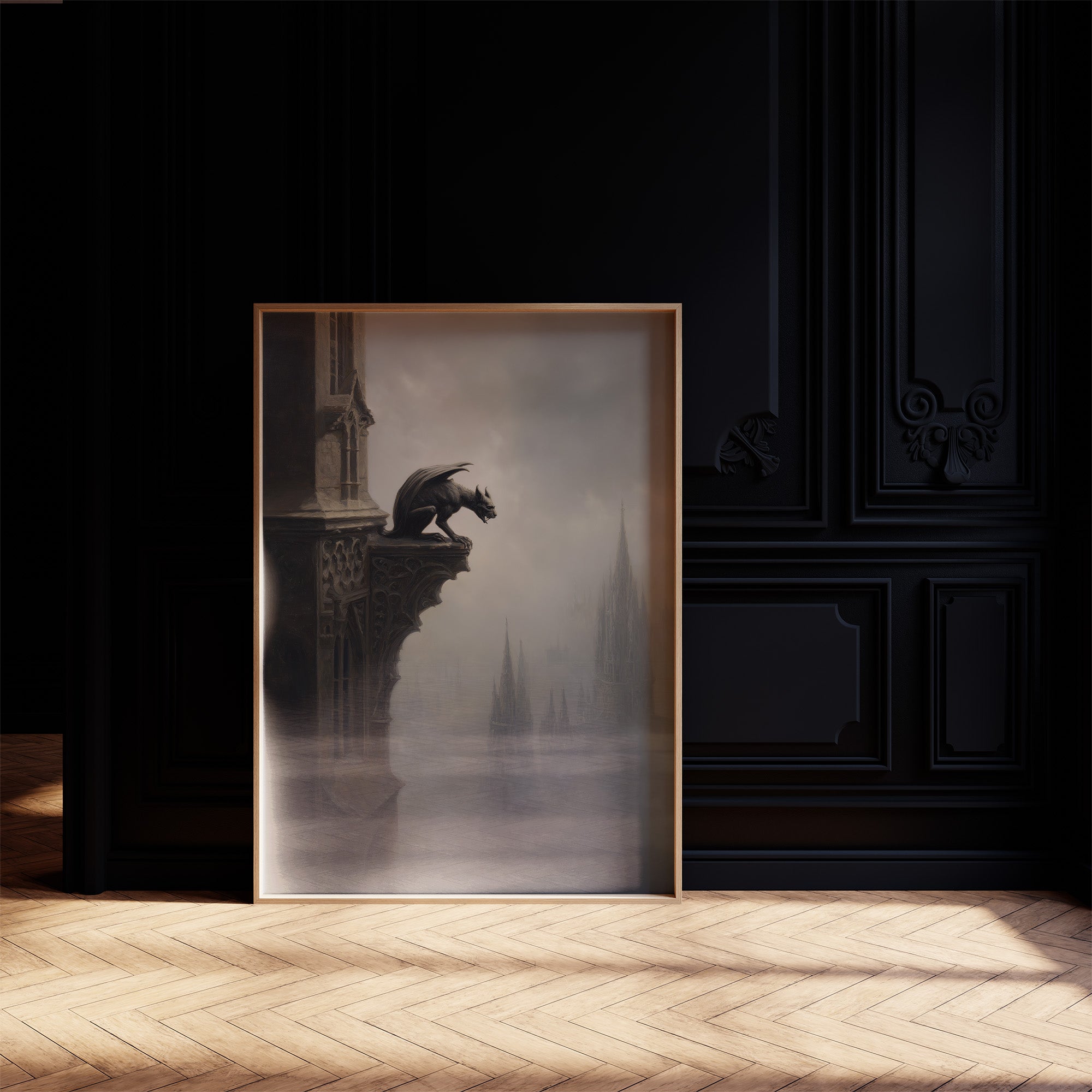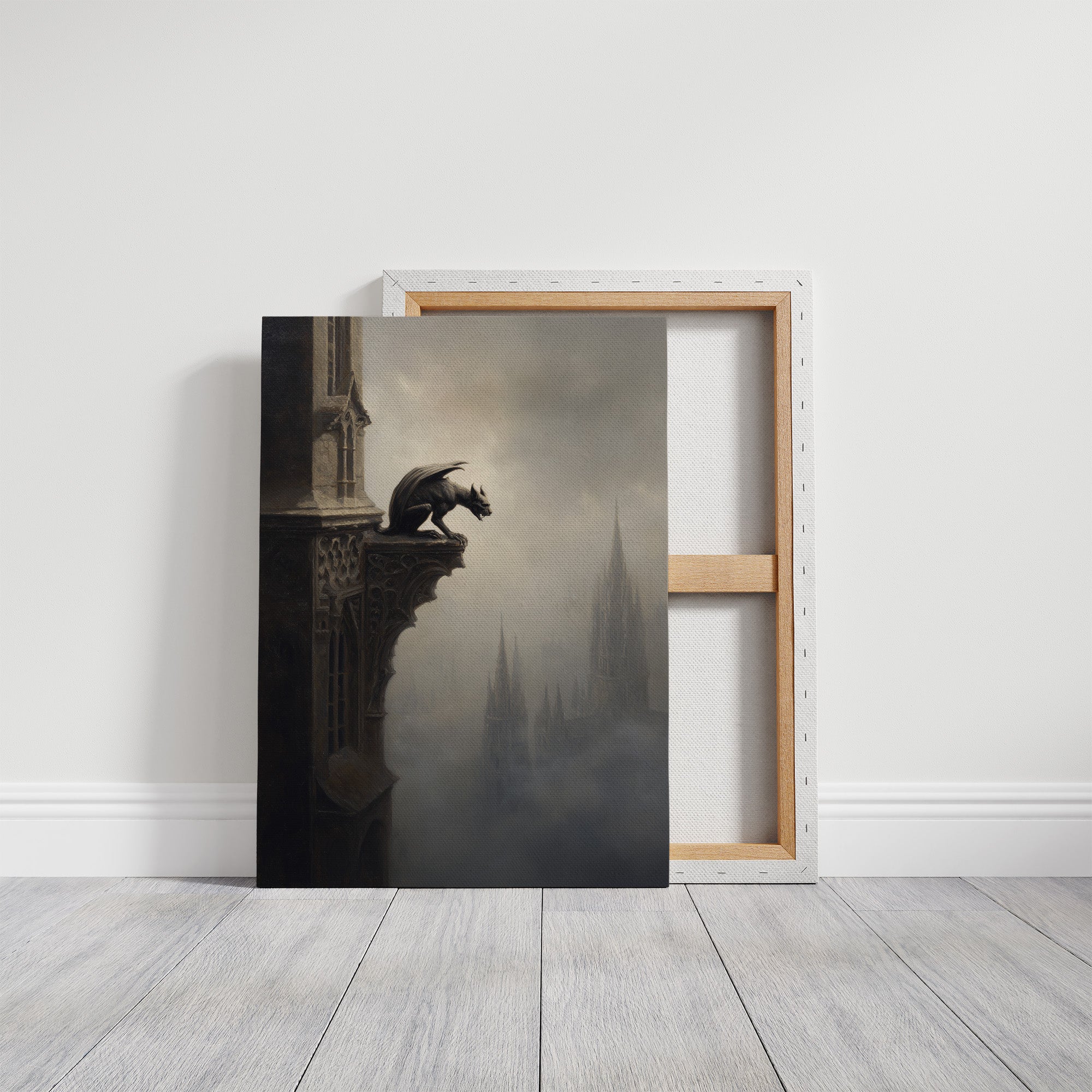 A mysterious gargoyle perches on the edge of weathered stone, vigilant against the shrouded cityscape below. The monochromatic palette creates a haunting dialogue between the gothic creature and distant cathedral spires that fade into mist. This atmospheric piece captures a moment suspended between worldsmedieval architecture emerging from fog like memories refusing to dissolve completely.