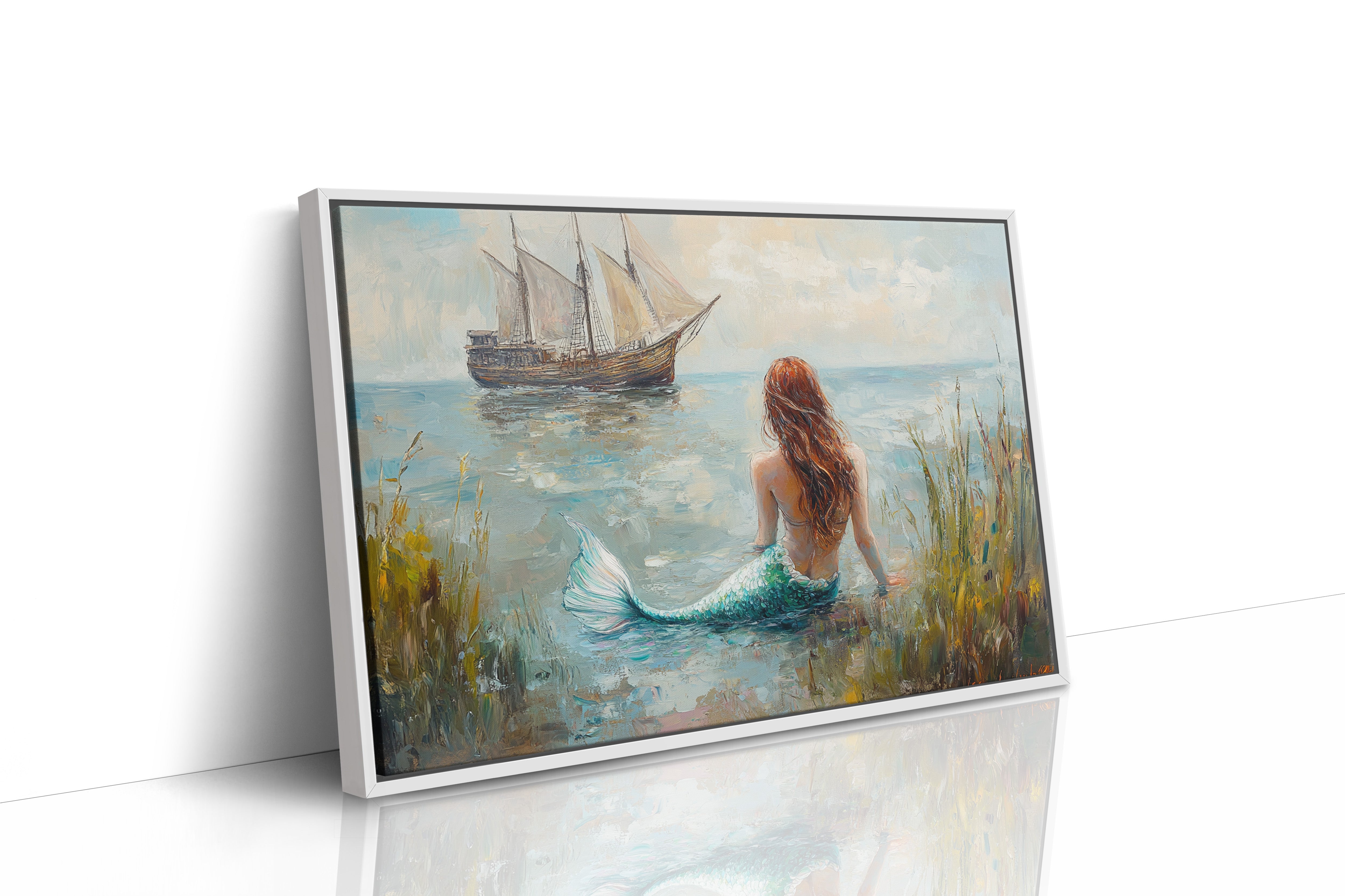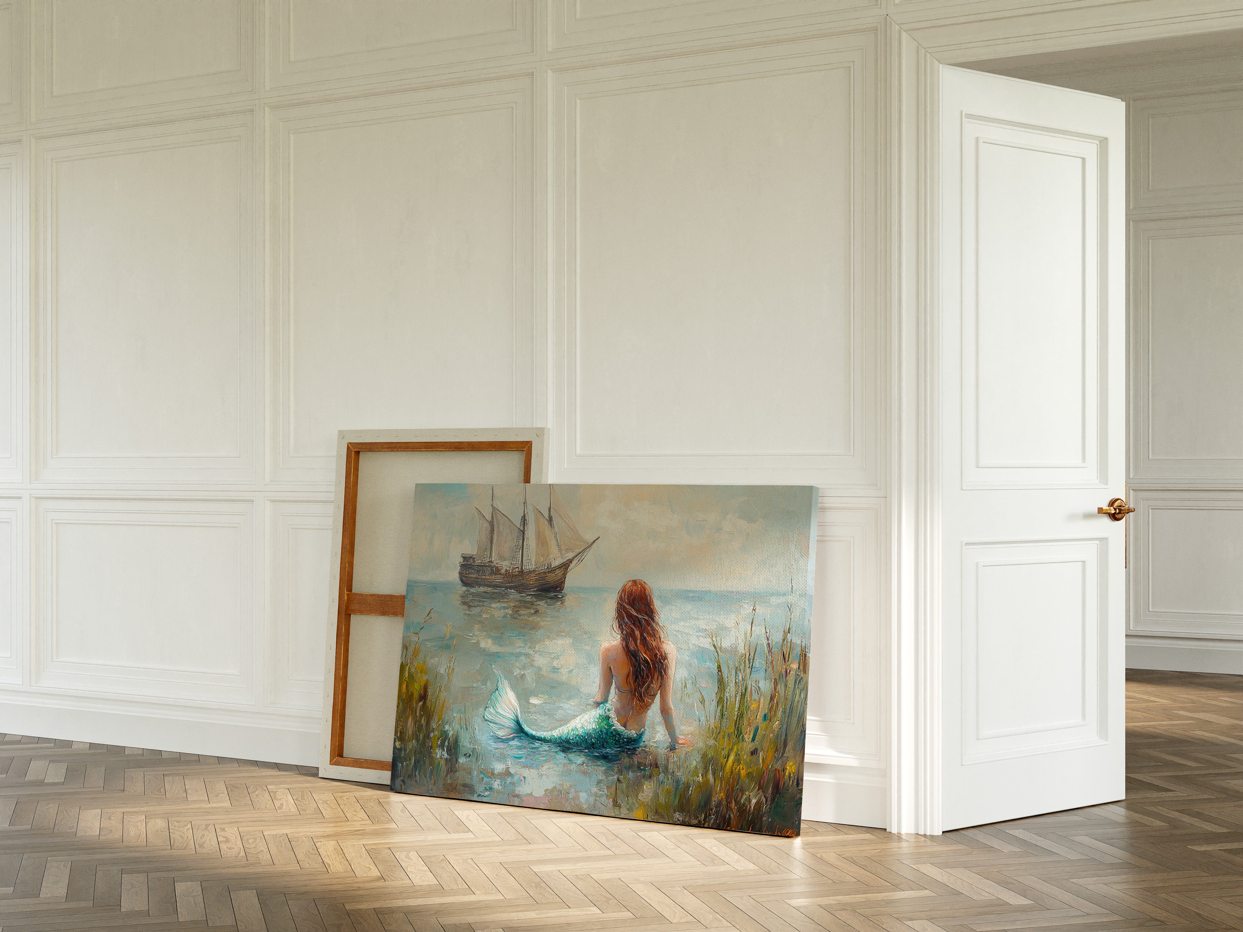 Sunlight dances across tranquil waters where fantasy meets reality. A figure with flowing copper hair sits among swaying marsh grasses, their iridescent tail catching the soft afternoon light. The scene unfolds like a forgotten maritime legend - a weathered sailing vessel drifting on the horizon while delicate brushstrokes capture the interplay of light on scales and sea. Rich textures of oil paint build layers of story through golden reeds, aquamarine waters, and weathered wood of the distant ship. This enchanting piece brings timeless wonder to coastal-inspired spaces, perfect for a reading nook or bedroom where dreams of the sea can take flight.