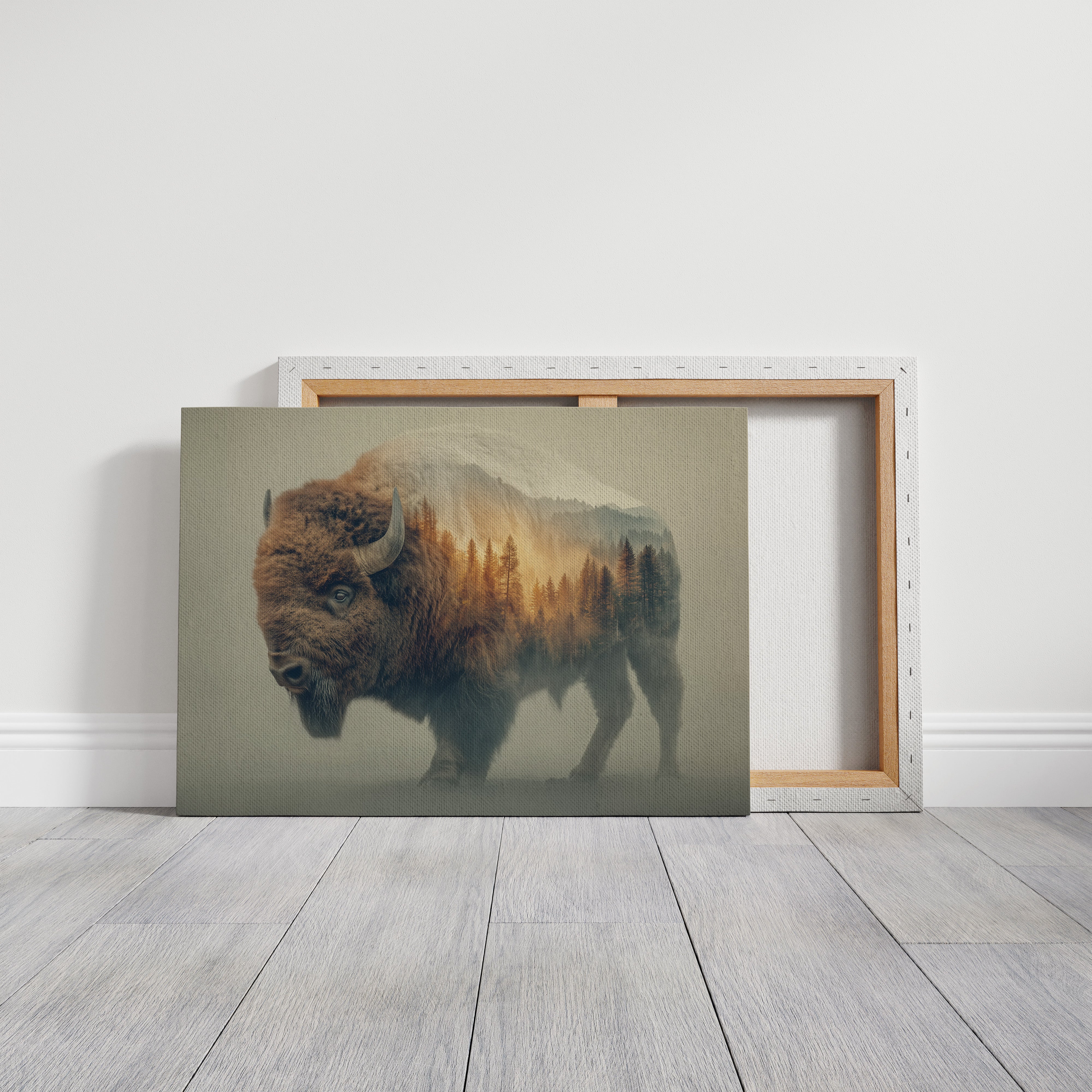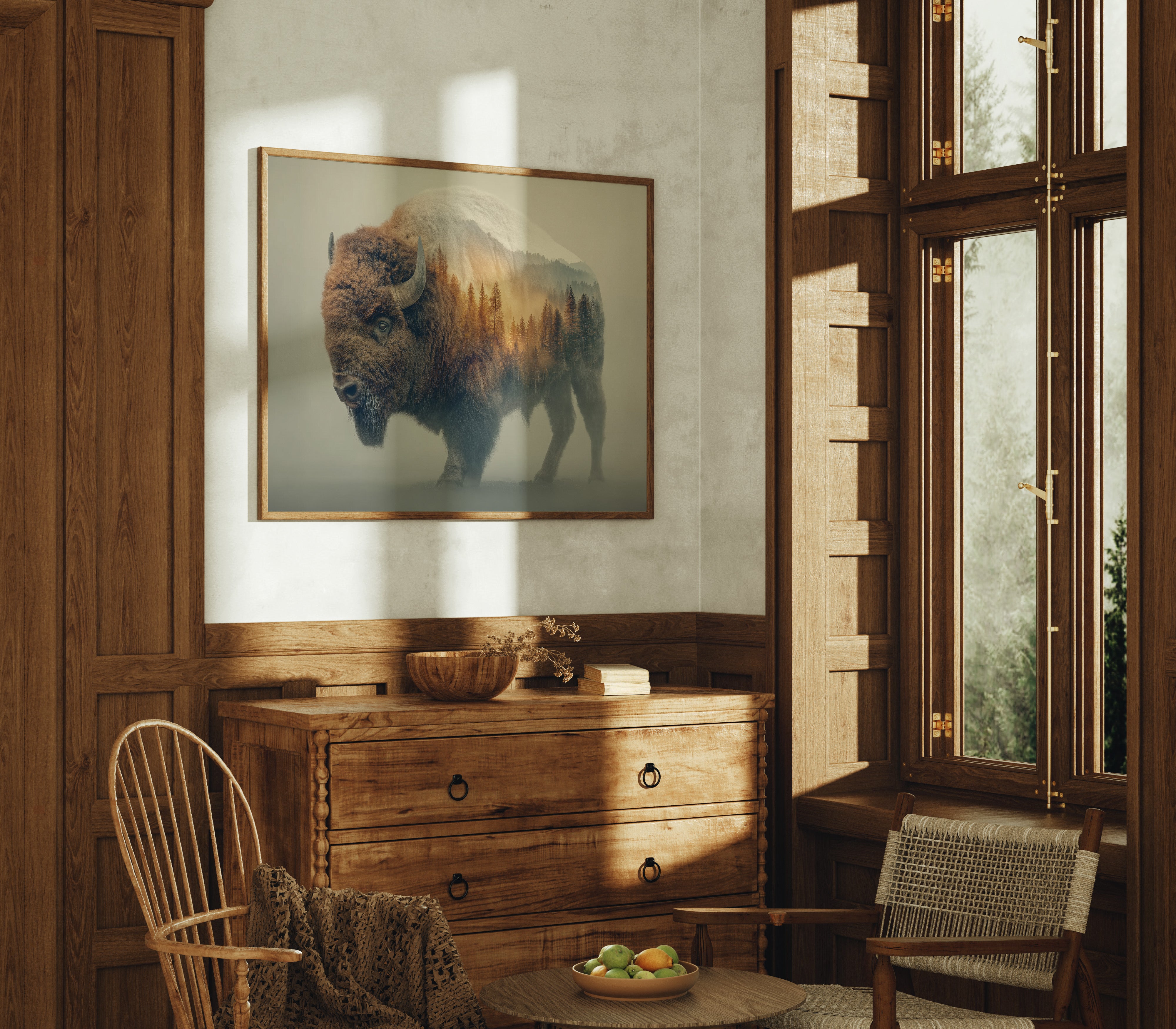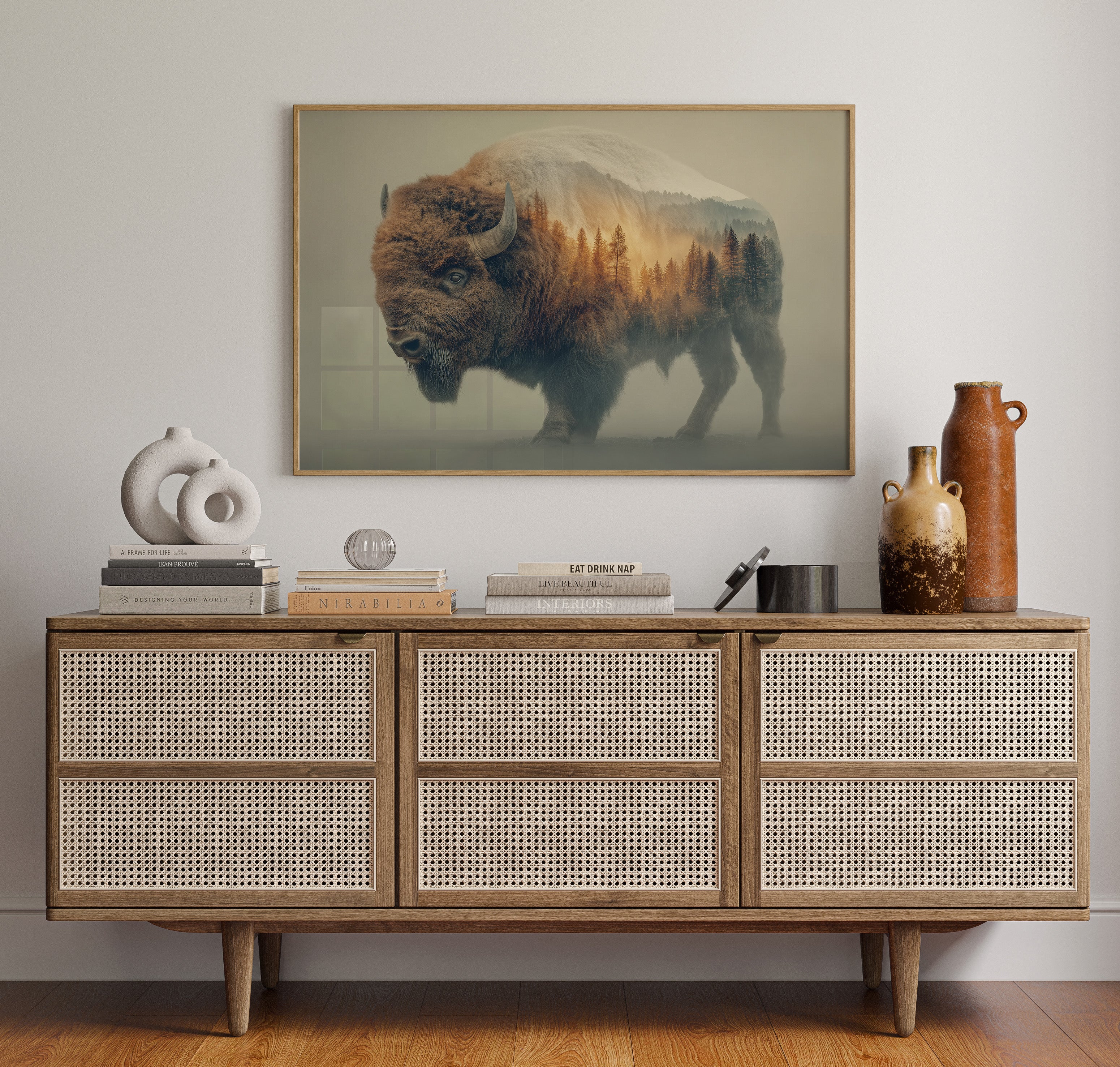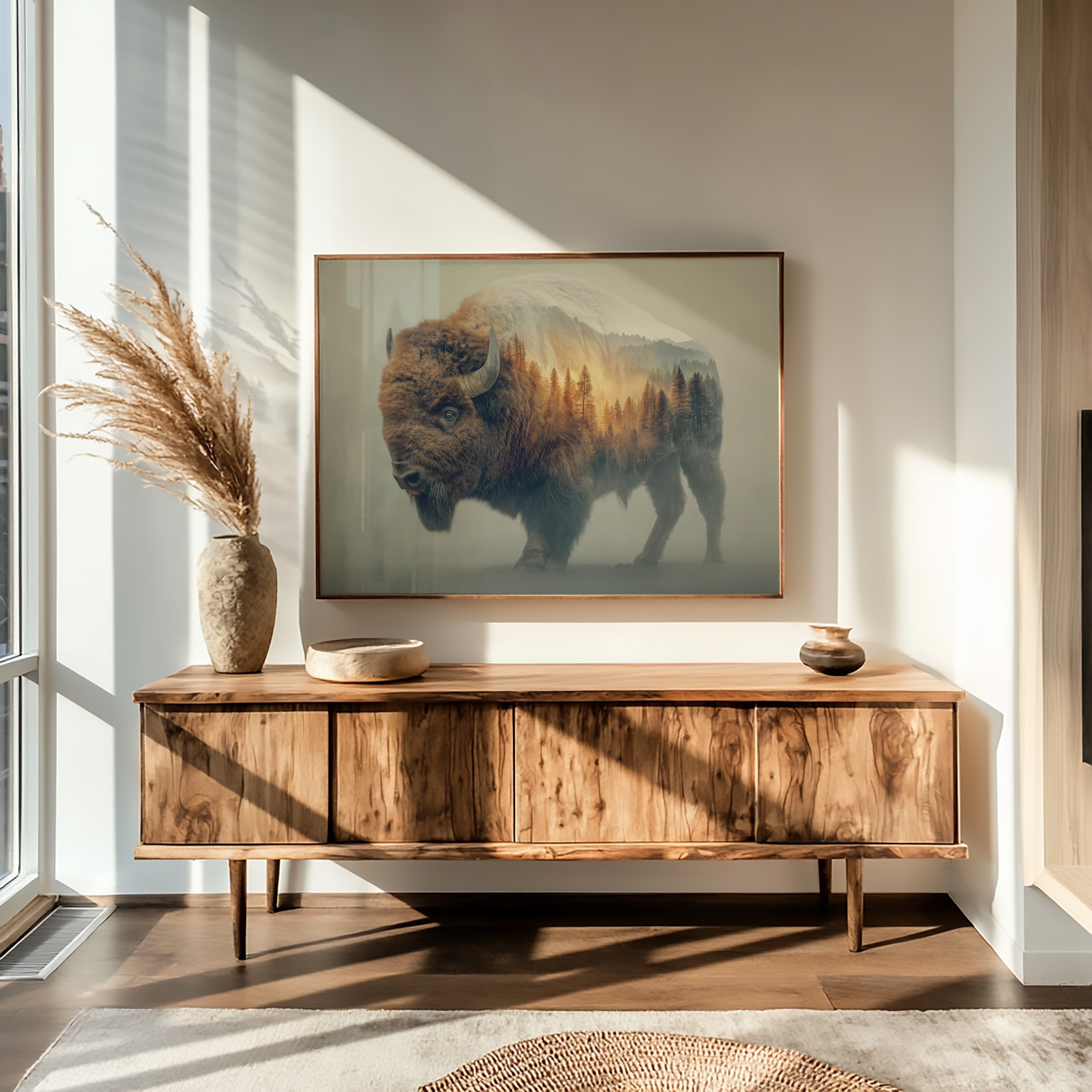 Morning mist swirls around a majestic bison, its form merging with a golden forest landscape in an ethereal double exposure. This contemporary piece masterfully blends wildlife photography with mystical natural elements. The warm amber glow of sunrise illuminates towering pines within the bison's silhouette, while delicate fog creates an otherworldly atmosphere that speaks to the deep connection between creature and land. The rich browns and moody grays paint a story of strength and serenity, perfectly capturing the spirit of the American West. This striking piece makes a bold statement in a modern living room or adds natural majesty to an office space. Its contemplative nature invites viewers to pause and connect with the untamed beauty of our natural world.