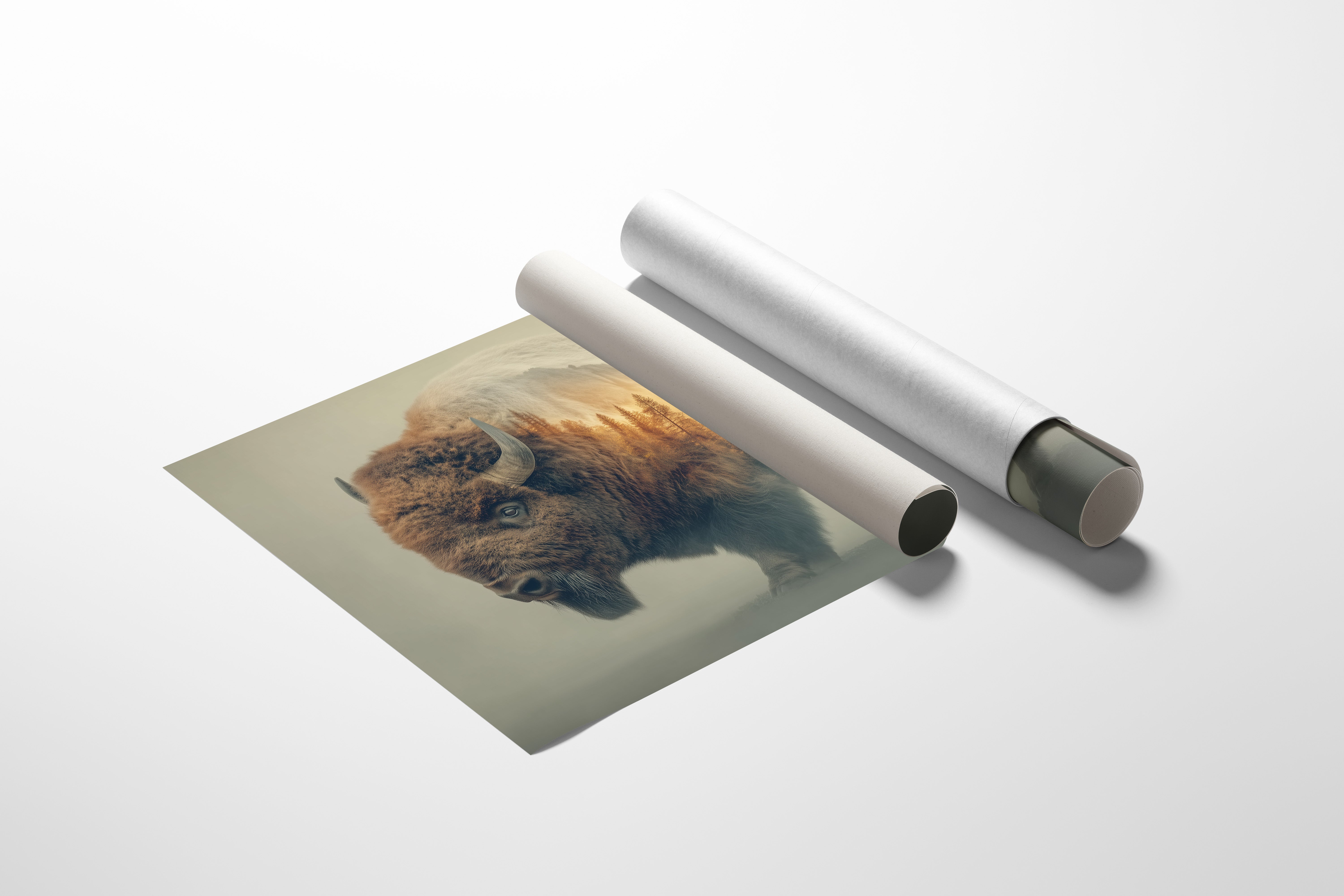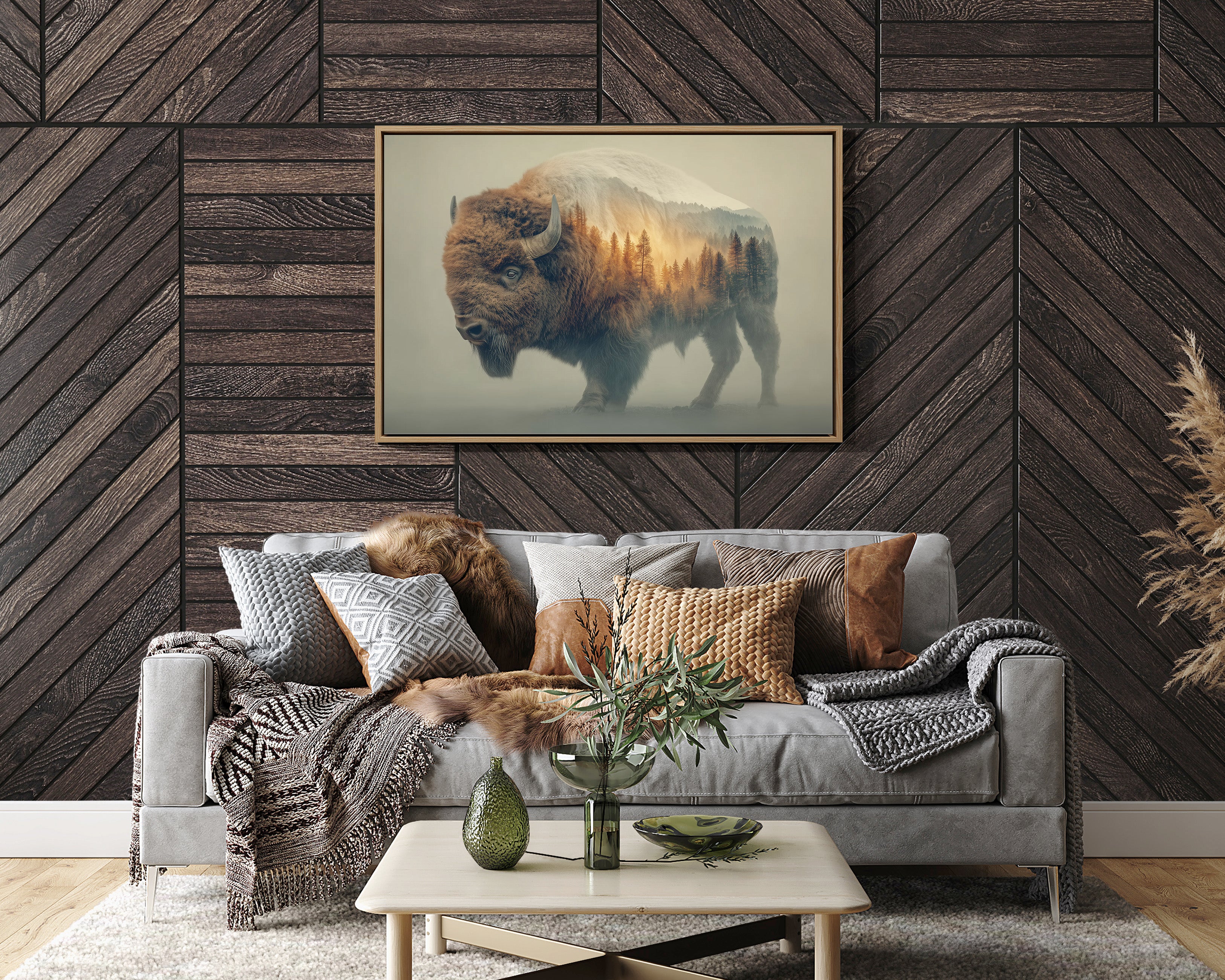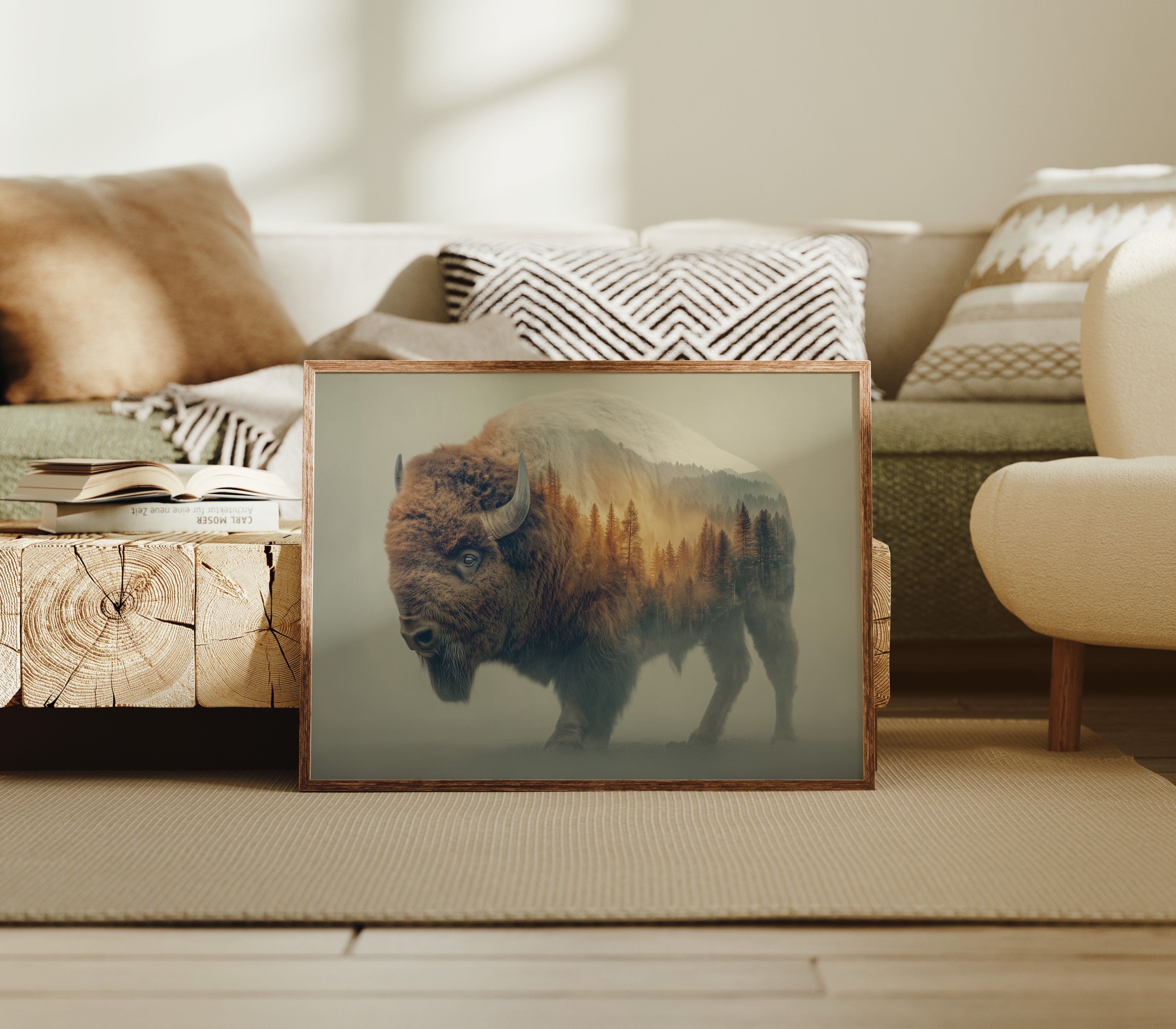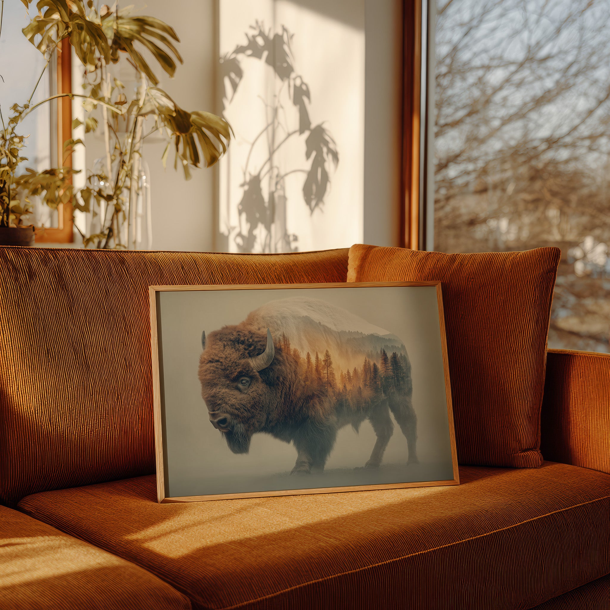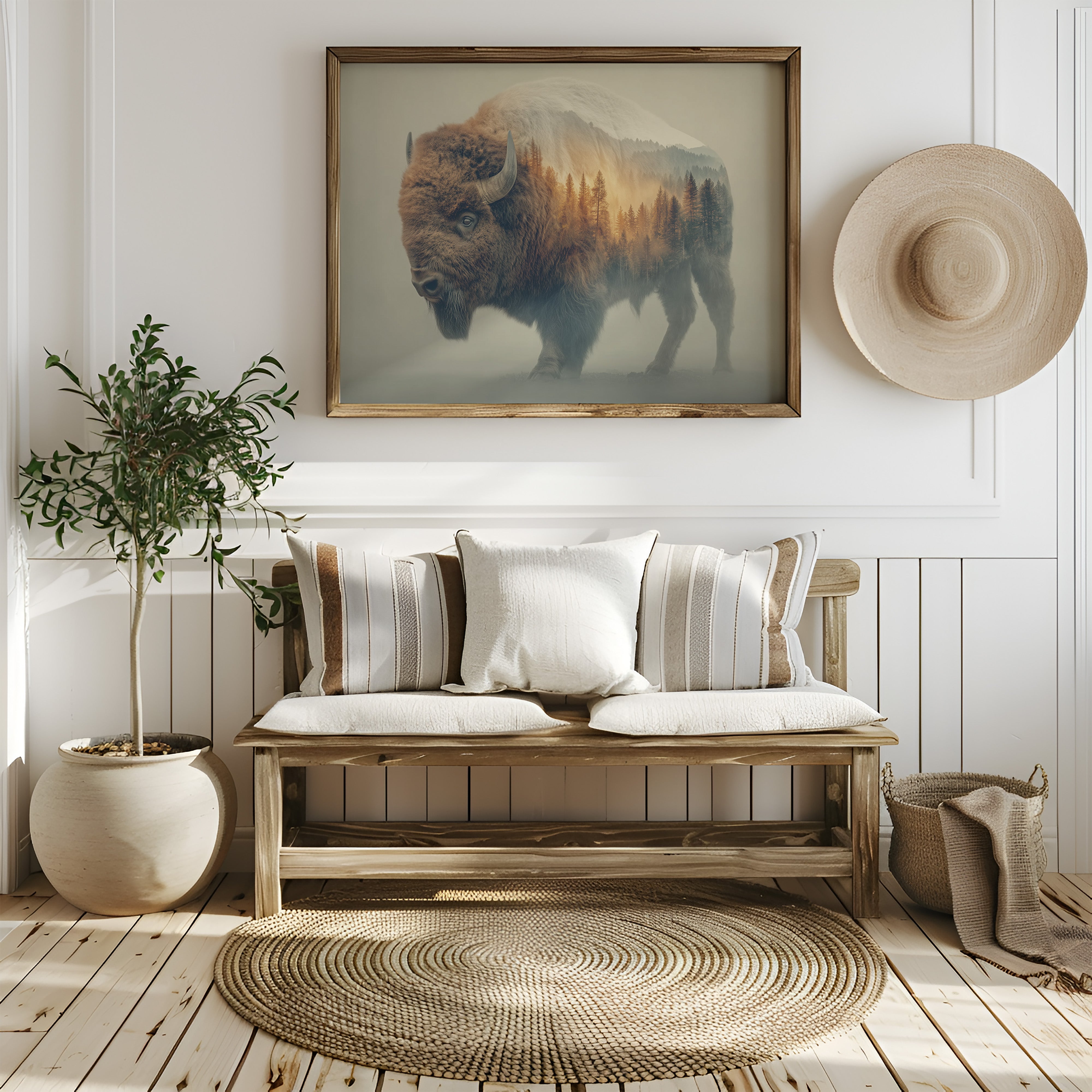 Morning mist swirls around a majestic bison, its form merging with a golden forest landscape in an ethereal double exposure. This contemporary piece masterfully blends wildlife photography with mystical natural elements. The warm amber glow of sunrise illuminates towering pines within the bison's silhouette, while delicate fog creates an otherworldly atmosphere that speaks to the deep connection between creature and land. The rich browns and moody grays paint a story of strength and serenity, perfectly capturing the spirit of the American West. This striking piece makes a bold statement in a modern living room or adds natural majesty to an office space. Its contemplative nature invites viewers to pause and connect with the untamed beauty of our natural world.