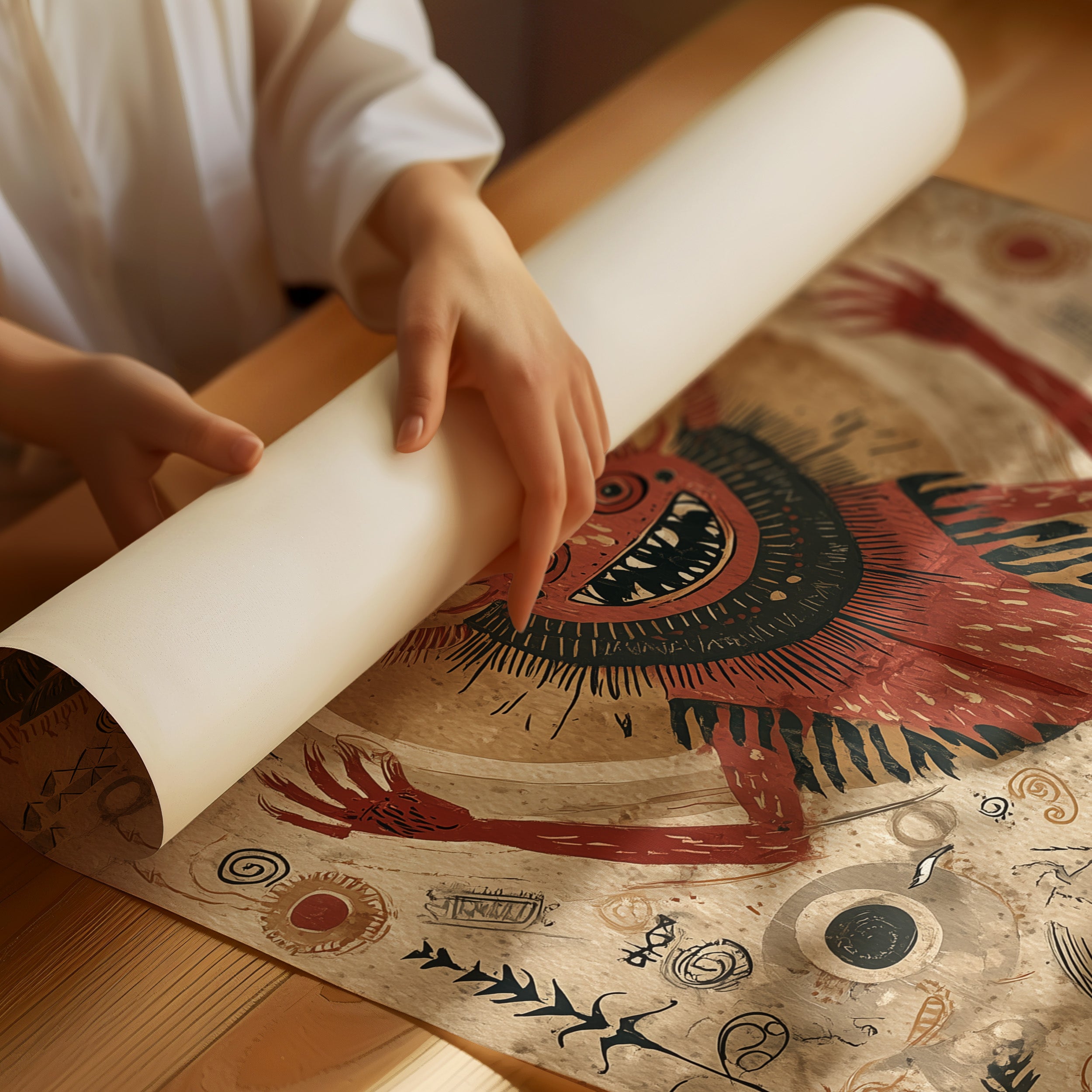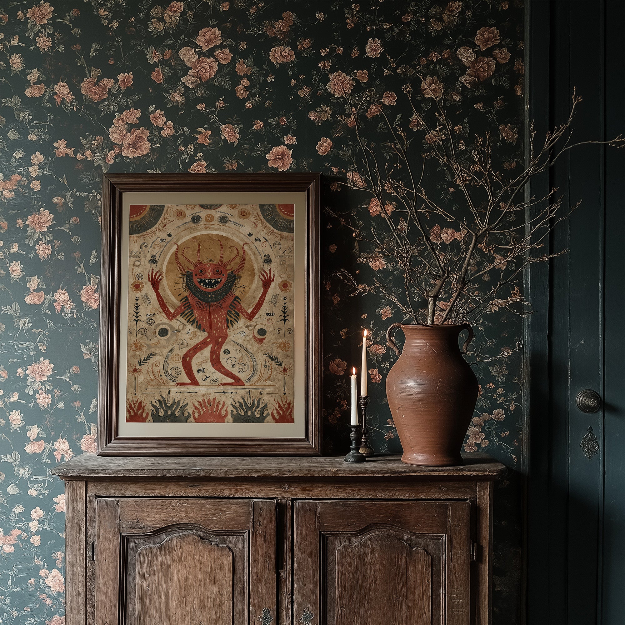 A crimson creature dances across aged parchment, its toothy grin and outstretched arms inviting viewers into a world of primordial mysticism. Surrounded by cryptic symbols and circular motifs, the folk art monster emerges from a carefully crafted cosmos of earthy tones and ritualistic imagery. The contrast between the vibrant red figure and the weathered, neutral background creates a captivating tension between playful monstrosity and sacred symbolism.