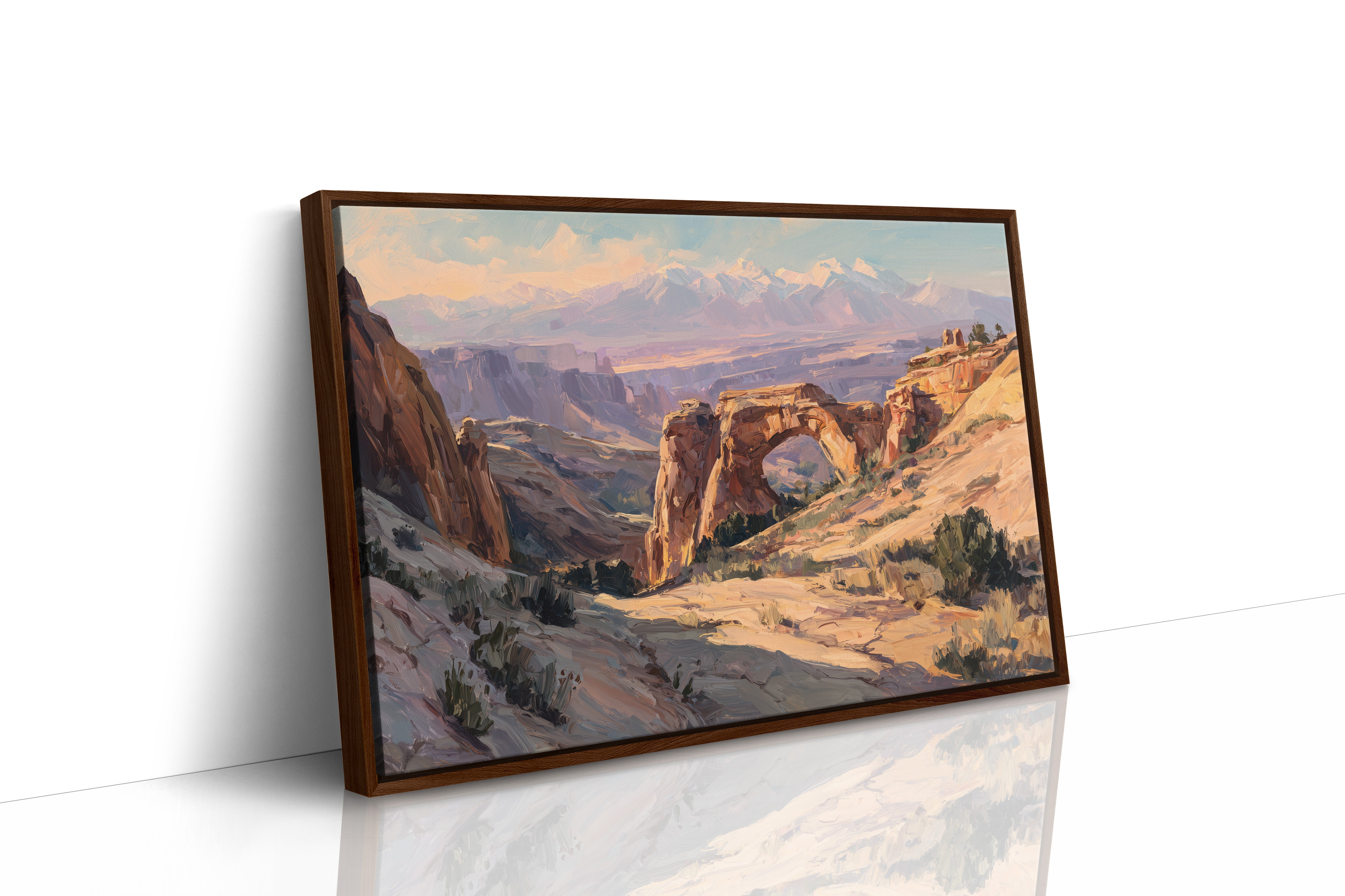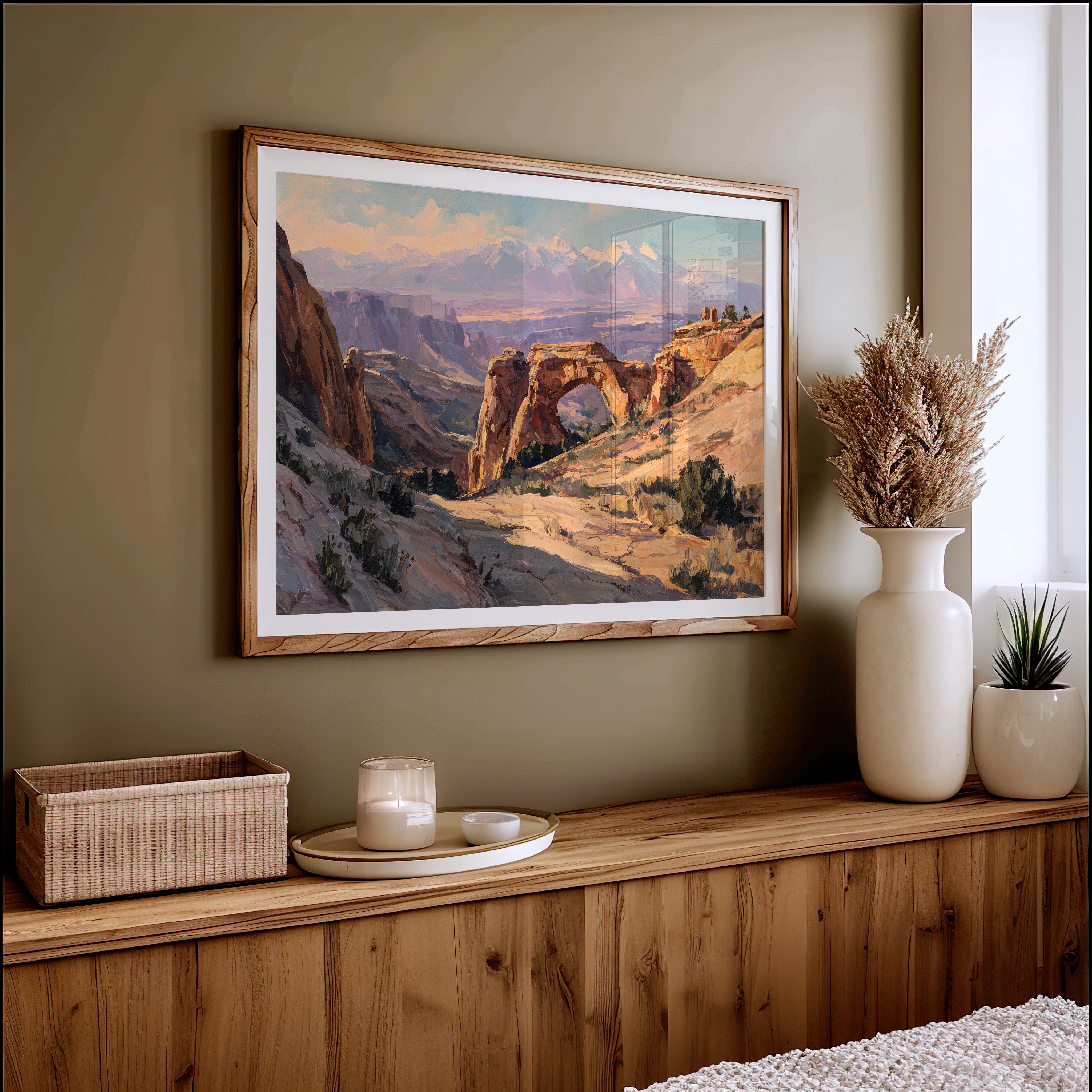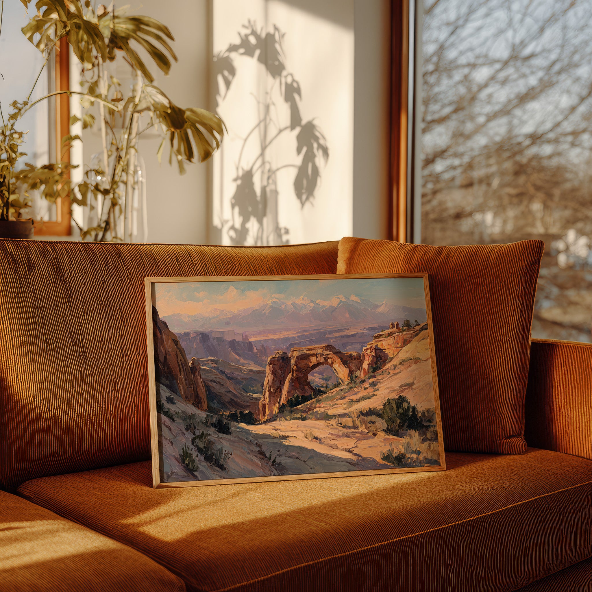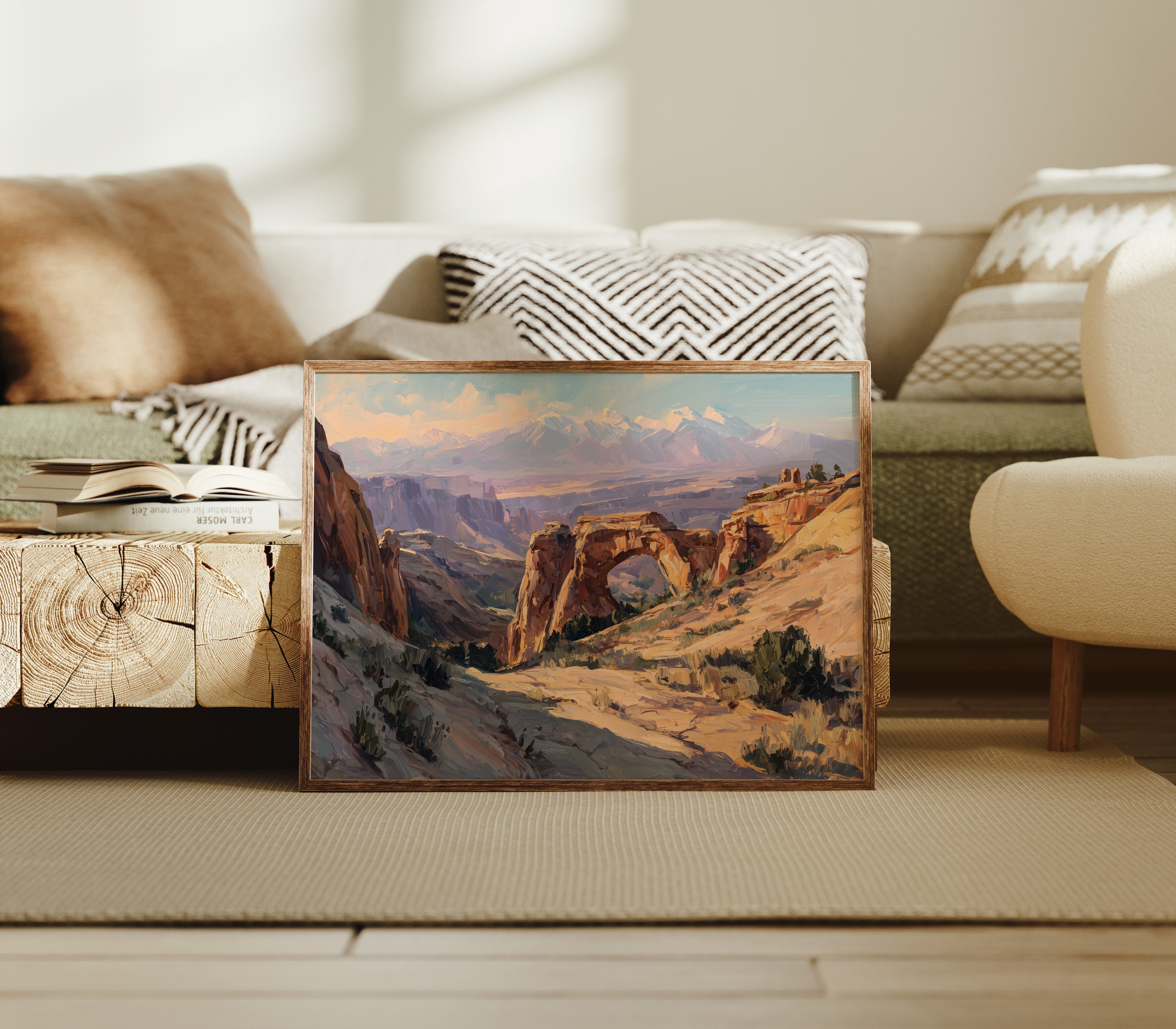 Majestic red rock formations stand sentinel against a pastel sunset sky, where nature's architectural marvel spans the desert expanse. The warm golden light bathes the rugged landscape, casting long shadows across the weathered sandstone cliffs and sparse desert vegetation. Snow-capped peaks rise in the distance, creating a dramatic backdrop to this timeless scene of the American Southwest. This striking landscape brings the raw beauty of desert wilderness into your living space. Perfect for a statement piece in a modern living room or as an inspiring focal point in a home office.