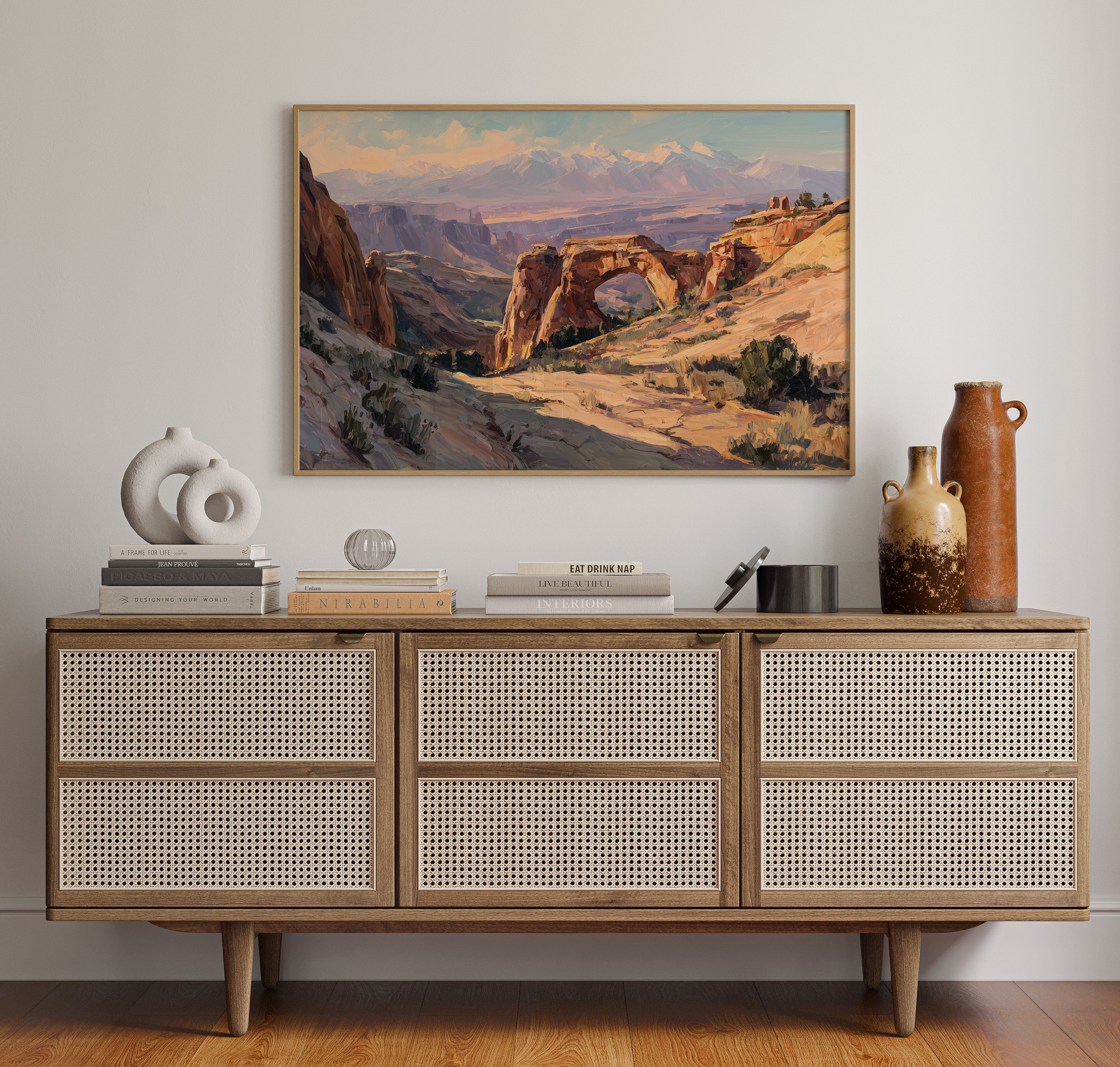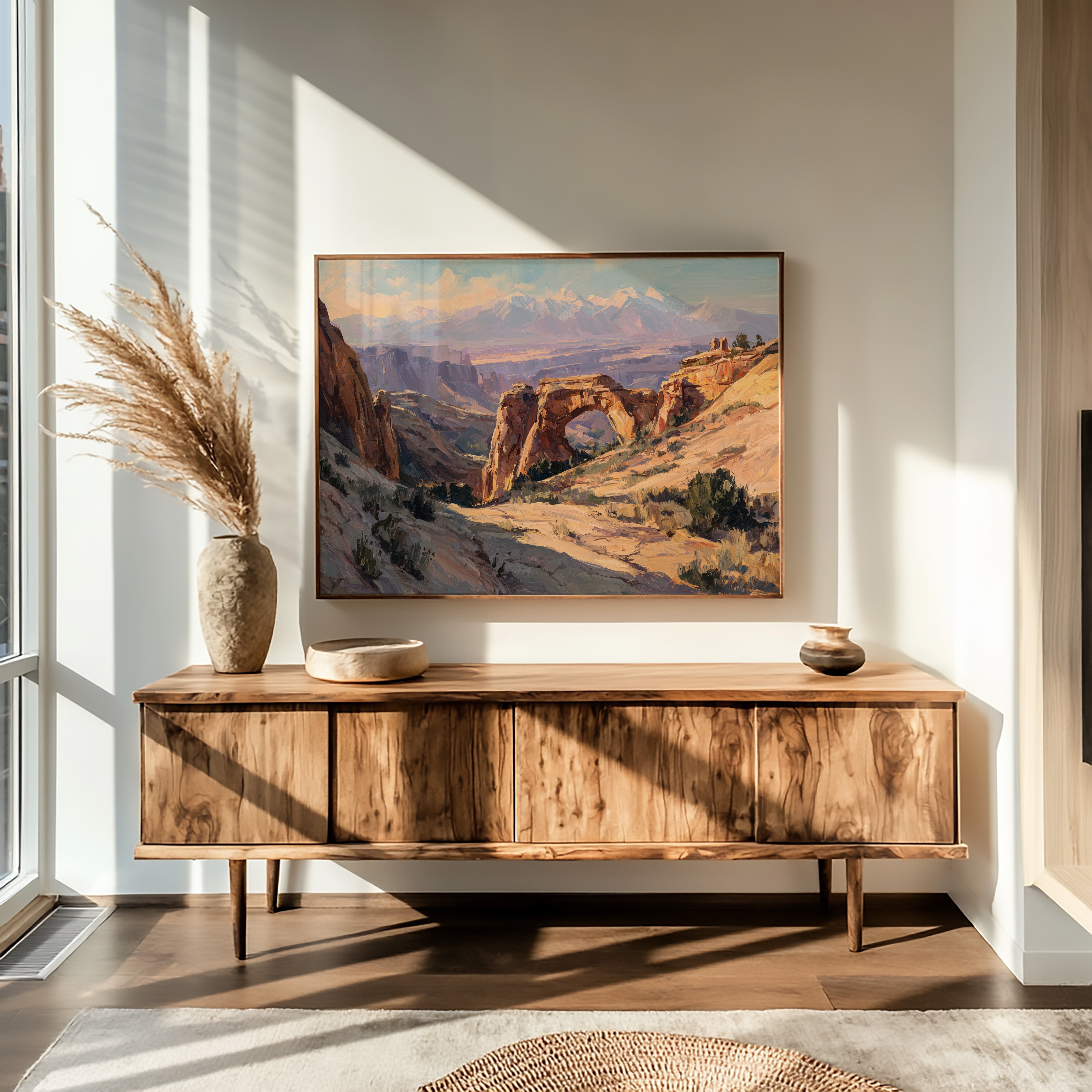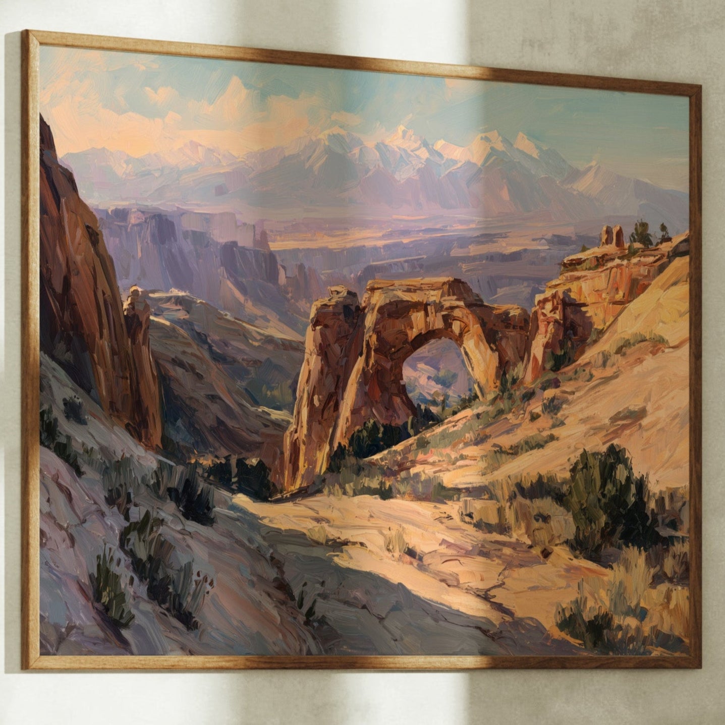 Majestic red rock formations stand sentinel against a pastel sunset sky, where nature's architectural marvel spans the desert expanse. The warm golden light bathes the rugged landscape, casting long shadows across the weathered sandstone cliffs and sparse desert vegetation. Snow-capped peaks rise in the distance, creating a dramatic backdrop to this timeless scene of the American Southwest. This striking landscape brings the raw beauty of desert wilderness into your living space. Perfect for a statement piece in a modern living room or as an inspiring focal point in a home office.