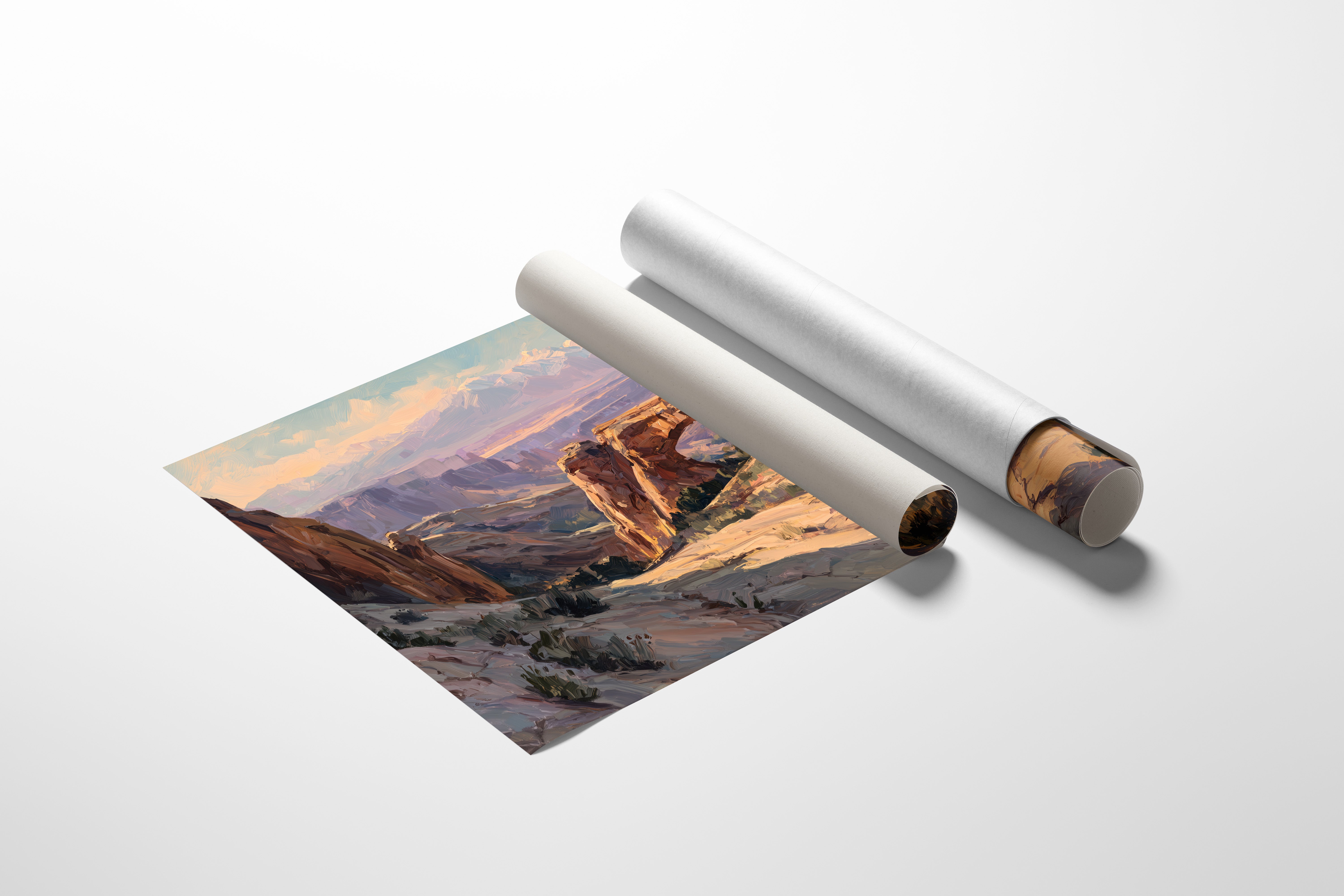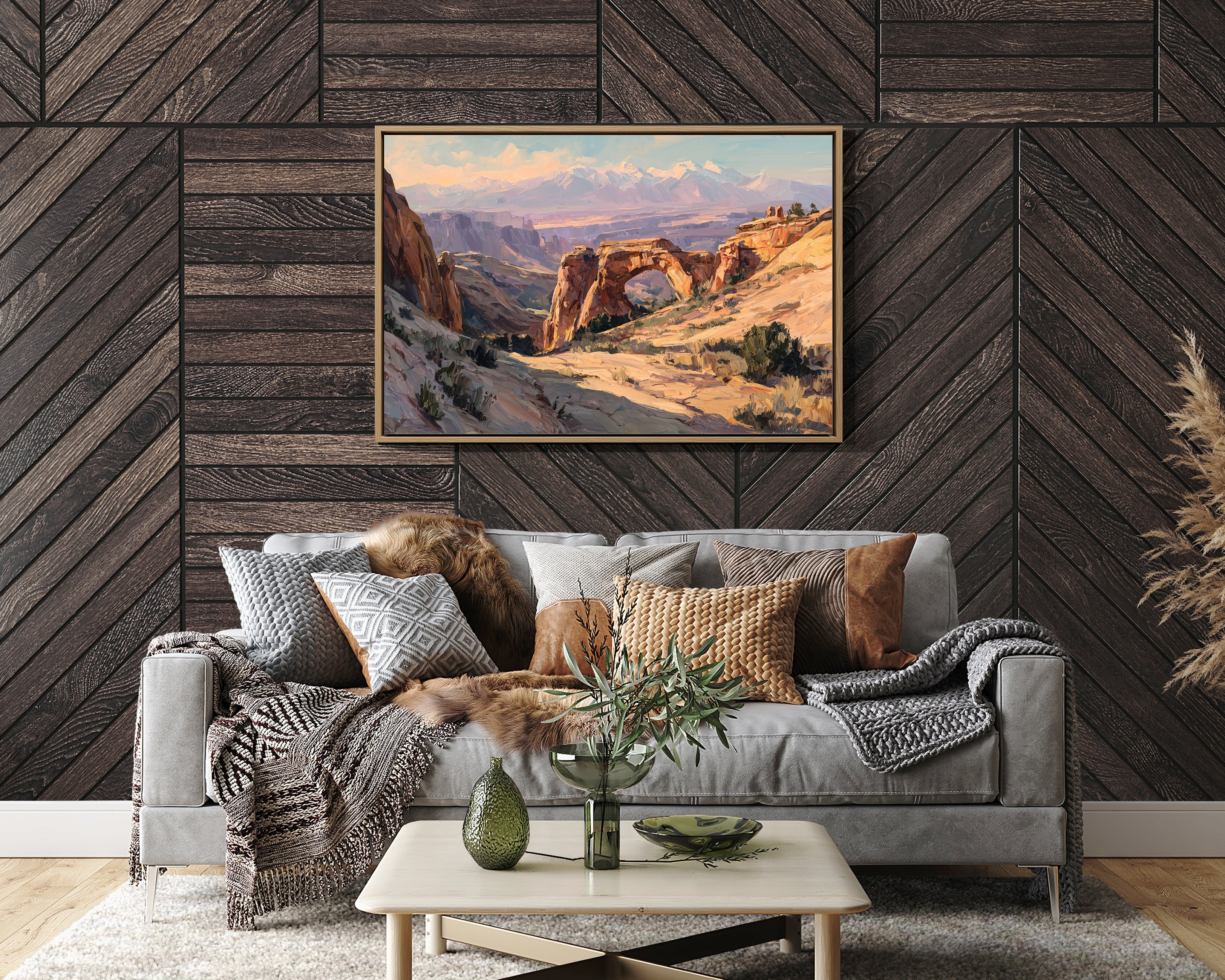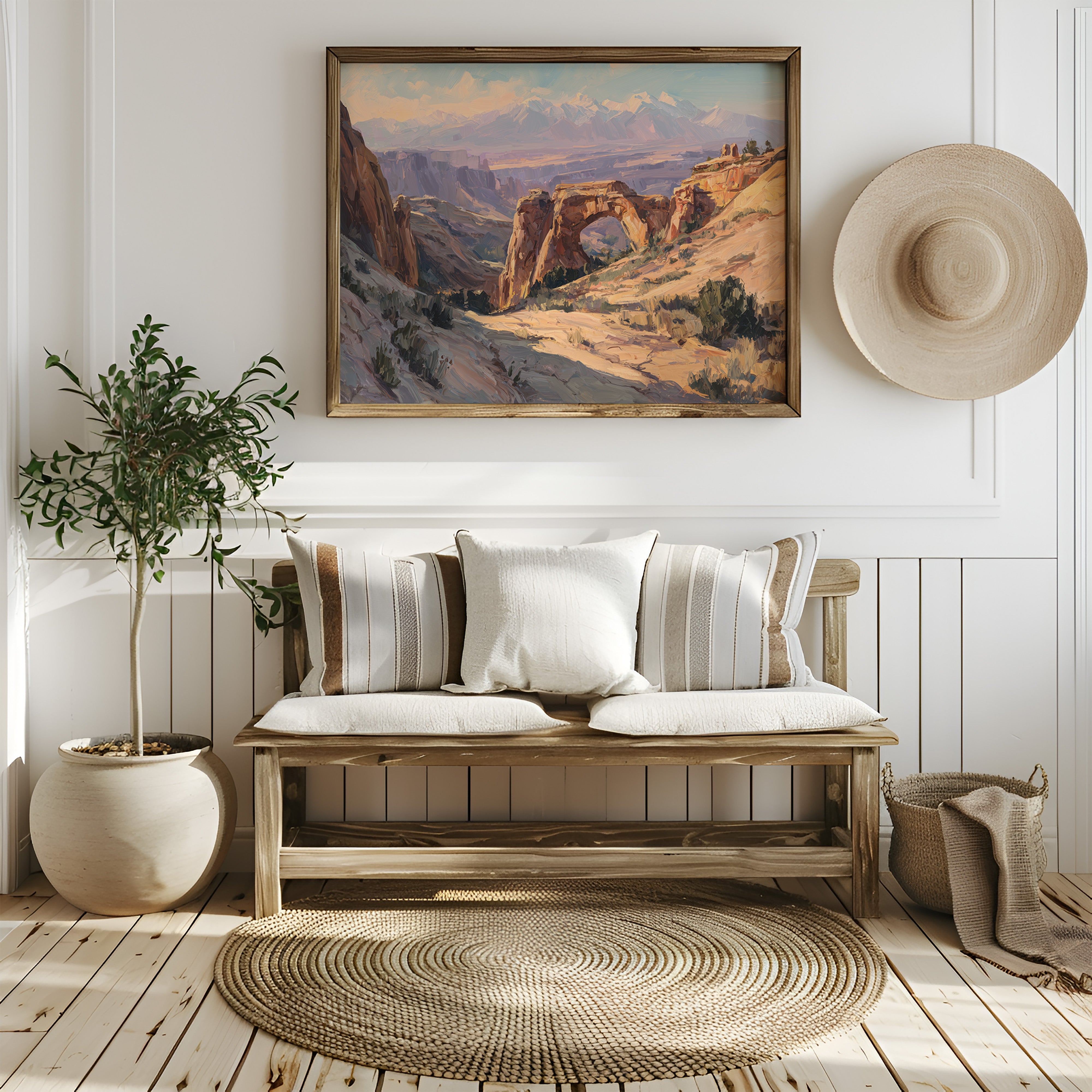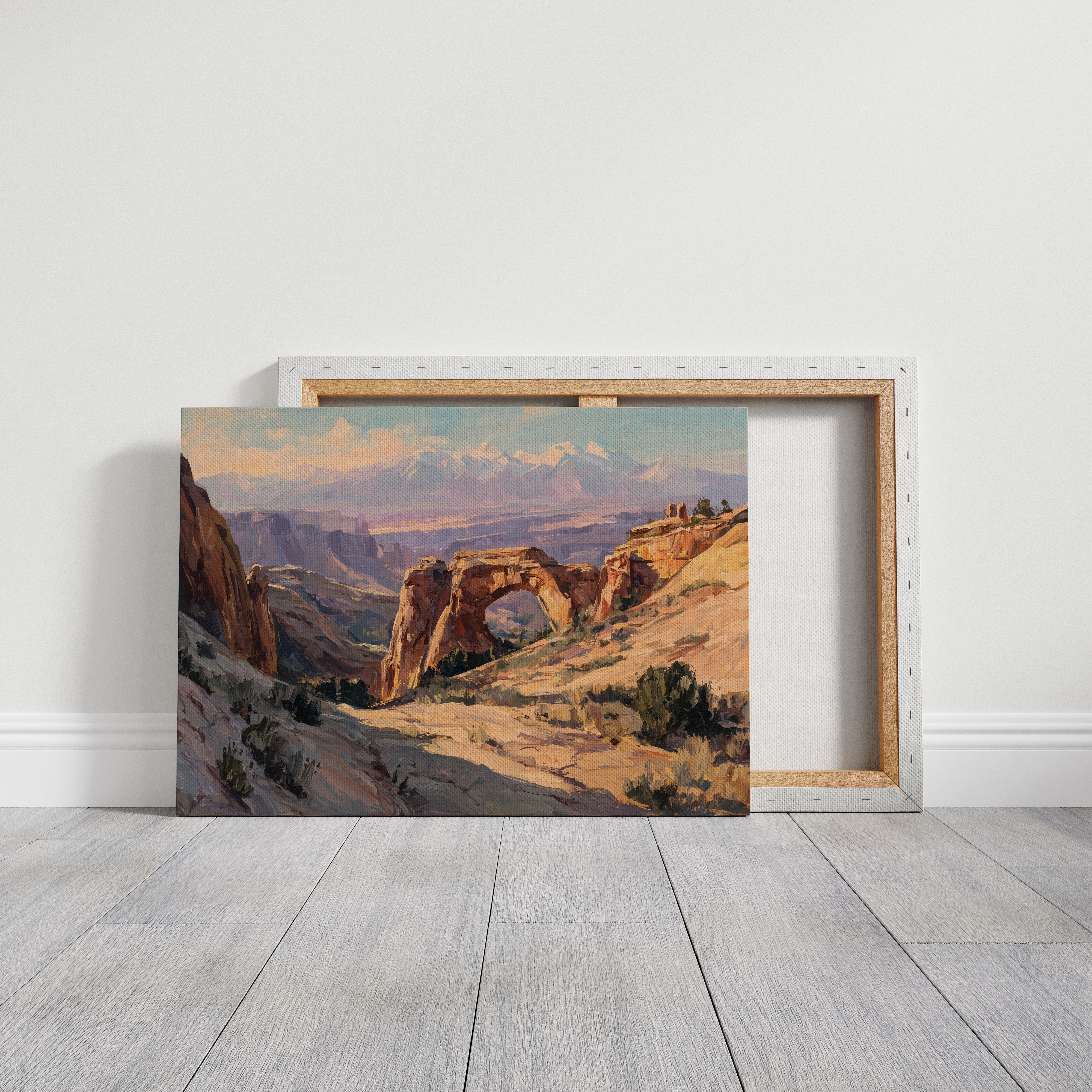 Majestic red rock formations stand sentinel against a pastel sunset sky, where nature's architectural marvel spans the desert expanse. The warm golden light bathes the rugged landscape, casting long shadows across the weathered sandstone cliffs and sparse desert vegetation. Snow-capped peaks rise in the distance, creating a dramatic backdrop to this timeless scene of the American Southwest. This striking landscape brings the raw beauty of desert wilderness into your living space. Perfect for a statement piece in a modern living room or as an inspiring focal point in a home office.