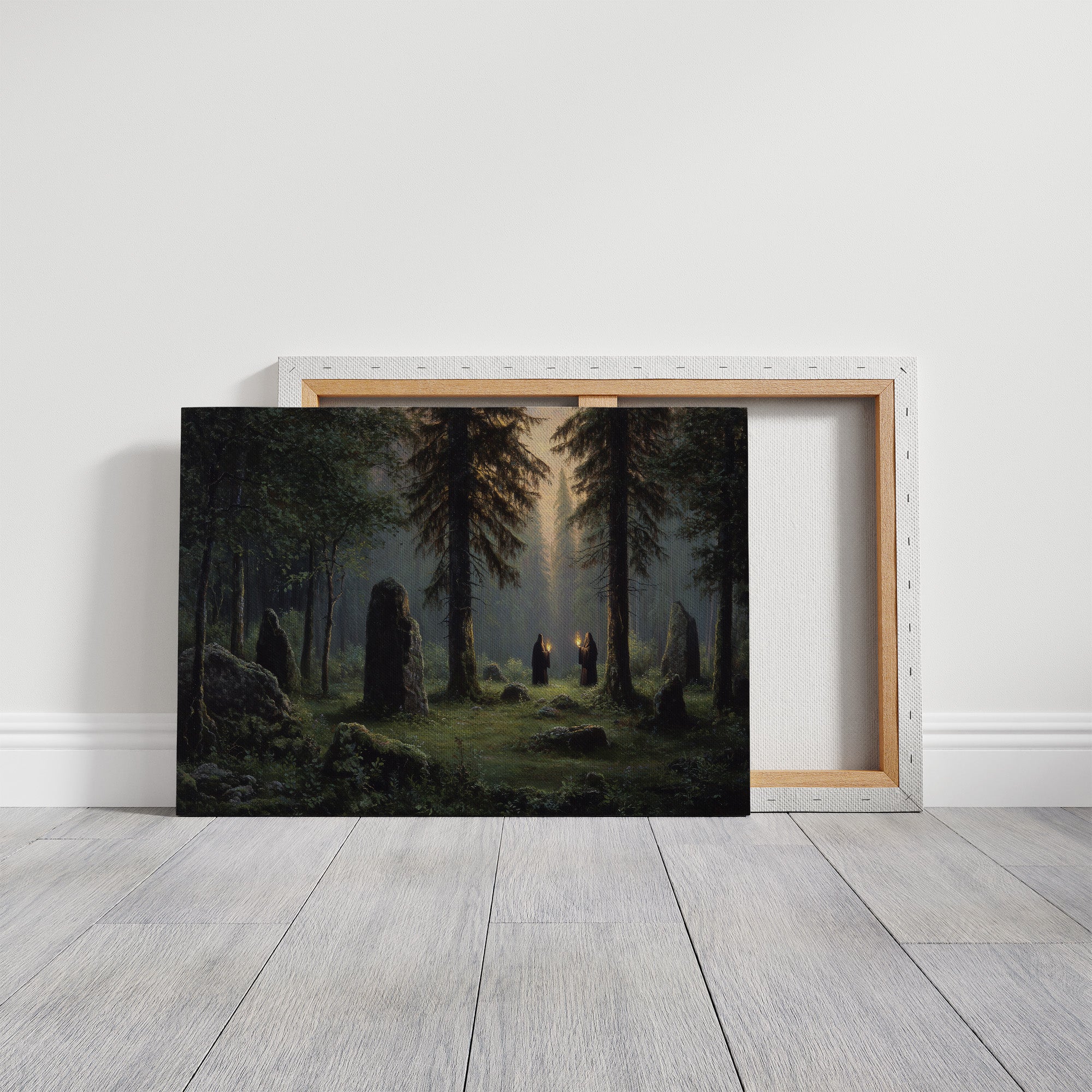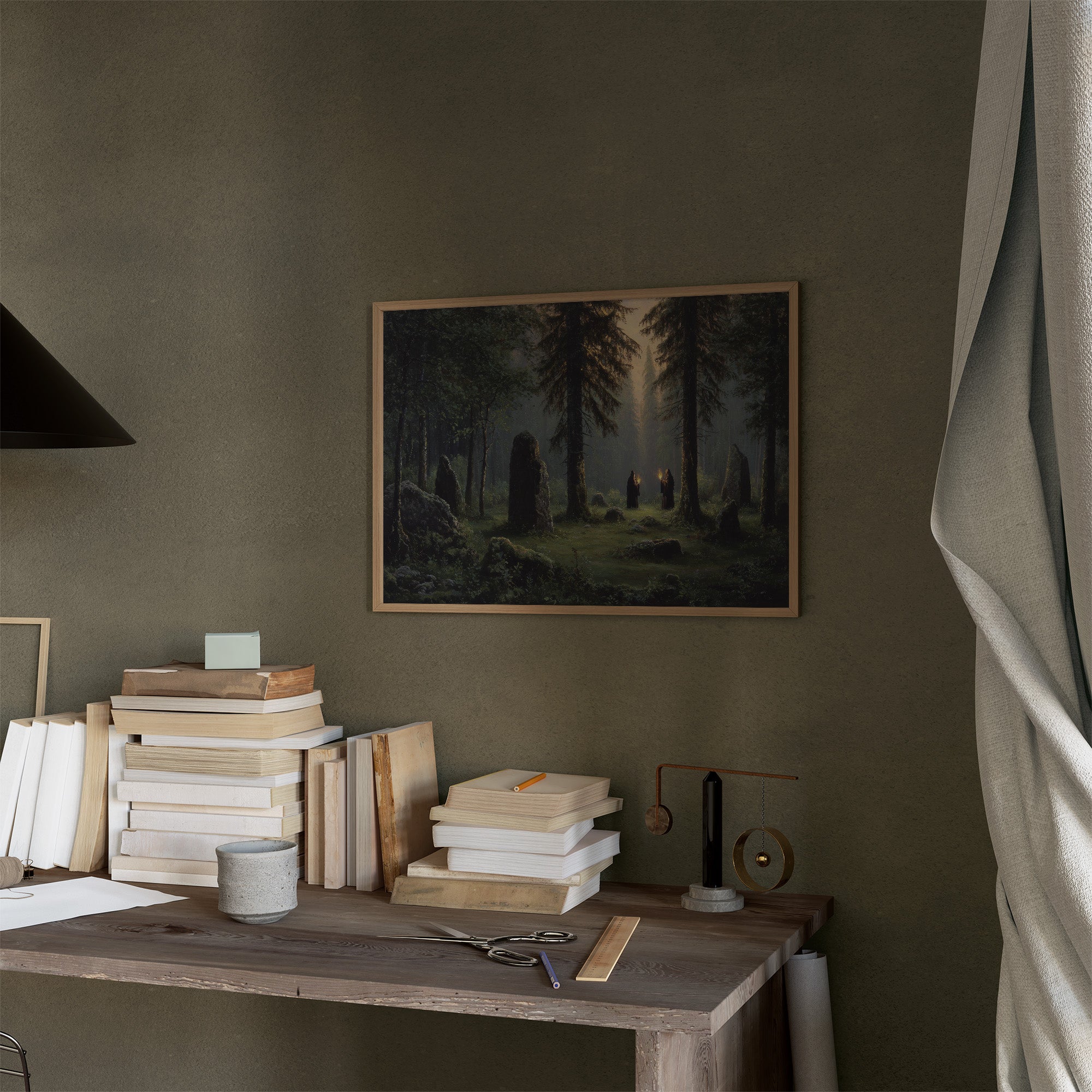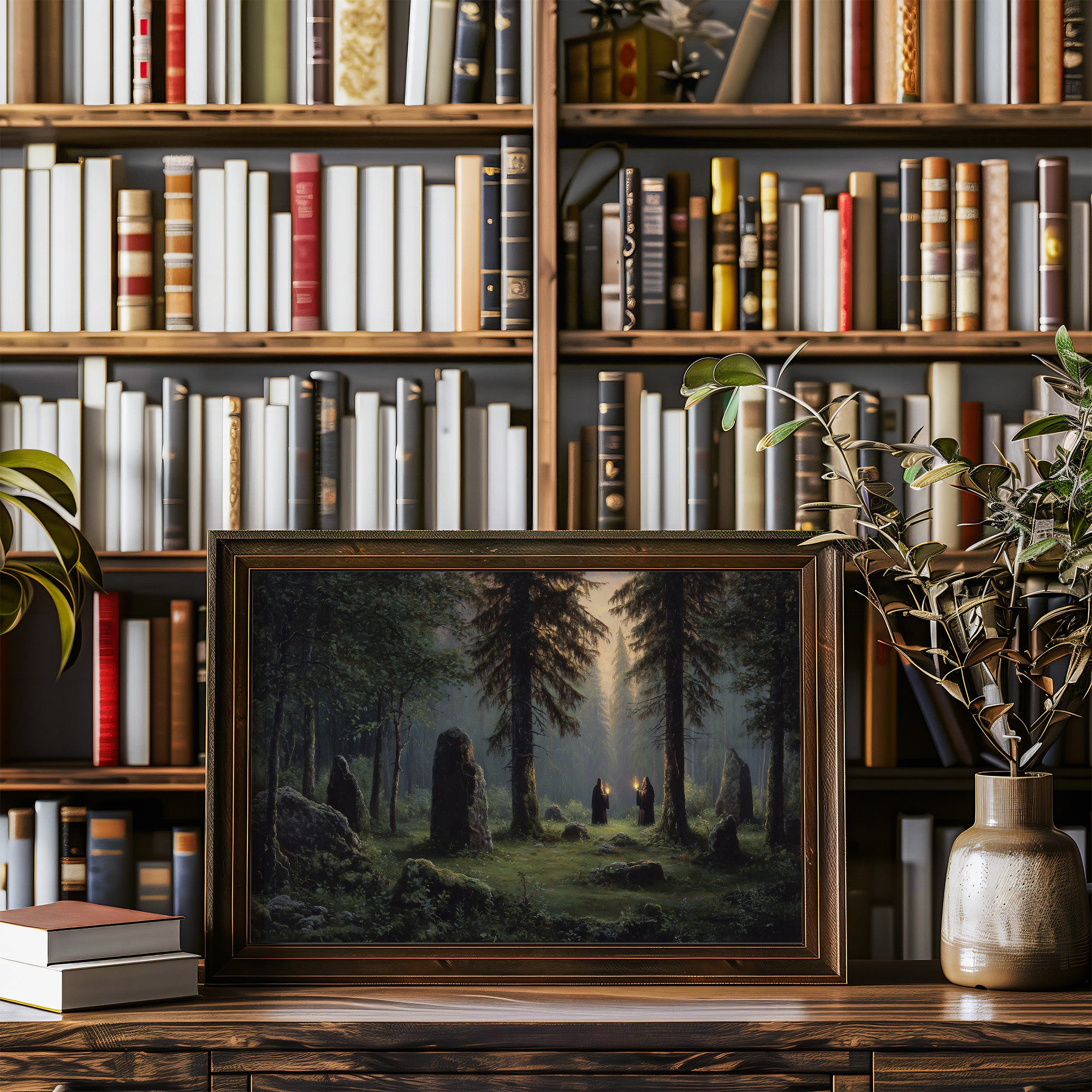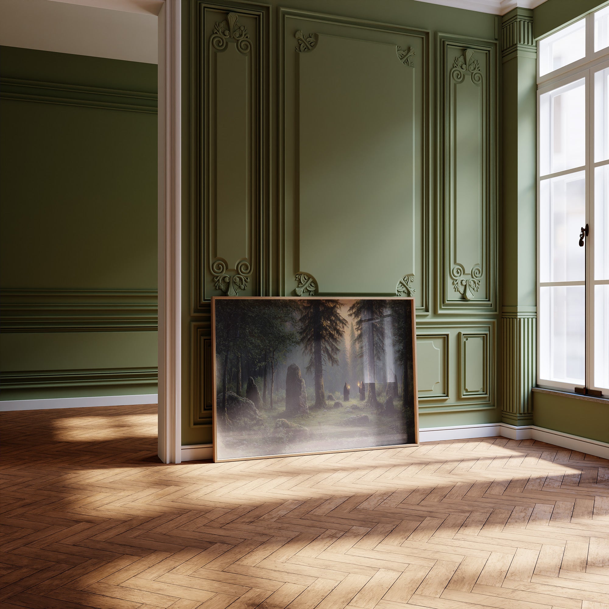 Mist hangs between towering pines as two cloaked figures approach a forgotten stone circle. Shafts of ethereal light filter through the dense forest canopy, illuminating moss-covered monoliths that have stood sentinel for centuries. The painting captures that magical moment between day and night when the veil between worlds feels thinnest, rendered in rich emerald greens and smoky blues that evoke both mystery and reverence. This atmospheric piece brings contemplative depth to a study, library, or reading nook where stories and imagination flourish.