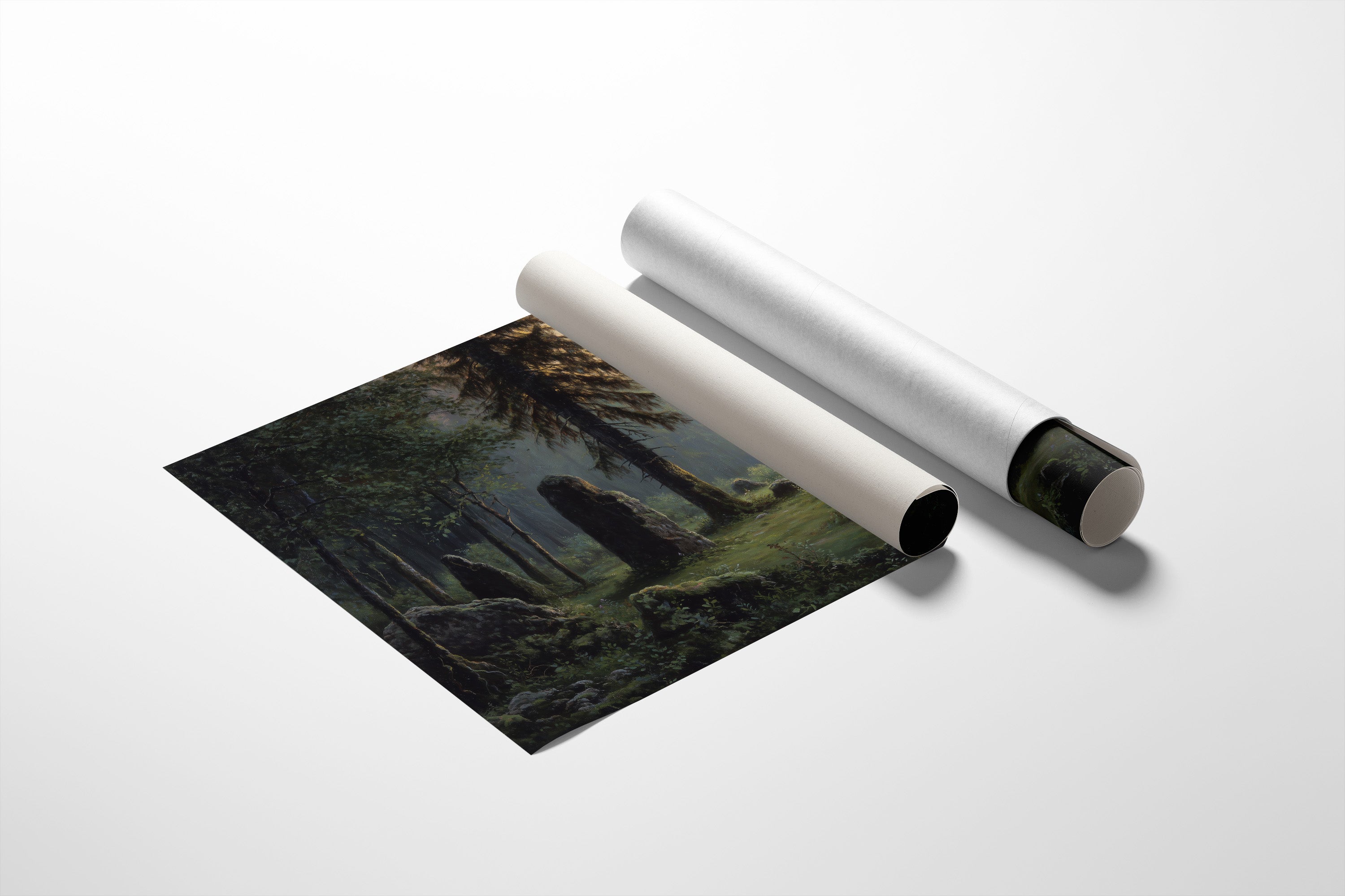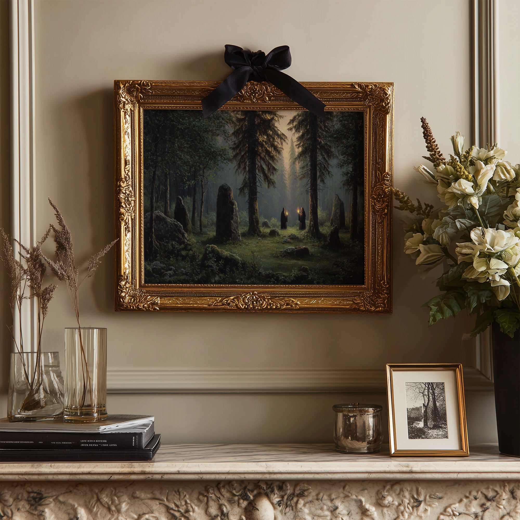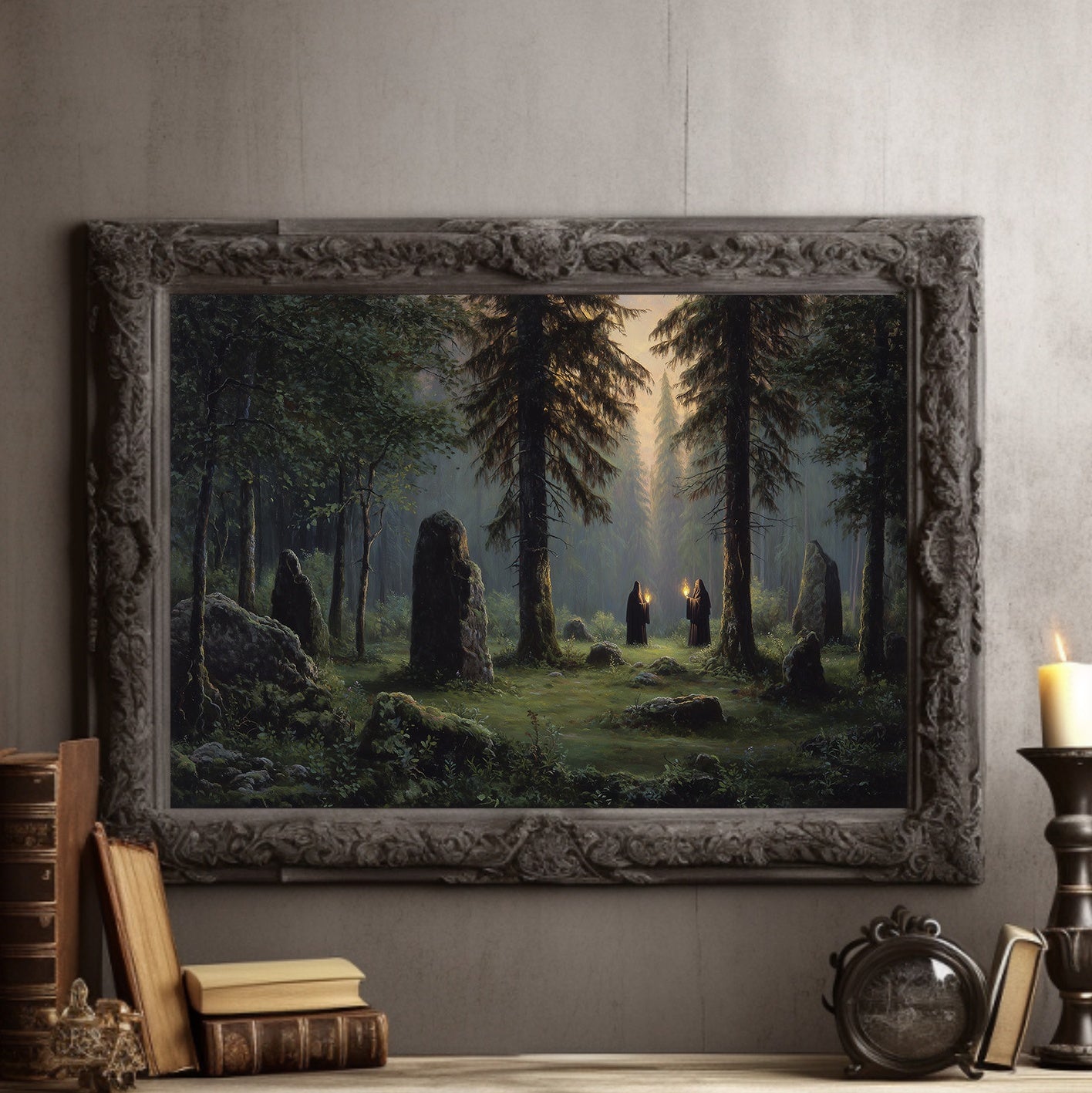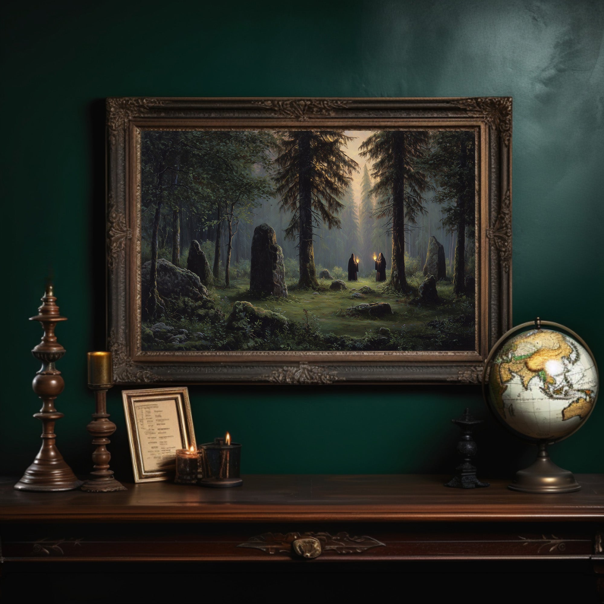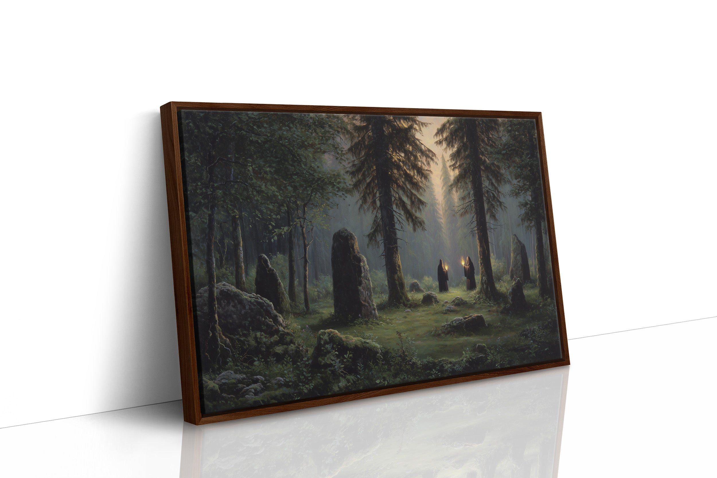 Mist hangs between towering pines as two cloaked figures approach a forgotten stone circle. Shafts of ethereal light filter through the dense forest canopy, illuminating moss-covered monoliths that have stood sentinel for centuries. The painting captures that magical moment between day and night when the veil between worlds feels thinnest, rendered in rich emerald greens and smoky blues that evoke both mystery and reverence. This atmospheric piece brings contemplative depth to a study, library, or reading nook where stories and imagination flourish.