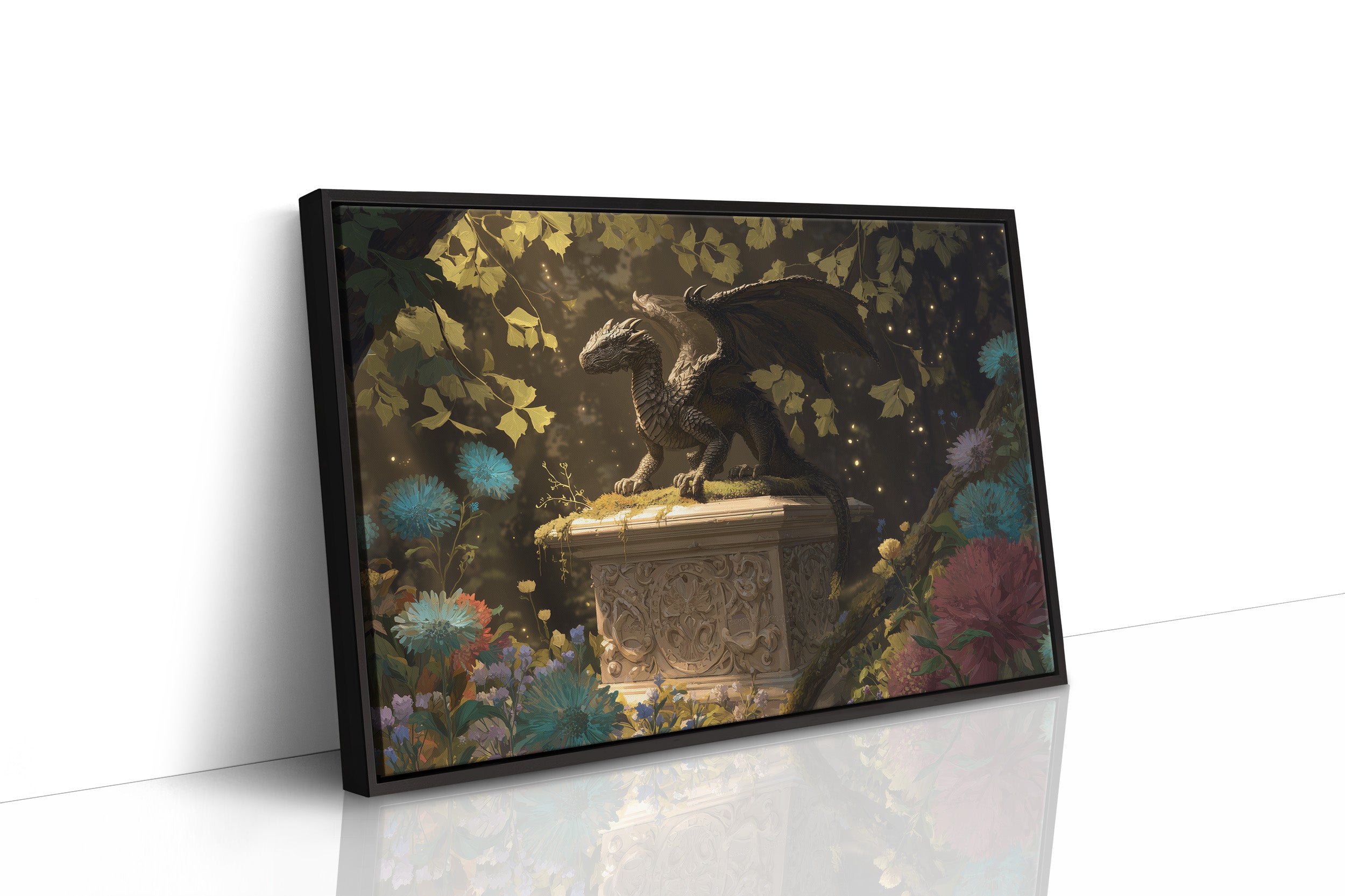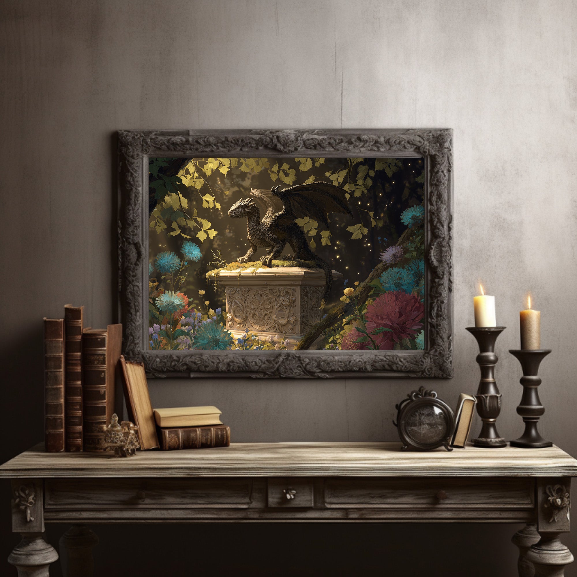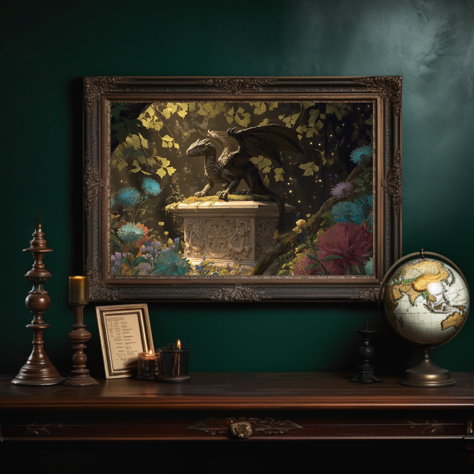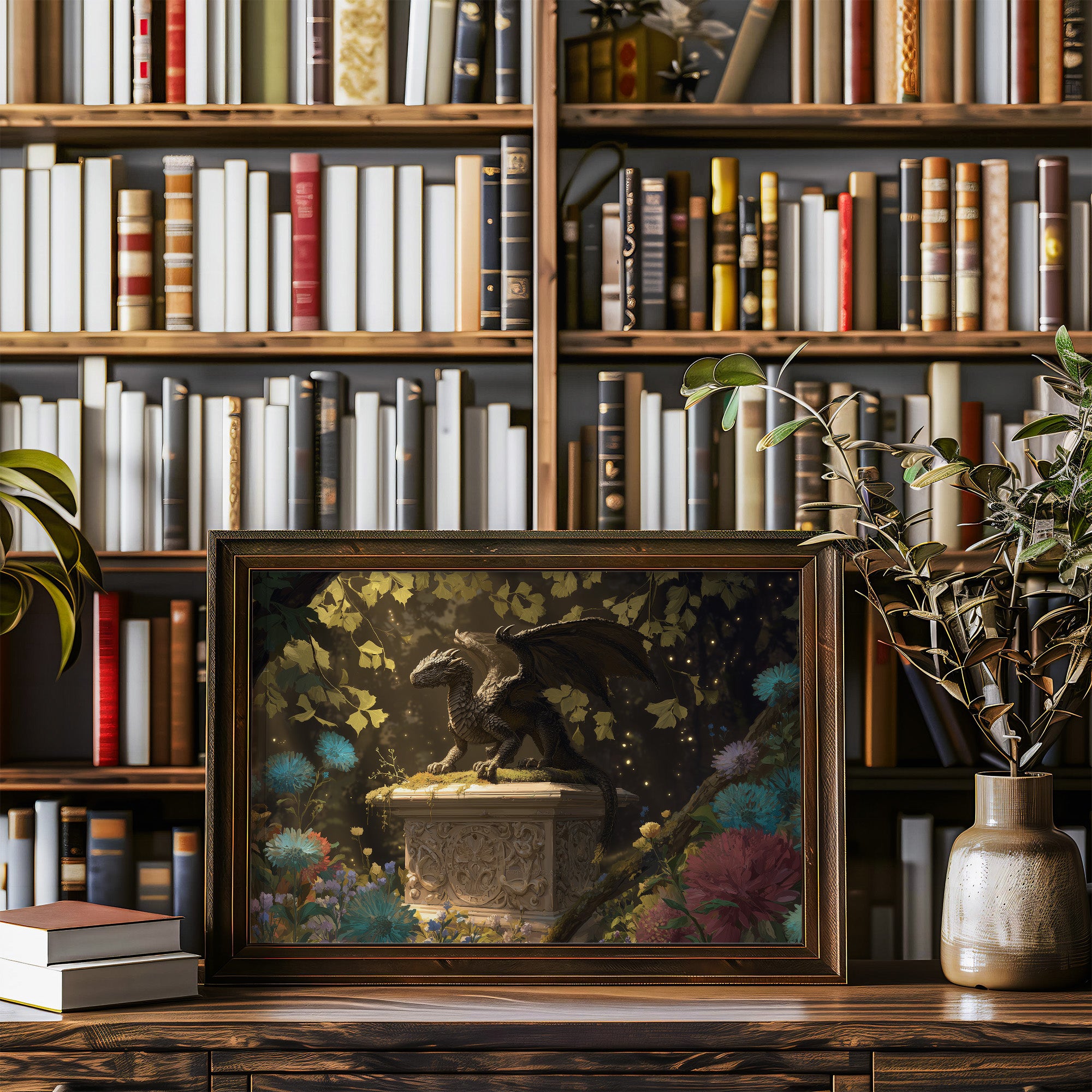 The mythical comes to life amid the quiet wisdom of countless spines. A framed dragon perches majestically on its stone pedestal, surrounded by vibrant blooms that seem to glow against the darknessa fantastical moment captured in stillness. Rich wooden shelves filled with leather-bound volumes create a perfect backdrop for this enchanted scene, where literature and legend intertwine in harmonious balance. This piece brings scholarly charm and mystical elegance to a home office, reading nook, or any space where imagination is treasured.