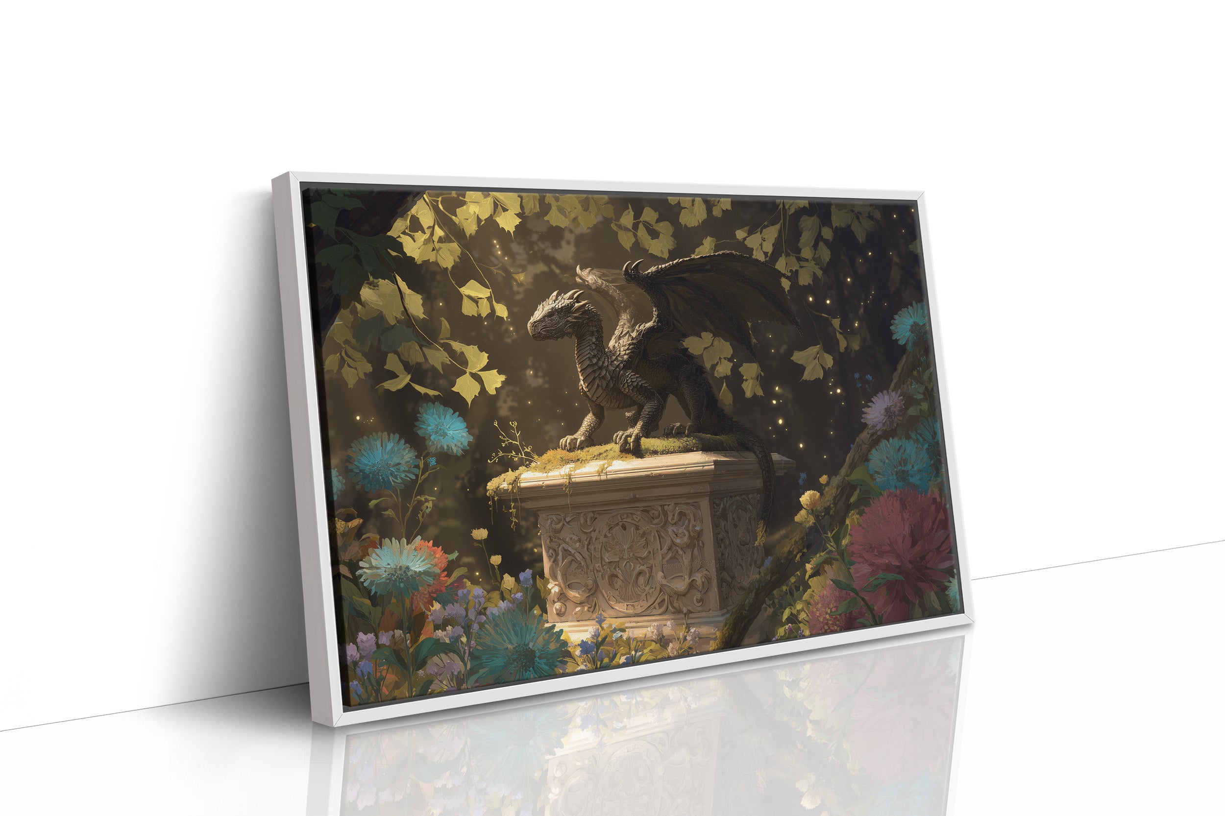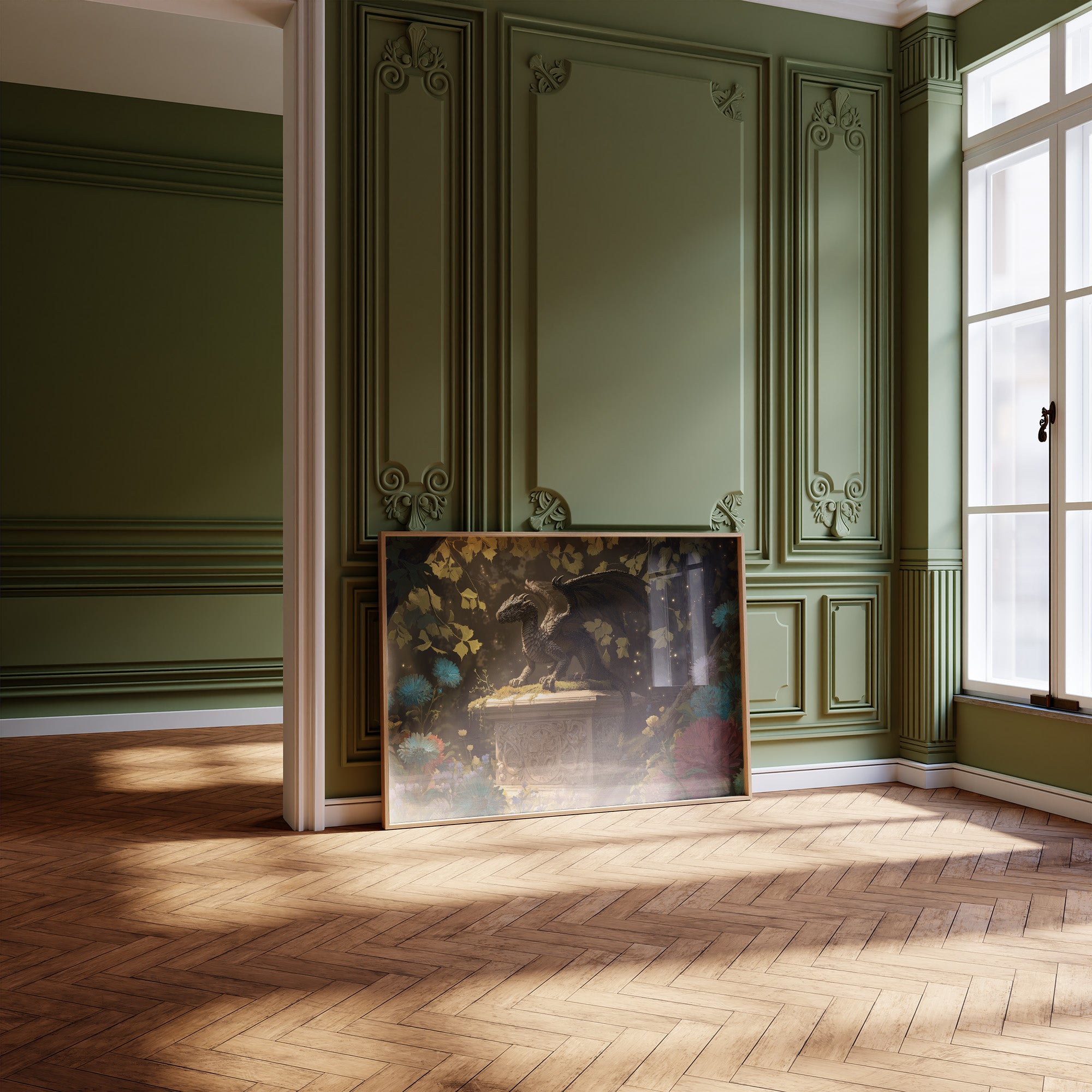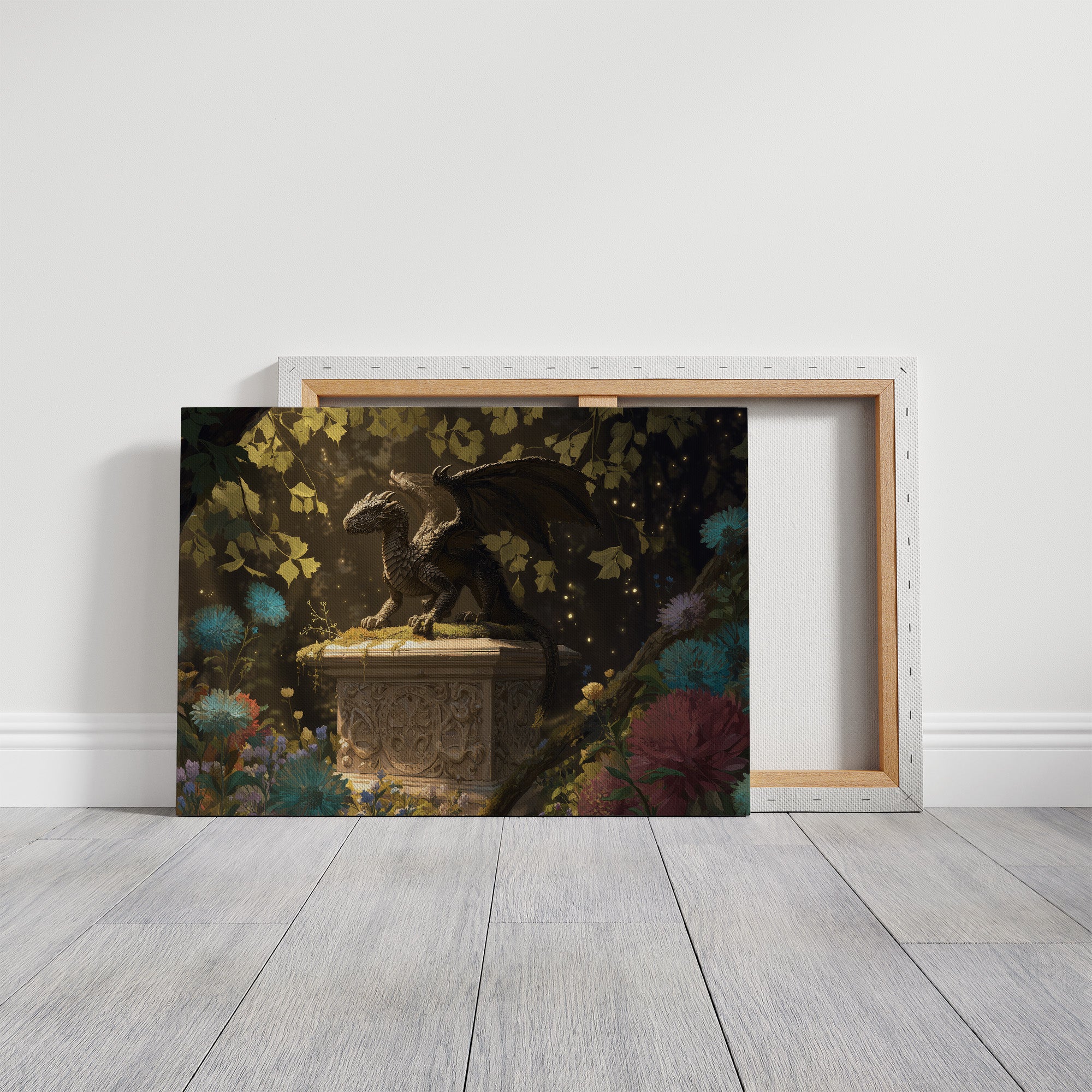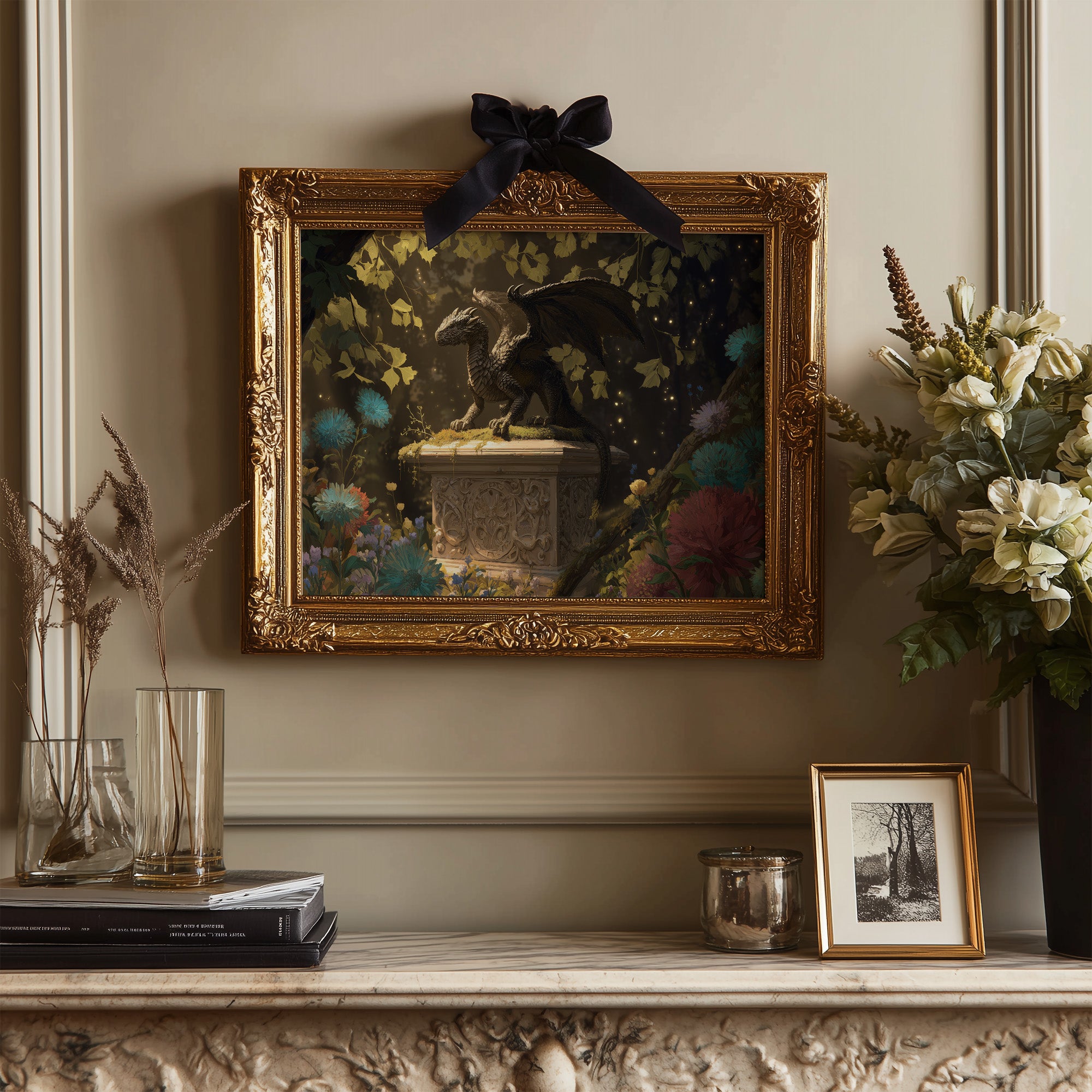 The mythical comes to life amid the quiet wisdom of countless spines. A framed dragon perches majestically on its stone pedestal, surrounded by vibrant blooms that seem to glow against the darknessa fantastical moment captured in stillness. Rich wooden shelves filled with leather-bound volumes create a perfect backdrop for this enchanted scene, where literature and legend intertwine in harmonious balance. This piece brings scholarly charm and mystical elegance to a home office, reading nook, or any space where imagination is treasured.