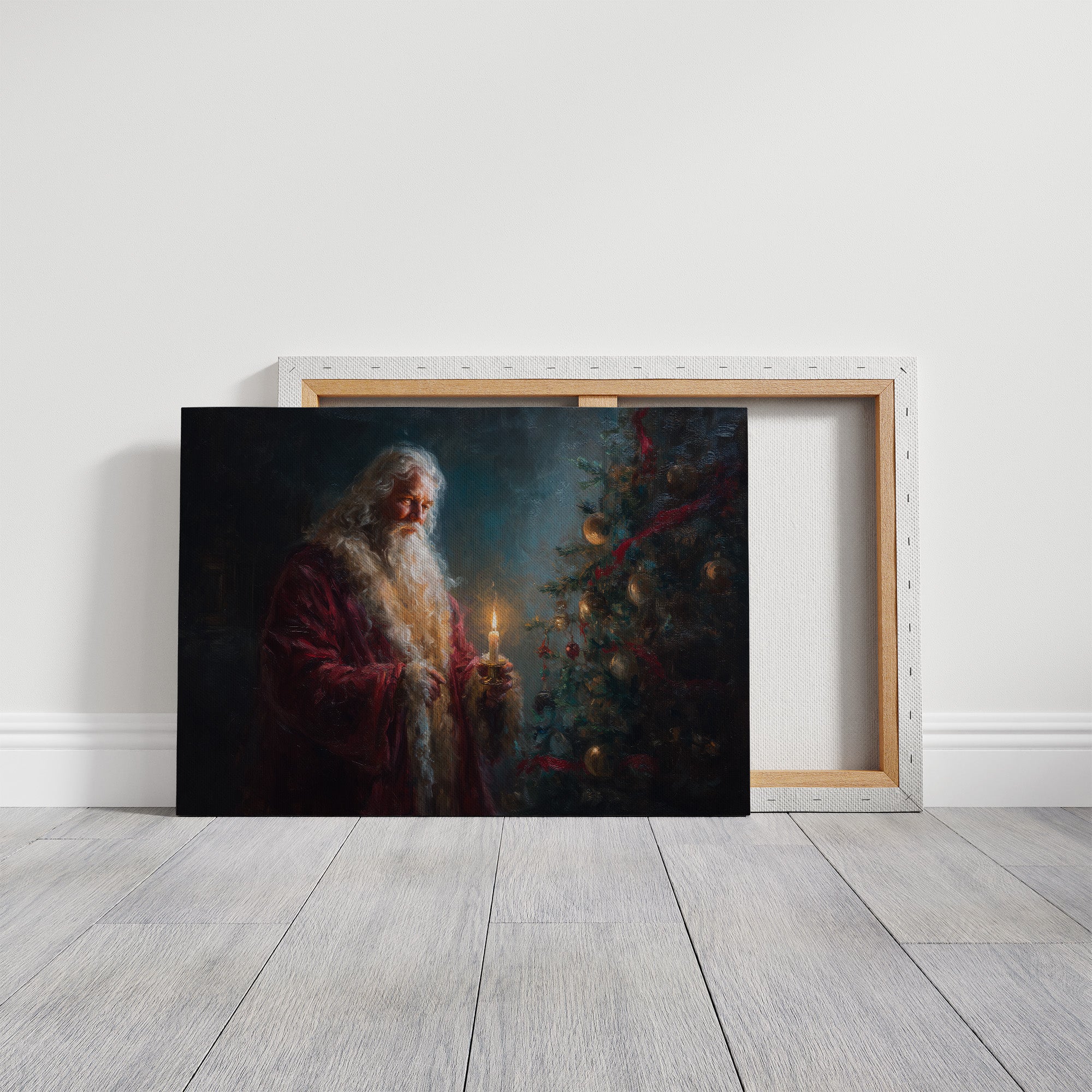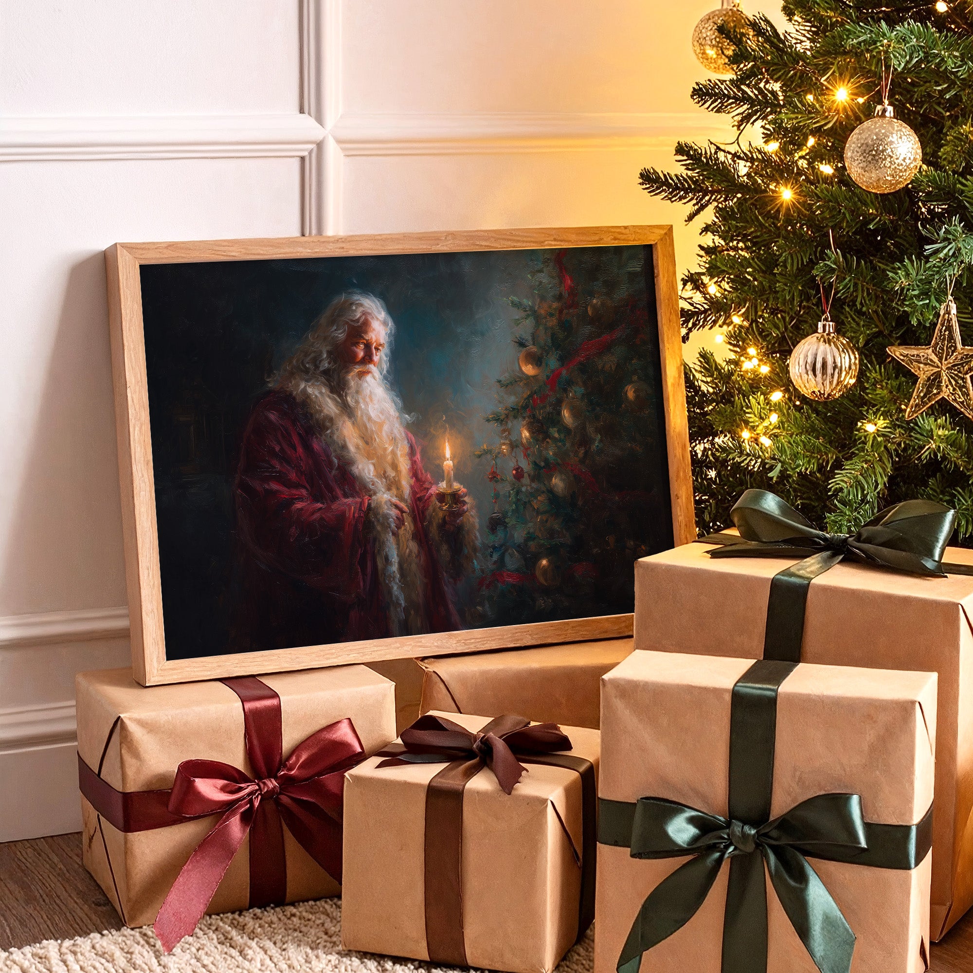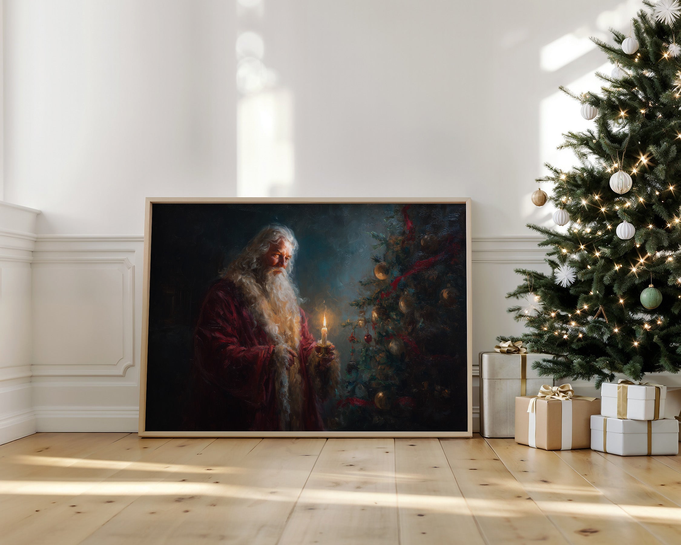 A single flame pierces the darkness, casting a warm golden glow across crimson robes and silvery beard. Deep emerald shadows dance with touches of burgundy and azure, creating an otherworldly atmosphere rich with mystery and wonder. The scene captures a timeless moment where light meets shadow, where the ancient meets the eternal, painted with masterful brushstrokes that blur the line between reality and fantasy. This piece brings a sense of warmth and wonder to any space, perfect for creating a focal point in a study, library, or living room where stories come alive.