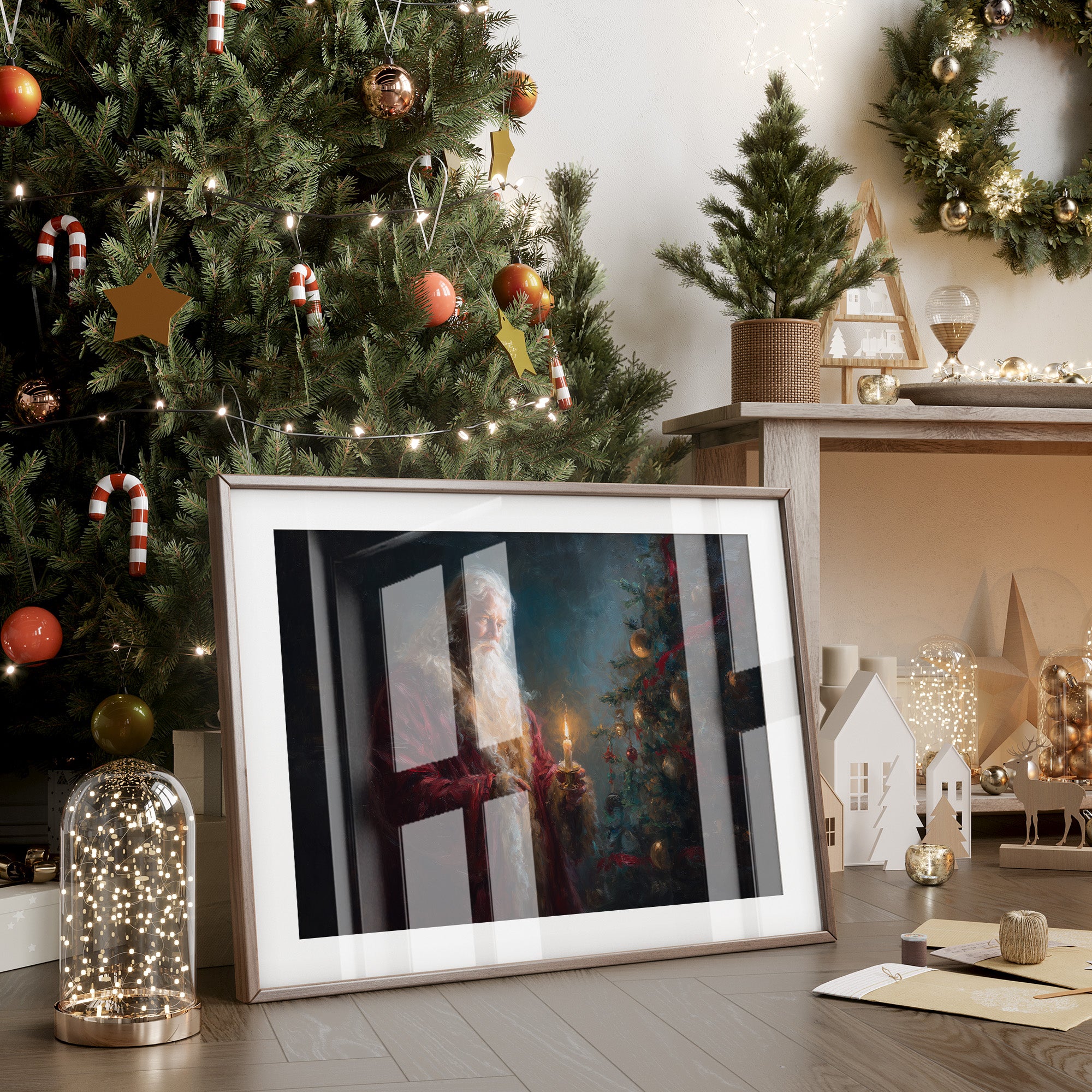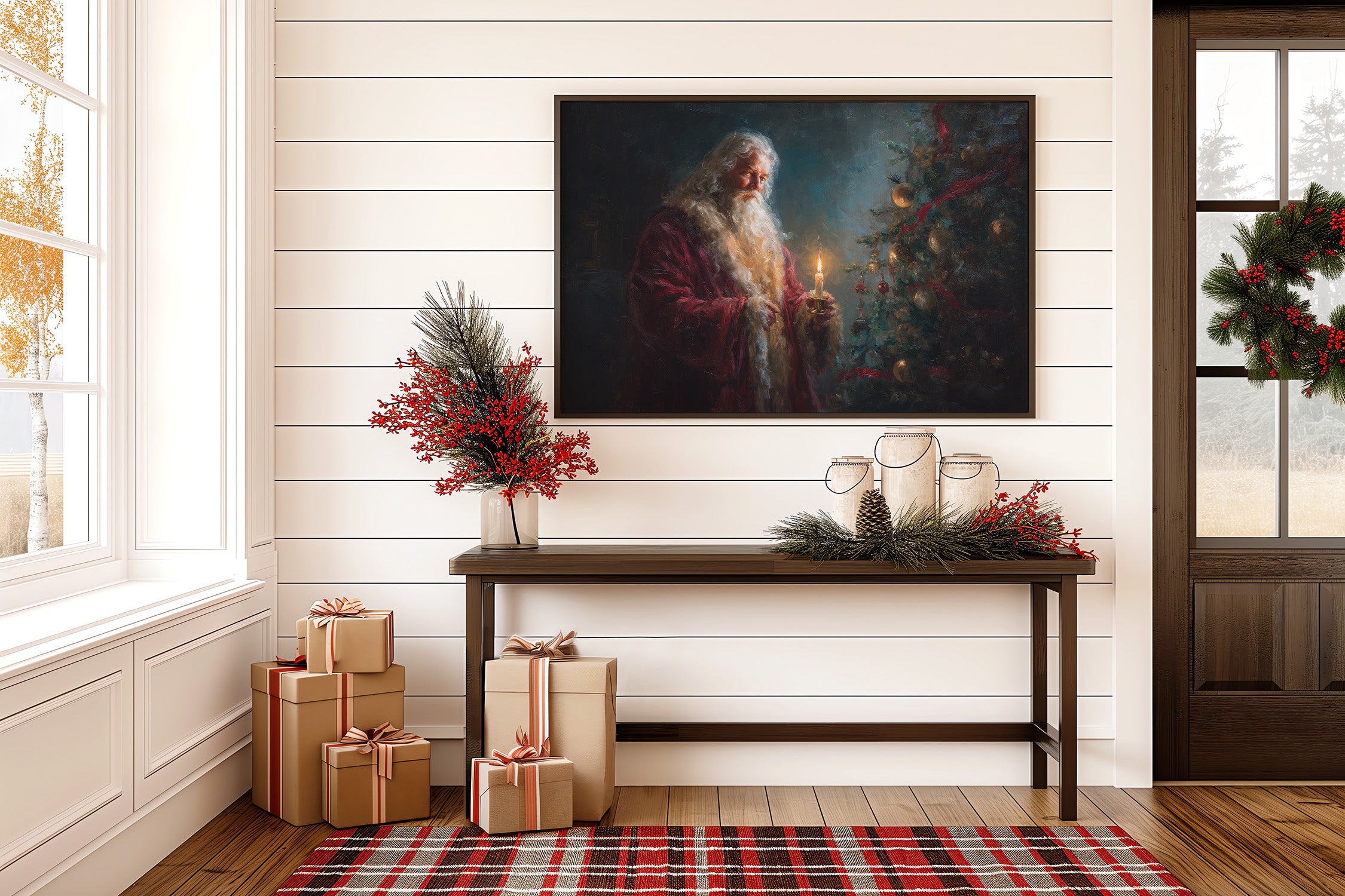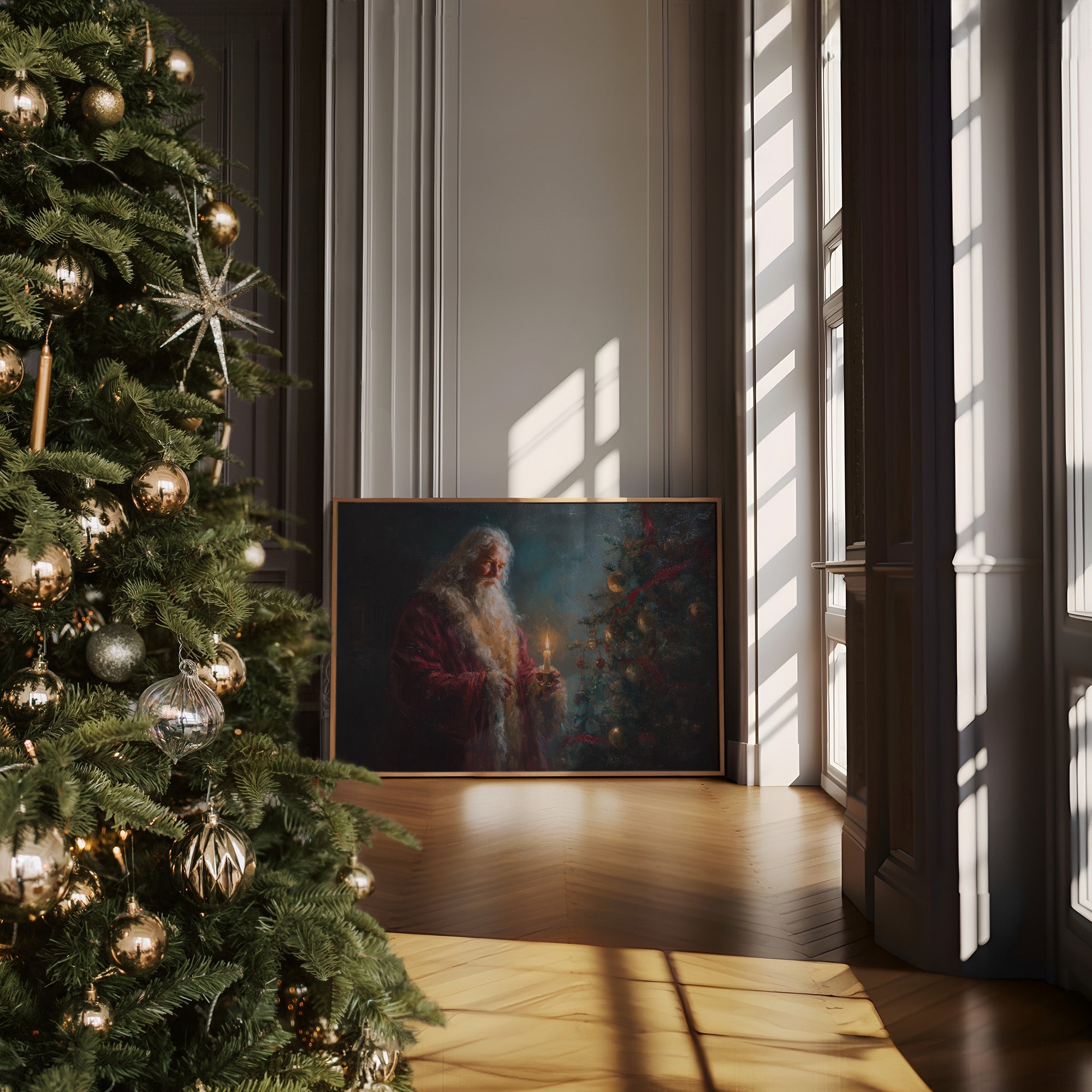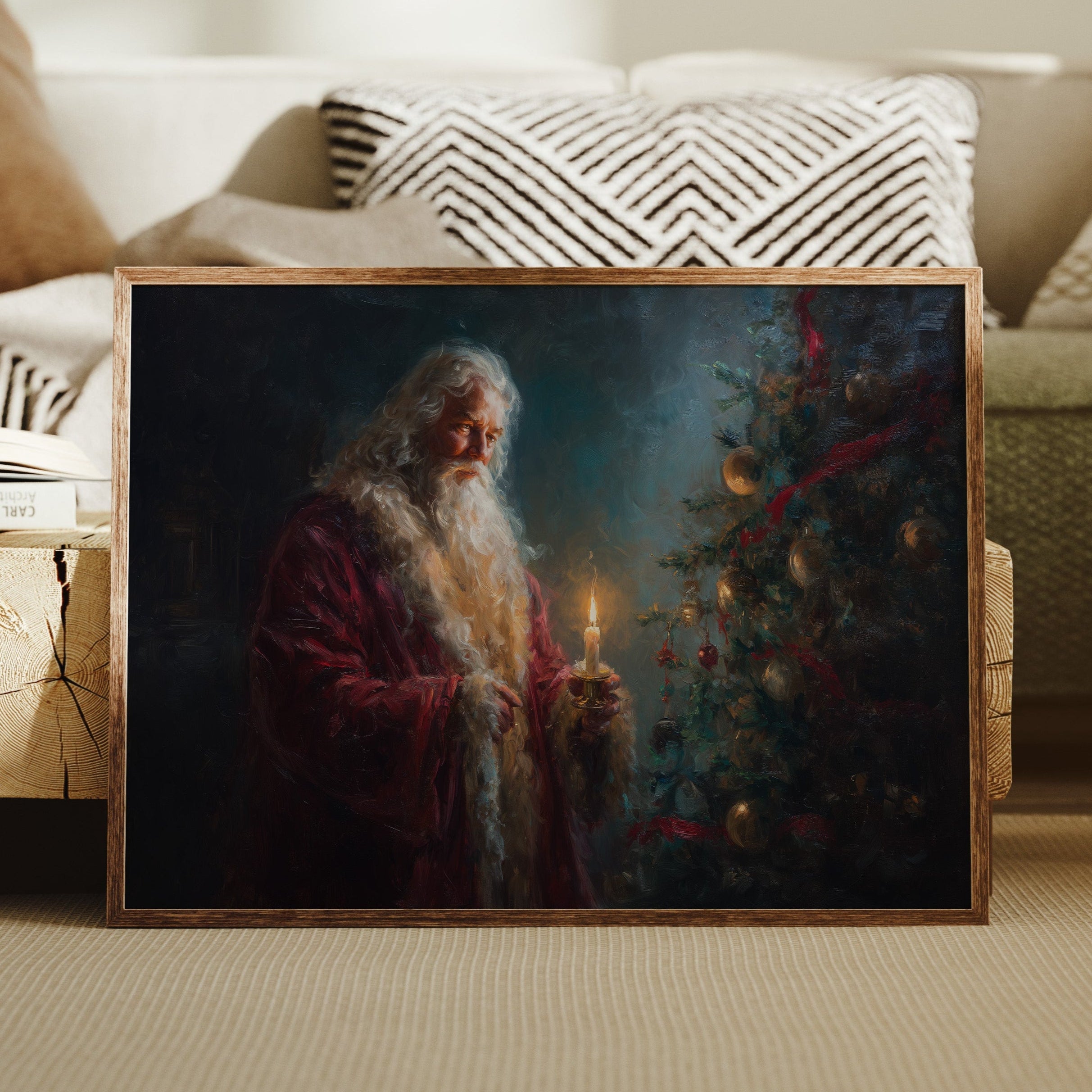 A single flame pierces the darkness, casting a warm golden glow across crimson robes and silvery beard. Deep emerald shadows dance with touches of burgundy and azure, creating an otherworldly atmosphere rich with mystery and wonder. The scene captures a timeless moment where light meets shadow, where the ancient meets the eternal, painted with masterful brushstrokes that blur the line between reality and fantasy. This piece brings a sense of warmth and wonder to any space, perfect for creating a focal point in a study, library, or living room where stories come alive.