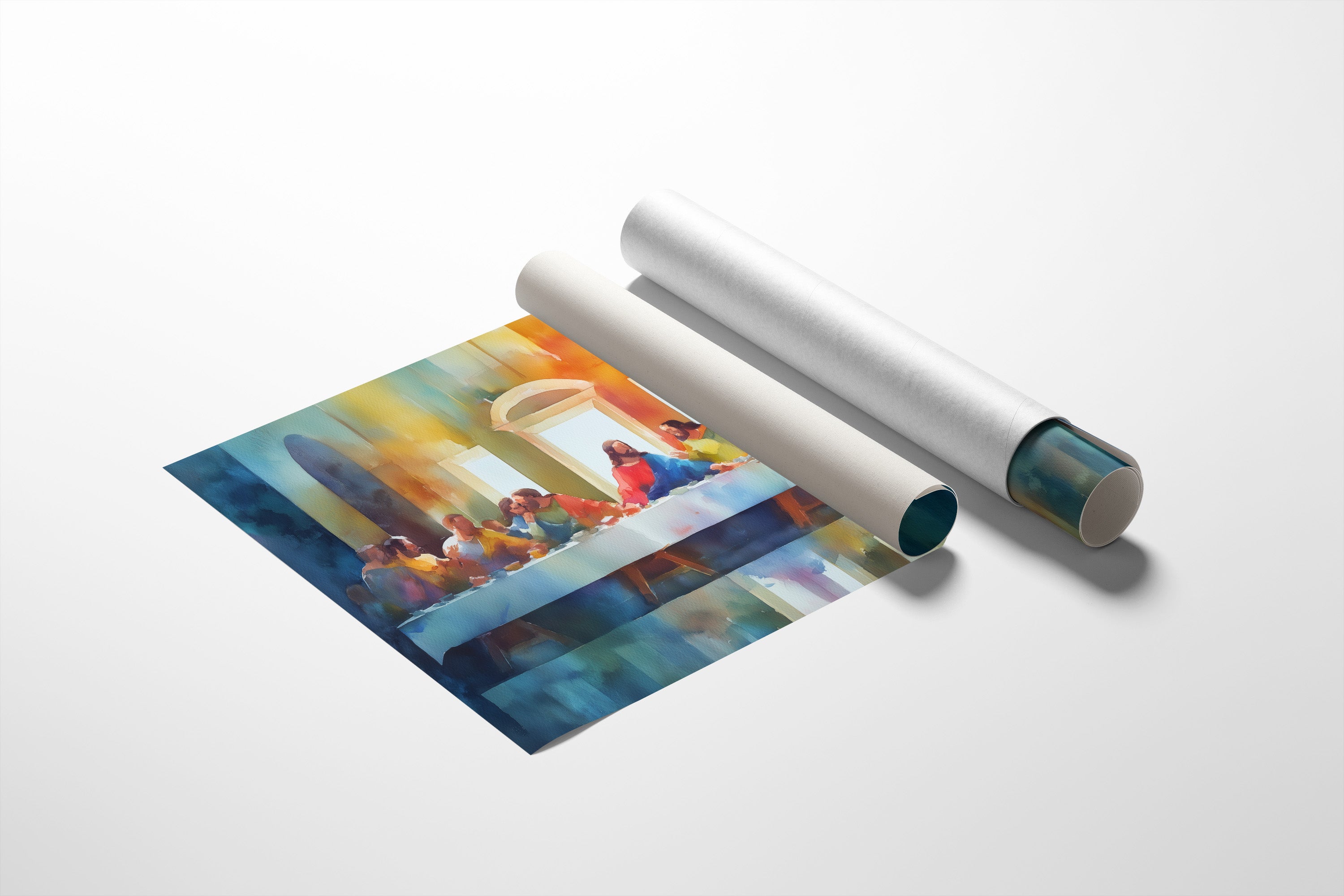 Watercolor light pools around figures gathered in communion, their vibrant garments creating a rhythm of color against soft architecture. The familiar scene reimagined breathes with contemporary brushstrokes, blending historical reverence with artistic freedom through a palette that flows from deep blues to sunlit oranges. This thoughtful interpretation finds perfect harmony nestled among books, creating a contemplative focal point for a study, reading nook, or dining area.