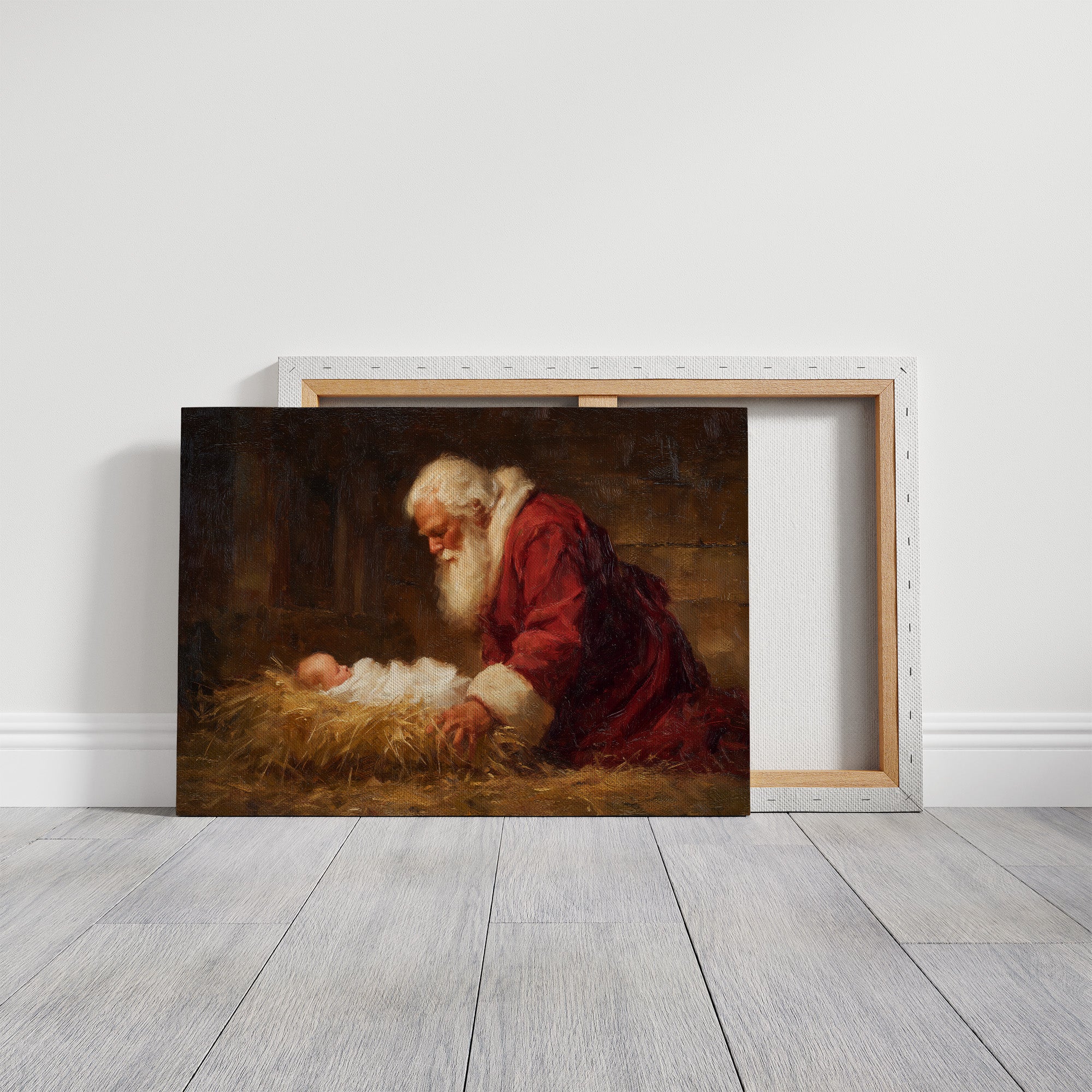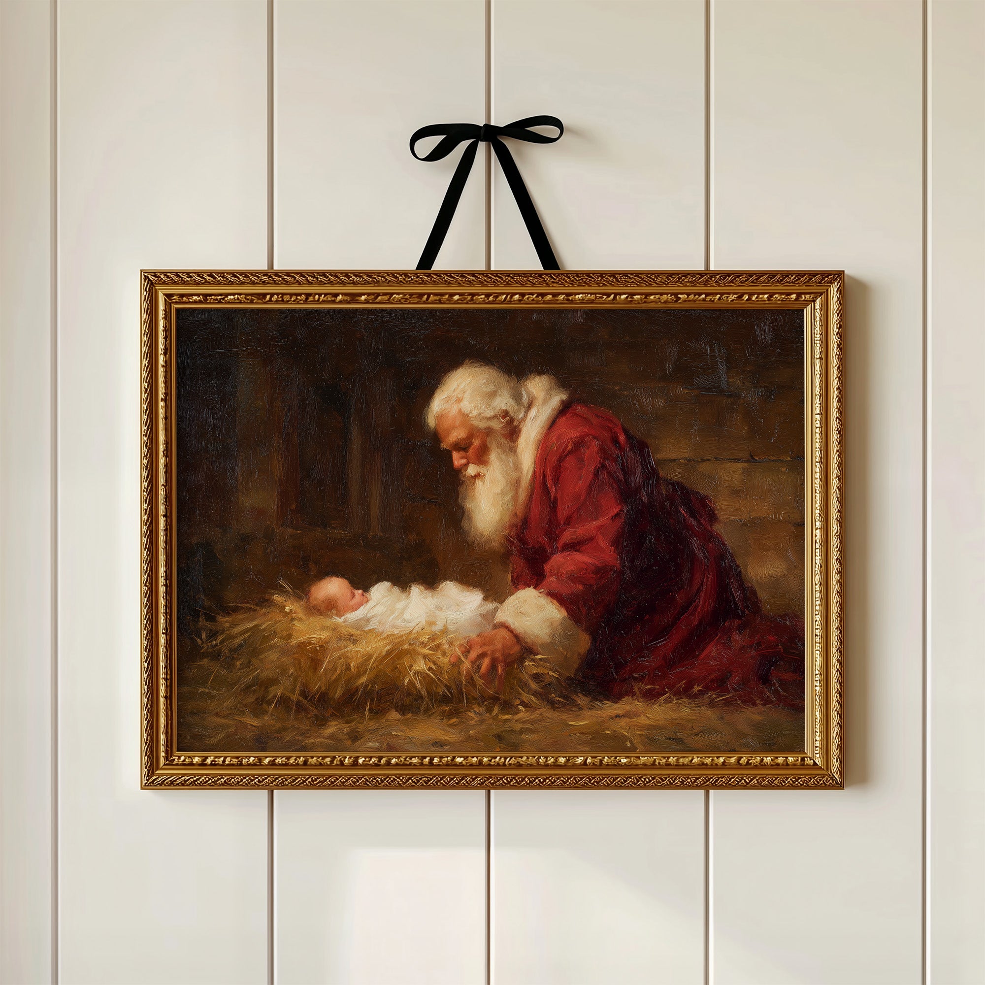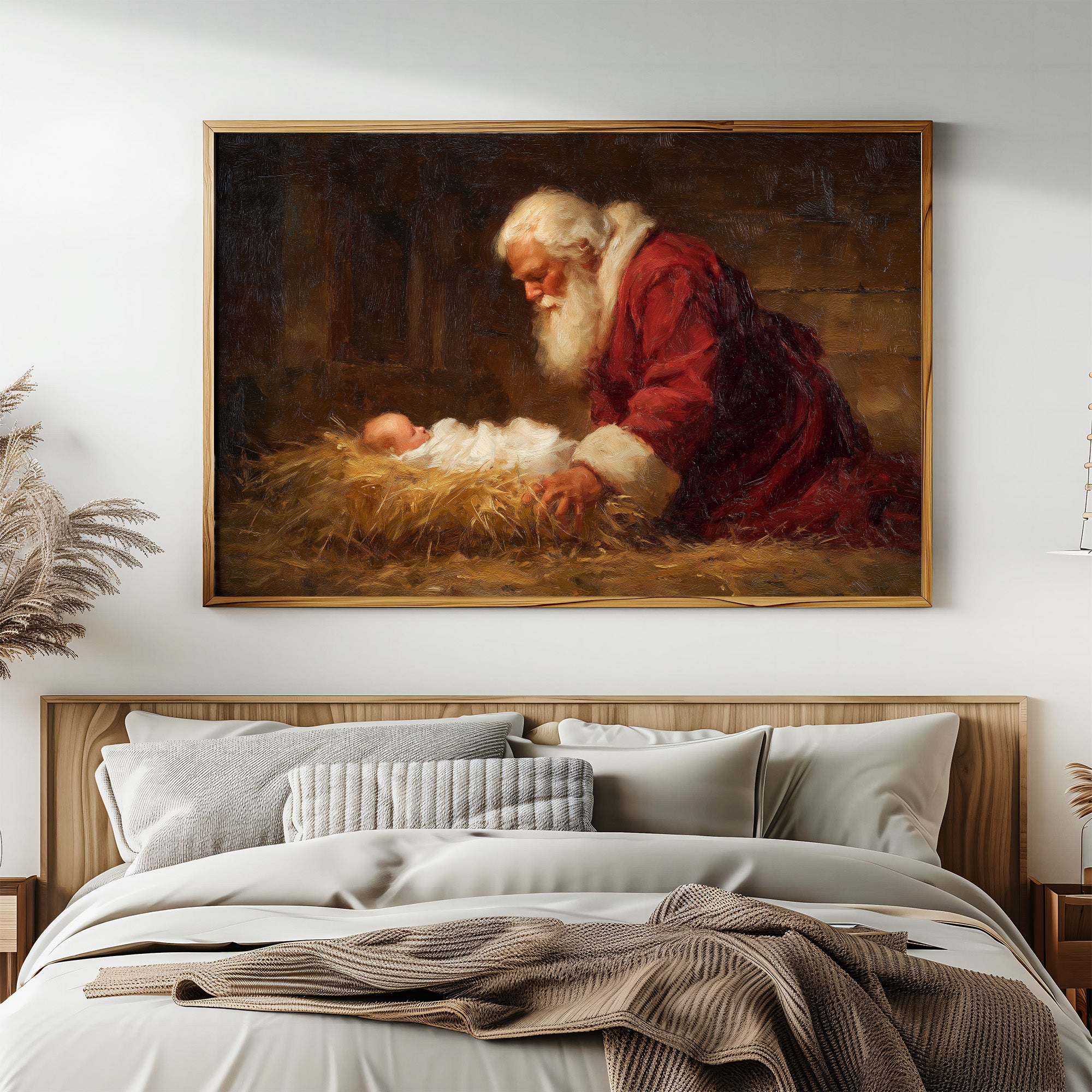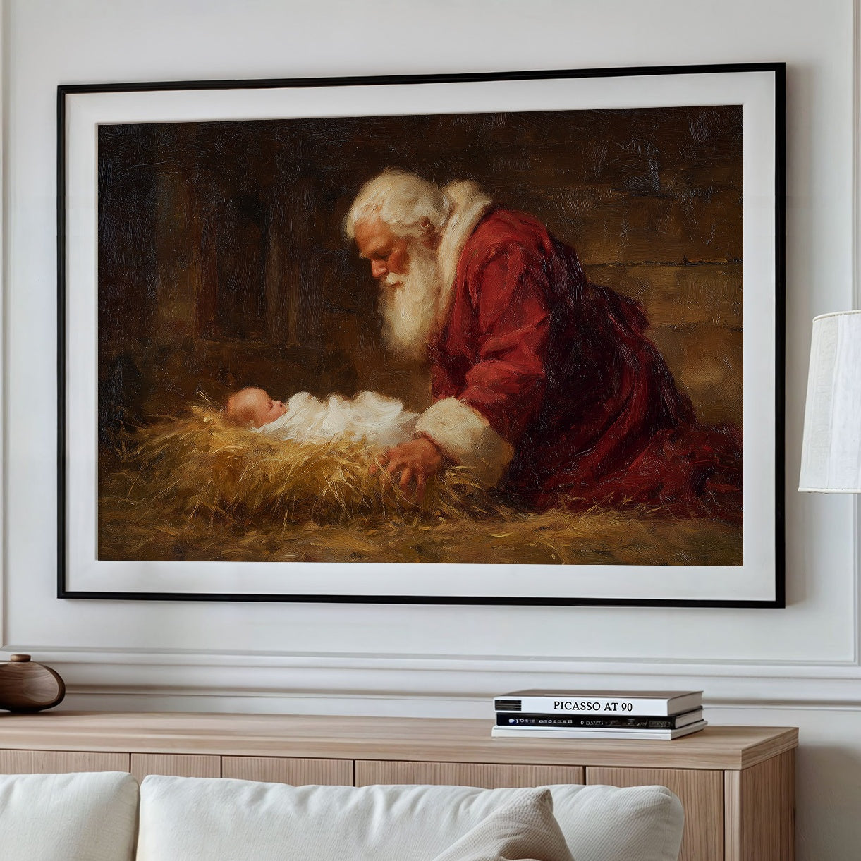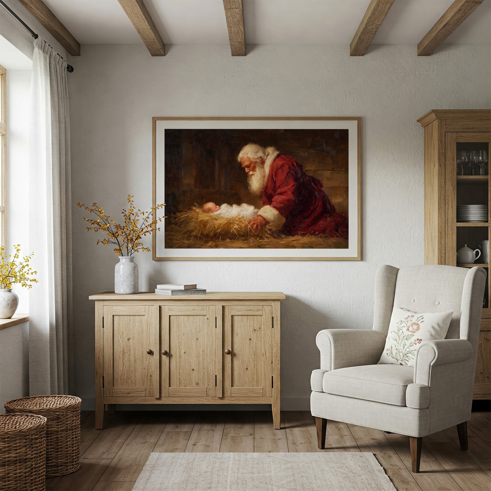 Warm light filters across a classical painting nestled among contemporary bookshelves, creating a bridge between worlds old and new. The rich crimson robes and tender moment captured in the artwork stand in beautiful contrast to the neutral tones of the modern shelving and dried pampas grass. This thoughtful vignette marries historical artistry with present-day living, inviting contemplation of timeless stories.