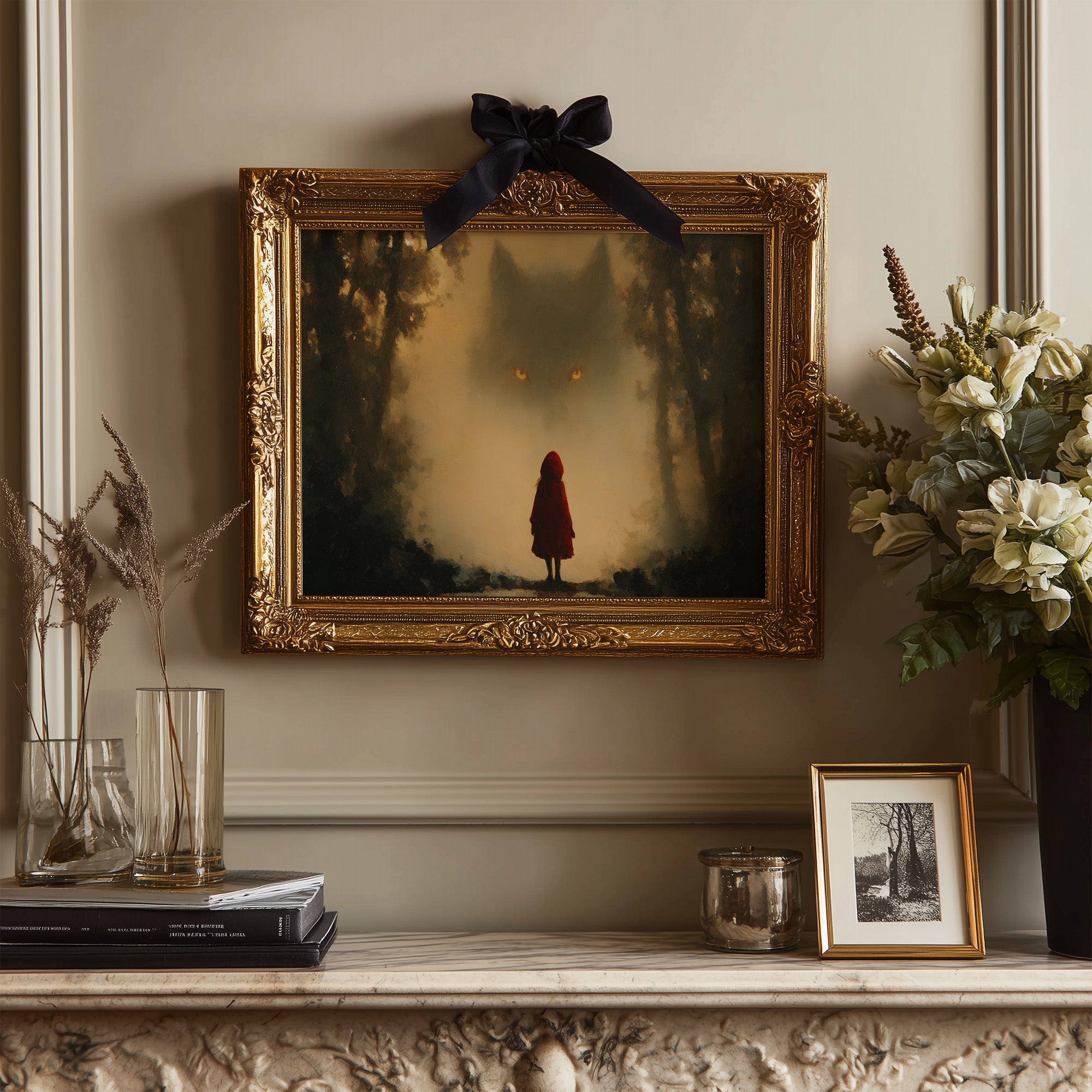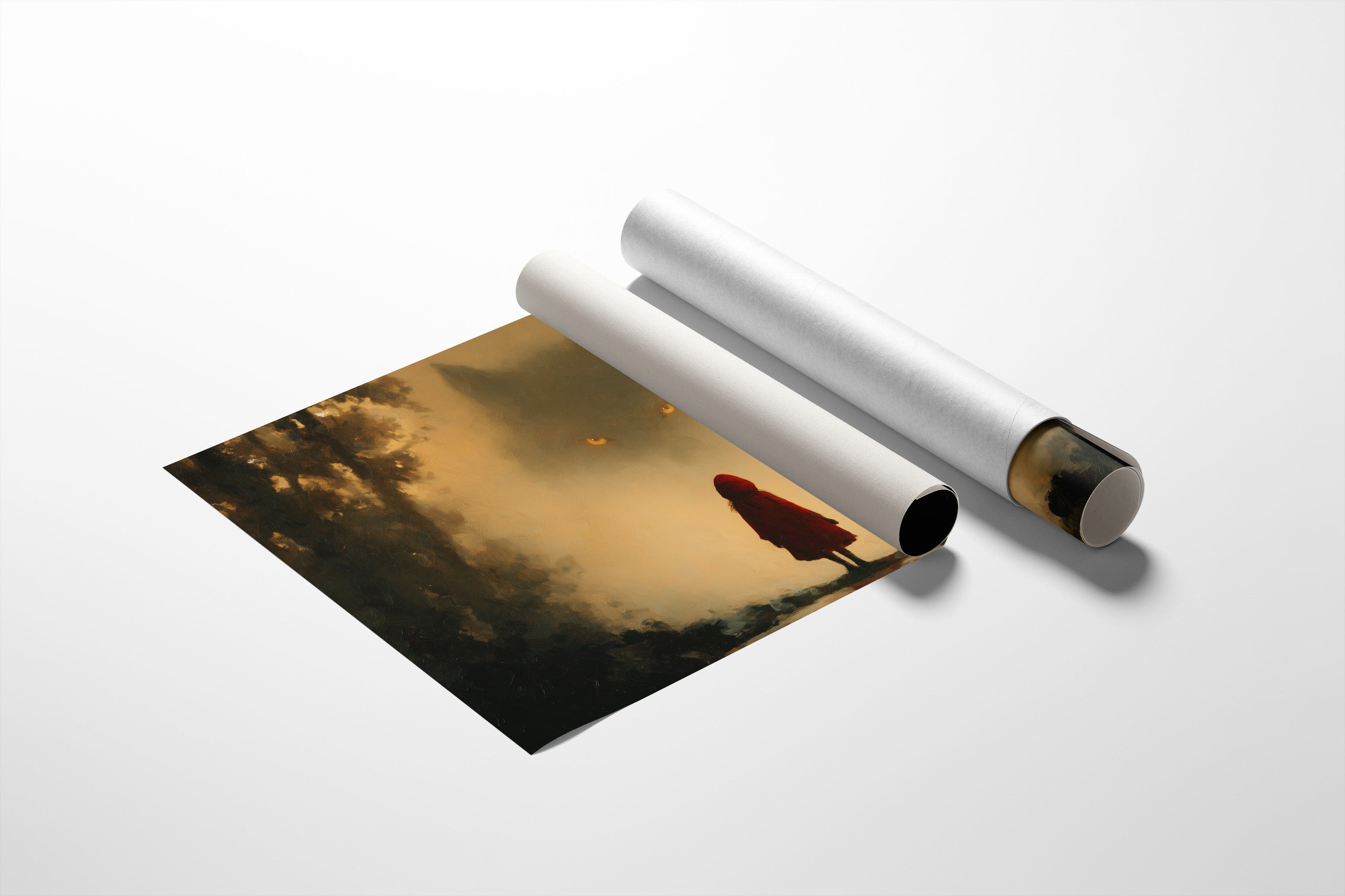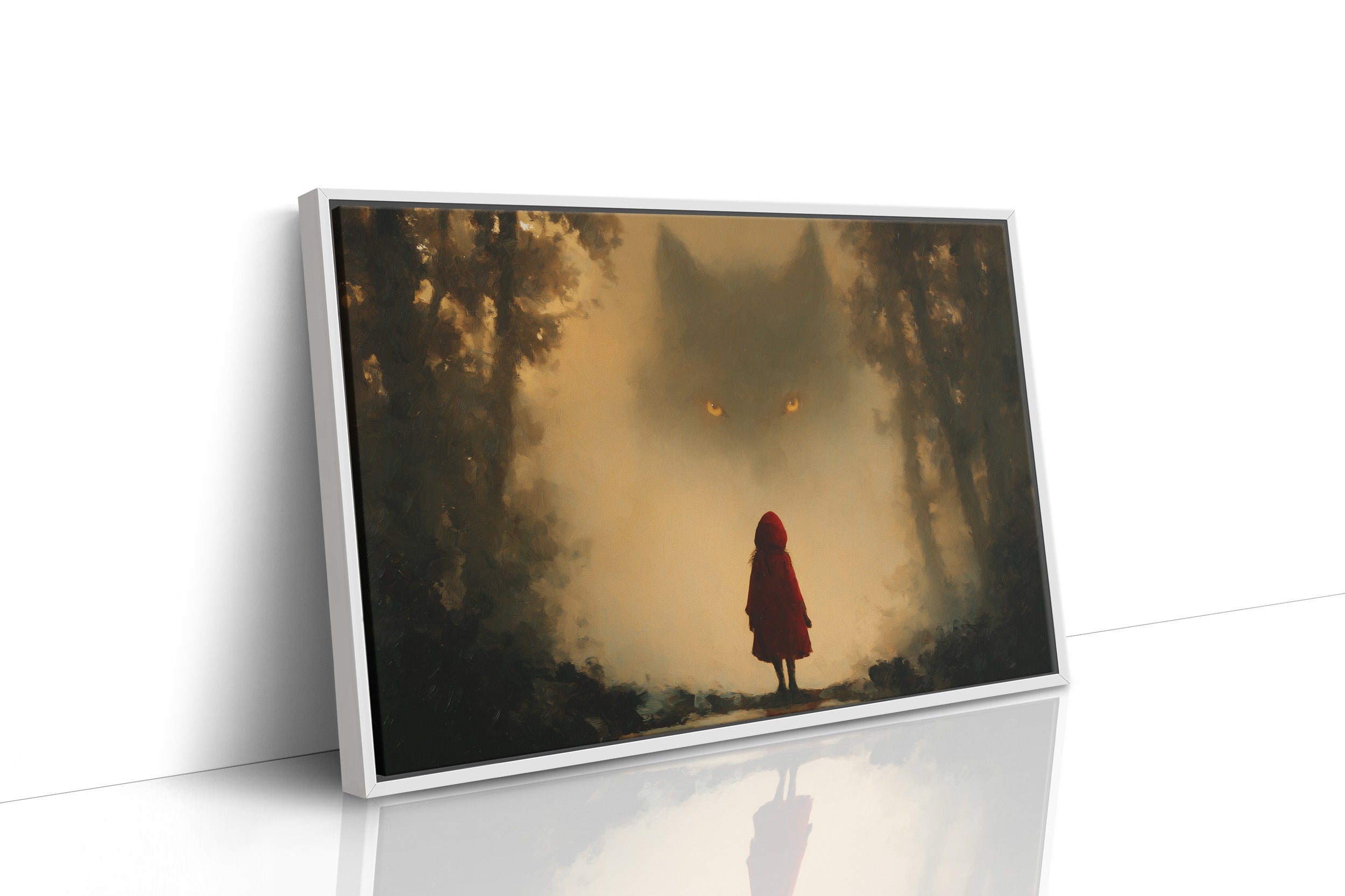 Mist hangs between worlds as a small figure in red faces an otherworldly presence with glowing eyes. The haunting composition captures that breathless moment between innocence and understanding, where folklore materializes before our eyes. Rich amber tones and deep forest shadows create a contemporary retelling of age-old warnings, inviting viewers to question which side of the threshold they stand on. This striking piece becomes the conversation's center in a study or reading nook, where leather-bound classics and modern literature create the perfect backdrop for contemplating the thin line between myth and reality.