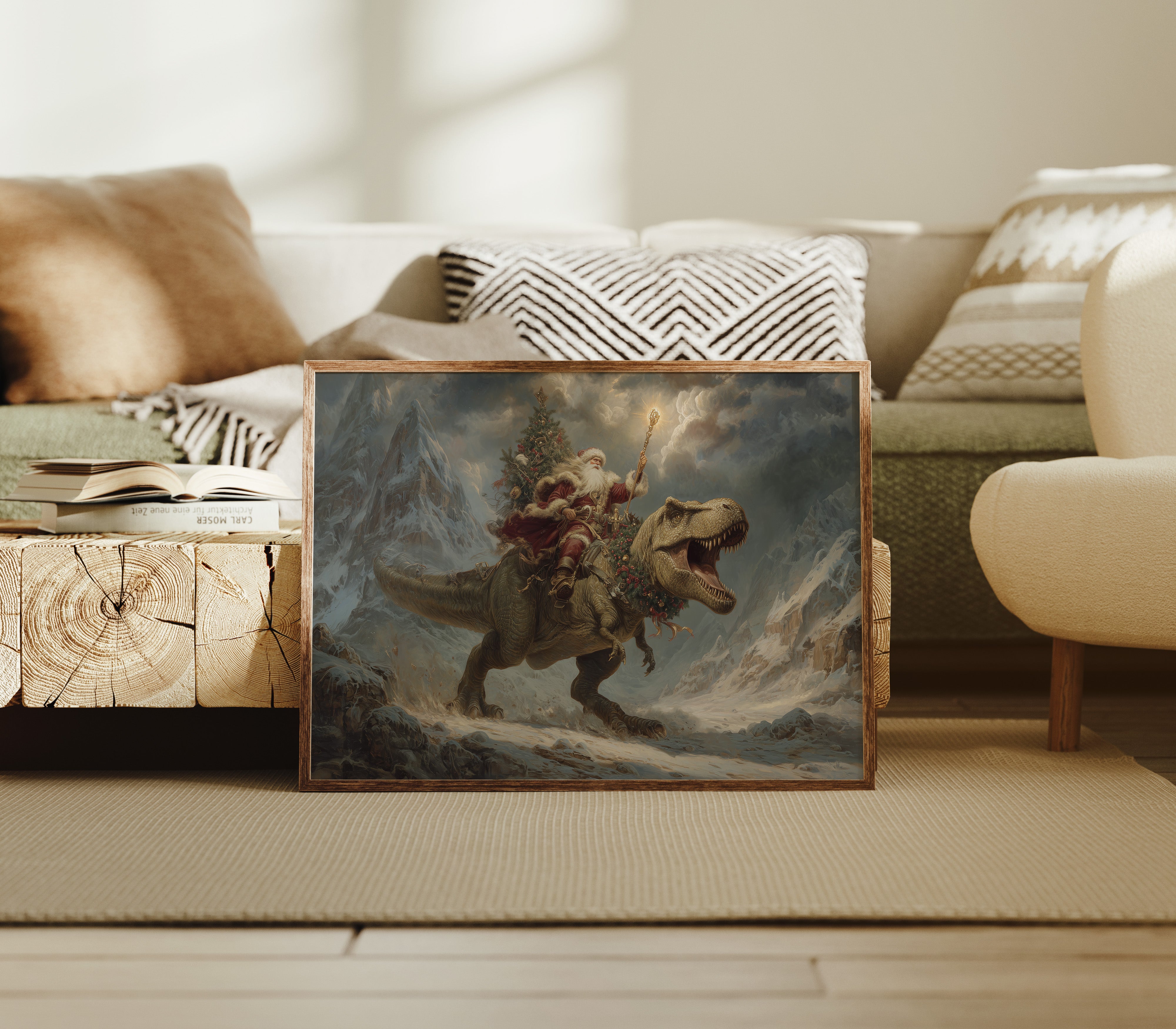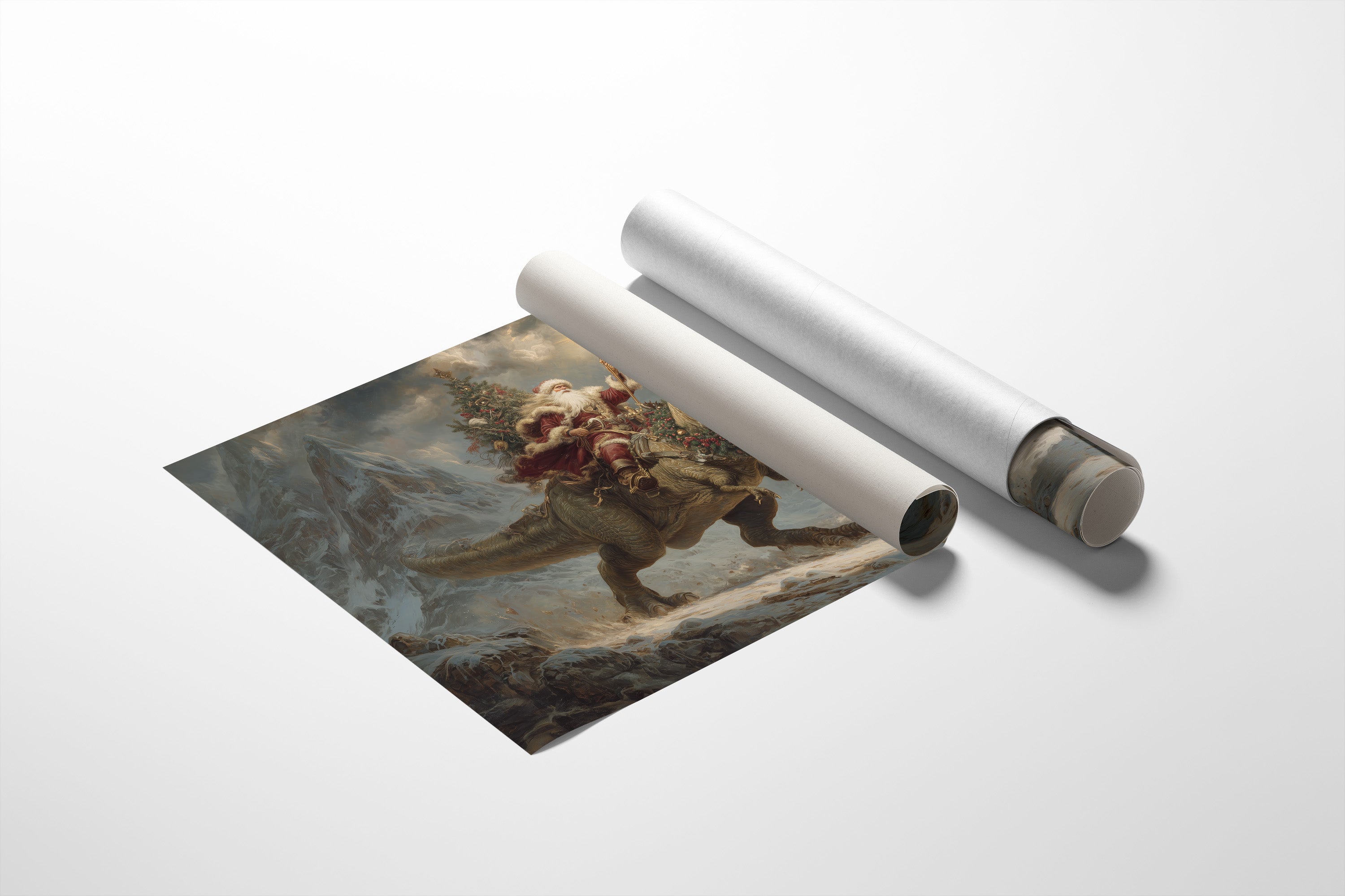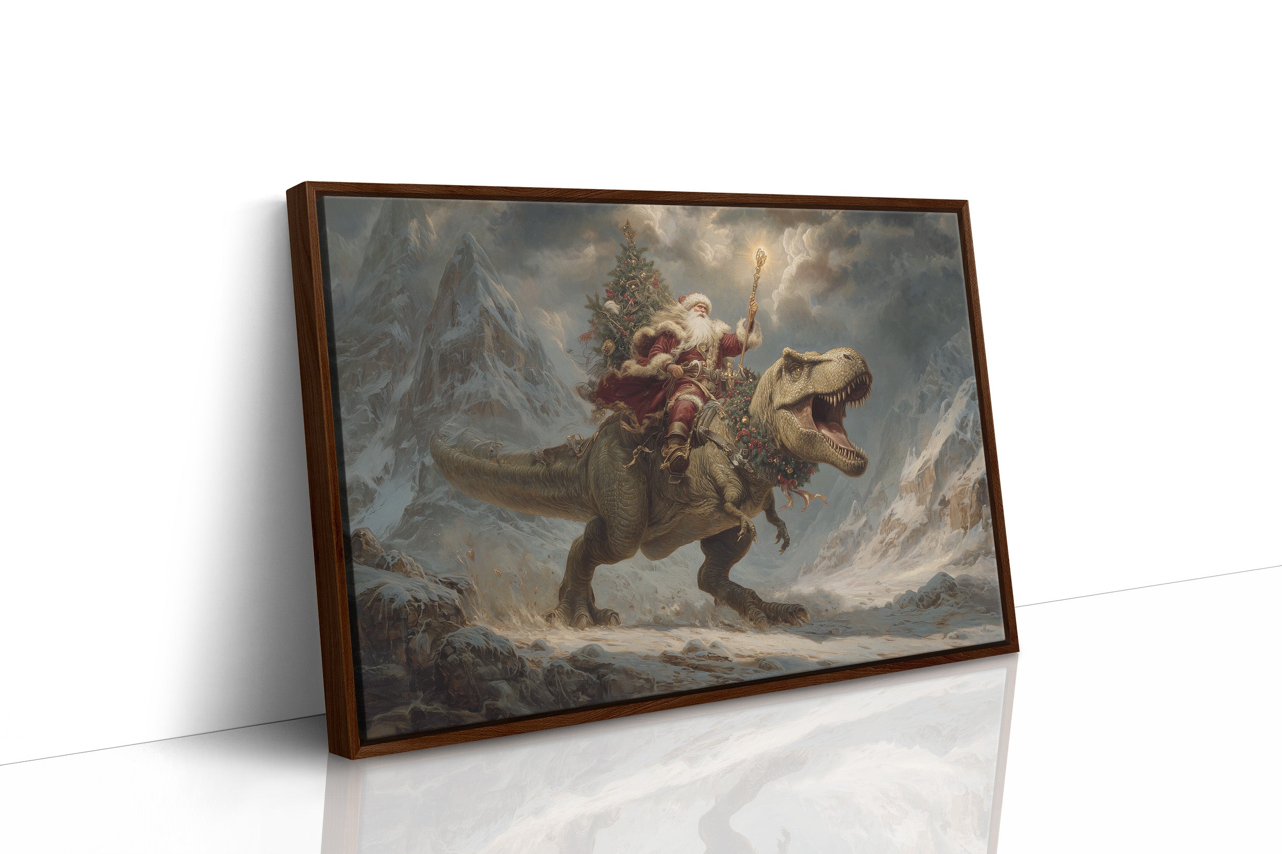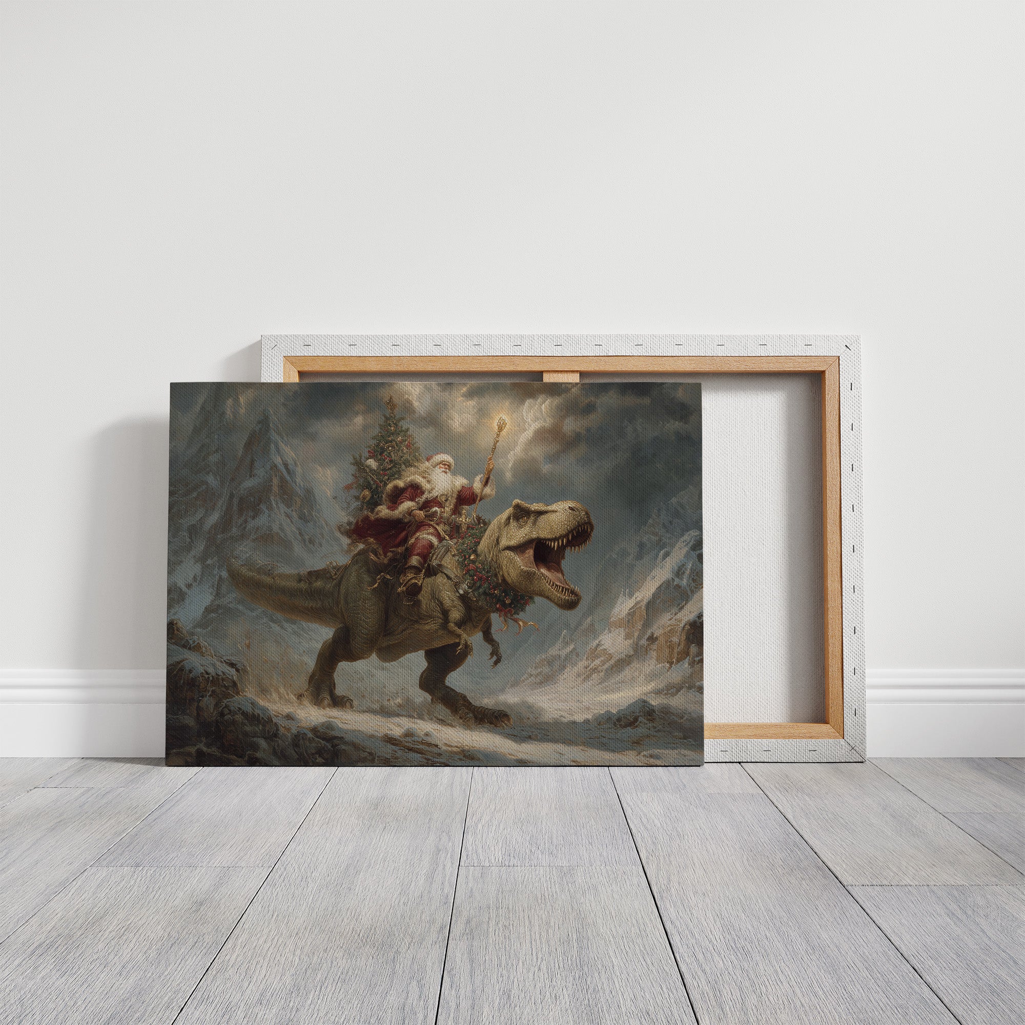 A whimsical collision of worlds unfolds as myth meets prehistory in this fantastical winter scene. Atop a mighty T-Rex, a festive figure raises a glowing staff against storm-darkened skies, while decorated evergreen boughs trail behind them through the snowy mountain peaks. The dramatic lighting and moody atmosphere create an epic narrative where the impossible becomes gloriously real. This contemporary reimagining blends the fierce power of the Jurassic era with the warmth of holiday wonder, all rendered in rich, cinematic tones that command attention. Perfect for adding an unexpected twist of imagination to a modern living space or creating a bold conversation piece in a child's room or playful home office.