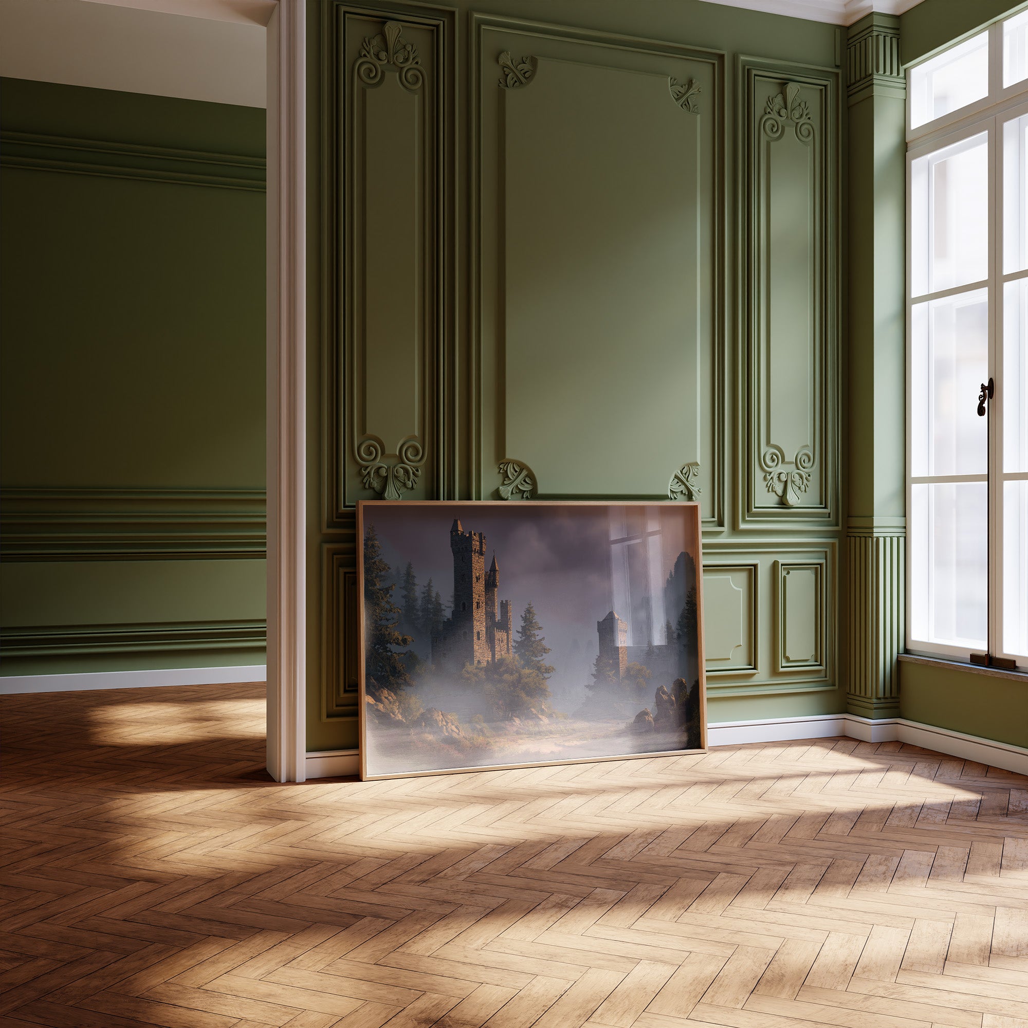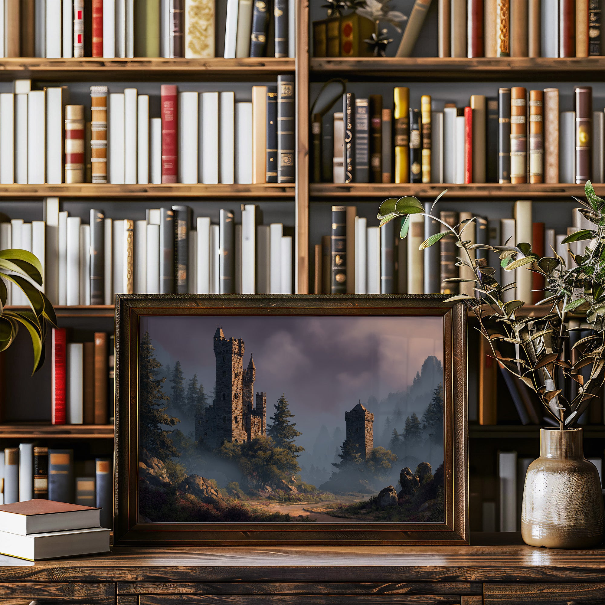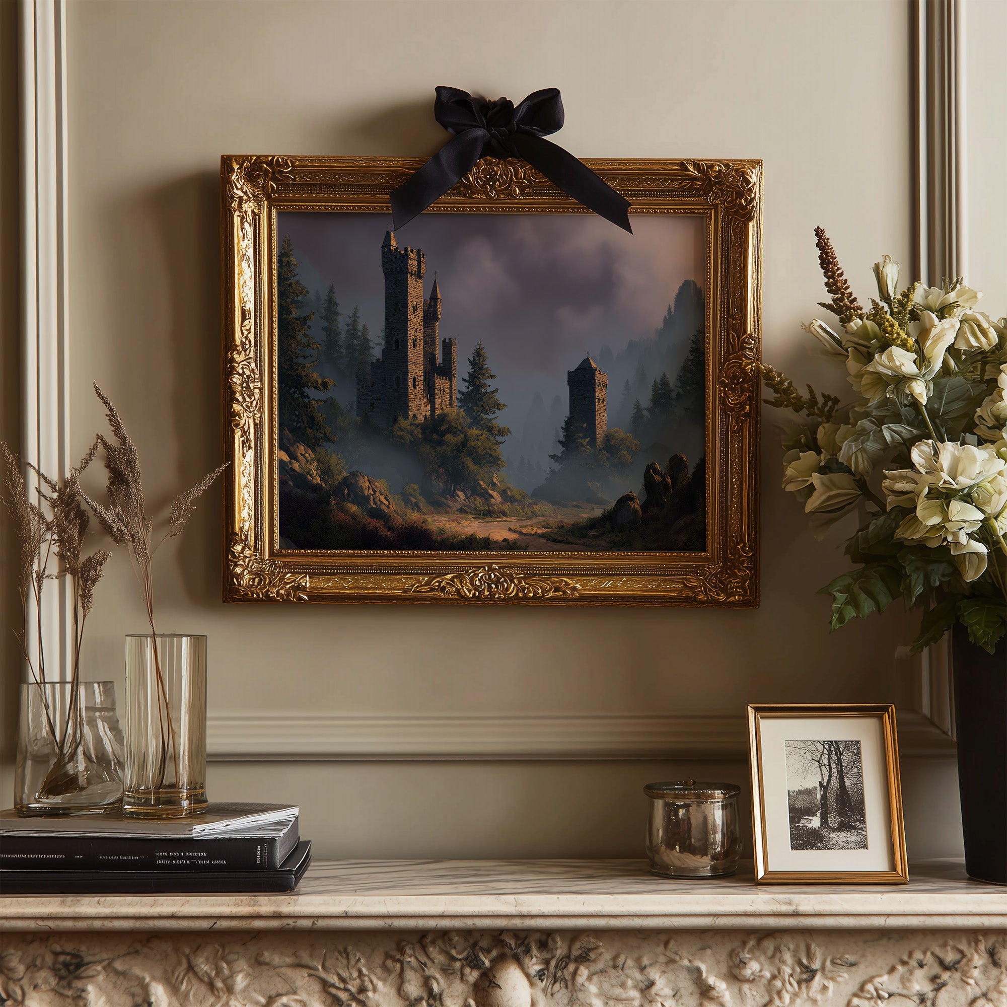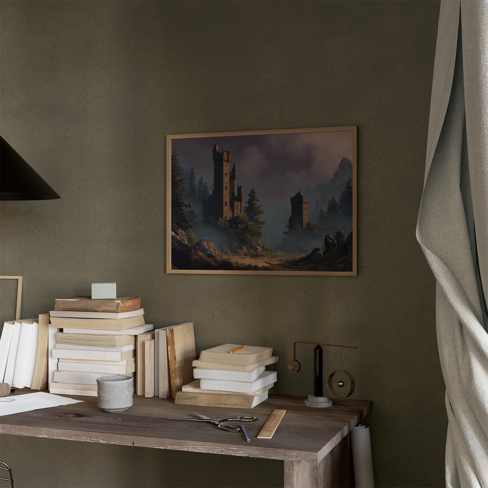 Weathered stone rises from the fog like memories refusing to fade, standing sentinel over a landscape steeped in mystery. The twin medieval towers pierce through swirling mist, their rugged silhouettes stark against the moody, twilight sky that threatens rain. Surrounded by deep evergreens and craggy outcroppings, the path between them tells of journeys both taken and imagined. This evocative scene brings old-world enchantment to a study, reading nook, or any space where imagination and contemplation flourish.