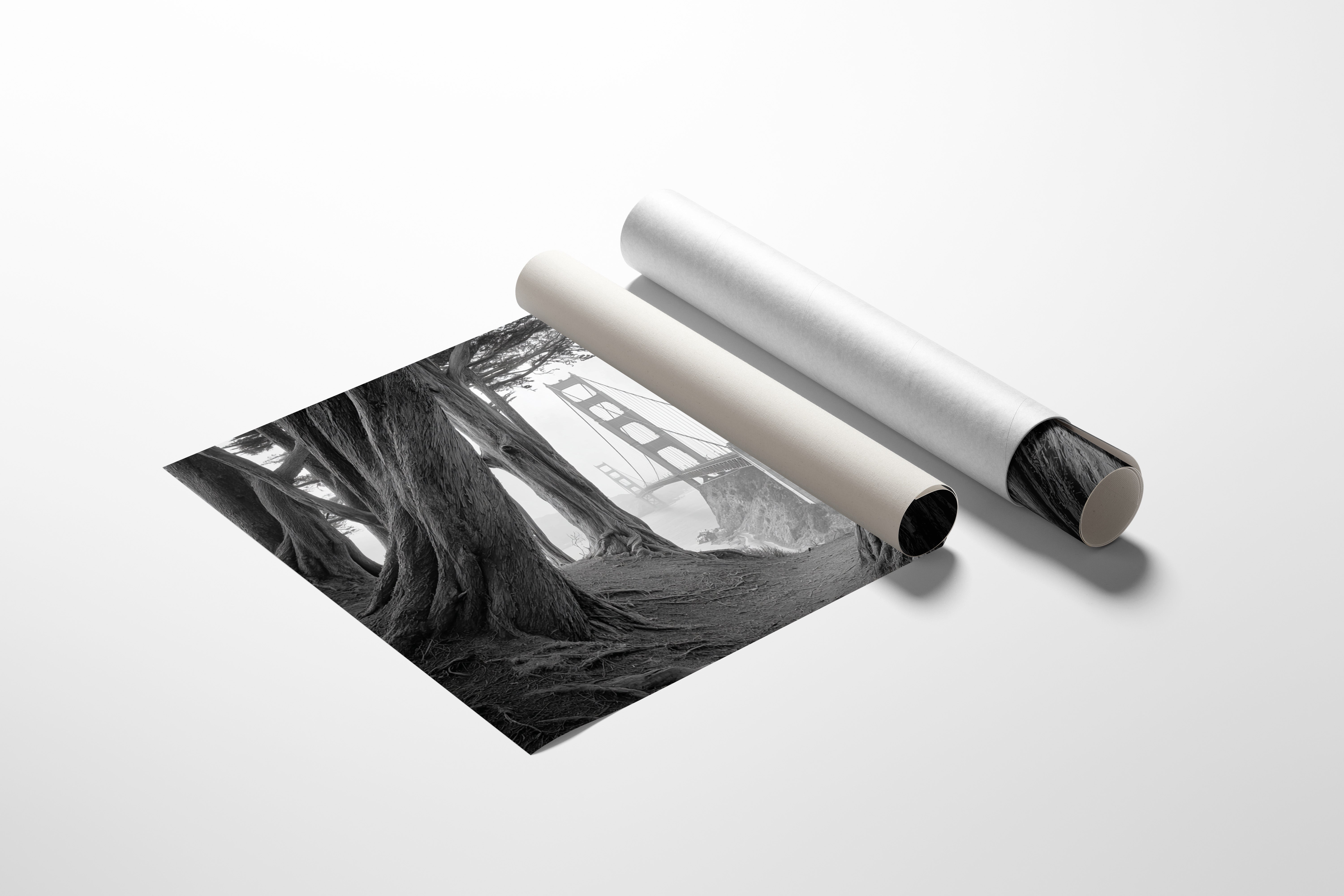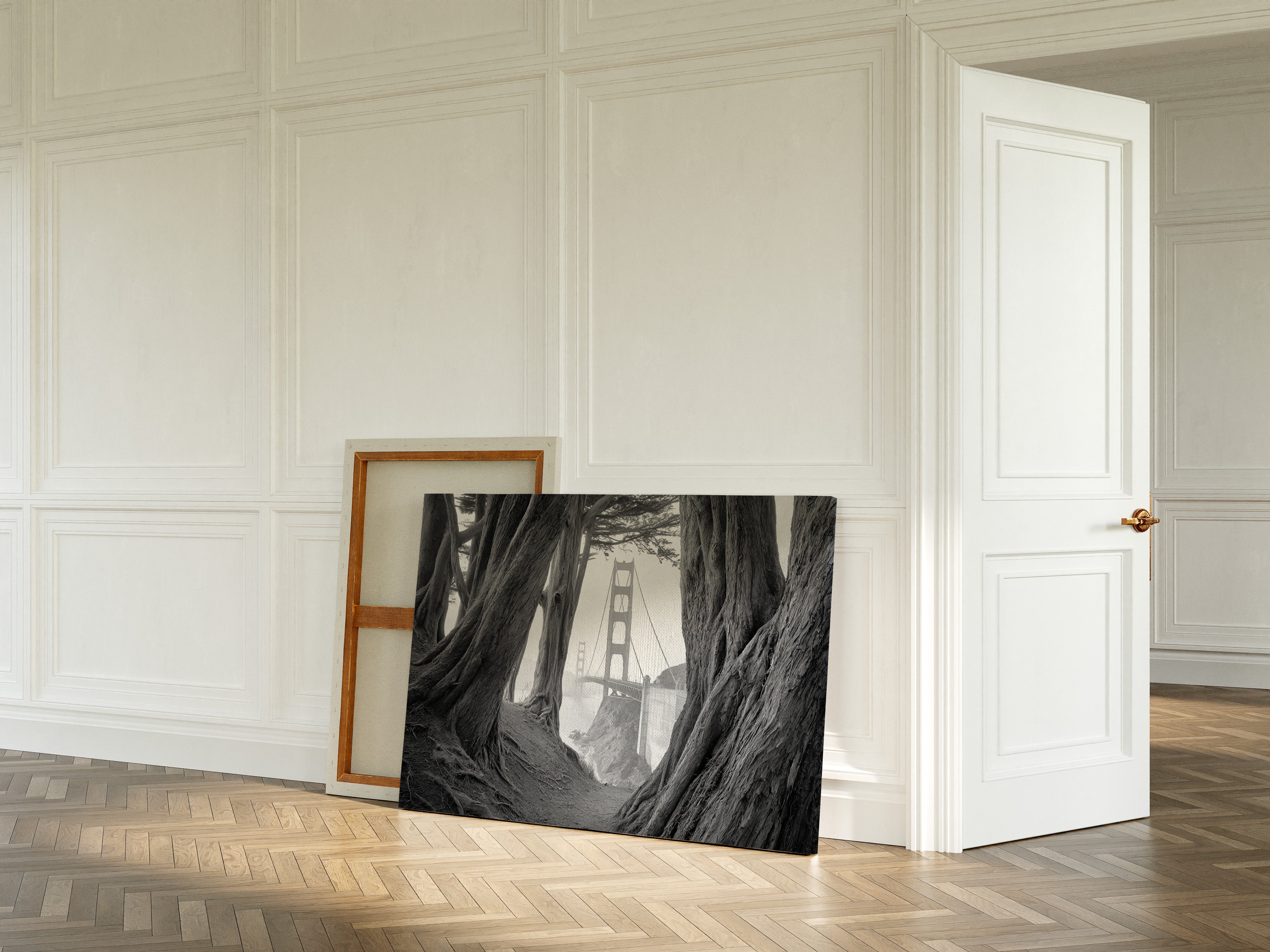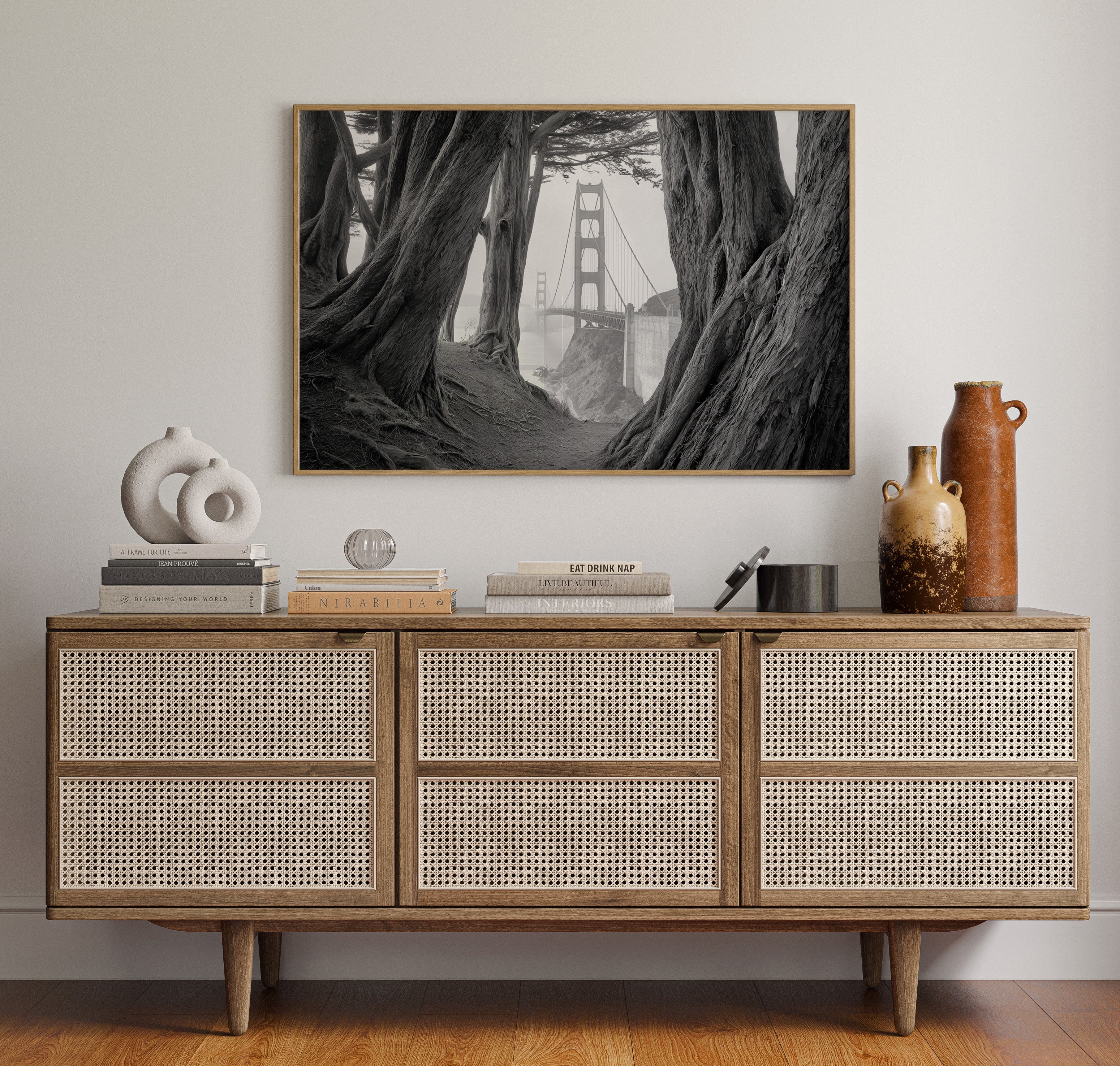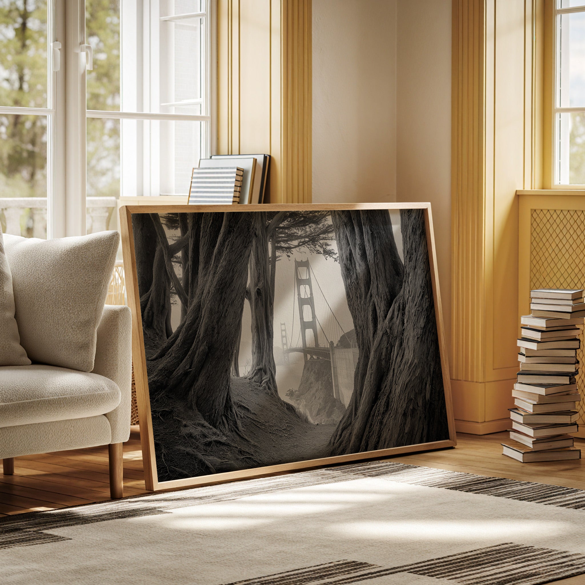 Through a natural archway of weathered cypress trees, the iconic Golden Gate Bridge emerges like a vision from the mist. The gnarled trunks create a dramatic foreground, their twisted forms telling stories of decades spent guarding this coastal viewpoint. In black and white, the scene captures the dialogue between natural and architectural majesty - ancient bark patterns leading to sleek engineering brilliance. This composition would bring contemplative elegance to a study or living room, where its timeless contrast between organic and geometric forms can be fully appreciated.