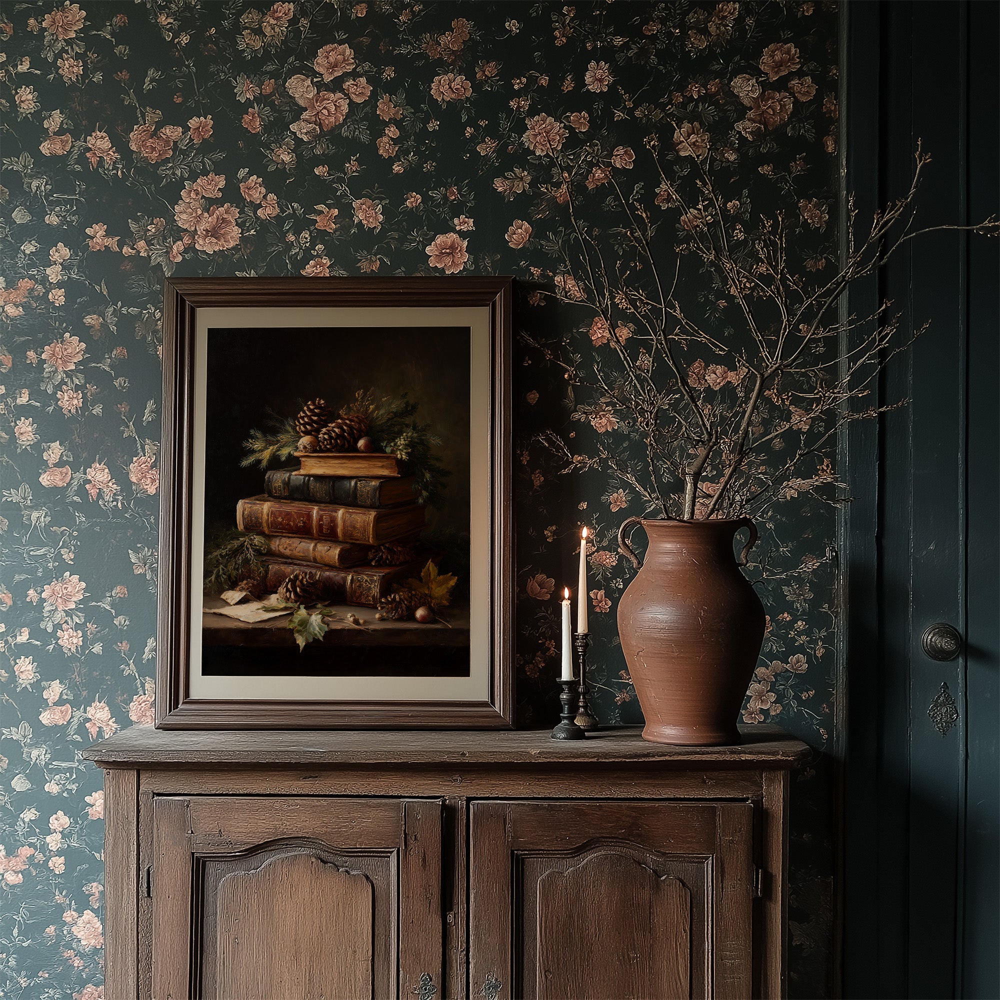 The warm glow of aged leather bindings catches the light, creating a moment suspended between centuries. Antique books stack beneath pine cones and evergreen sprigs, their worn edges speaking of countless hands that have turned their pages. Rich browns and deep forest greens create a harmonious palette against the dramatic darkness, evoking the quiet contemplation of winter evenings spent fireside. This sophisticated still life brings timeless elegance to a study, library, or reading nook where thoughtful conversations unfold.