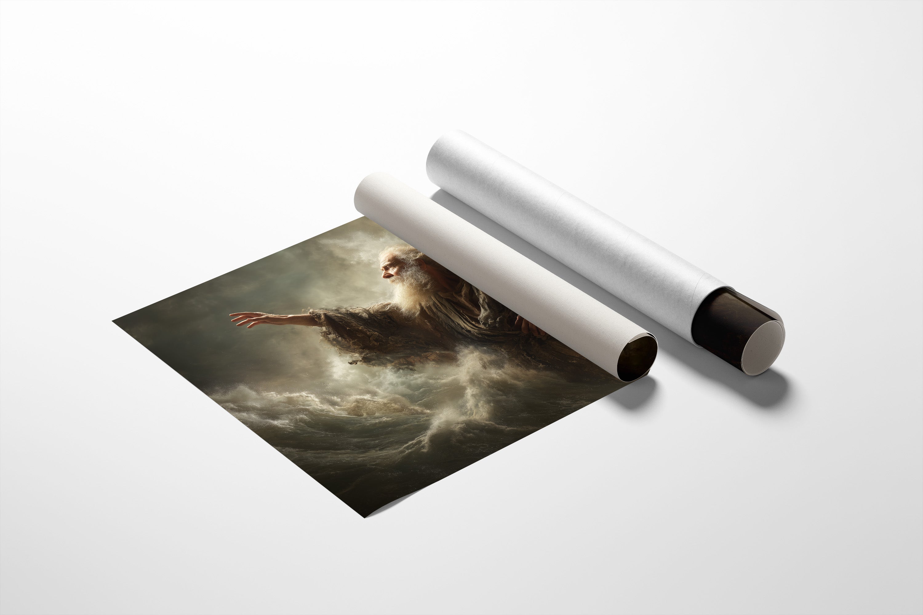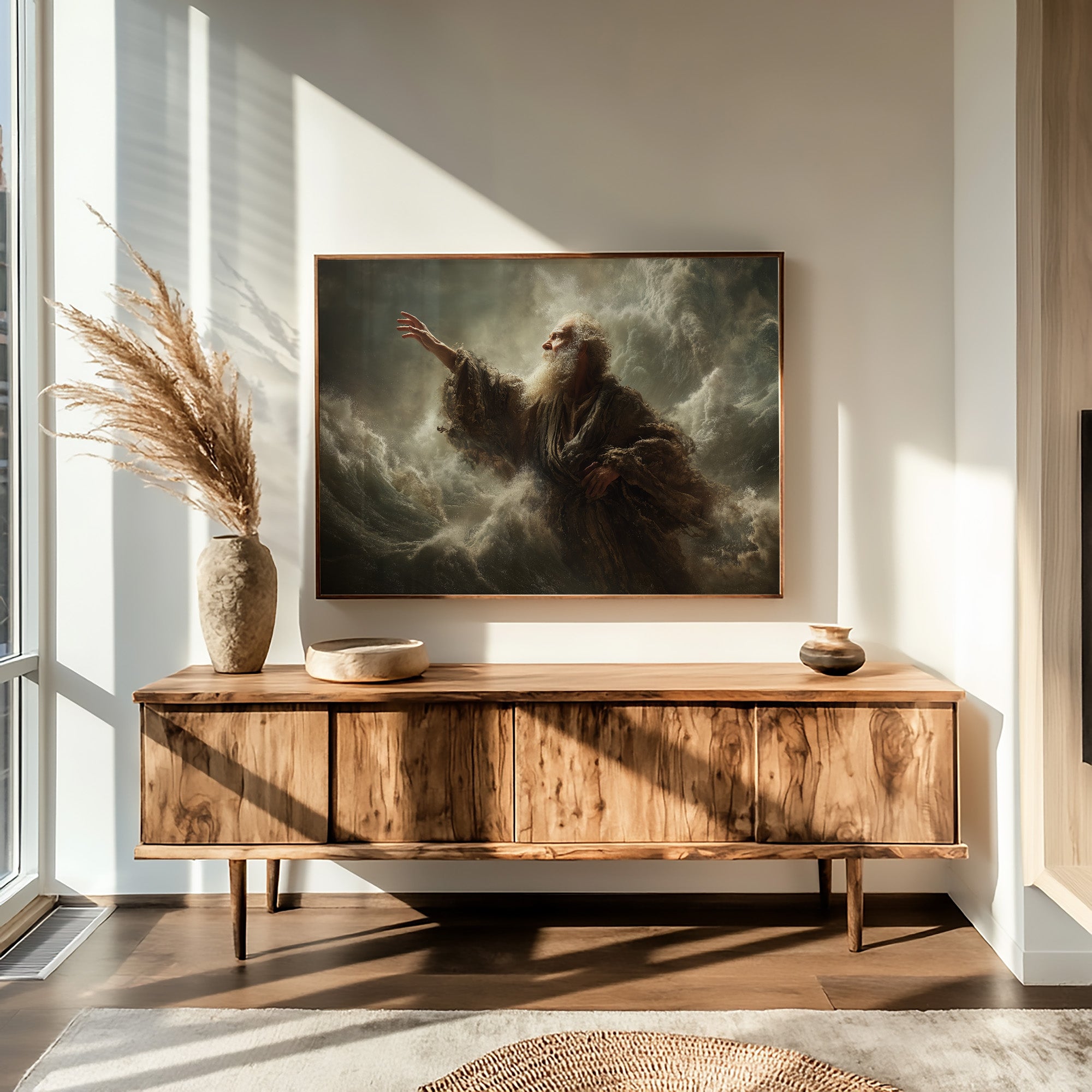 A powerful moment frozen in time, where faith meets fury in a tempest of swirling clouds and churning waves. The weathered figure stands defiant against nature's might, his outstretched hand both plea and command as stormy skies respond to his presence. Rich tones of gray and amber create a dramatic interplay of light and shadow, capturing the raw emotion of this spiritual confrontation. This contemplative piece creates a striking focal point in a study, reading nook, or meditation space.