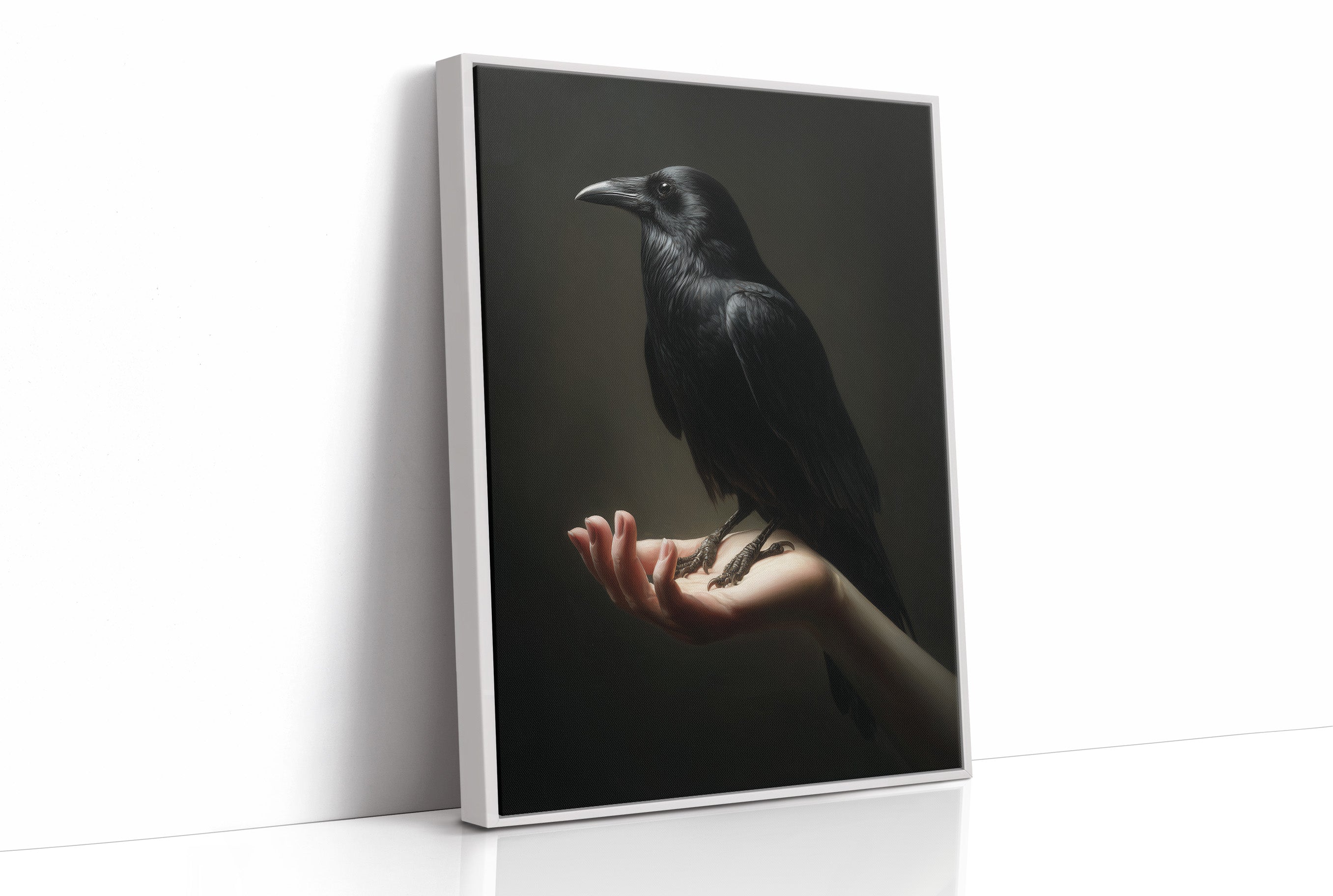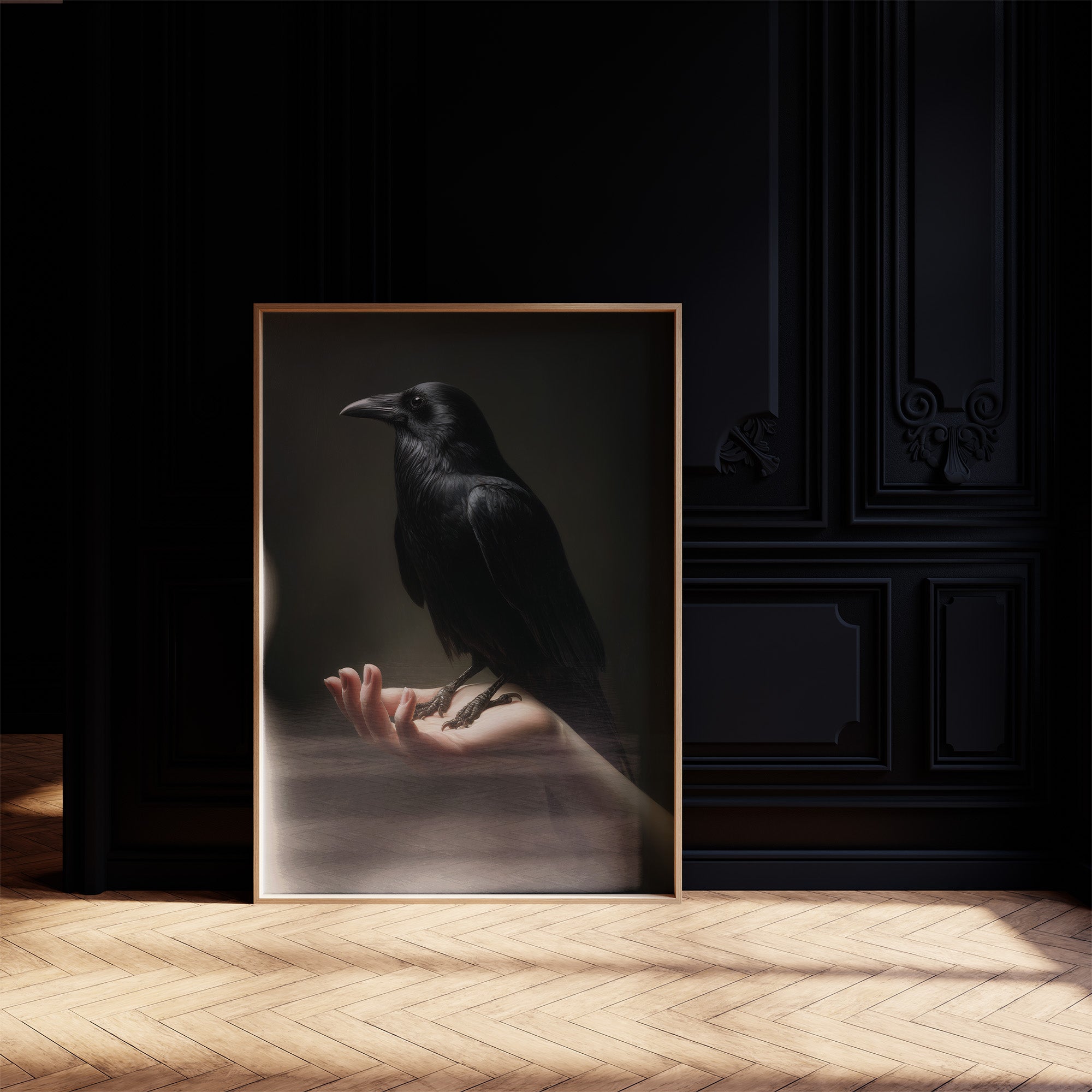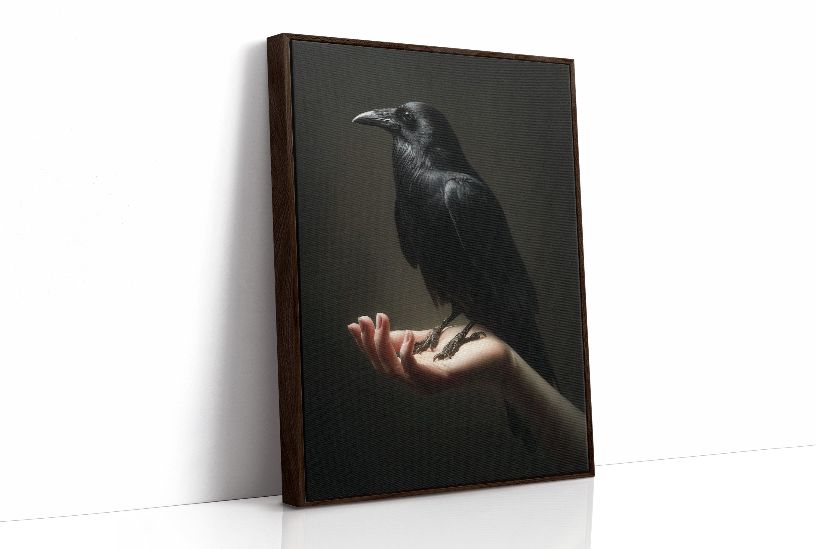 In the hushed space between trust and mystery, a glossy raven rests on an outstretched hand. The dramatic chiaroscuro lighting carves the bird's sleek feathers against the darkness, creating a moment of profound connection between human and corvid. The minimalist composition speaks of folklore and forgotten knowledge, where the boundary between wildness and companionship dissolves into something primordial. This striking piece commands attention in modern interiors with dark accent walls or spaces that celebrate the dramatic interplay of light and shadow.