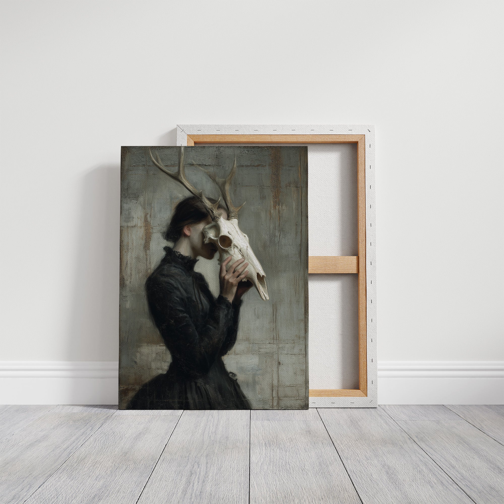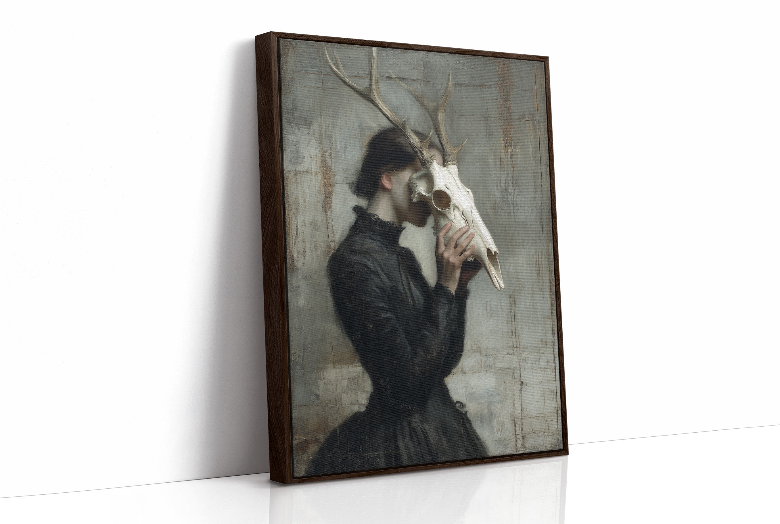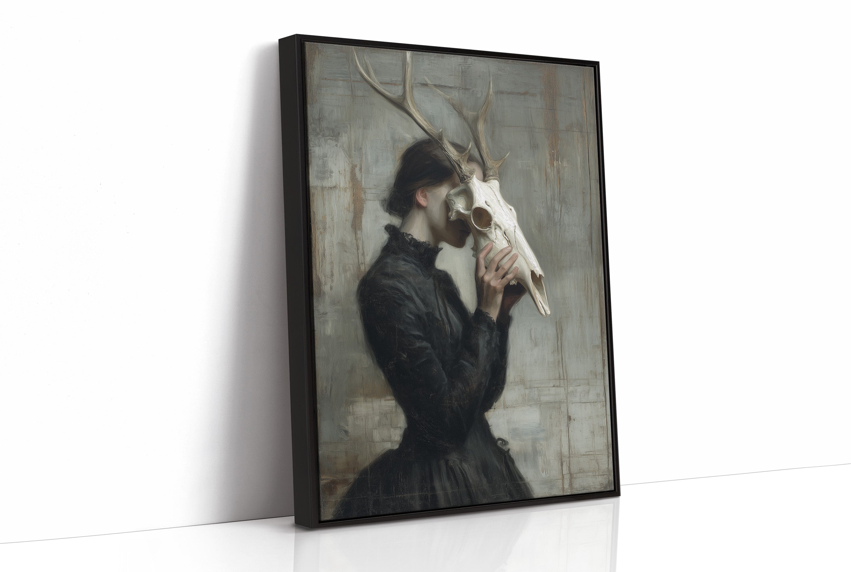 A haunting communion between woman and death, frozen in a moment of intimate reverence. The figure in Victorian attire holds a deer skull to her face, the antlers rising above her like a crown of wild dignity against a weathered, pale backdrop. The muted palette of blacks, grays, and bone white creates a somber dialogue between mortality and grace, between the wild and the refined. This striking contemporary piece makes a powerful statement in a minimalist living space or as the focal point of a moody study where conversations about art and philosophy unfold.