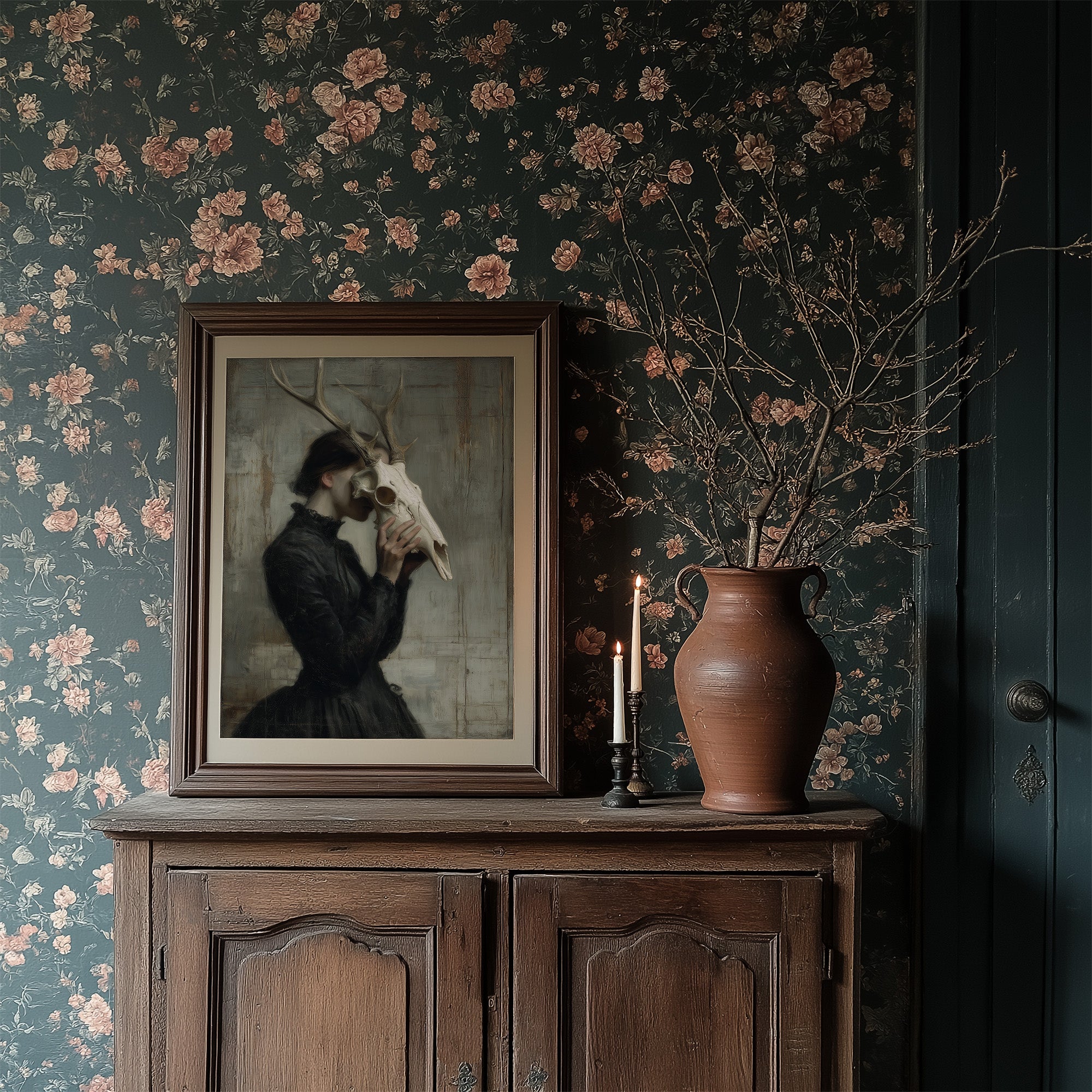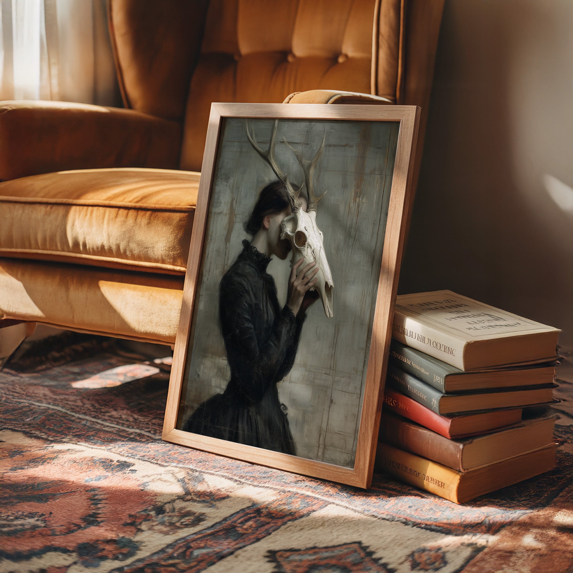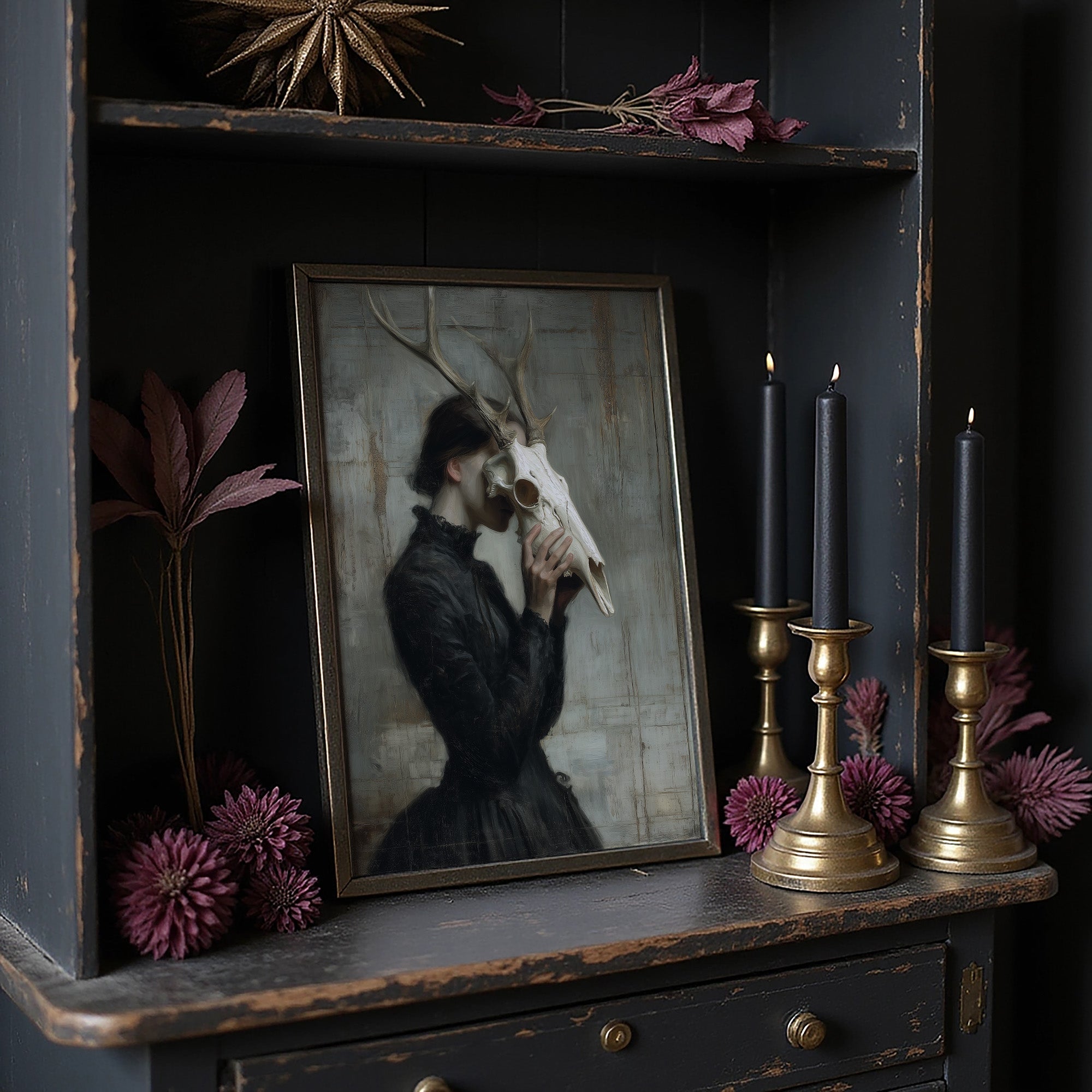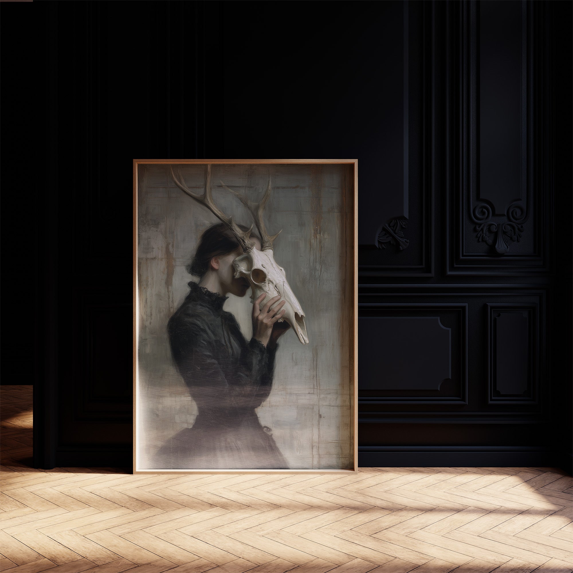 A haunting communion between woman and death, frozen in a moment of intimate reverence. The figure in Victorian attire holds a deer skull to her face, the antlers rising above her like a crown of wild dignity against a weathered, pale backdrop. The muted palette of blacks, grays, and bone white creates a somber dialogue between mortality and grace, between the wild and the refined. This striking contemporary piece makes a powerful statement in a minimalist living space or as the focal point of a moody study where conversations about art and philosophy unfold.