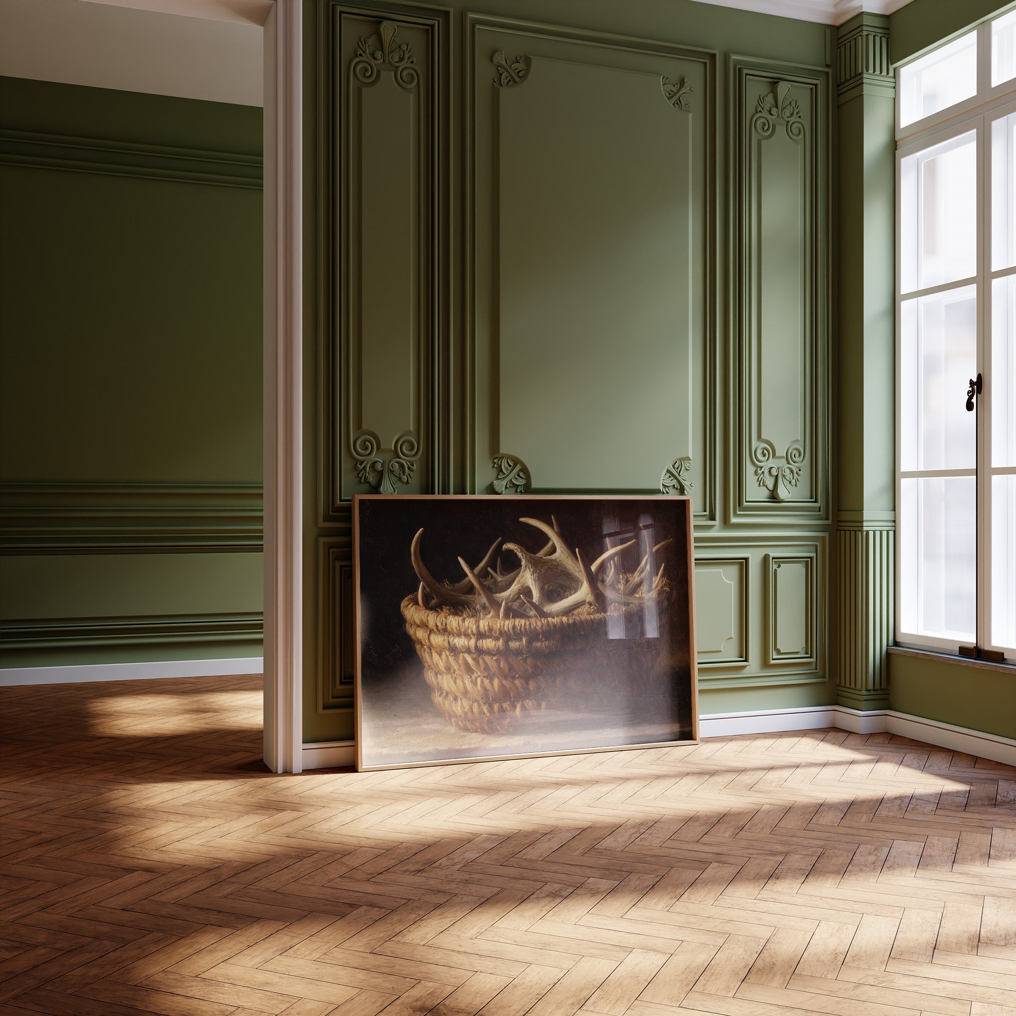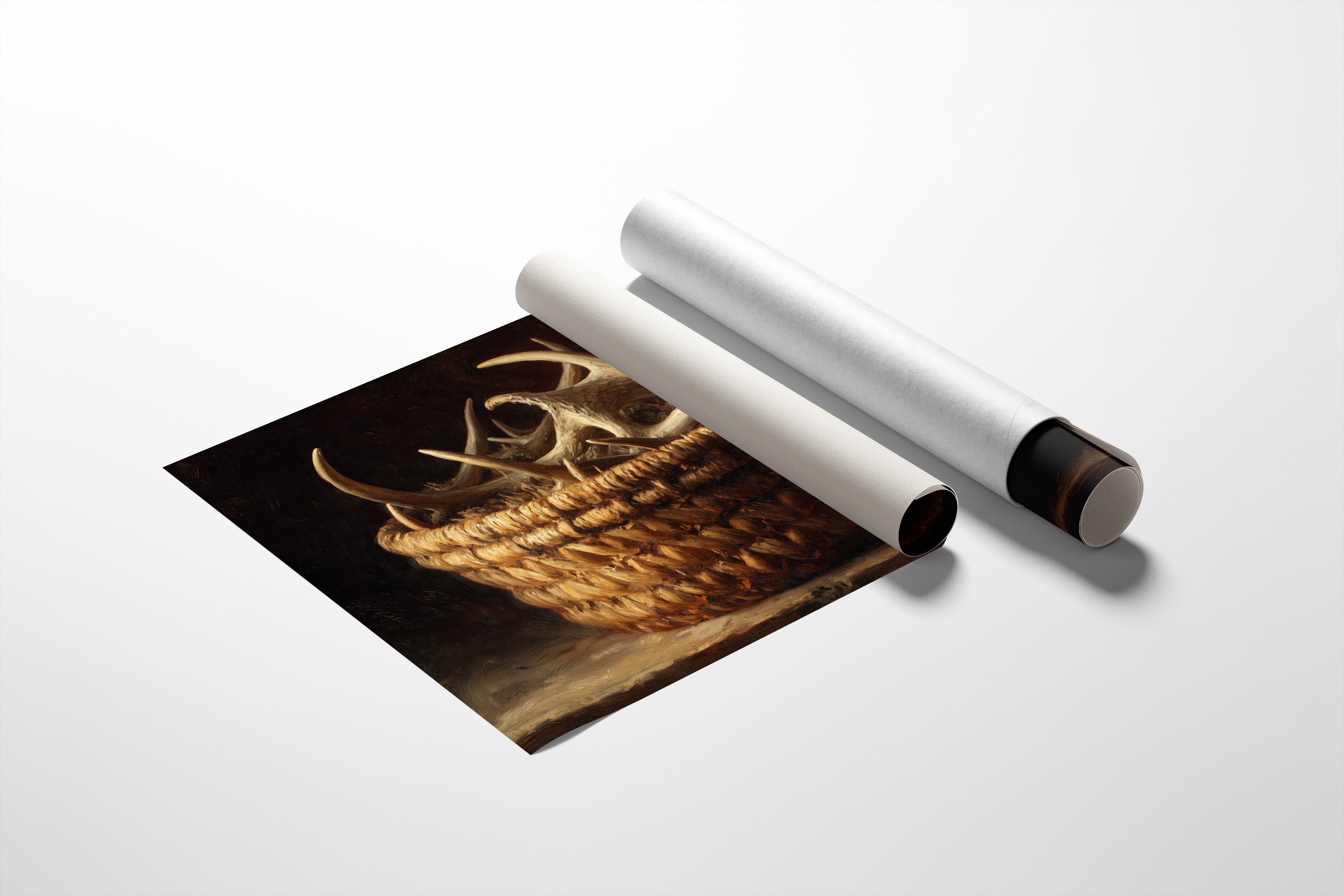 Sunlight traces the curves of bone against woven fibers, creating a dialogue between the wild and the domestic. The painting's rich amber tones and dramatic chiaroscuro lighting evoke the quiet dignity of natural treasures collected and preserved. Against the backdrop of countless spines of knowledge, this still life speaks to our ancient relationship with the wilderness that exists beyond our ordered shelves.