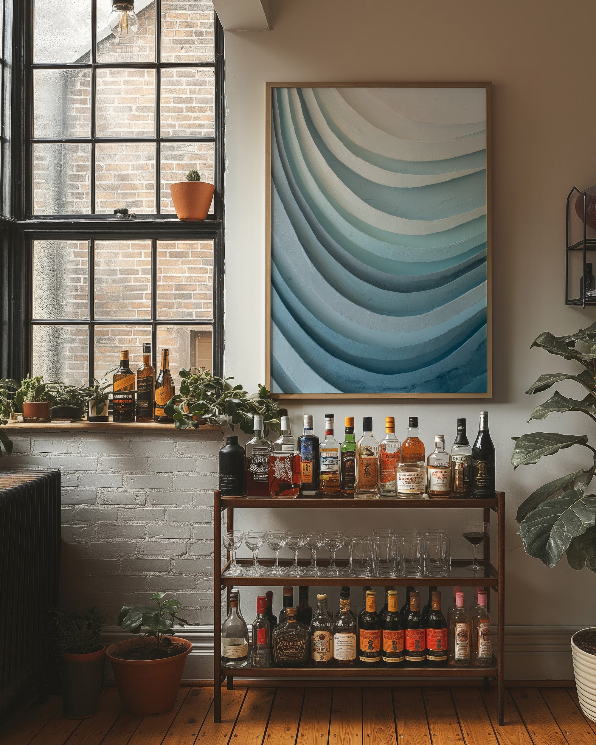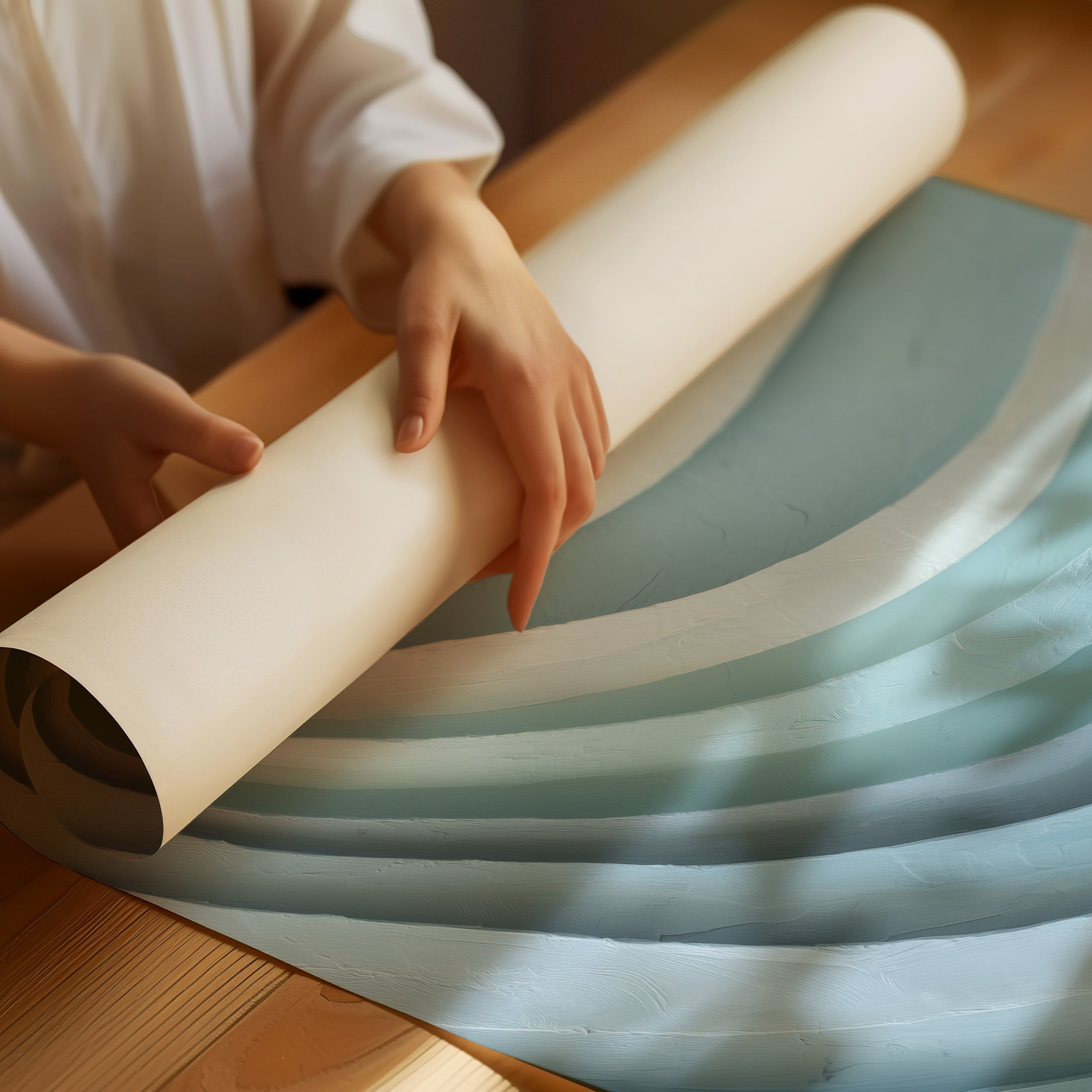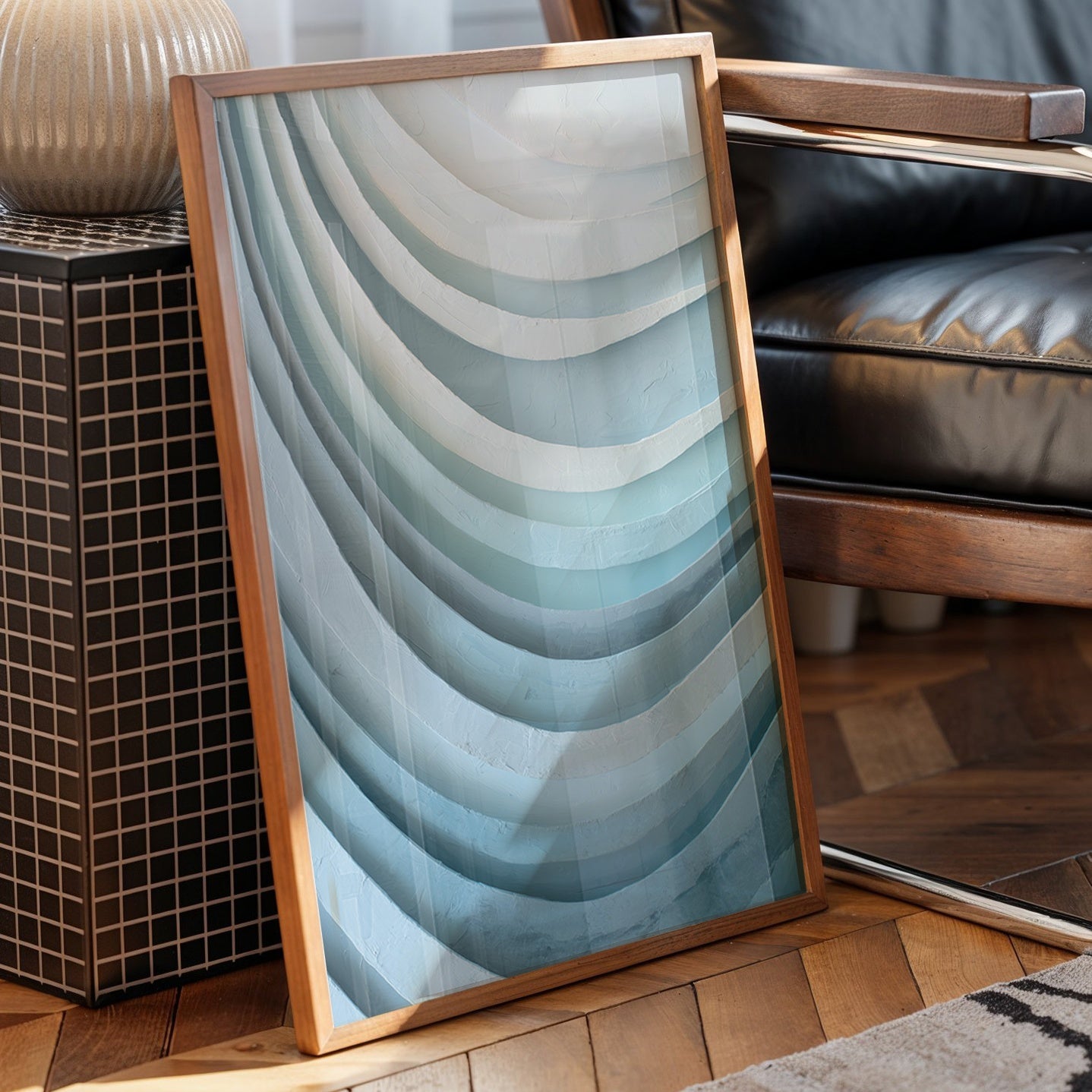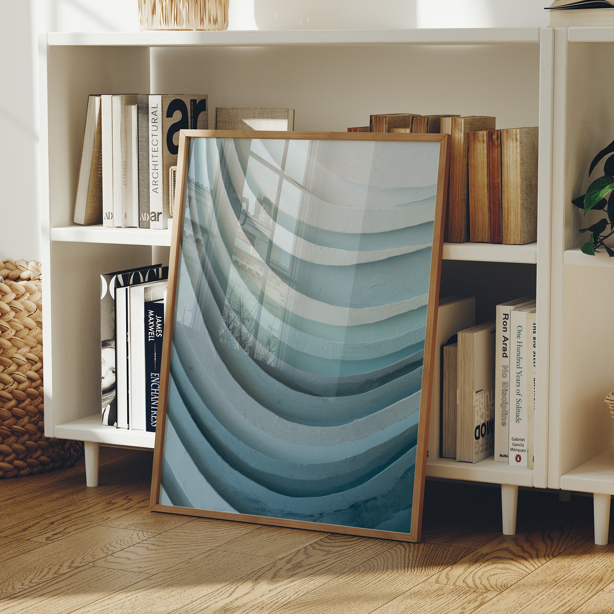 The artwork features elegant curved layers that cascade from pale sea foam at the top to deeper azure below, creating a soothing rhythmic pattern reminiscent of ocean waves or geological formations. The textured surface captures light differently across each curve, enhancing the dimensional quality of this minimalist piece.