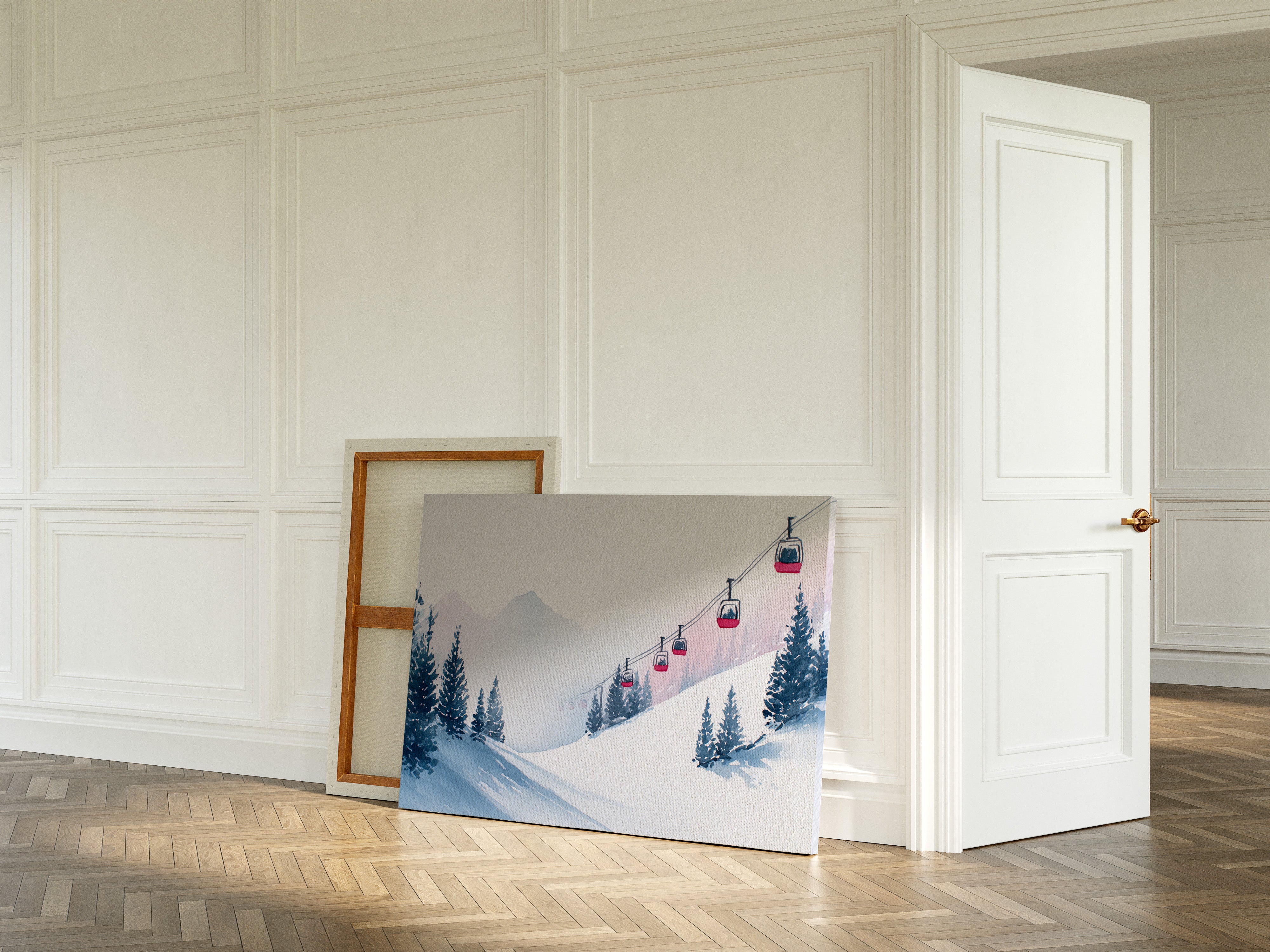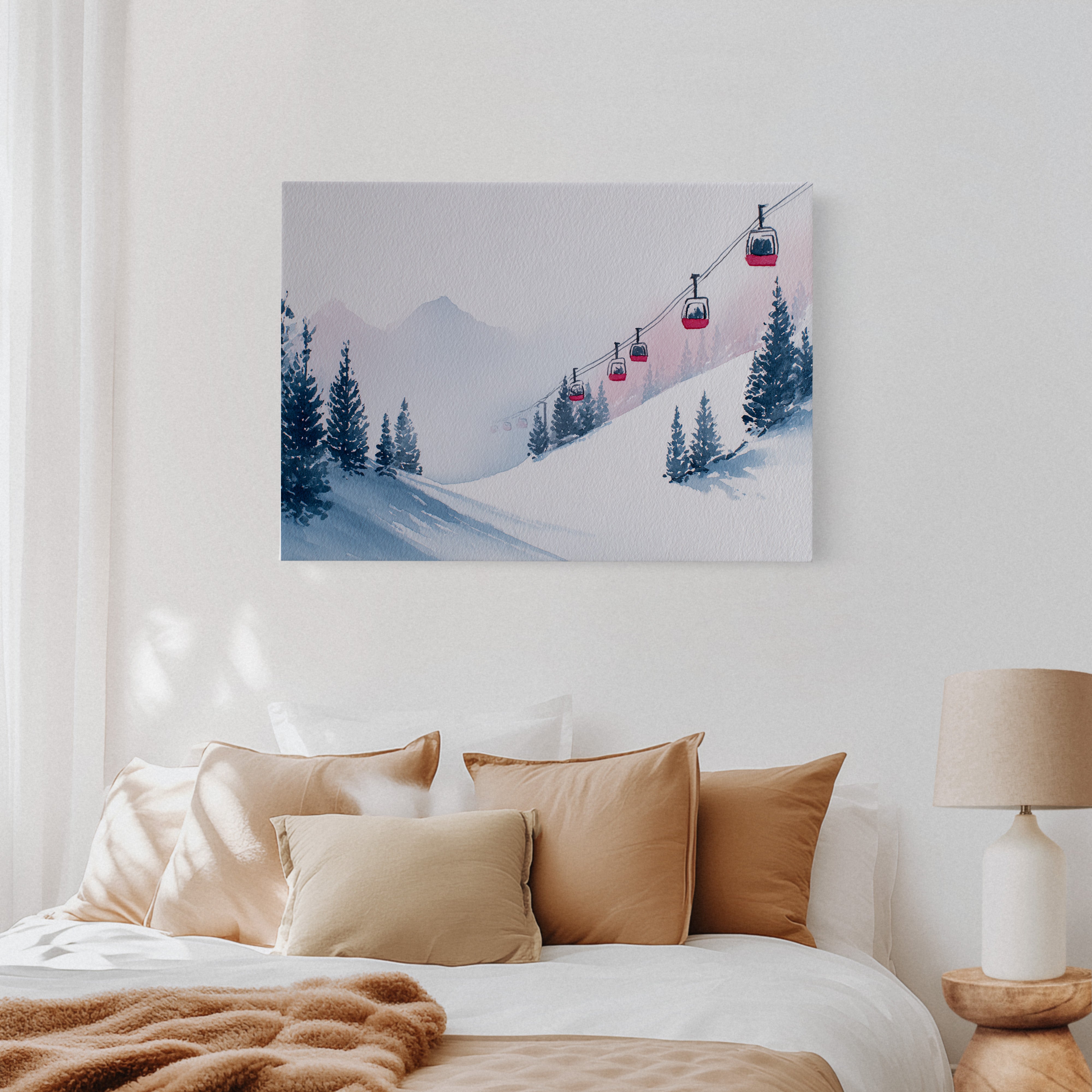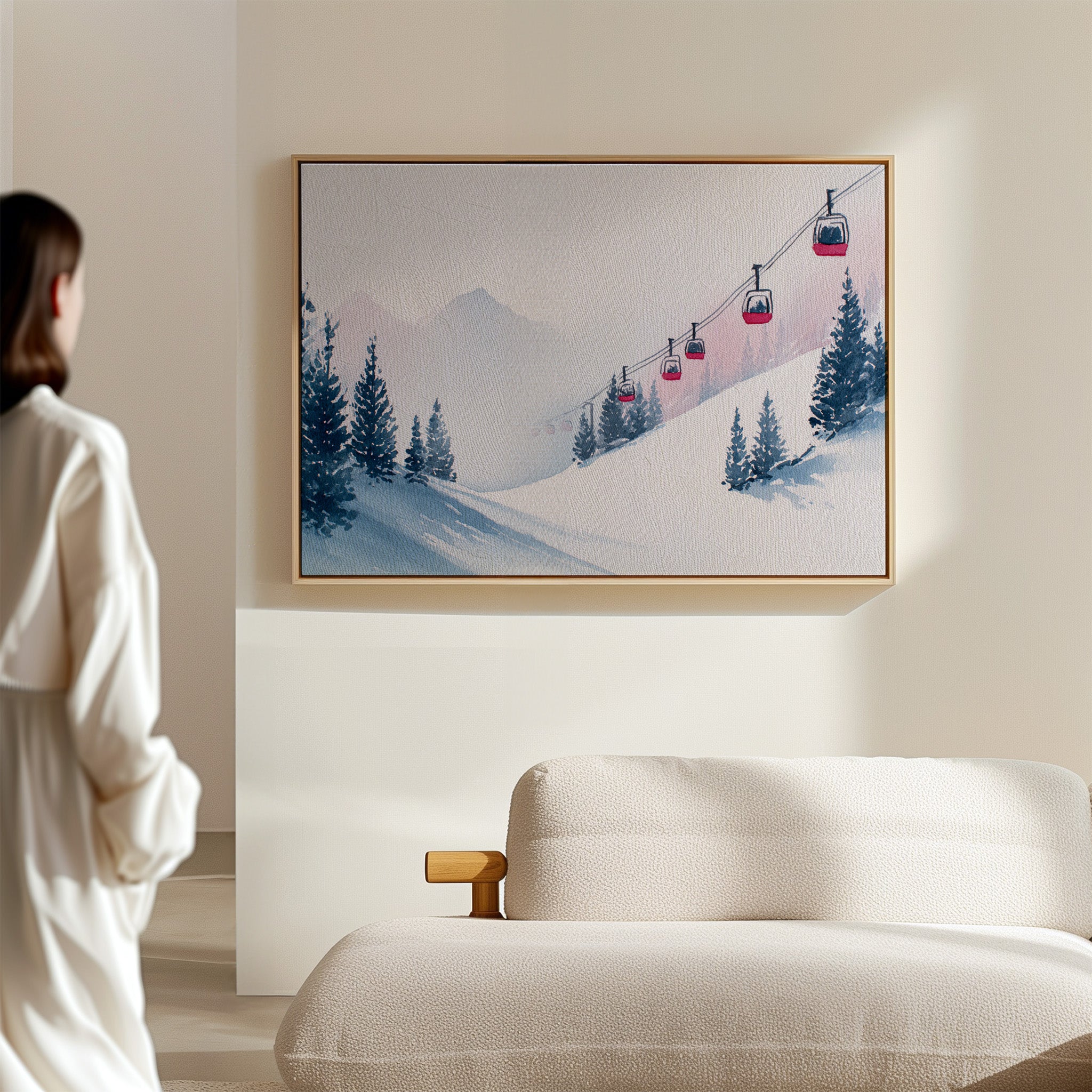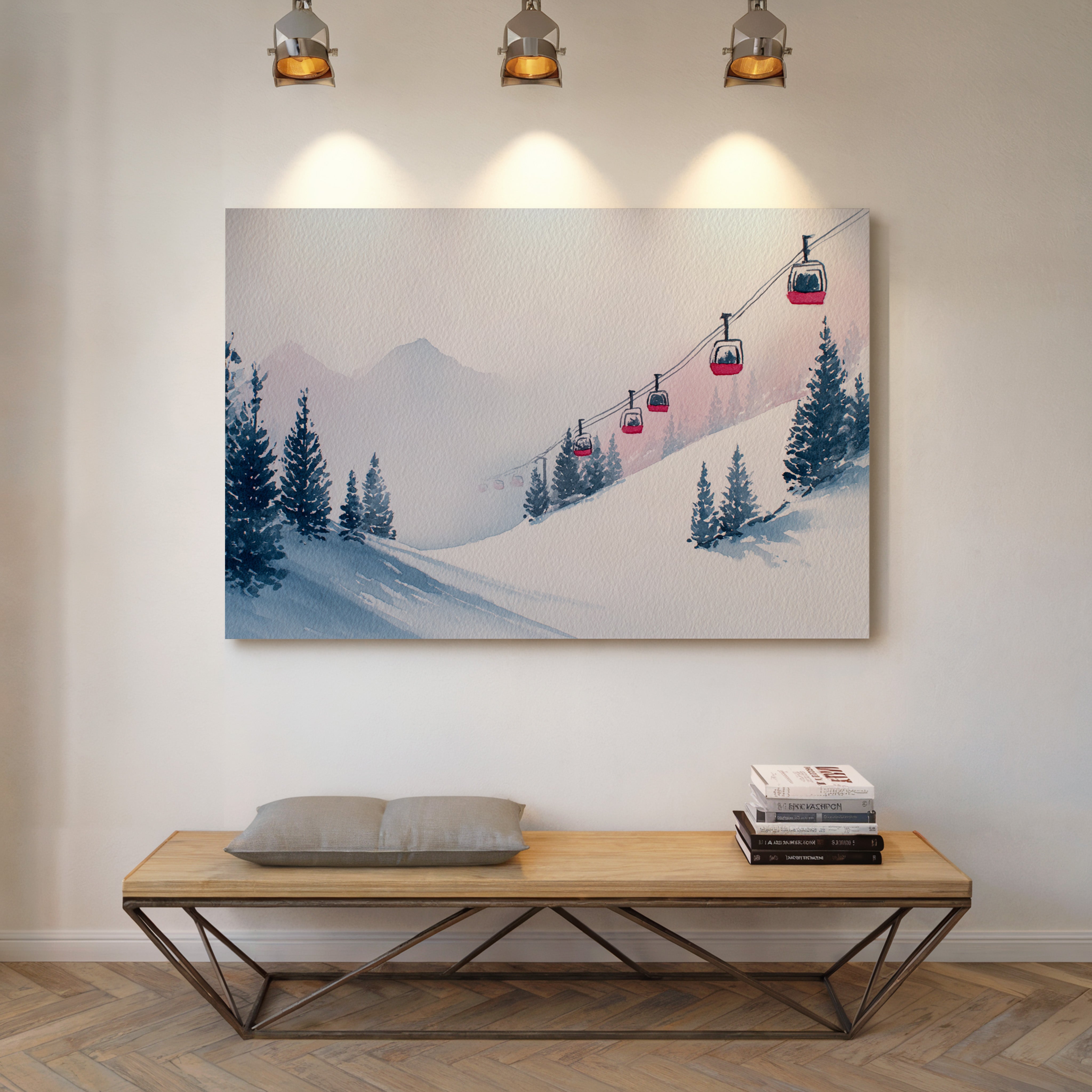 A gentle ascent carries the heart into a realm of tranquility, where snow-kissed peaks emerge from a soft haze. This piece embodies the serene beauty of winter landscapes, inviting contemplation and peace. The delicate interplay of cool blues and muted pinks paints a journey through nature, where each gondola holds stories of adventure and connection, gliding gracefully above a carpet of evergreens. Ideal for a cozy retreat or a tranquil reading nook, this piece brings the essence of alpine serenity to your space.