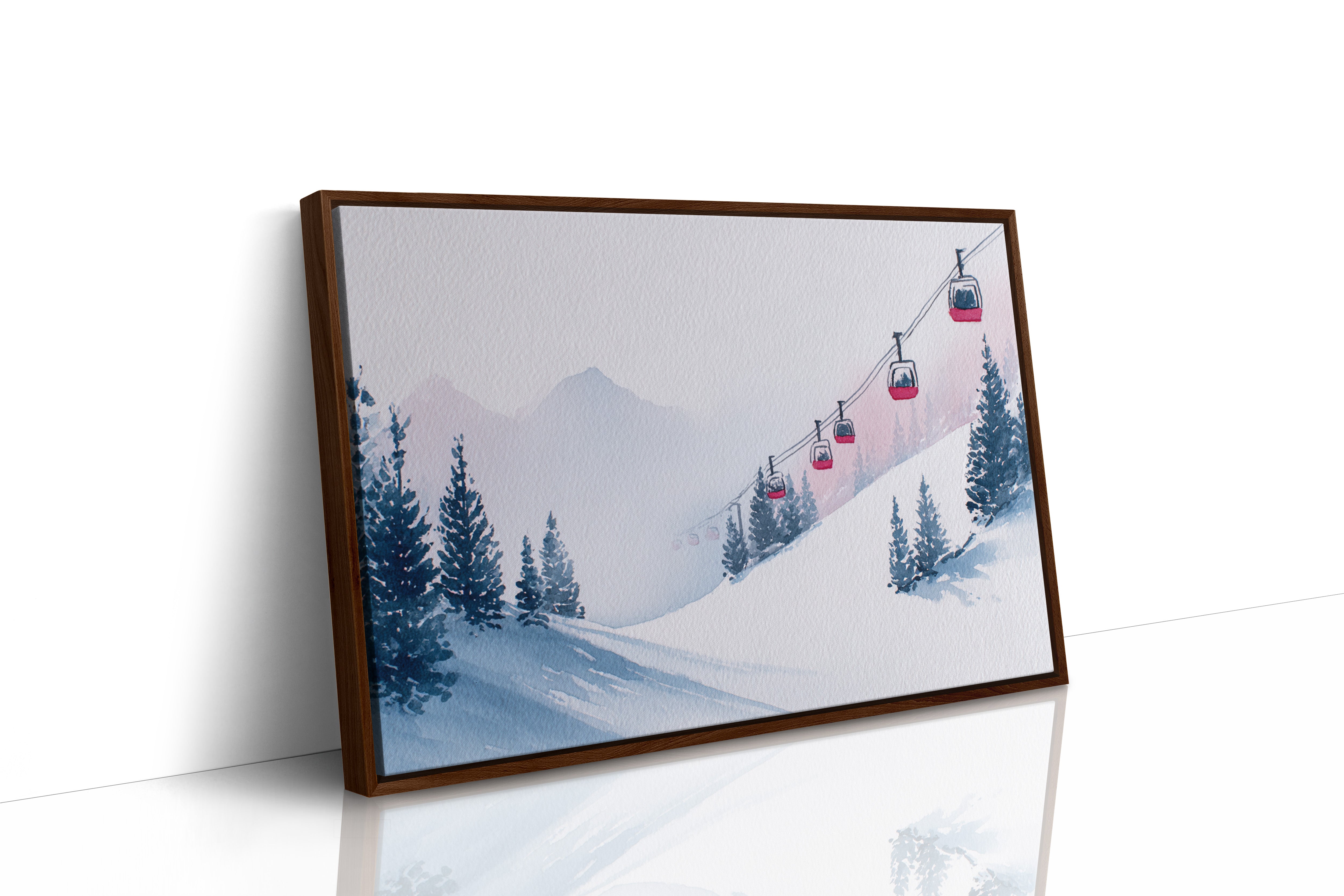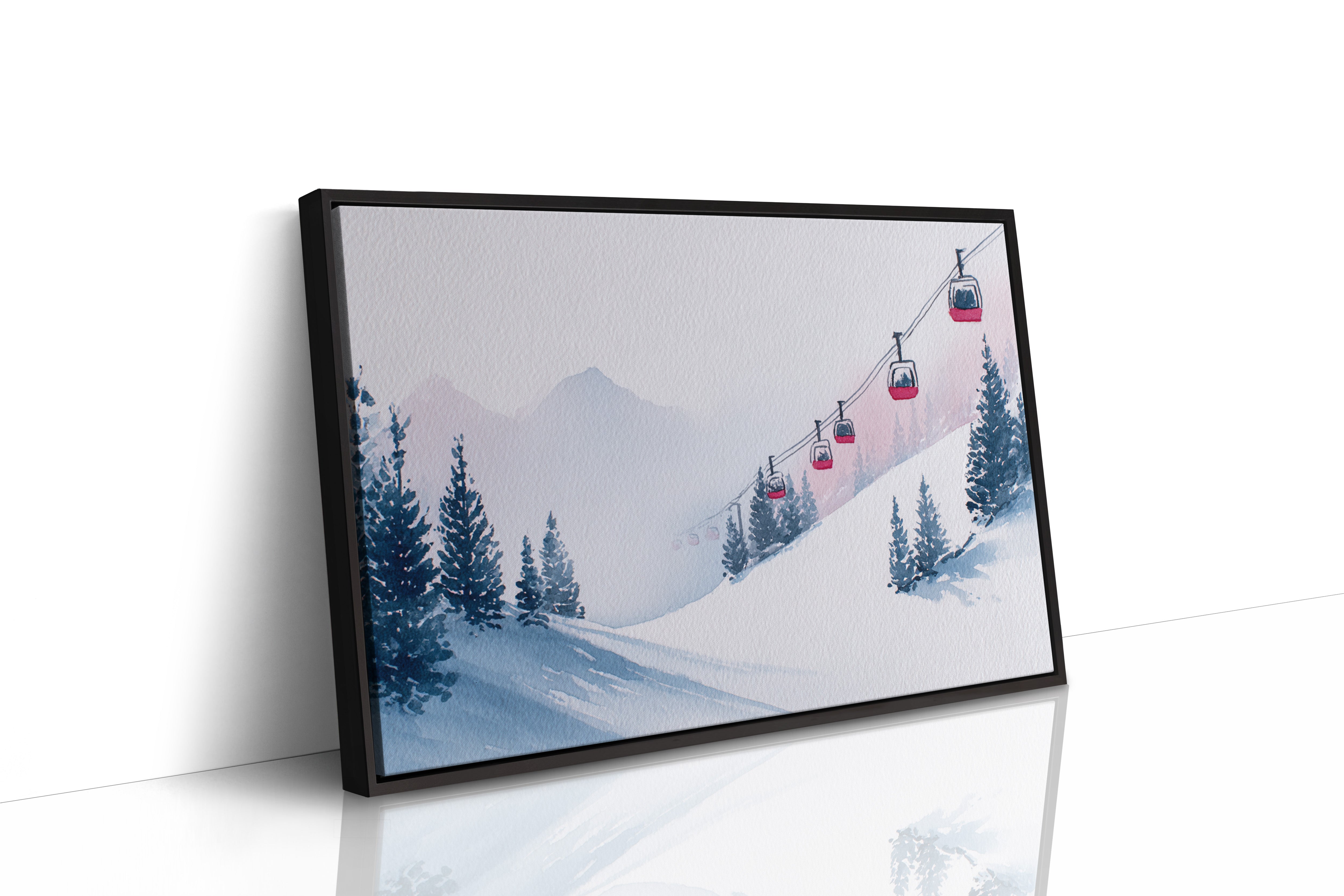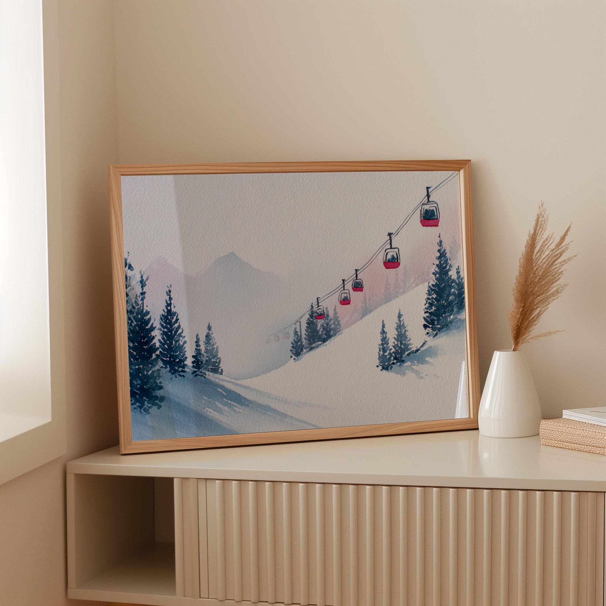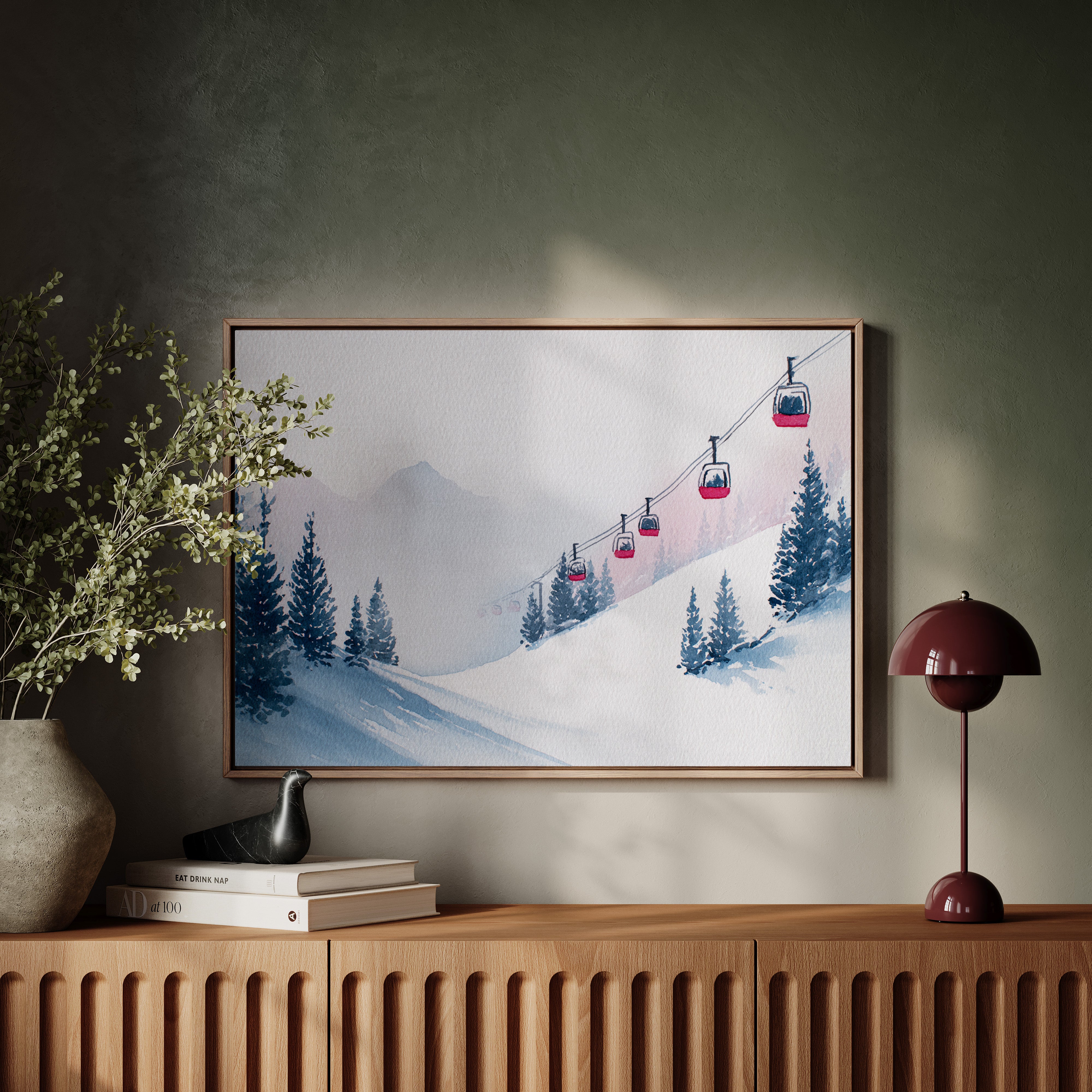 A gentle ascent carries the heart into a realm of tranquility, where snow-kissed peaks emerge from a soft haze. This piece embodies the serene beauty of winter landscapes, inviting contemplation and peace. The delicate interplay of cool blues and muted pinks paints a journey through nature, where each gondola holds stories of adventure and connection, gliding gracefully above a carpet of evergreens. Ideal for a cozy retreat or a tranquil reading nook, this piece brings the essence of alpine serenity to your space.
