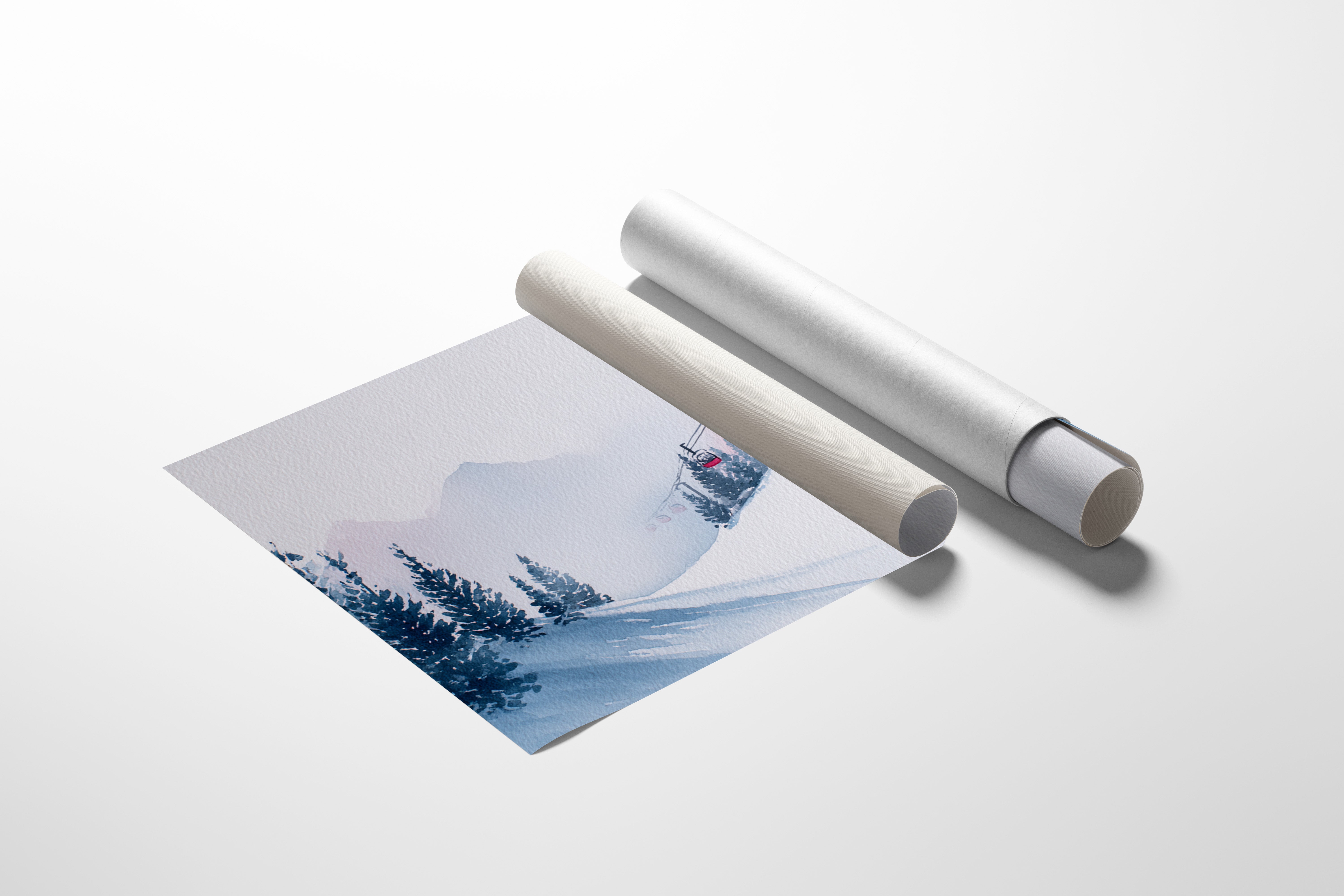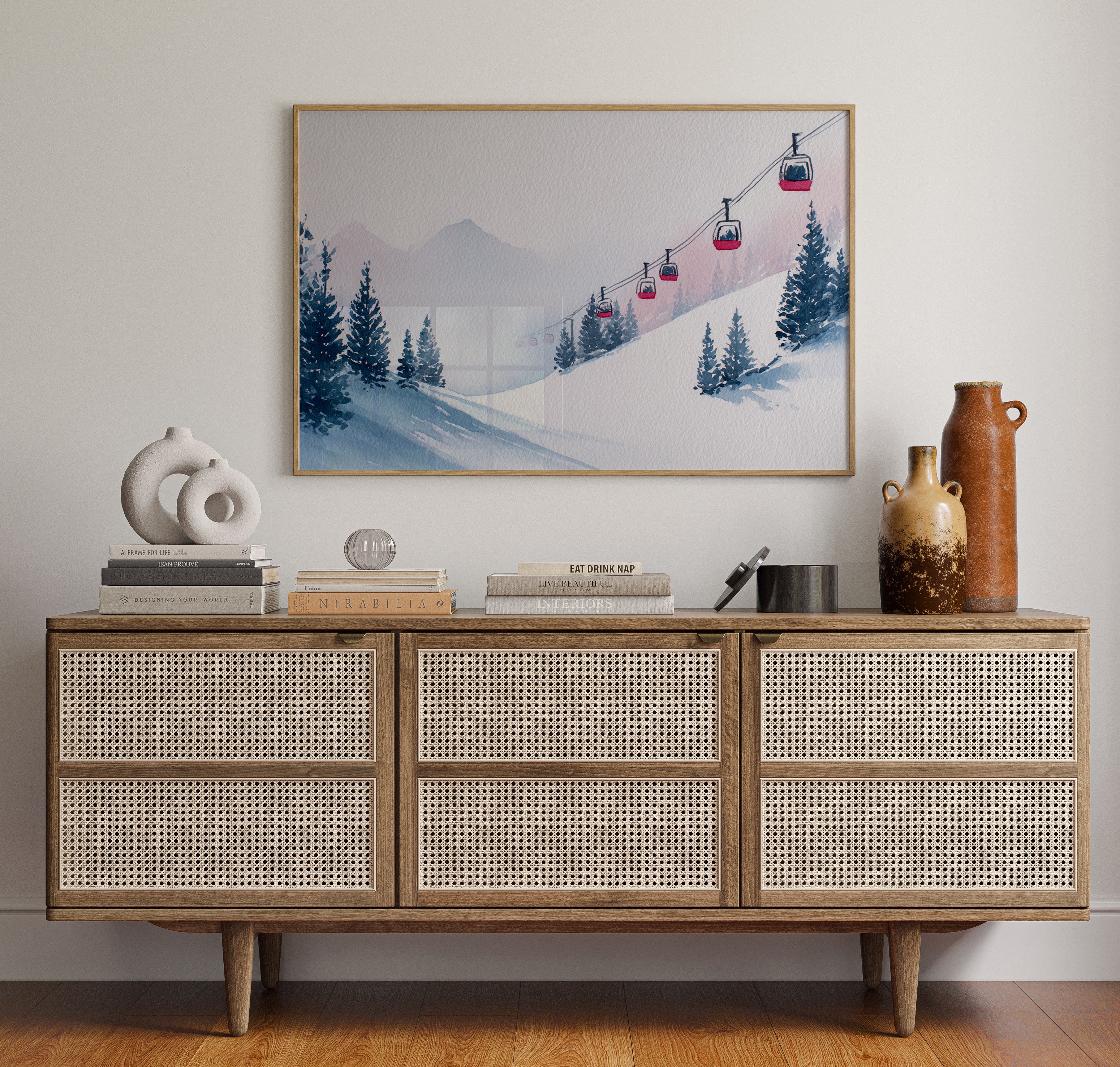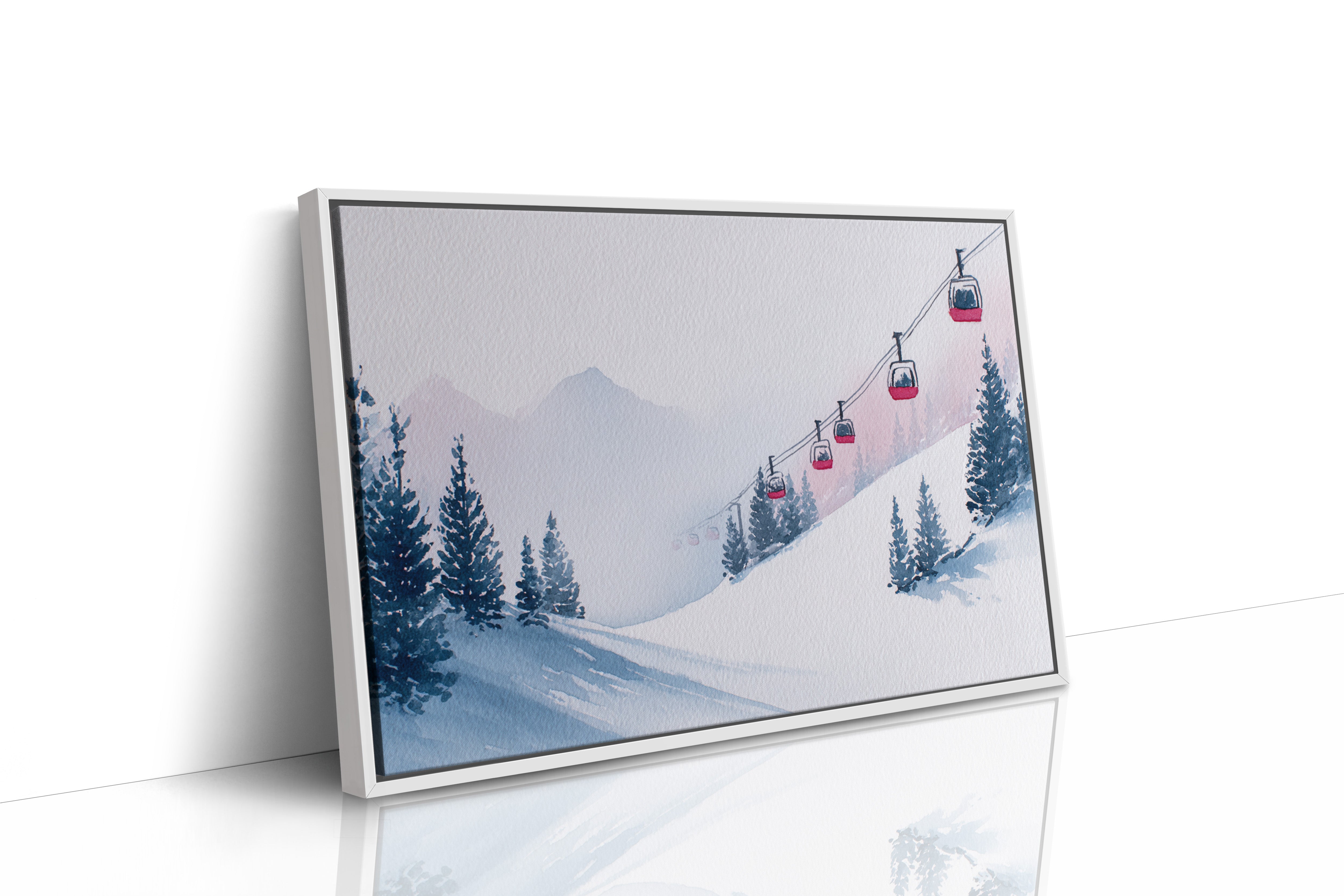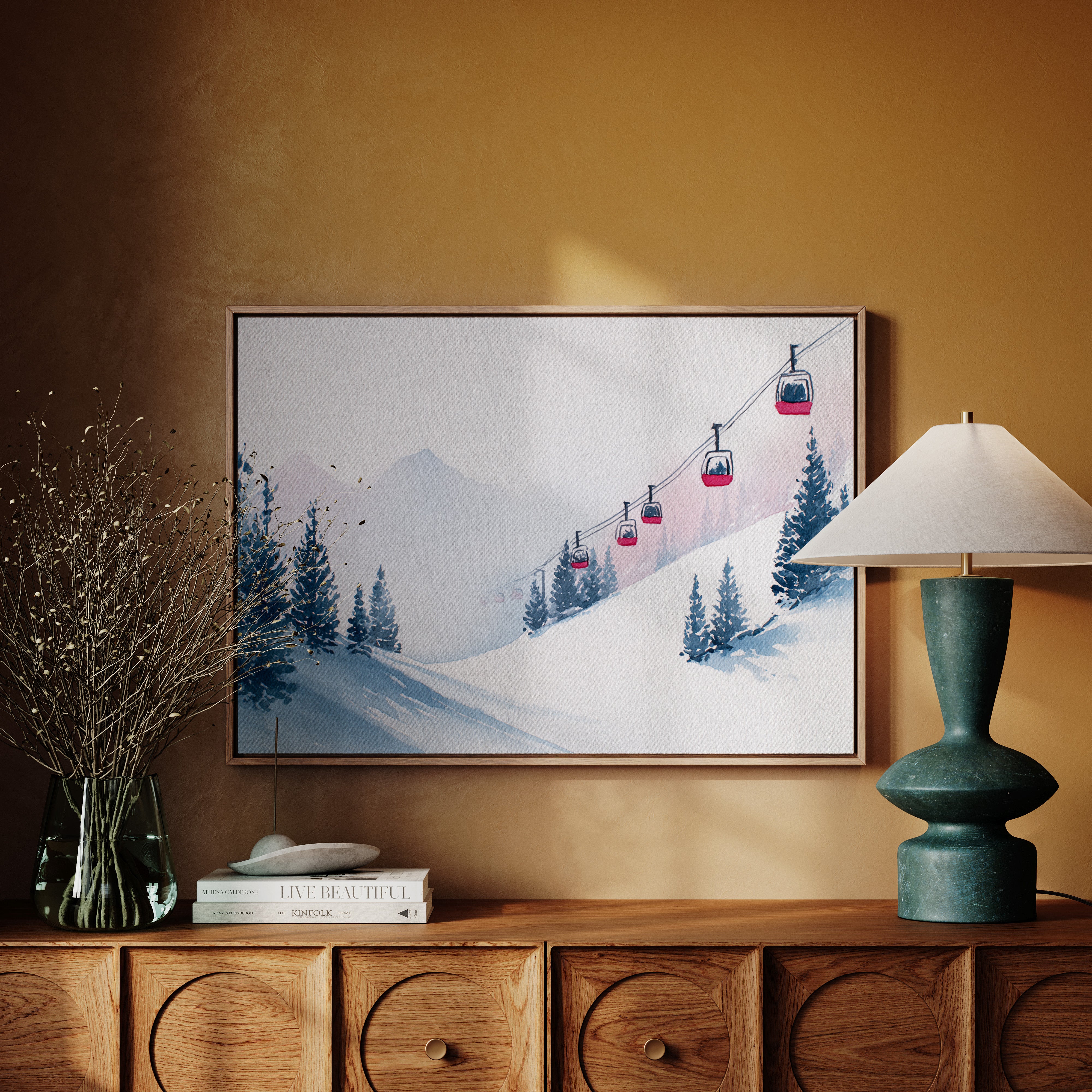 A gentle ascent carries the heart into a realm of tranquility, where snow-kissed peaks emerge from a soft haze. This piece embodies the serene beauty of winter landscapes, inviting contemplation and peace. The delicate interplay of cool blues and muted pinks paints a journey through nature, where each gondola holds stories of adventure and connection, gliding gracefully above a carpet of evergreens. Ideal for a cozy retreat or a tranquil reading nook, this piece brings the essence of alpine serenity to your space.