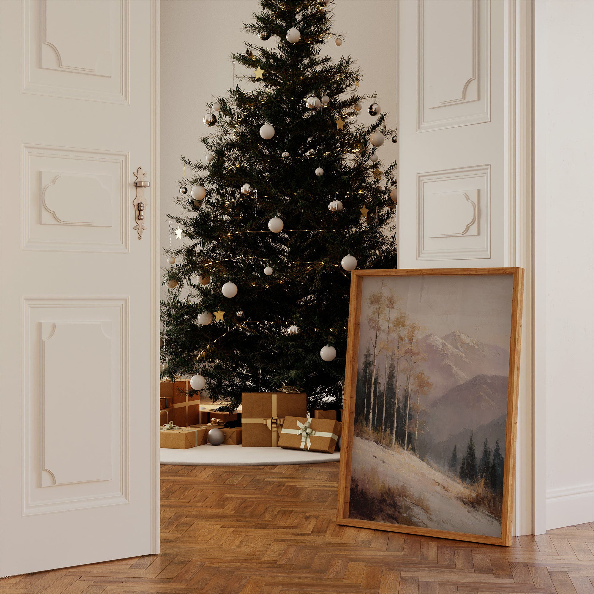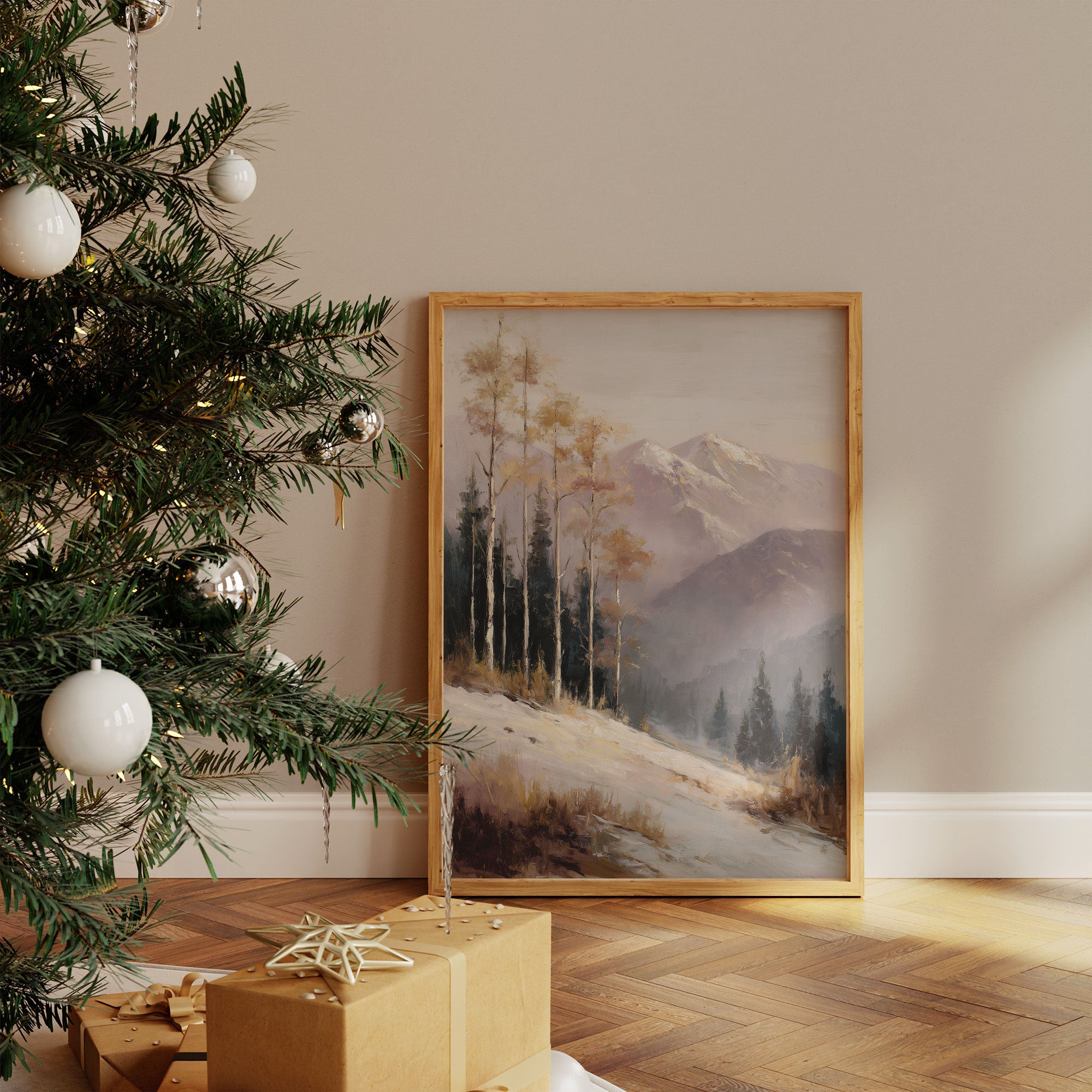 Soft winter light streams through sheer curtains, casting gentle shadows across a serene corner where nature's artistry meets festive warmth. A landscape painting captures the majesty of snow-dusted mountains and golden aspens, while a luminous white Christmas tree stands sentinel nearby. The scene unfolds in perfect harmony - wooden elements, neutral tones, and clean lines creating a sophisticated dialogue between outdoor grandeur and indoor comfort. This thoughtful arrangement transforms an everyday space into a contemplative nook where mountain dreams and holiday magic intertwine. Perfect for modern homes seeking to blend Scandinavian simplicity with seasonal charm.