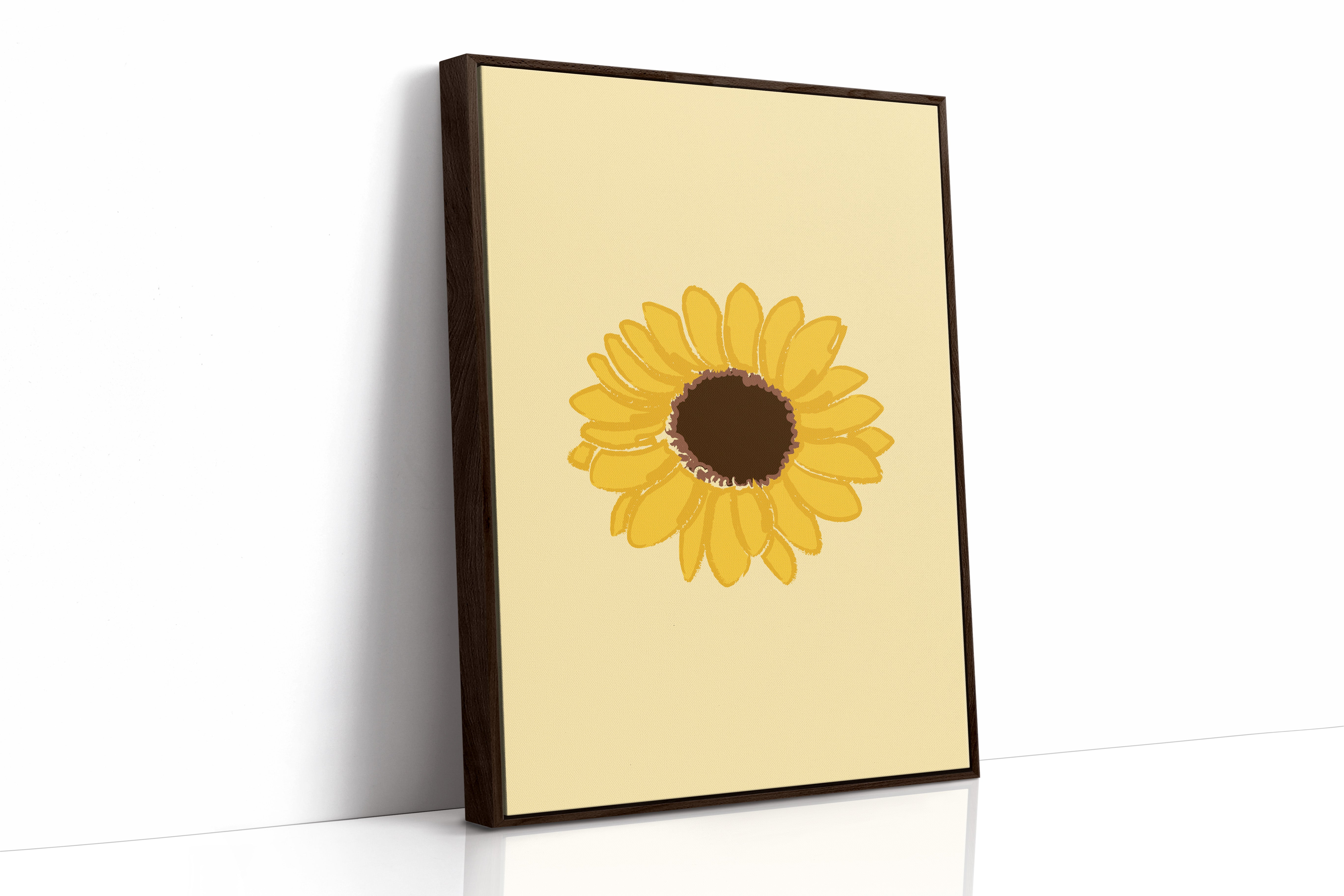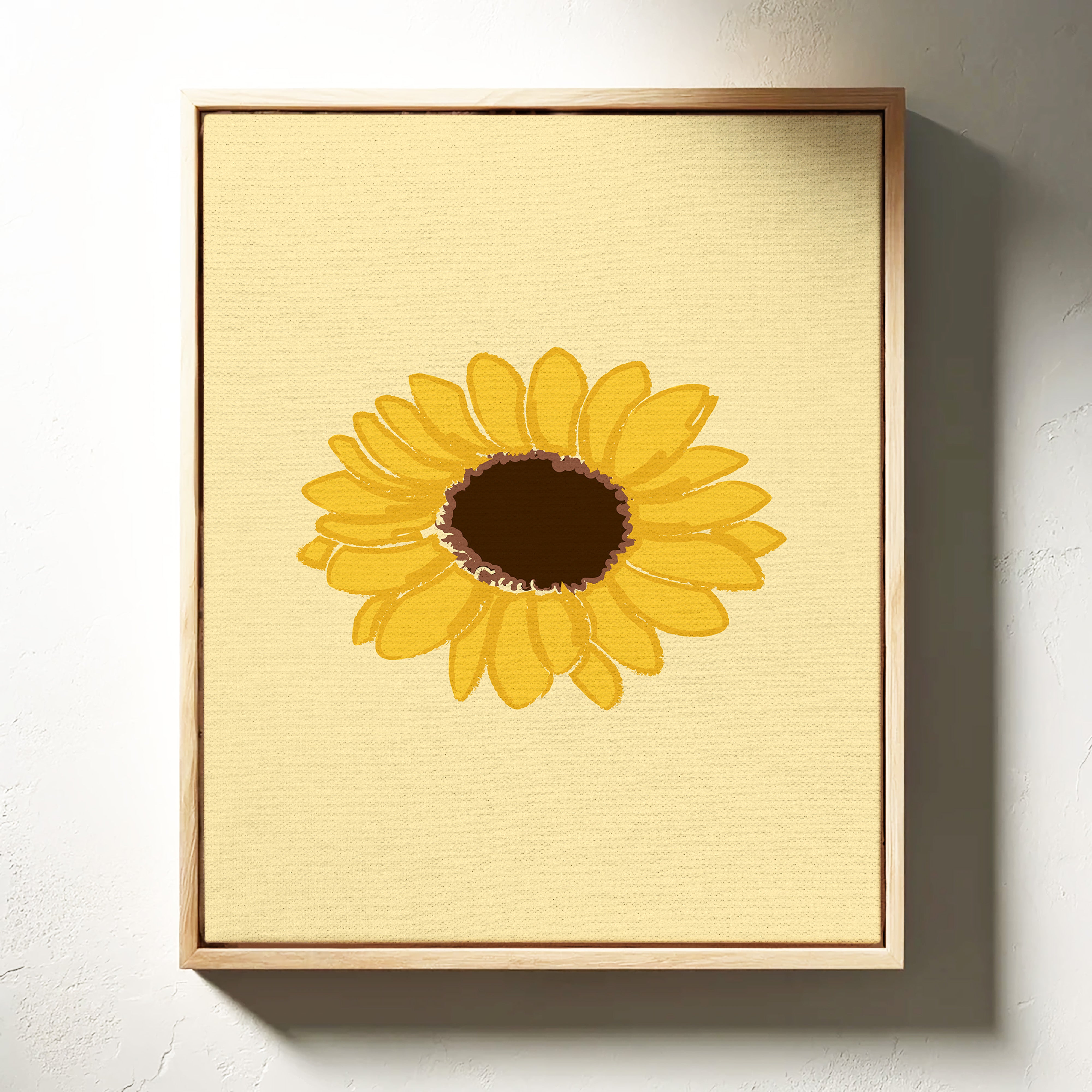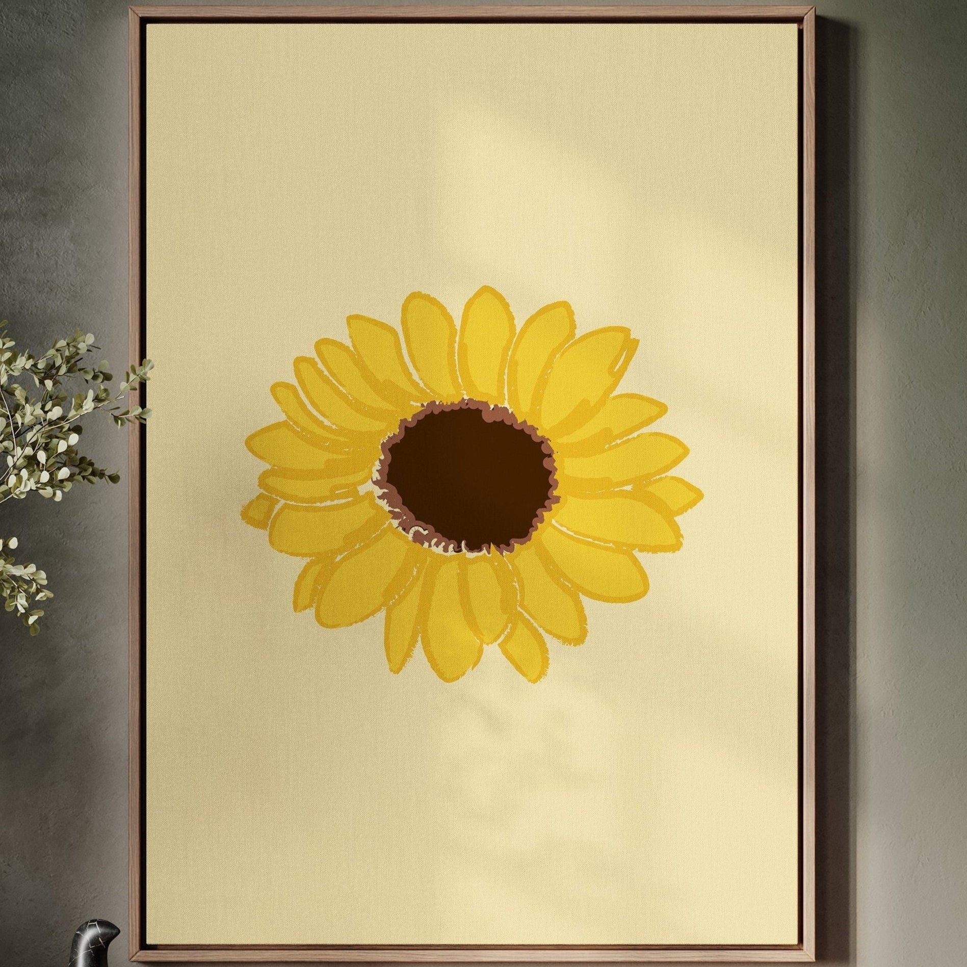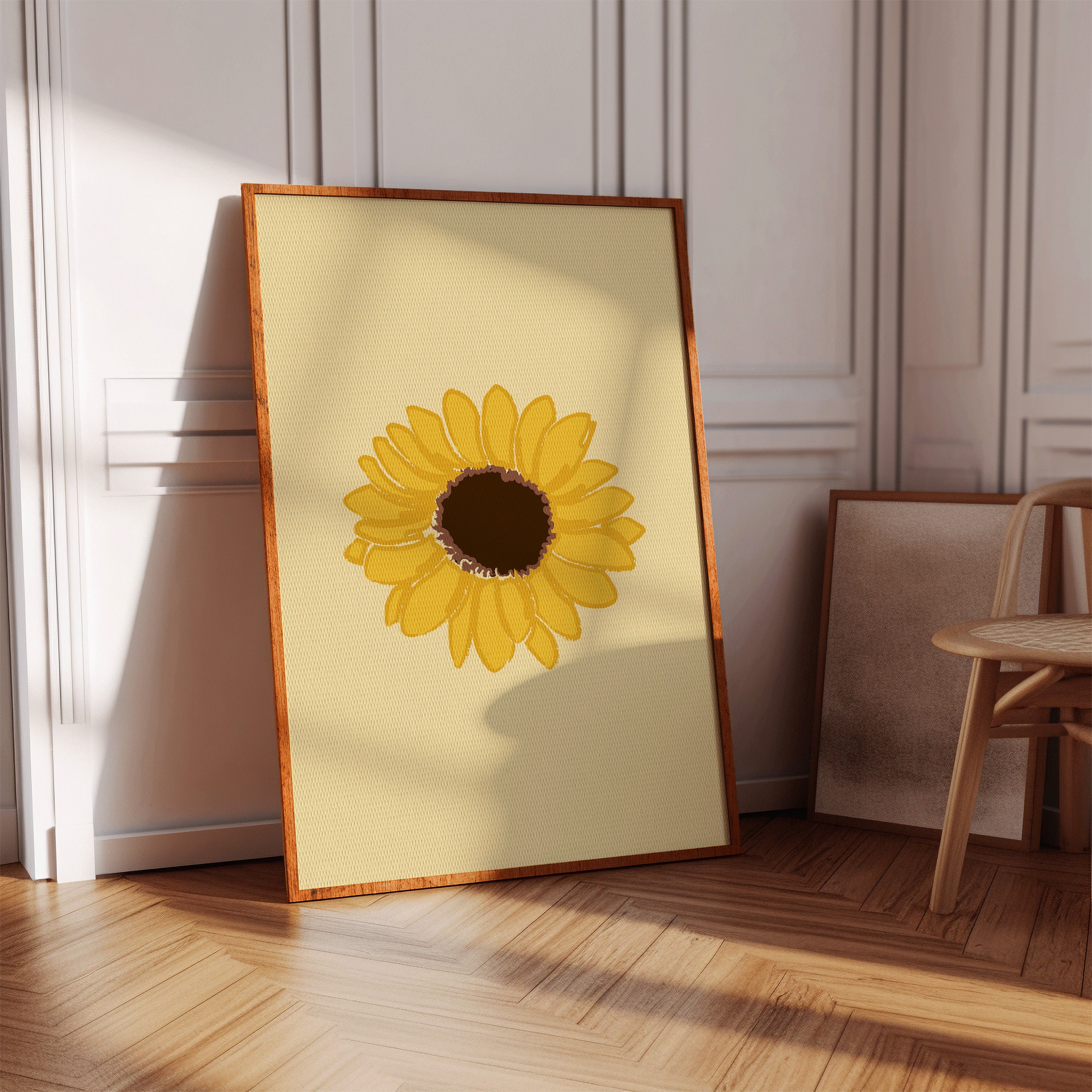 A single sunflower radiates warmth against a gentle cream backdrop, its petals unfurling like rays of captured sunshine. This piece exemplifies the clean minimalism of modern botanical illustration. The bold yellow petals create a perfect circular dance around the rich brown center, while the subtle texture in the brushstrokes adds an organic, handcrafted quality to the simplified form. Each petal seems to tell its own story of summer's abundance and nature's mathematical precision. This statement piece brings instant cheer to kitchen spaces, breakfast nooks, or any room needing a touch of perpetual sunshine. Its timeless simplicity allows it to harmonize beautifully with both modern and farmhouse interiors.