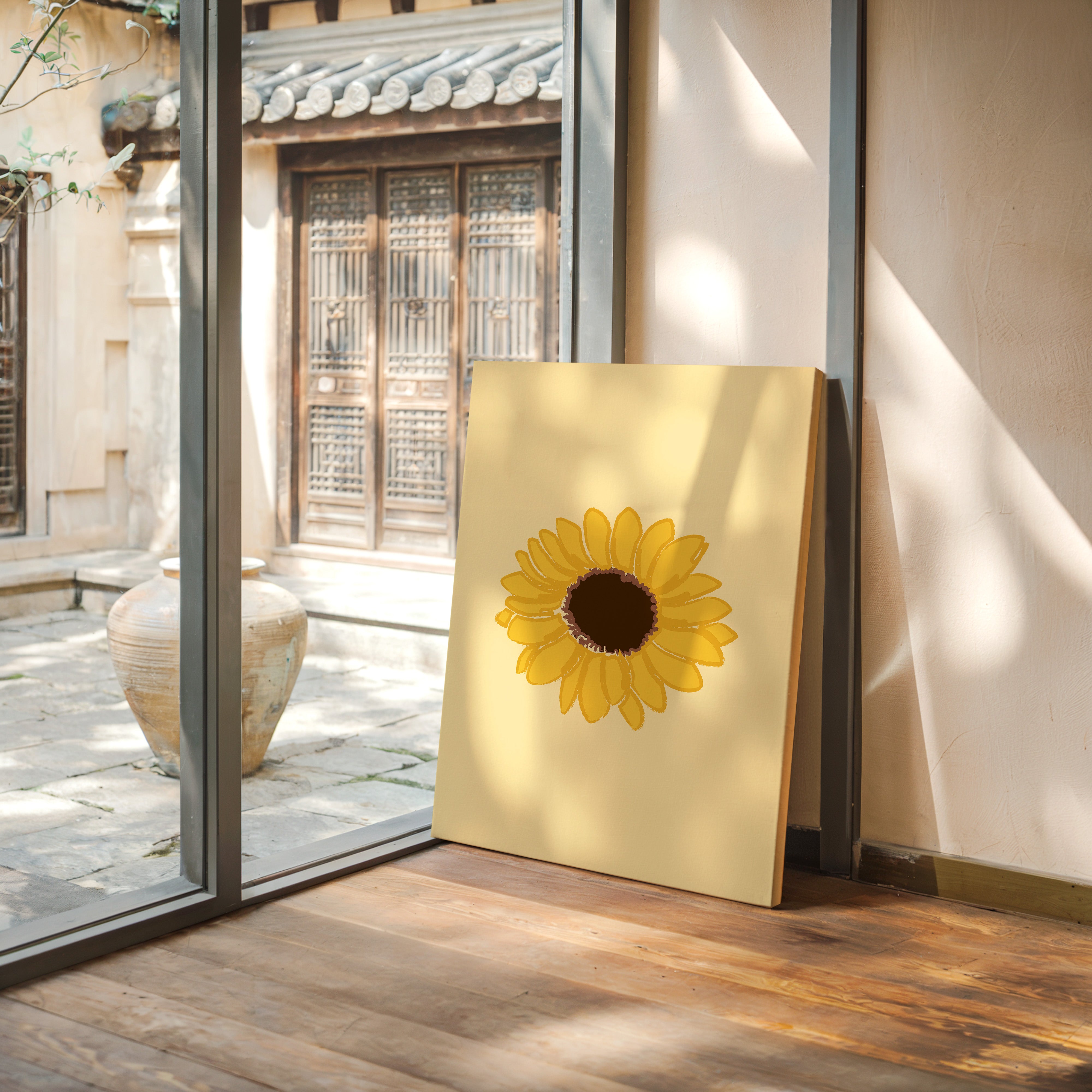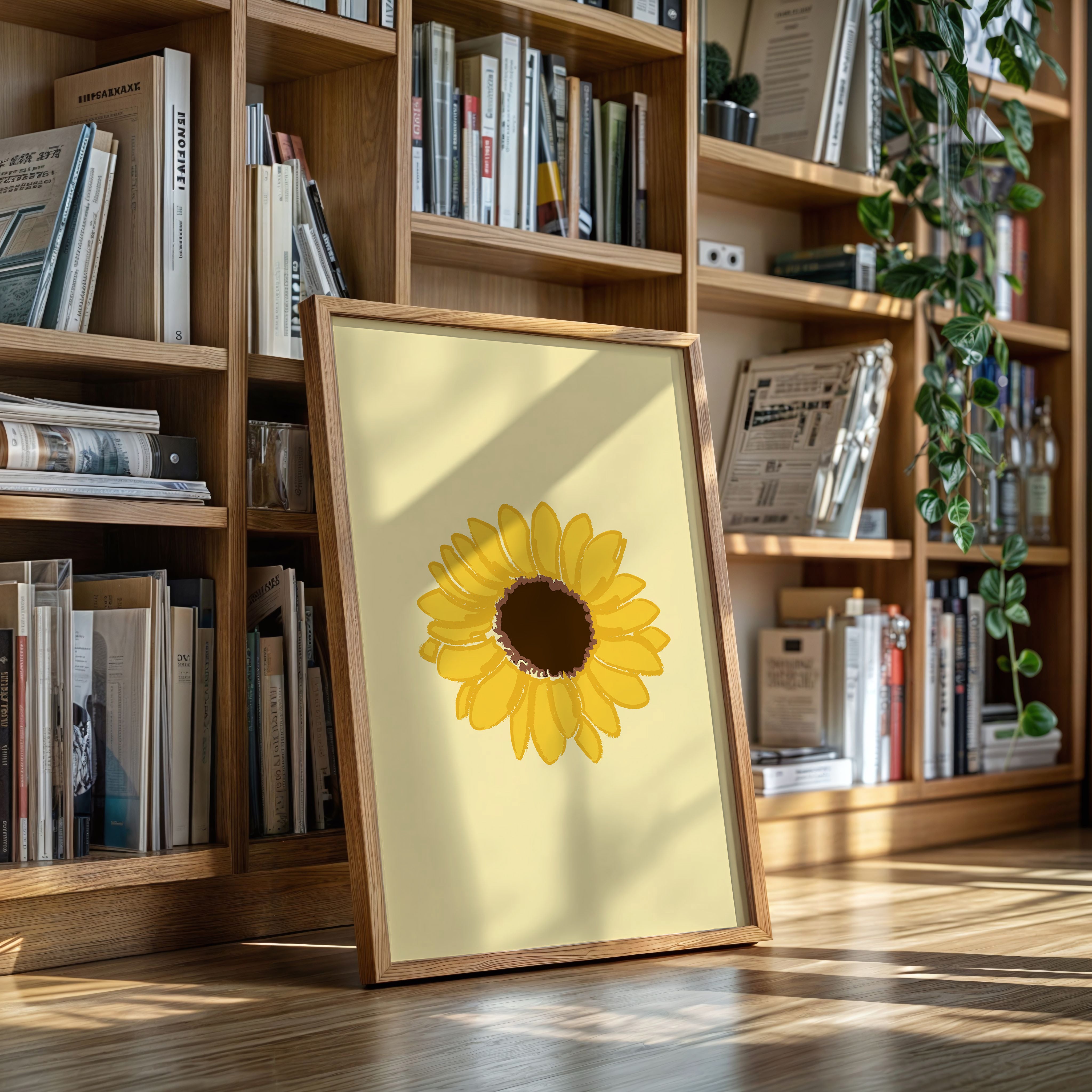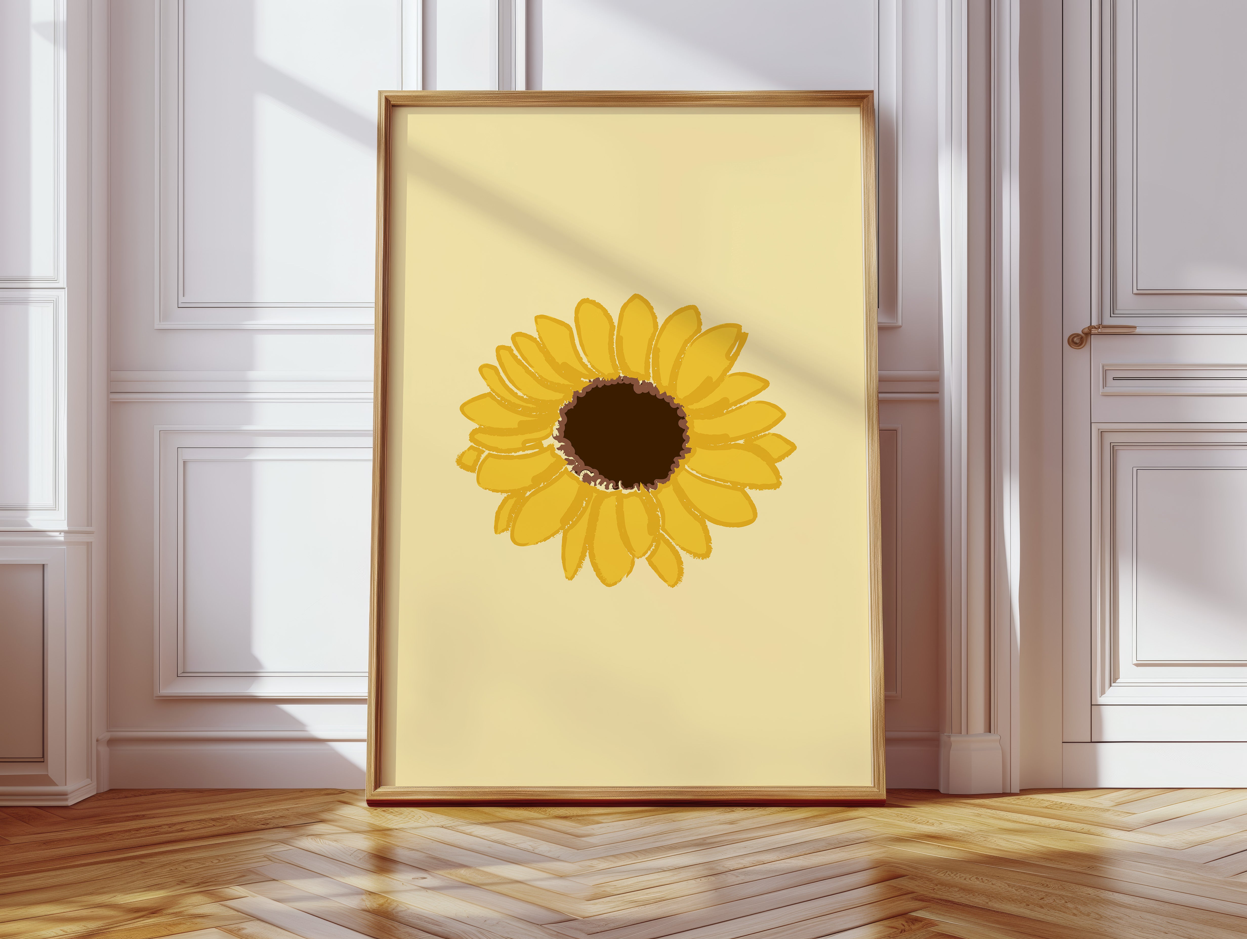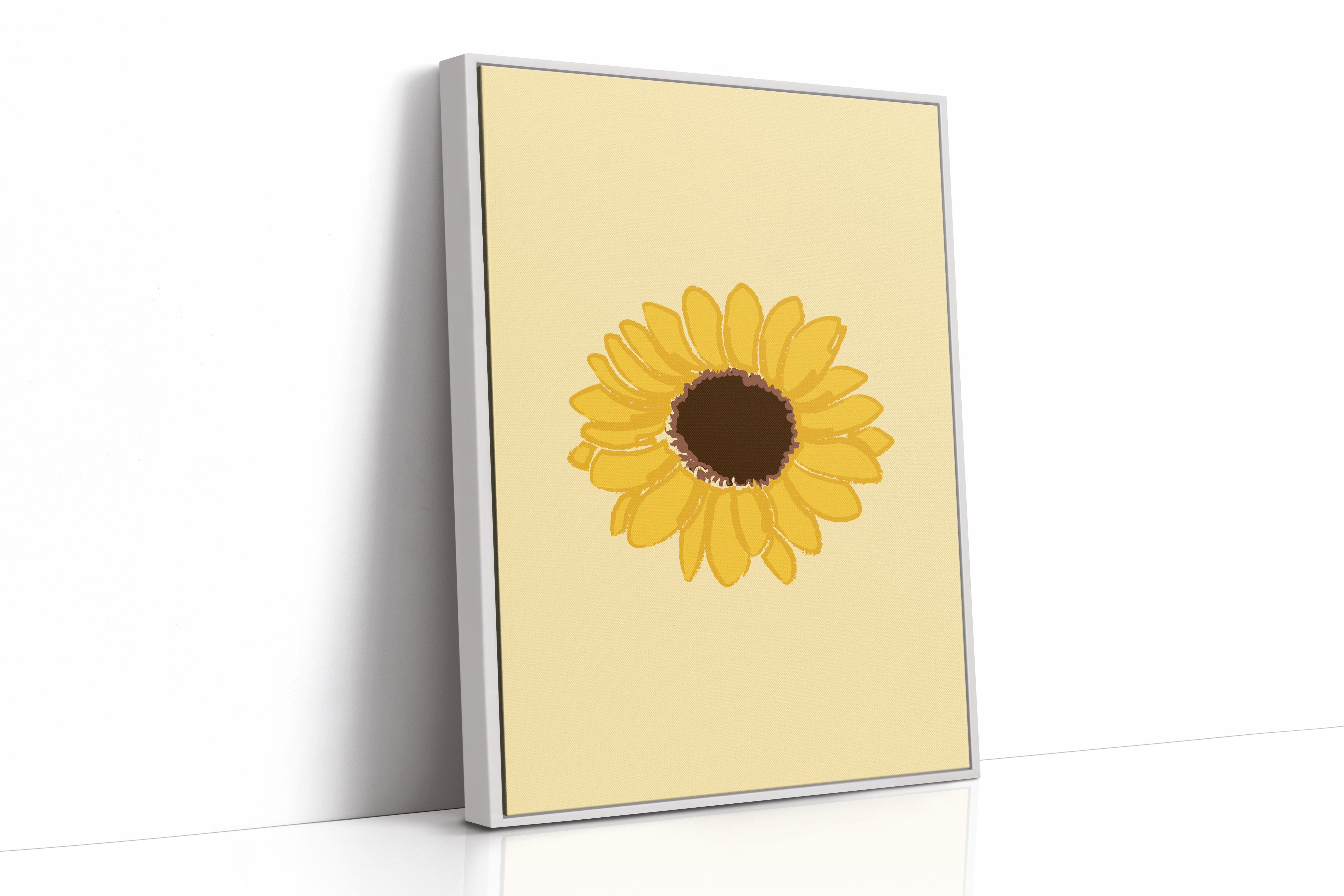 A single sunflower radiates warmth against a gentle cream backdrop, its petals unfurling like rays of captured sunshine. This piece exemplifies the clean minimalism of modern botanical illustration. The bold yellow petals create a perfect circular dance around the rich brown center, while the subtle texture in the brushstrokes adds an organic, handcrafted quality to the simplified form. Each petal seems to tell its own story of summer's abundance and nature's mathematical precision. This statement piece brings instant cheer to kitchen spaces, breakfast nooks, or any room needing a touch of perpetual sunshine. Its timeless simplicity allows it to harmonize beautifully with both modern and farmhouse interiors.