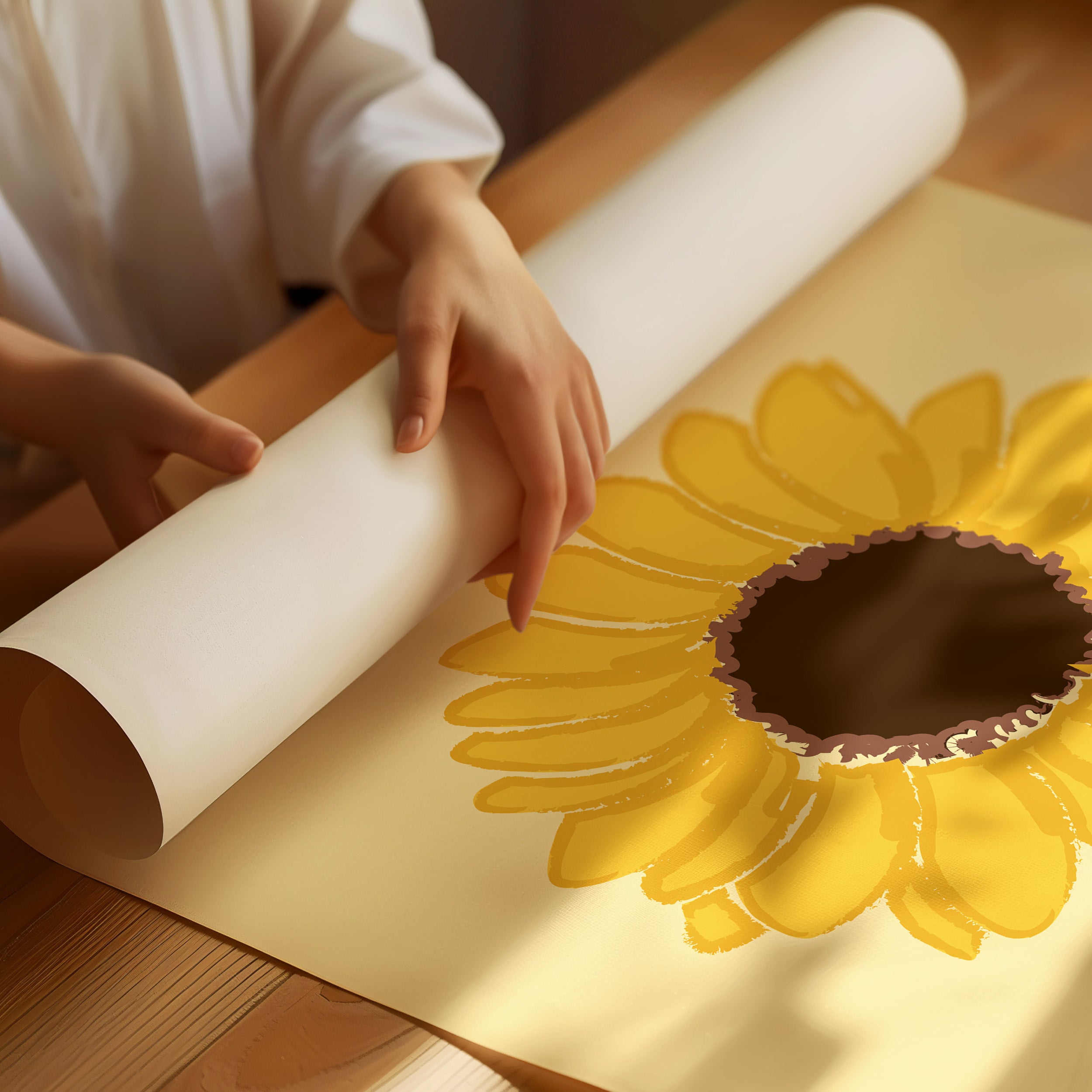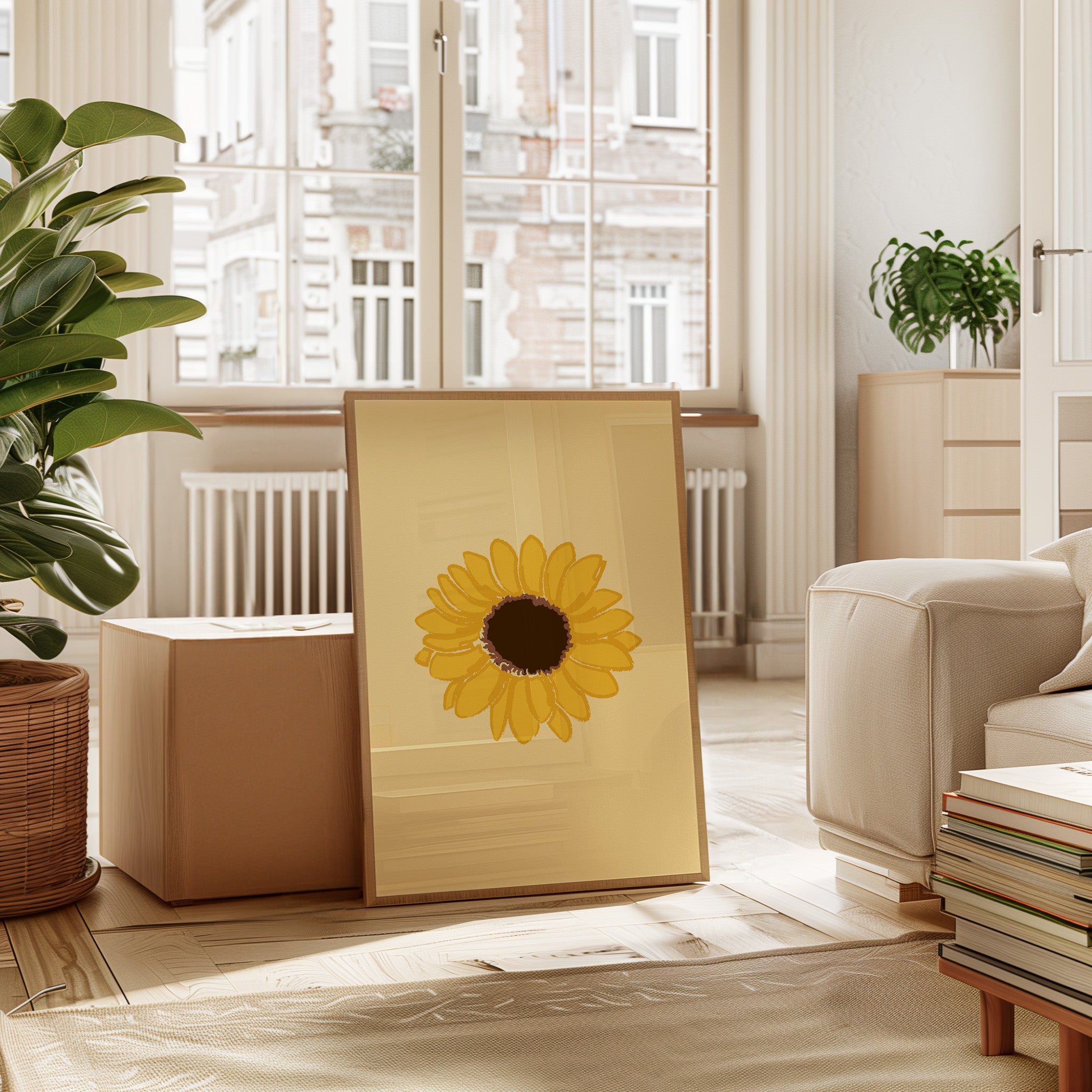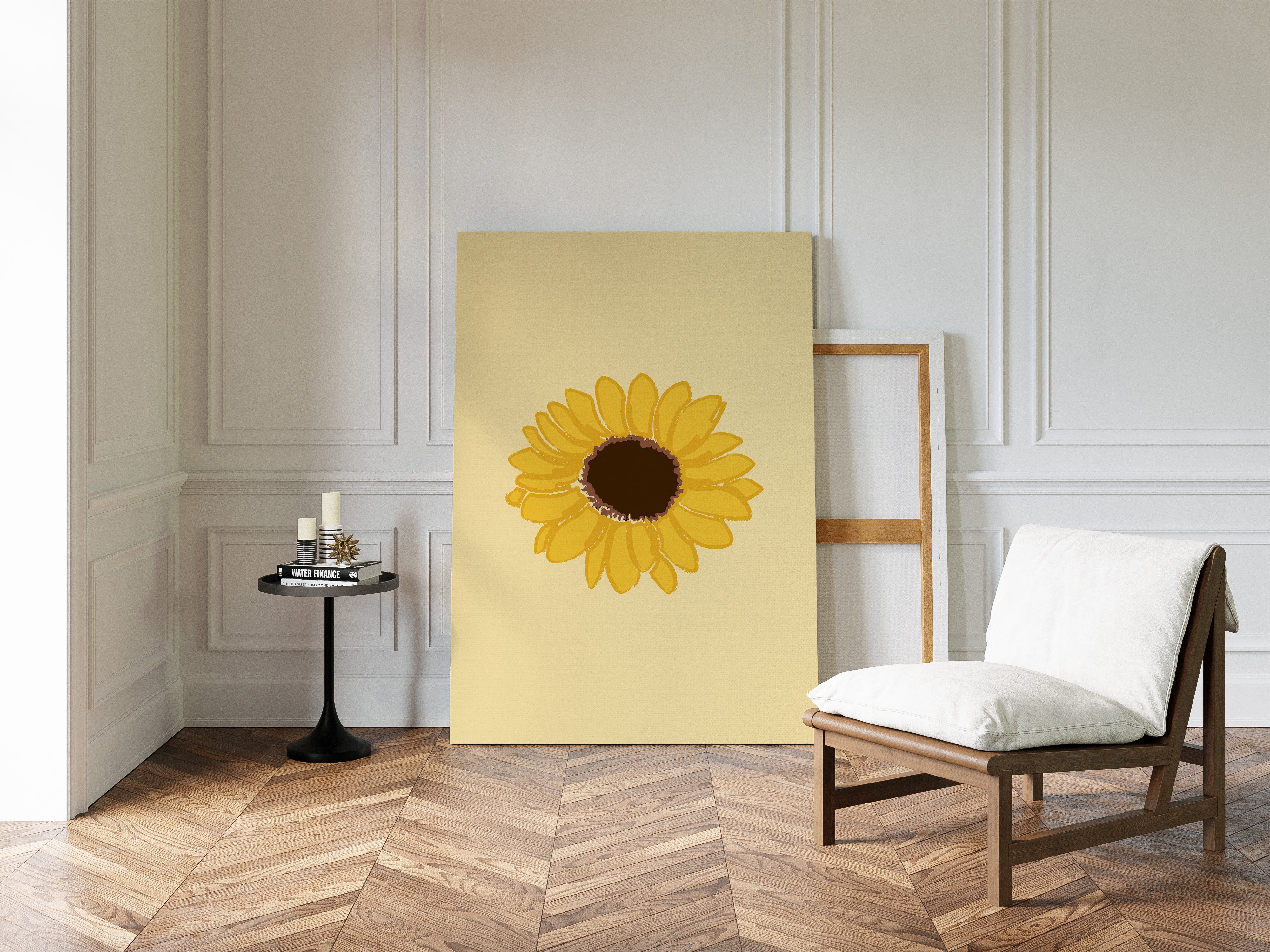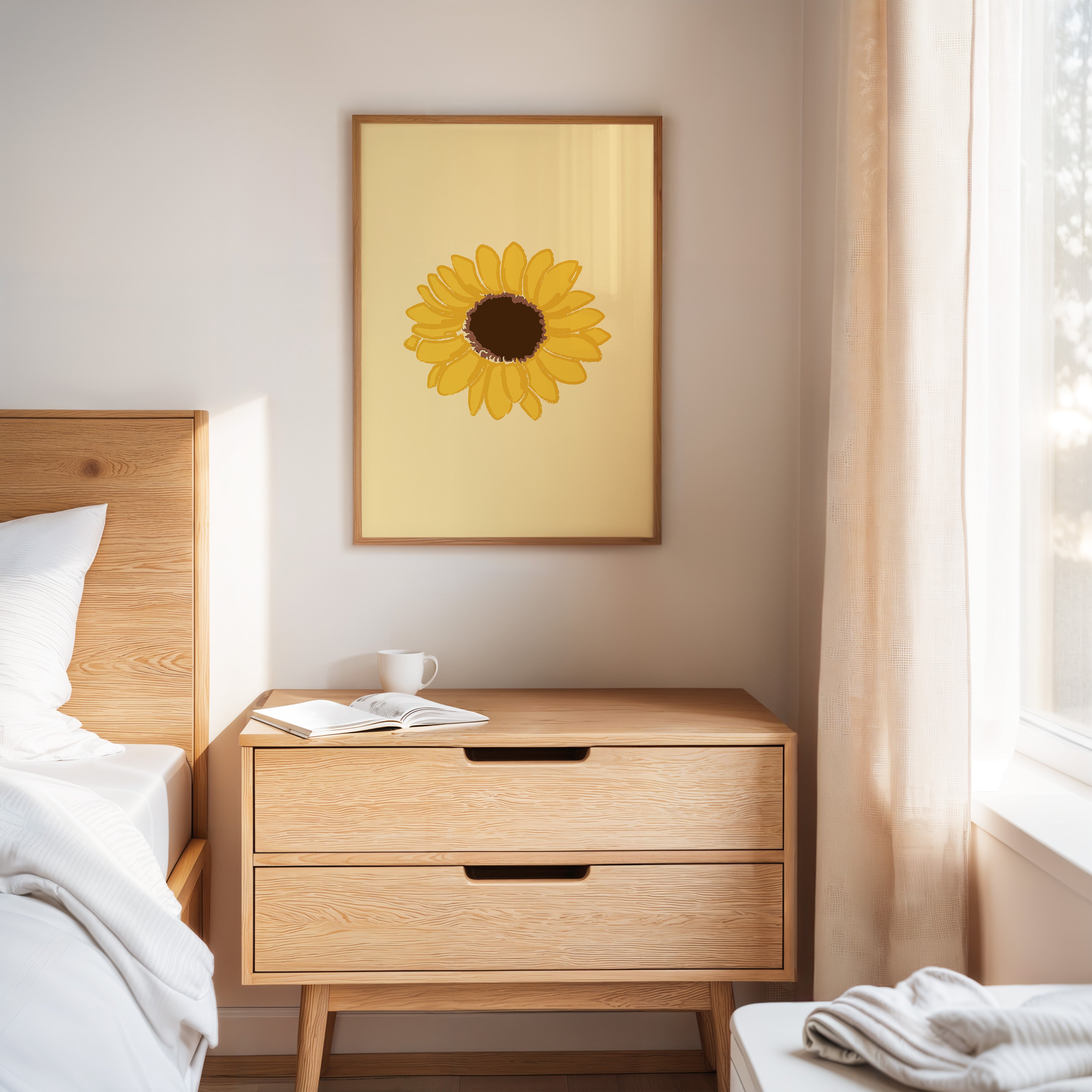 A single sunflower radiates warmth against a gentle cream backdrop, its petals unfurling like rays of captured sunshine. This piece exemplifies the clean minimalism of modern botanical illustration. The bold yellow petals create a perfect circular dance around the rich brown center, while the subtle texture in the brushstrokes adds an organic, handcrafted quality to the simplified form. Each petal seems to tell its own story of summer's abundance and nature's mathematical precision. This statement piece brings instant cheer to kitchen spaces, breakfast nooks, or any room needing a touch of perpetual sunshine. Its timeless simplicity allows it to harmonize beautifully with both modern and farmhouse interiors.