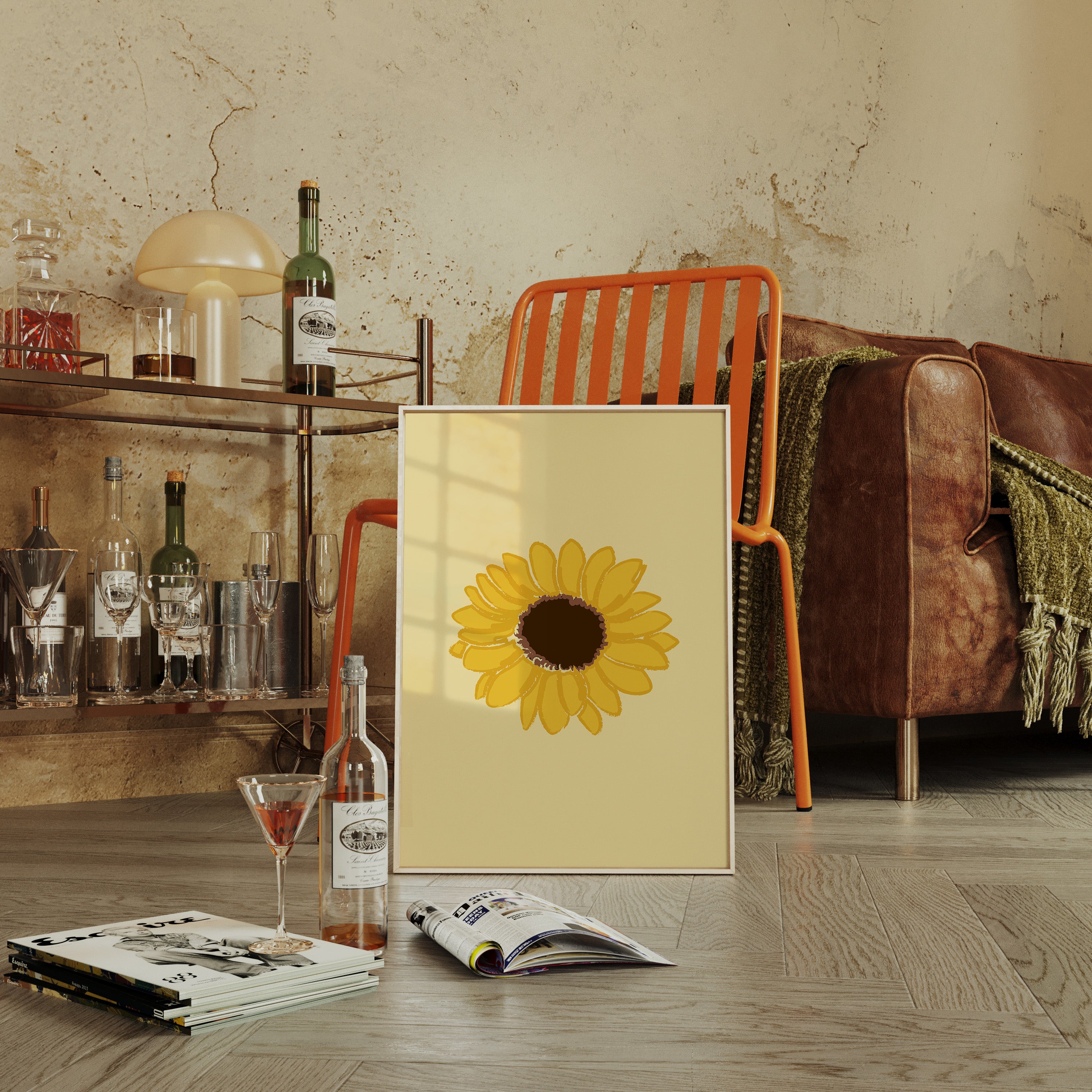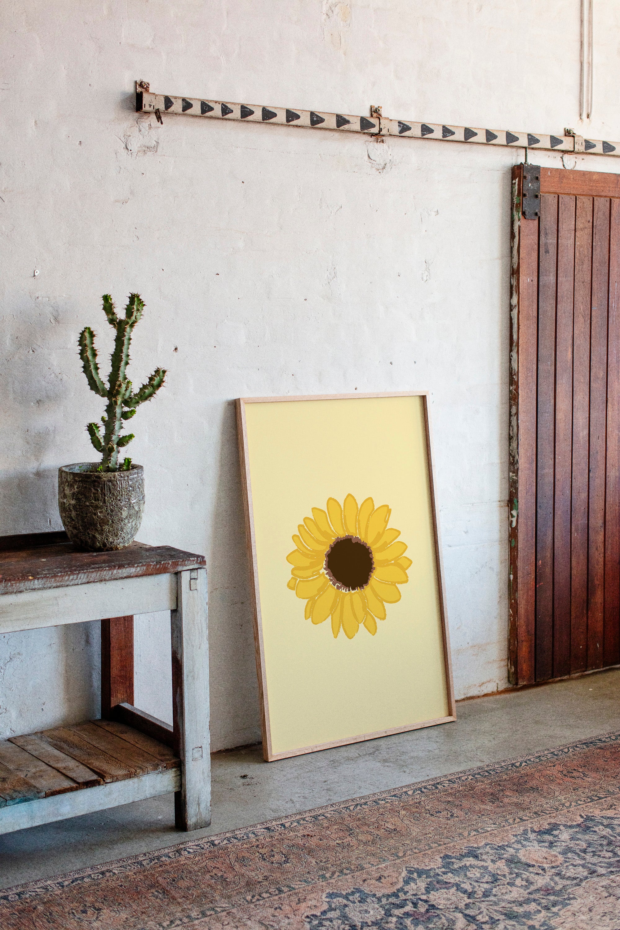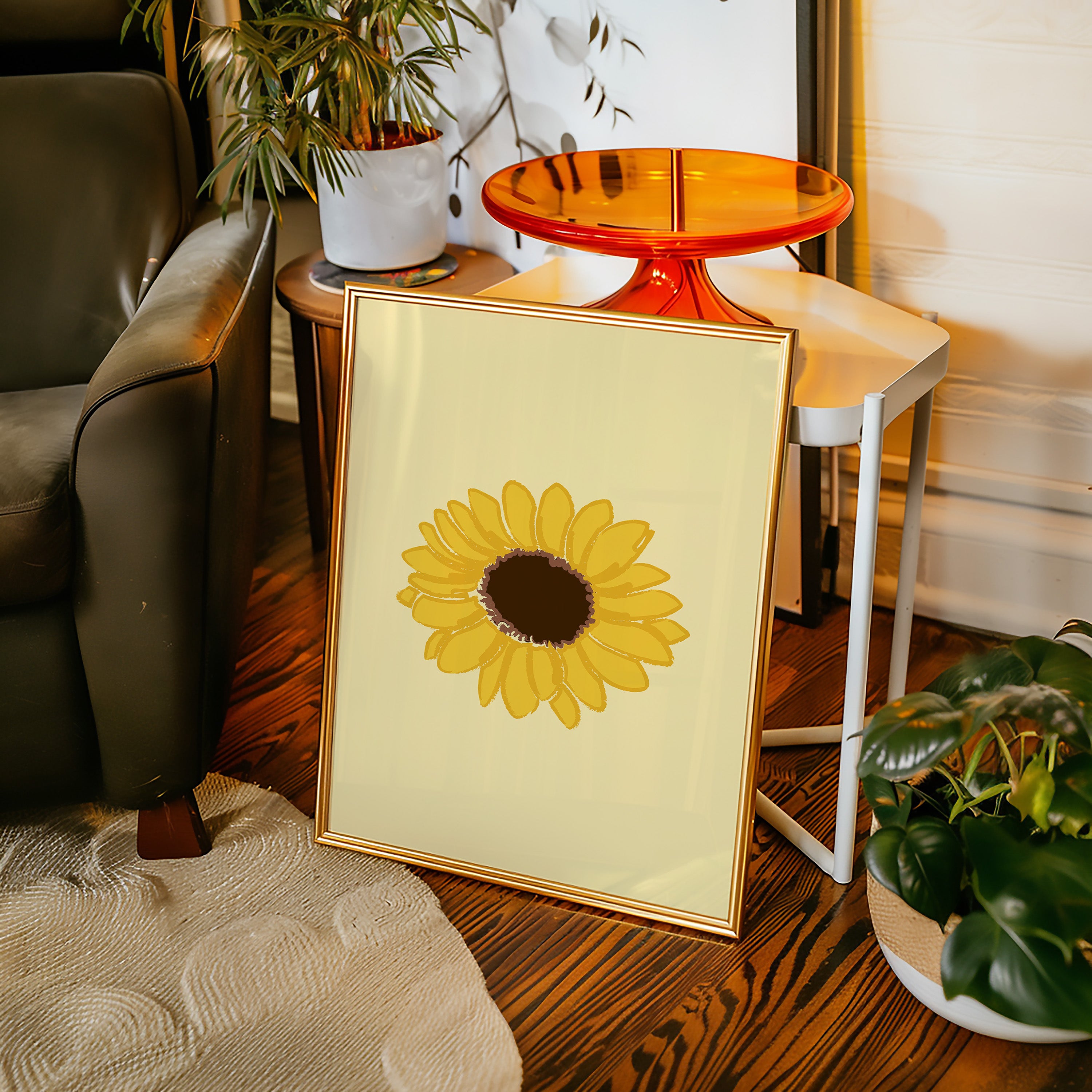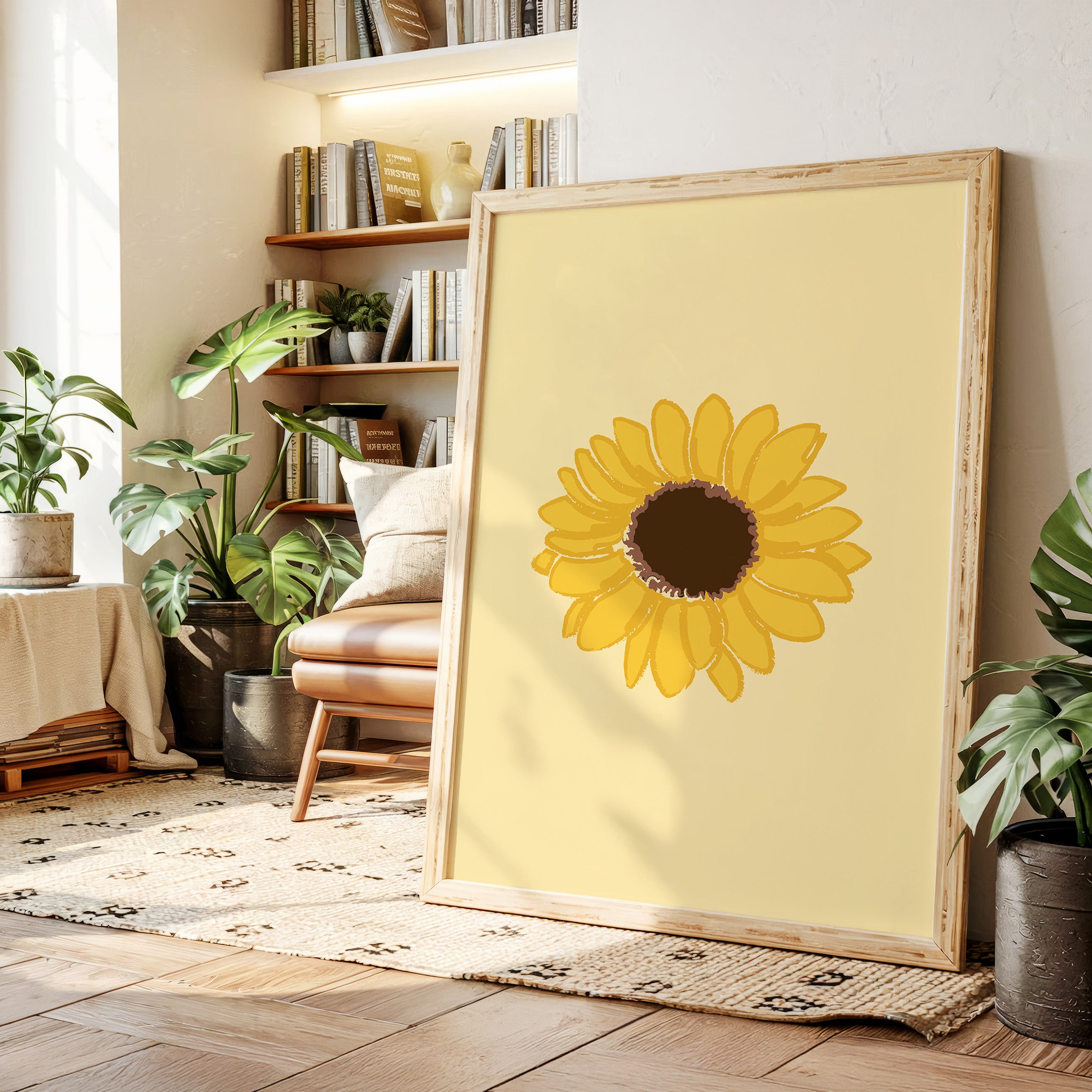 A single sunflower radiates warmth against a gentle cream backdrop, its petals unfurling like rays of captured sunshine. This piece exemplifies the clean minimalism of modern botanical illustration. The bold yellow petals create a perfect circular dance around the rich brown center, while the subtle texture in the brushstrokes adds an organic, handcrafted quality to the simplified form. Each petal seems to tell its own story of summer's abundance and nature's mathematical precision. This statement piece brings instant cheer to kitchen spaces, breakfast nooks, or any room needing a touch of perpetual sunshine. Its timeless simplicity allows it to harmonize beautifully with both modern and farmhouse interiors.