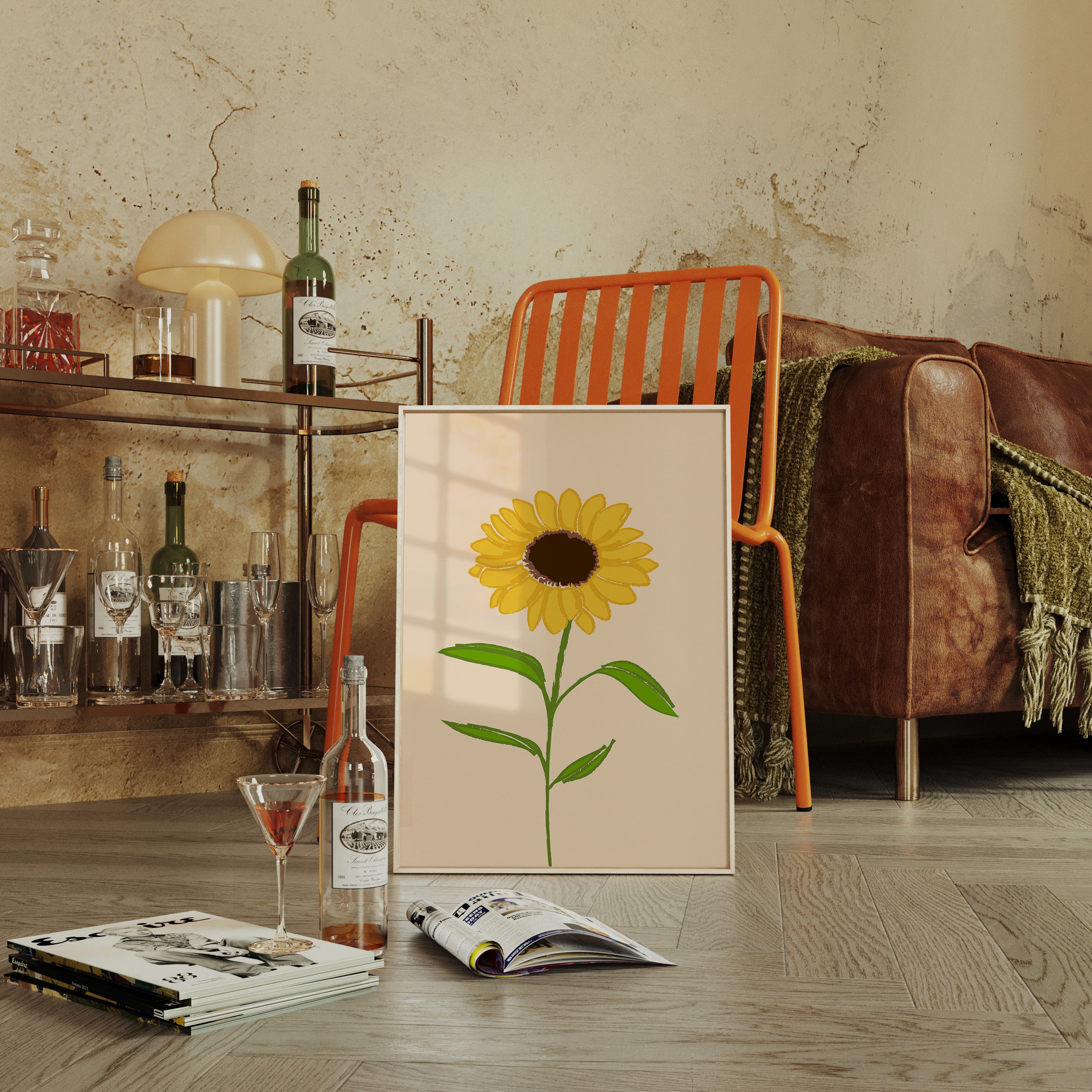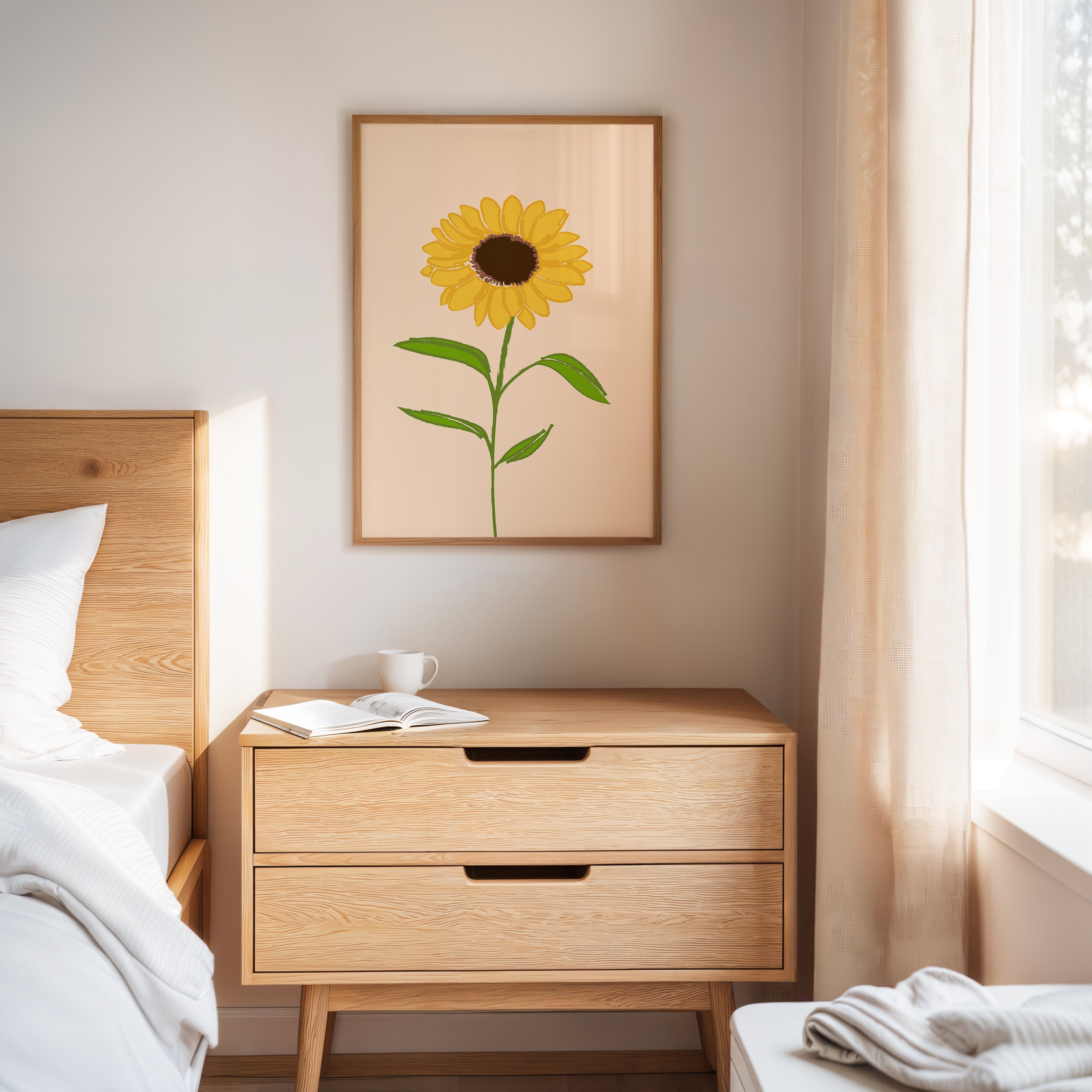 A single sunflower stands proud against a soft peach backdrop, its petals radiating warmth like rays of captured sunshine. This piece from our Botanical Collection celebrates the simple beauty of summer's most beloved bloom. The minimalist illustration style highlights the flower's natural geometry - perfectly arranged golden petals surrounding a rich brown center, supported by crisp green leaves reaching skyward. Its gentle presence brings to mind lazy summer afternoons and fields stretching endlessly toward the horizon. Perfect for brightening kitchen spaces or adding a touch of natural optimism to a home office. Each glance offers a moment of connection to nature's endless capacity for joy.
